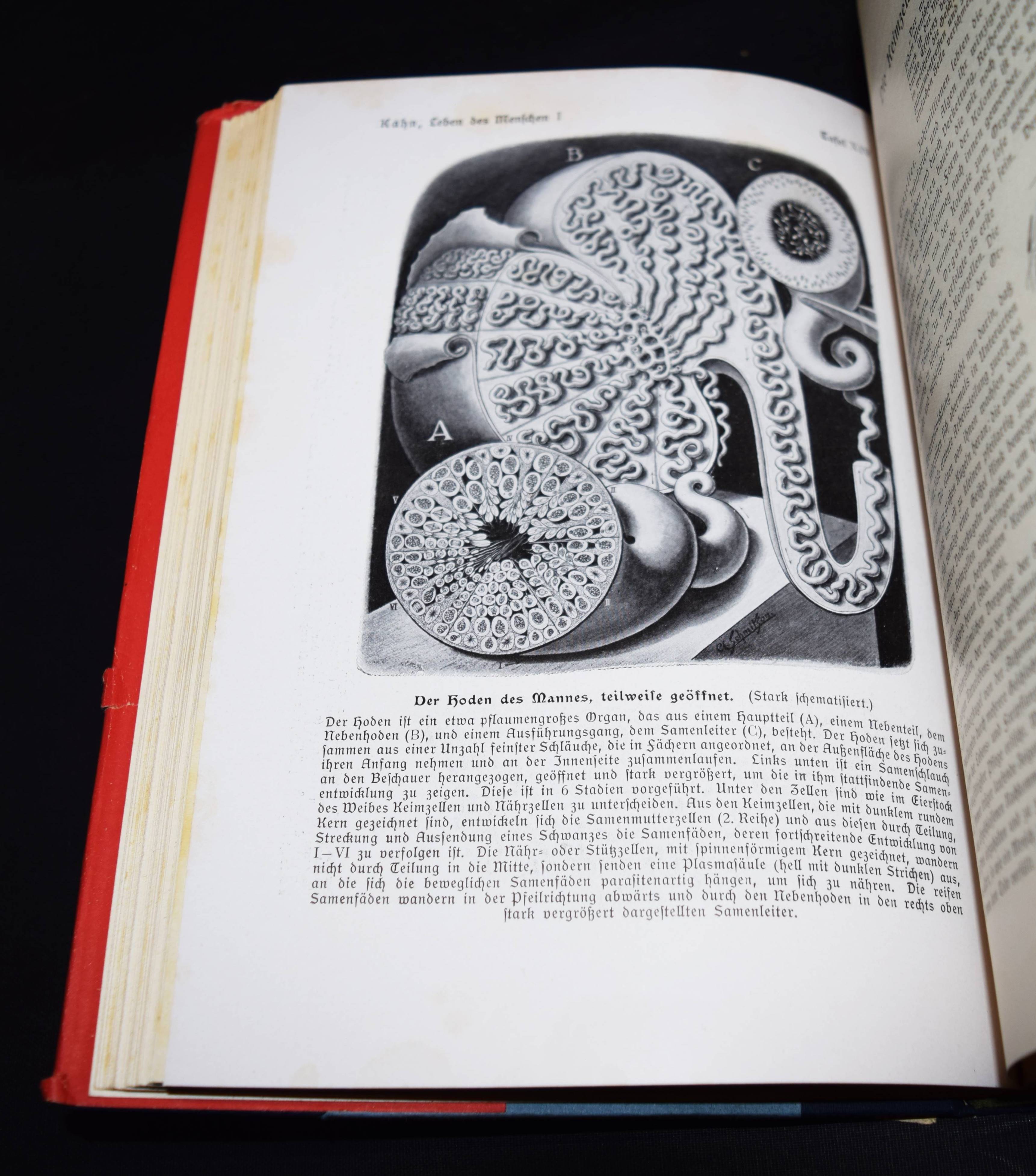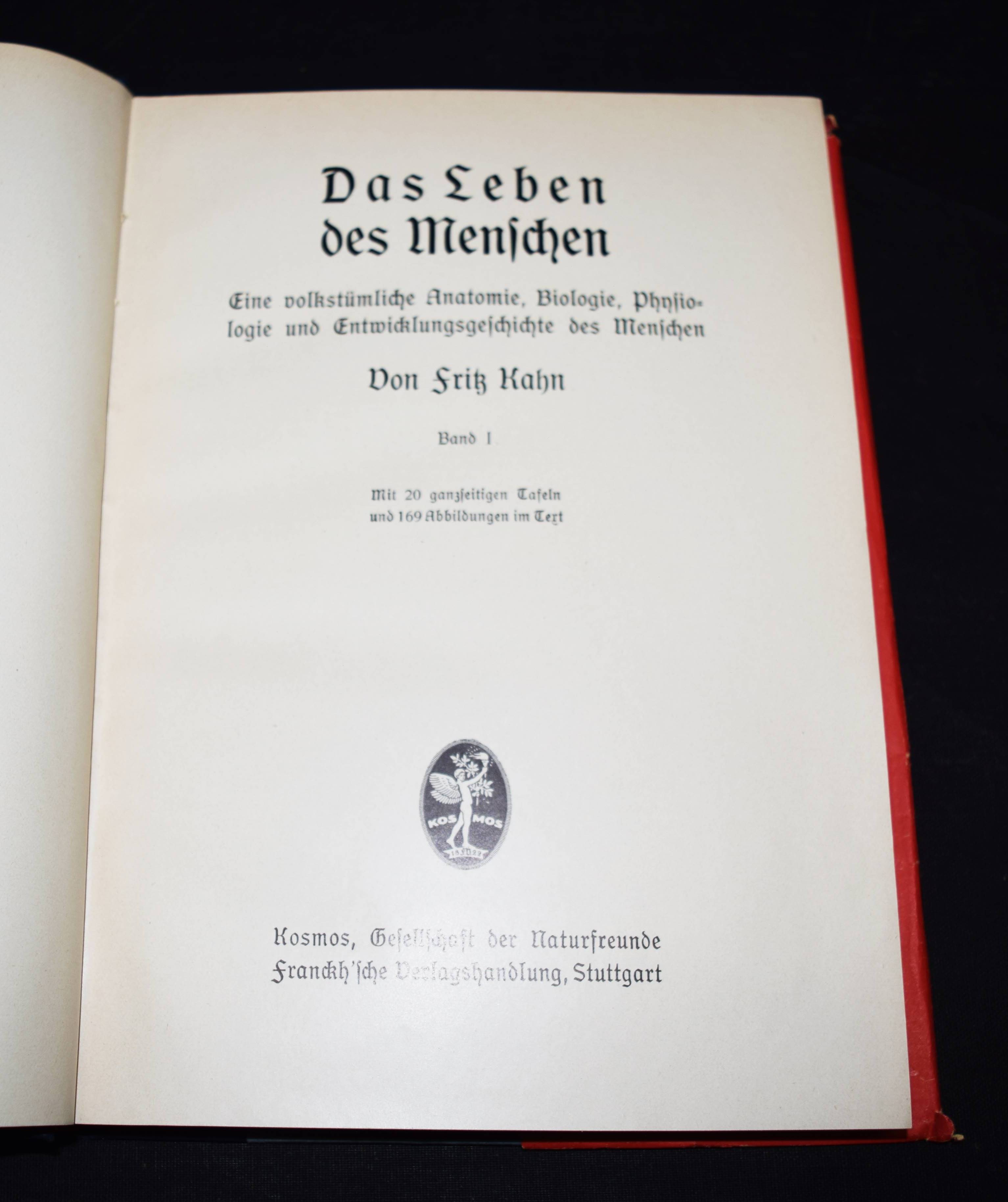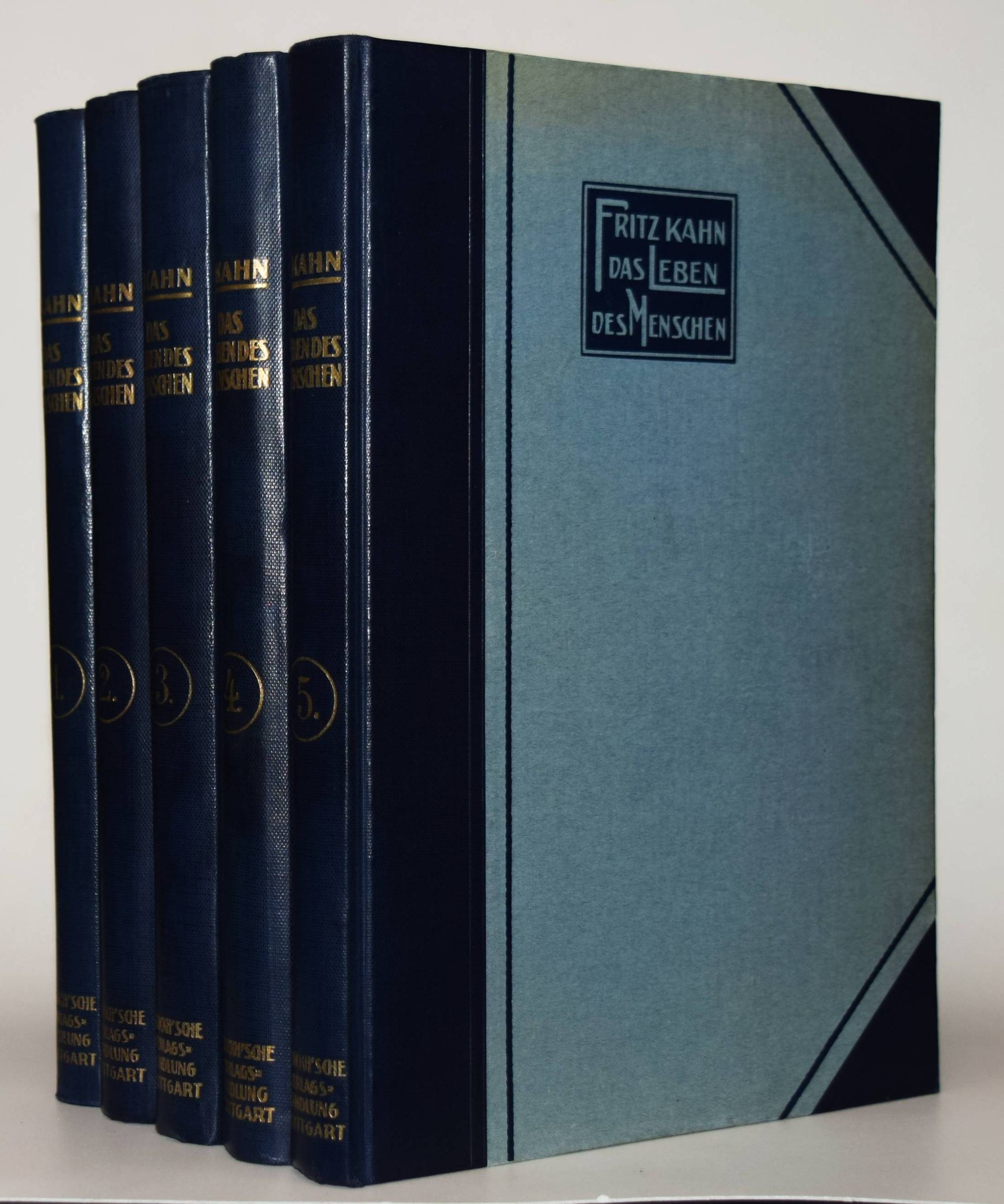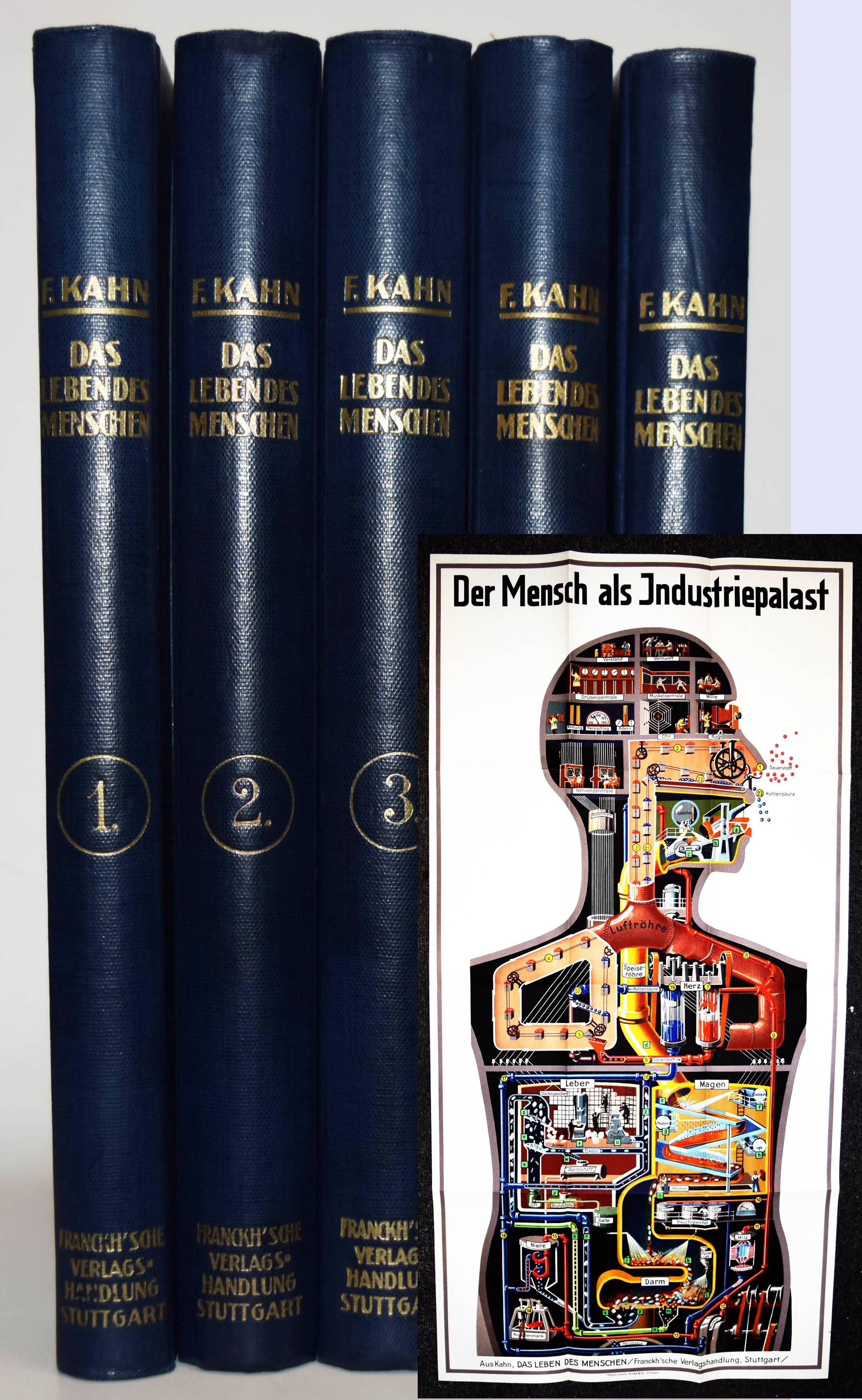 Der Mensch als Industriepalast (farbige Lithographie, 95 x 48 cm. als Beilage) – Kahn, Fritz. Das Leben des Menschen. Eine volkstümliche Anatomie, Biologie, Physiologie und Entwicklungsgeschichte des Menschen. 5 Bände. Stuttgart, Kosmos 1926-1931. Gr.-8°. Mit 1058 Textabb.,144 teils farb. Tafeln sowie 3 Beilagen und 1 3-D-Brille in Band V. Orig.-Halbleinenbände. Debschitz, Man Machine – Maschine Mensch, Heidelberg, New York 2009 (mit Abb. der Lithographie auf dem Umschlag). Rössler, P. in: Aus dem Antiquariat, NF 16, Nr. 1, 2018, S. 18-36 (ausführl. zur Editionsgeschichte). Wilk, Modernism – Designing a New World, London, Victoria & Albert Museum, S. 250 (mit Abb.). – Eine „Meisterleistung populärer Wissenschaftsvermittlung“ (Patrick Rössler). – „Eine Pionierleistung des modernen Informationsdesigns, die bis heute durch Themen- und Stilvielfalt, Humor und originelle Analogien fasziniert“ (U. u. T. v. Debschitz). – Vollständiges Exemplar des umfangreichen populärwissenschaftlichen Werks. Die bekannte Plakatbeilage „Der Mensch als Industriepalast“, schon damals der Höhepunkt der Edition, gilt als Pionierarbeit im Informationsdesign und als „Meilenstein der Infografik“ (Die Zeit, 3. April 2014, S. 38). – Mit allen losen Beilagen in der hinteren Deckeltasche von Band V, die beiden Falttafeln (″Der Mensch als Industriepalast“ und „Stammbaum des Menschen“), die Broschüre mit Erläuterungen (2 Teile, XI S. mit 6 Abb.) und die 3-D-Brille. – Der Mediziner Fritz Kahn (1888-1968), wurde mit dieser Reihe zum internationalen Erfolgsautor. Seine Schriften waren in Nazi-Deutschland verboten und wurden vernichtet. Kahn gelang es, mit Unterstützung von Albert Einstein 1941 in die USA zu emigrieren. Sein Wirken und seine „industriellen Visionen der Natur“ (Spiegel online) würdigte eine international viel beachtete Ausstellung im „Berliner Medizinhistorischen Museum der Charité“. – Sehr gutes sauberes Exemplar.