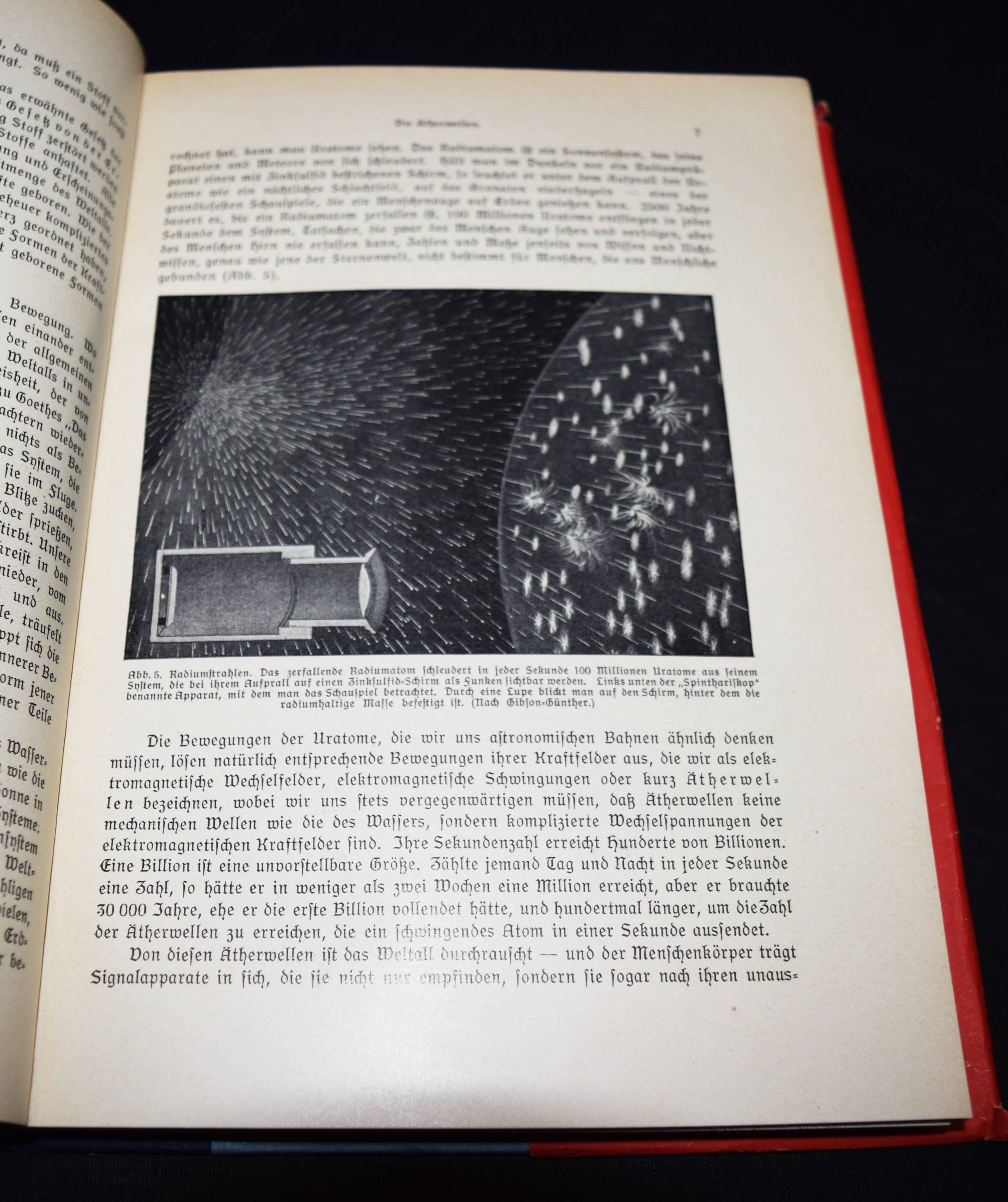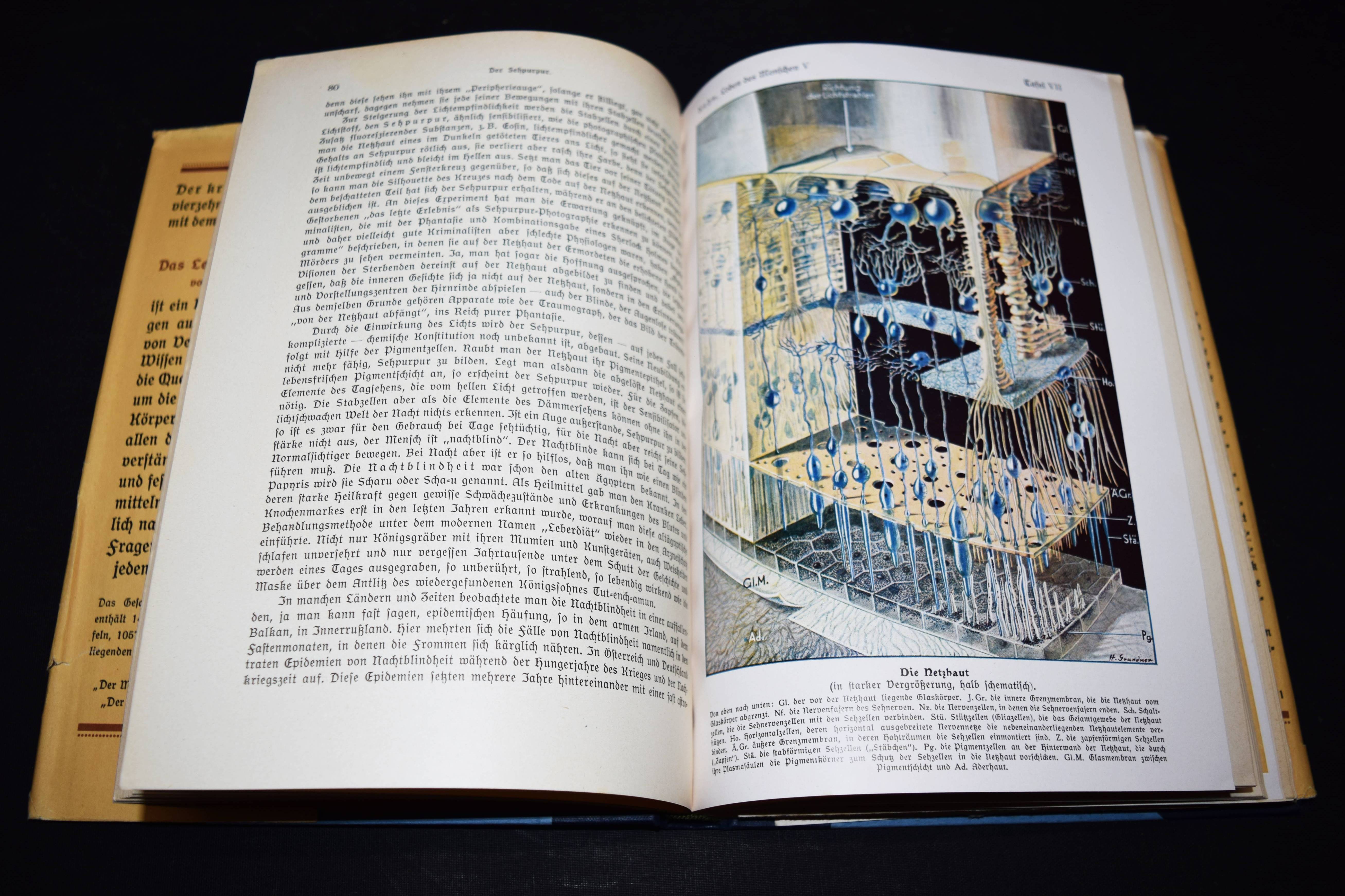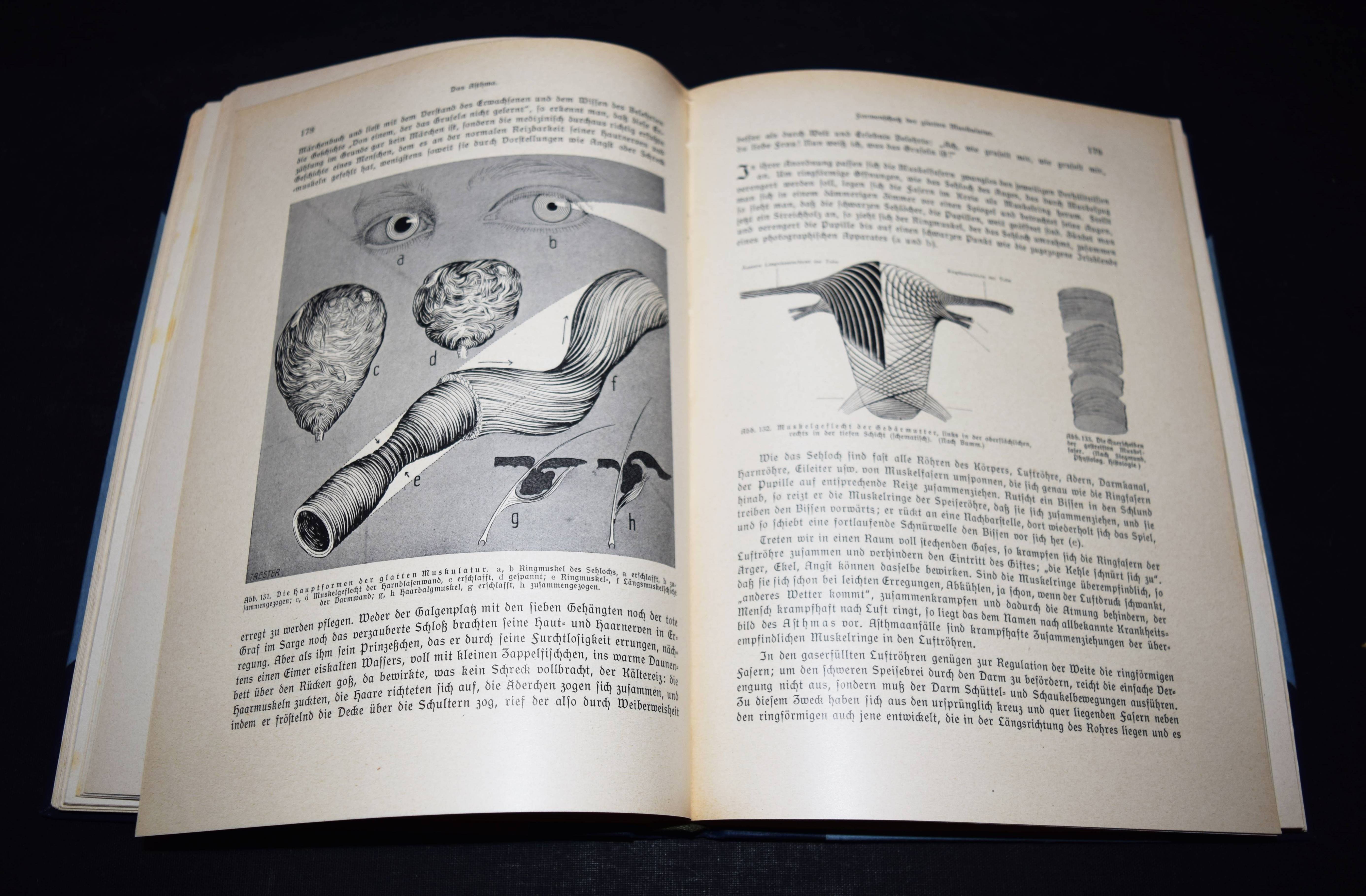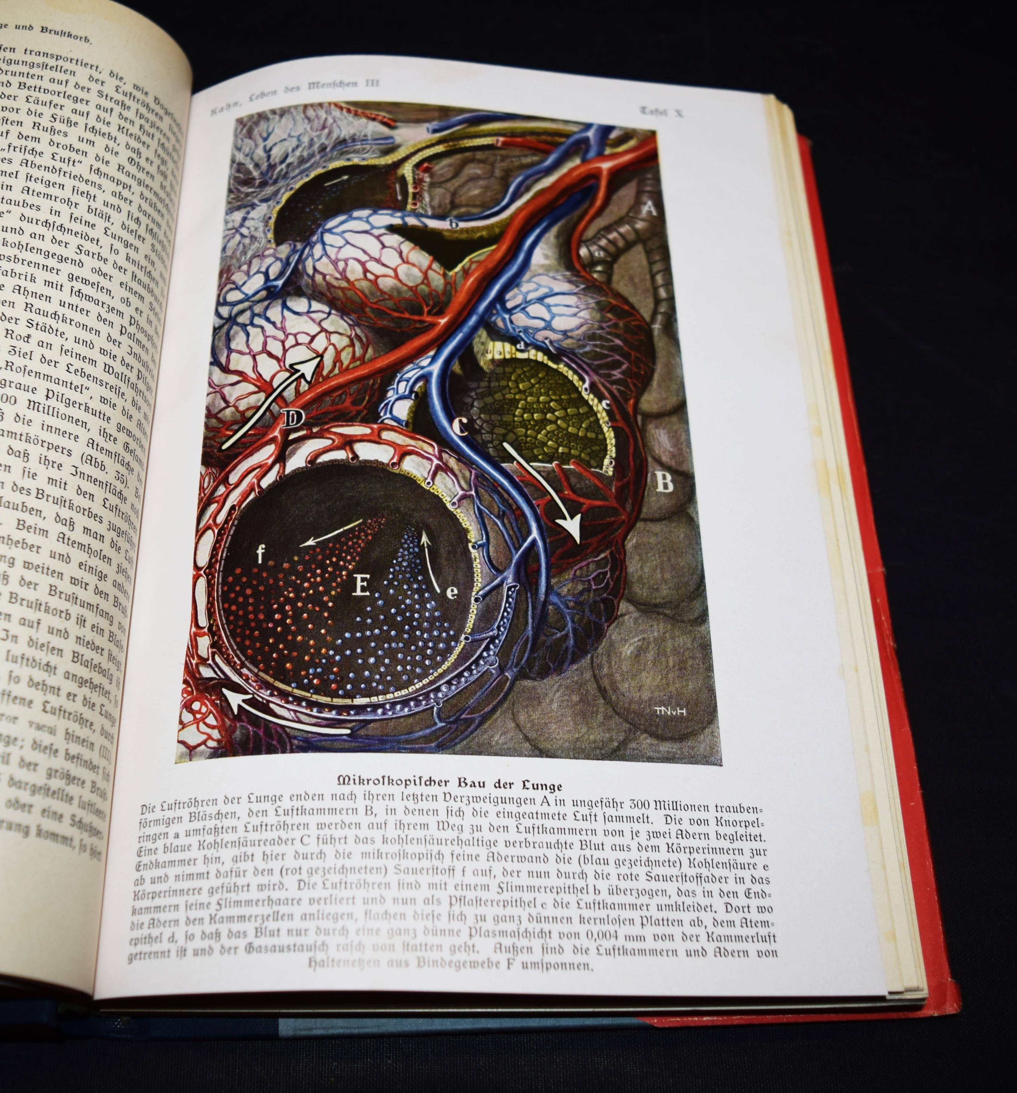 Der Mensch als Industriepalast (farbige Lithographie, 95 x 48 cm. als Beilage) – Kahn, Fritz. Das Leben des Menschen. Eine volkstümliche Anatomie, Biologie, Physiologie und Entwicklungsgeschichte des Menschen. 5 Bände. Stuttgart, Kosmos 1926-1931. Gr.-8°. Mit 1058 Textabb.,144 teils farb. Tafeln sowie 3 Beilagen und 1 3-D-Brille in Band V. Orig.-Halbleinenbände. Debschitz, Man Machine – Maschine Mensch, Heidelberg, New York 2009 (mit Abb. der Lithographie auf dem Umschlag). Rössler, P. in: Aus dem Antiquariat, NF 16, Nr. 1, 2018, S. 18-36 (ausführl. zur Editionsgeschichte). Wilk, Modernism – Designing a New World, London, Victoria & Albert Museum, S. 250 (mit Abb.). – Eine „Meisterleistung populärer Wissenschaftsvermittlung“ (Patrick Rössler). – „Eine Pionierleistung des modernen Informationsdesigns, die bis heute durch Themen- und Stilvielfalt, Humor und originelle Analogien fasziniert“ (U. u. T. v. Debschitz). – Vollständiges Exemplar des umfangreichen populärwissenschaftlichen Werks. Die bekannte Plakatbeilage „Der Mensch als Industriepalast“, schon damals der Höhepunkt der Edition, gilt als Pionierarbeit im Informationsdesign und als „Meilenstein der Infografik“ (Die Zeit, 3. April 2014, S. 38). – Mit allen losen Beilagen in der hinteren Deckeltasche von Band V, die beiden Falttafeln (″Der Mensch als Industriepalast“ und „Stammbaum des Menschen“), die Broschüre mit Erläuterungen (2 Teile, XI S. mit 6 Abb.) und die 3-D-Brille. – Der Mediziner Fritz Kahn (1888-1968), wurde mit dieser Reihe zum internationalen Erfolgsautor. Seine Schriften waren in Nazi-Deutschland verboten und wurden vernichtet. Kahn gelang es, mit Unterstützung von Albert Einstein 1941 in die USA zu emigrieren. Sein Wirken und seine „industriellen Visionen der Natur“ (Spiegel online) würdigte eine international viel beachtete Ausstellung im „Berliner Medizinhistorischen Museum der Charité“. – Sehr gutes sauberes Exemplar.