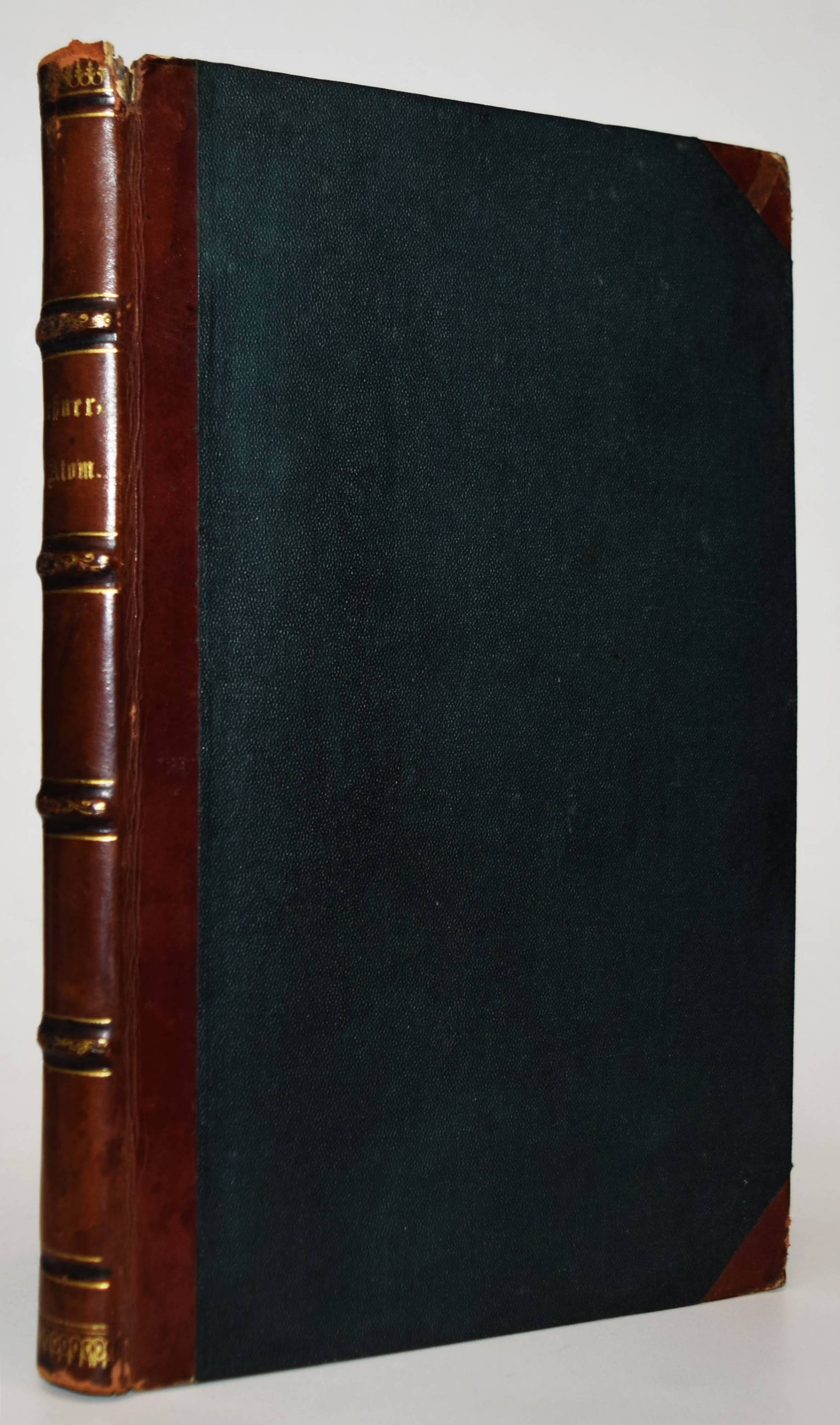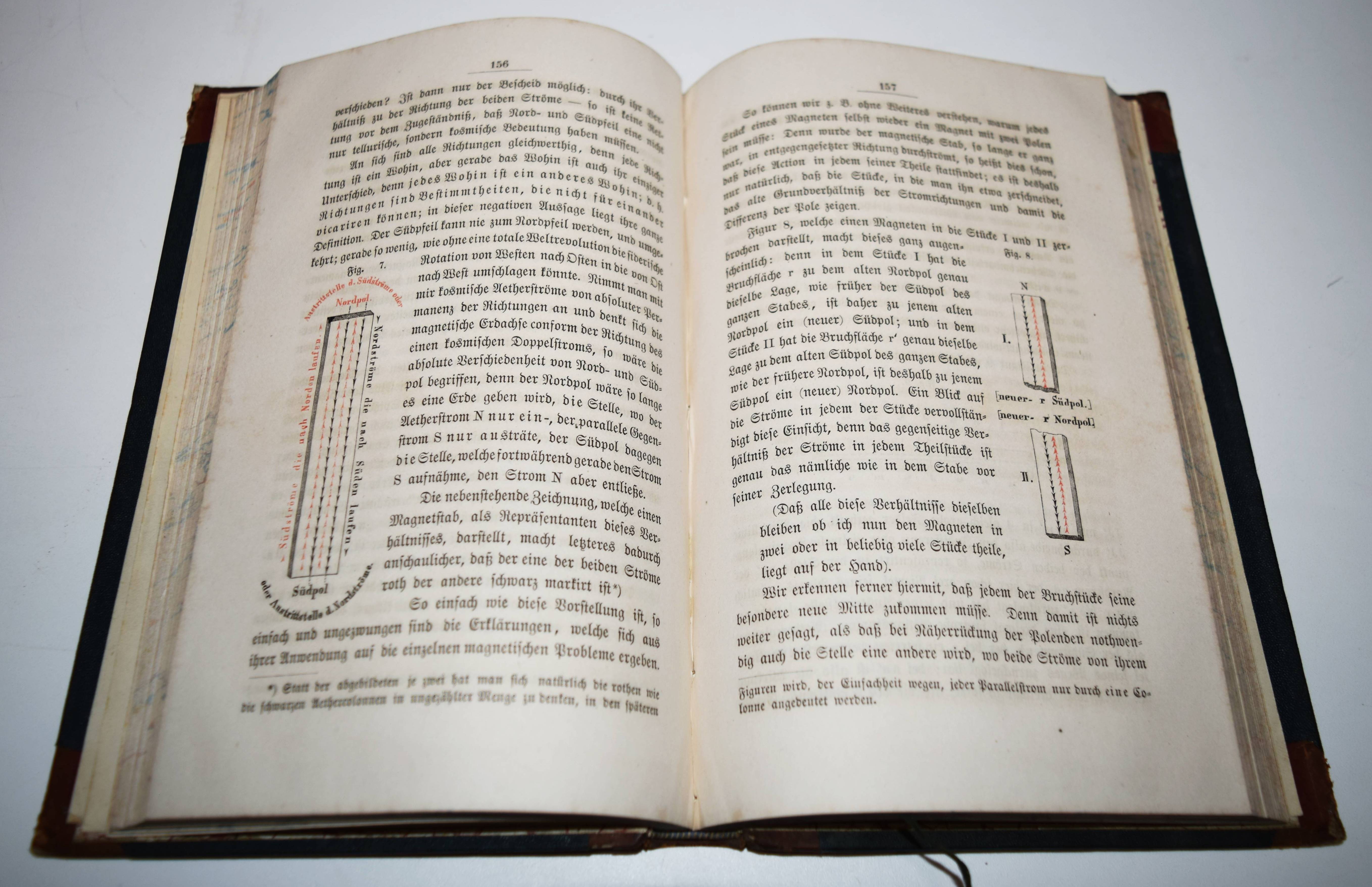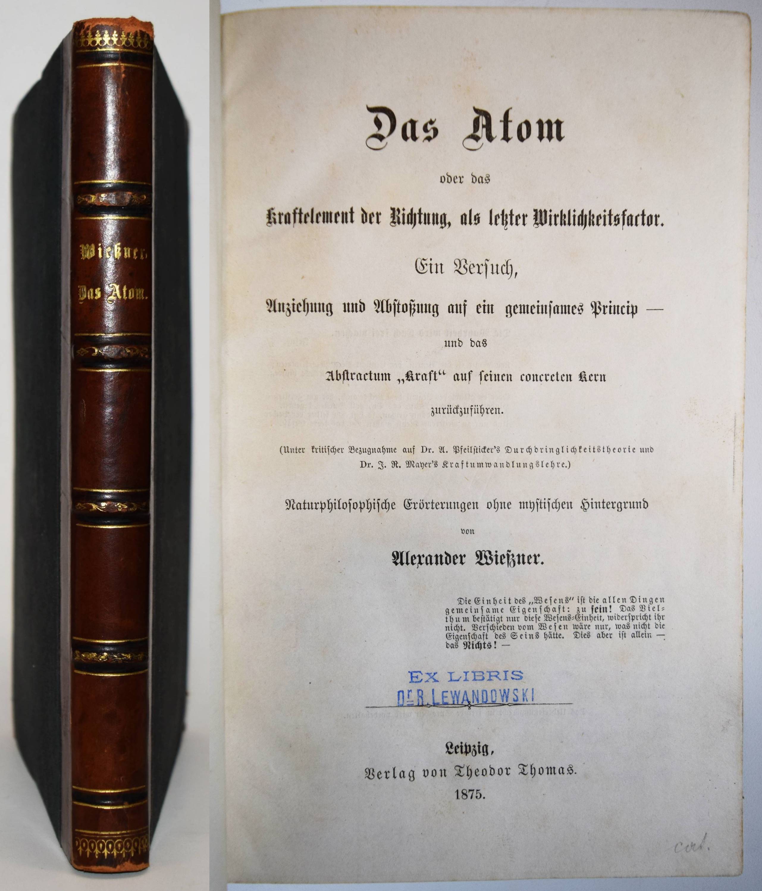 Wiessner, Alexander. Das Atom oder das Kraftelement der Richtung, als letzter Wirklichkeitsfactor. Ein Versuch, Anziehung und Abstoßung auf ein gemeinsames Princip – und das Abstractum „Kraft“ auf seinen concreten Kern zurückzuführen. (Unter kritischer Bezugnahme auf Dr. A. Pfeilsticker’s Durchdringlichkeitstheorie und Dr. J. R. Mayer’s Kraftumwandlungslehre). Naturphilosophische Erörterungen ohne mystischen Hintergrund. Leipzig, Theodor Thomas 1875. 8°. XI, 331, (1) S. mit einigen Holzschnitten im Text. Halbledereinband der Zeit mit goldgepr. Rückentitel, 4 unechten Bünden und dezenter Rückenvergoldung. Erste Ausgabe. – Schönes dekorativ gebundenes Exemplar.