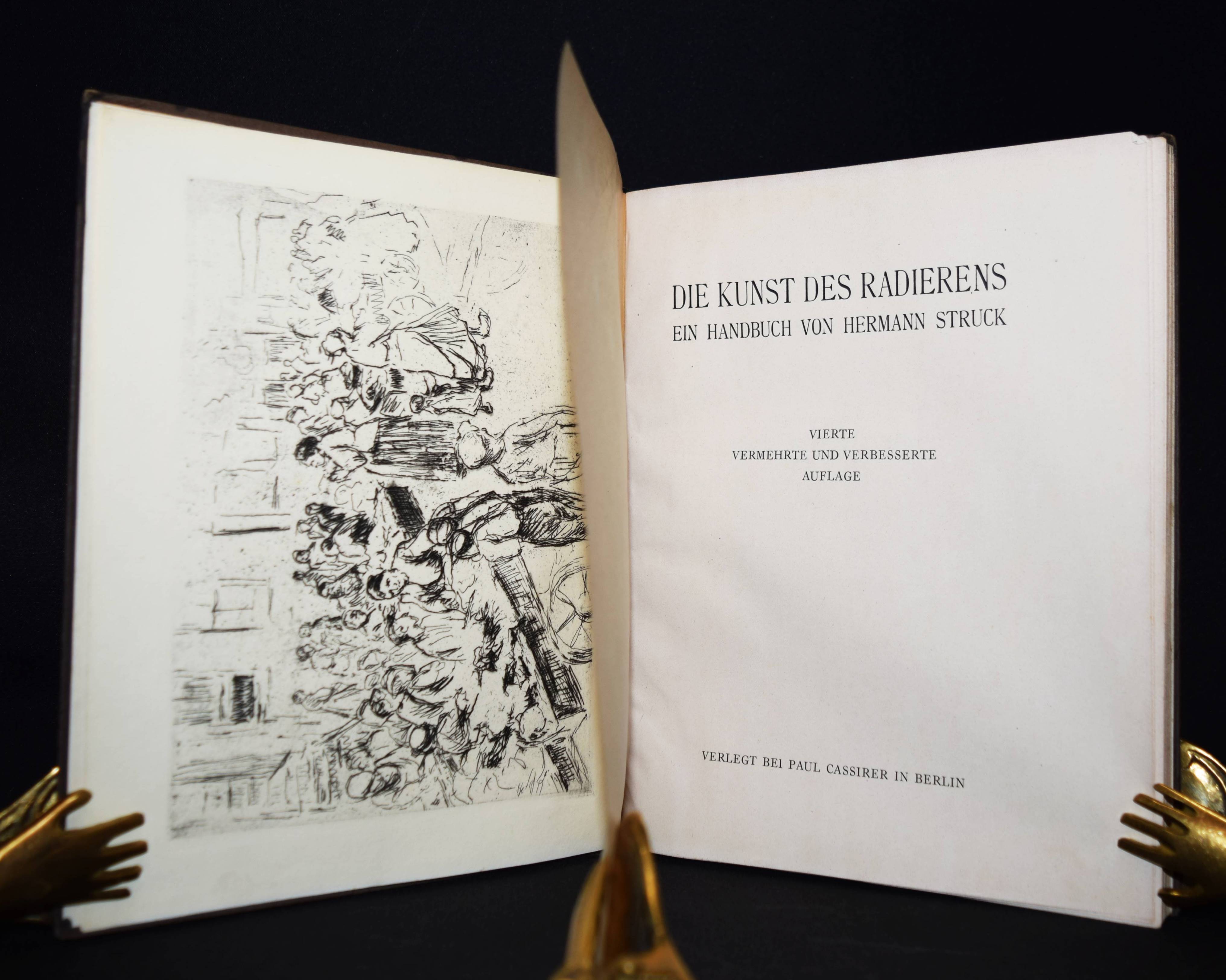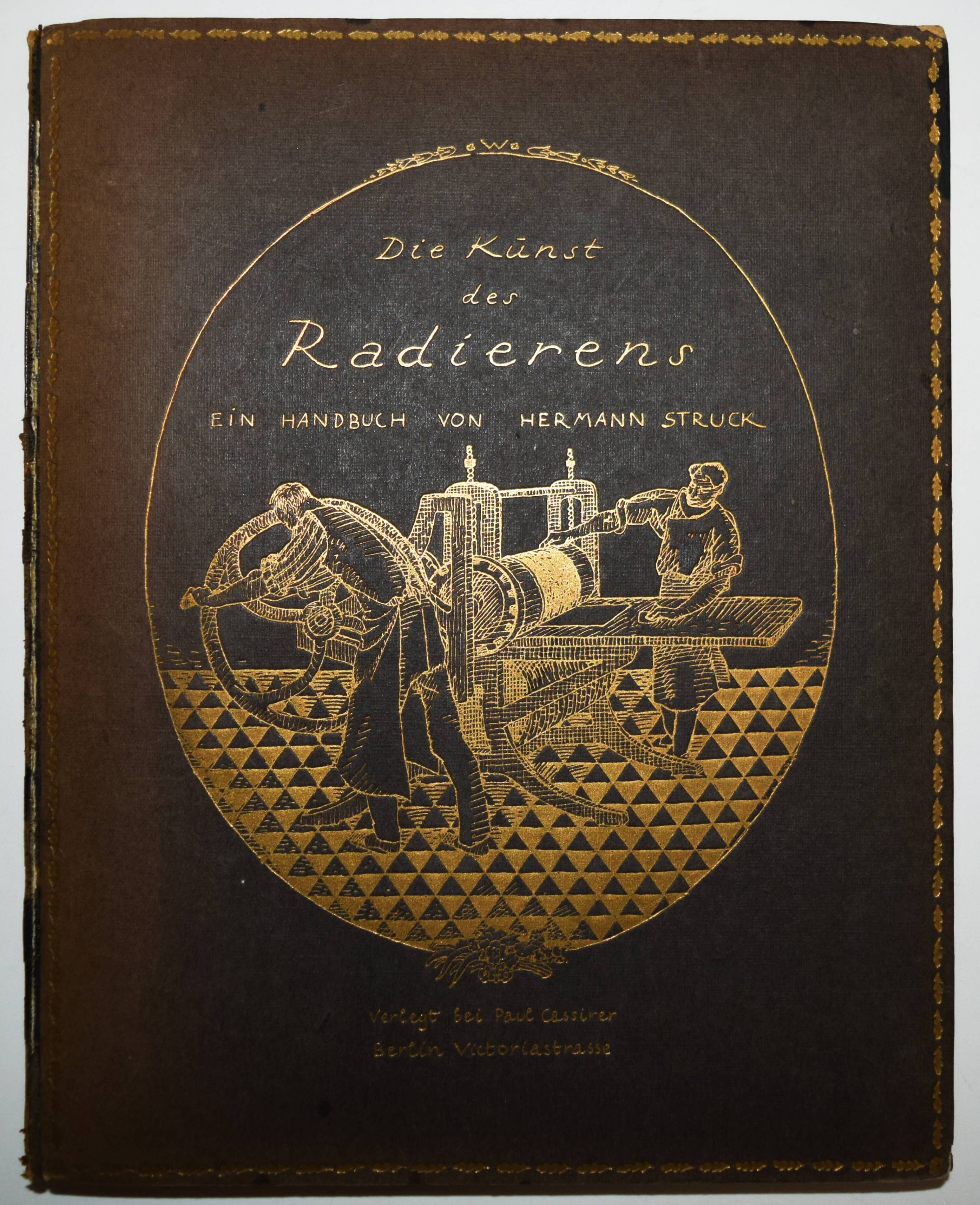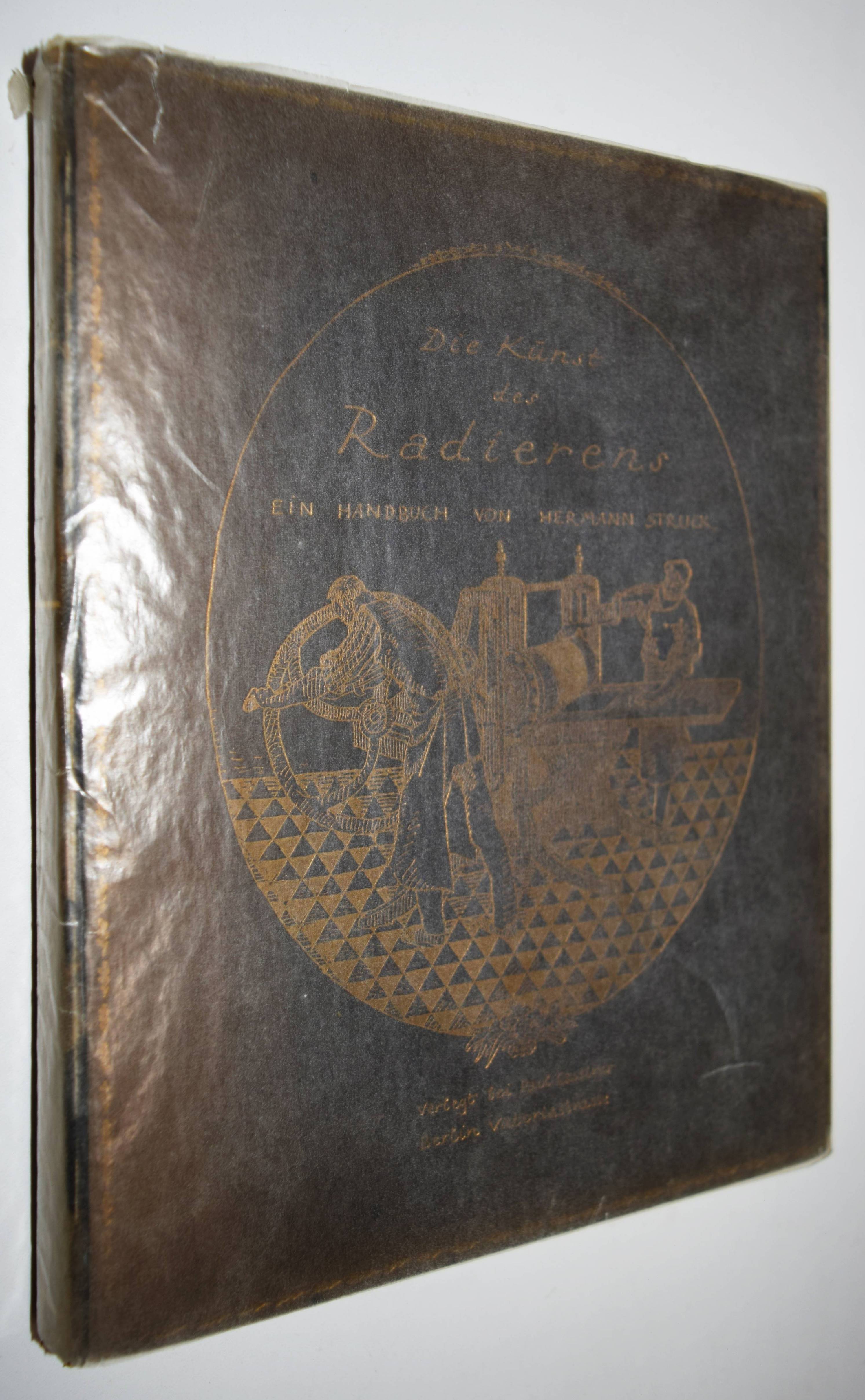 Struck, Hermann. Die Kunst des Radierens. Ein Handbuch. 4., verm. und verb. Aufl. Berlin, Paul Cassirer (1920). Gr.-8° (23,5 x 19 cm.). [4] Bl., 279, (1) S. mit 6 Original-Graphiken von Max Liebermann, Hermann Struck, Edvard Munch, Paul Baum, Max Slevogt und Hans Meid sowie zahlreichen weiteren Abbildungen im Text und auf Tafeln. Orig.-Pappband mit goldgepr. Rücken- und Deckeltitel, goldgepr. Deckel-Illustration (von Karl Walser) und Deckelfiletten. Feilchenfeldt-Brandis 193.4. Söhn, HDO 262. – Mit den Original-Graphiken von Max Liebermann: Amsterdamer Judengasse (Radierung); Edvard Munch: Norwegische Landschaft (Radierung); Hermann Struck: Alter Jude aus Jaffa (Radierung); Paul Baum: Aus Sluis (Radierung); Hans Meid: Der Maler in der Landschaft (Radierung) und Max Slevogt: Der Bildermann (Lithographie). – Gelenke etwas angeplatzt, gutes sauberes Exemplar der besten Ausgabe.