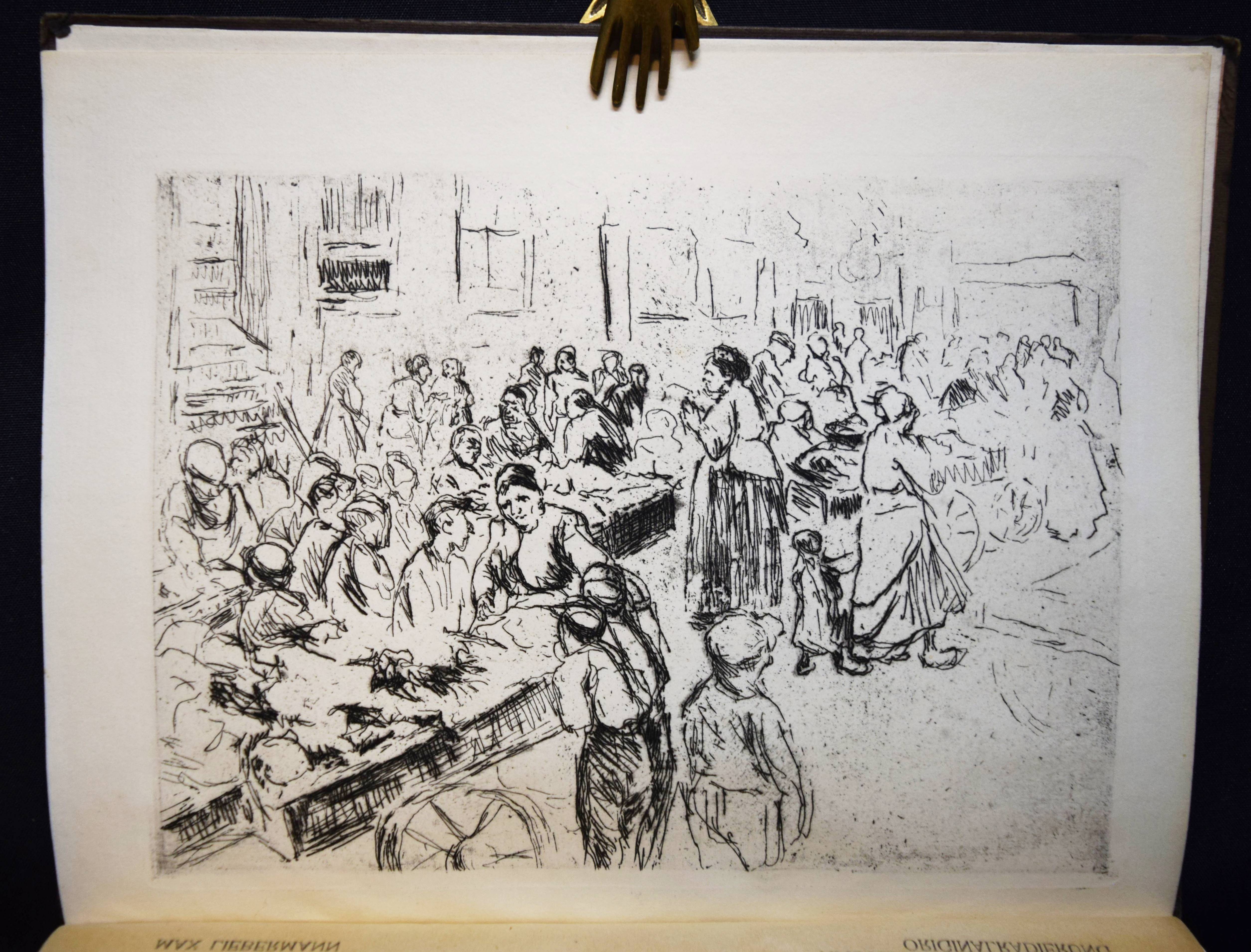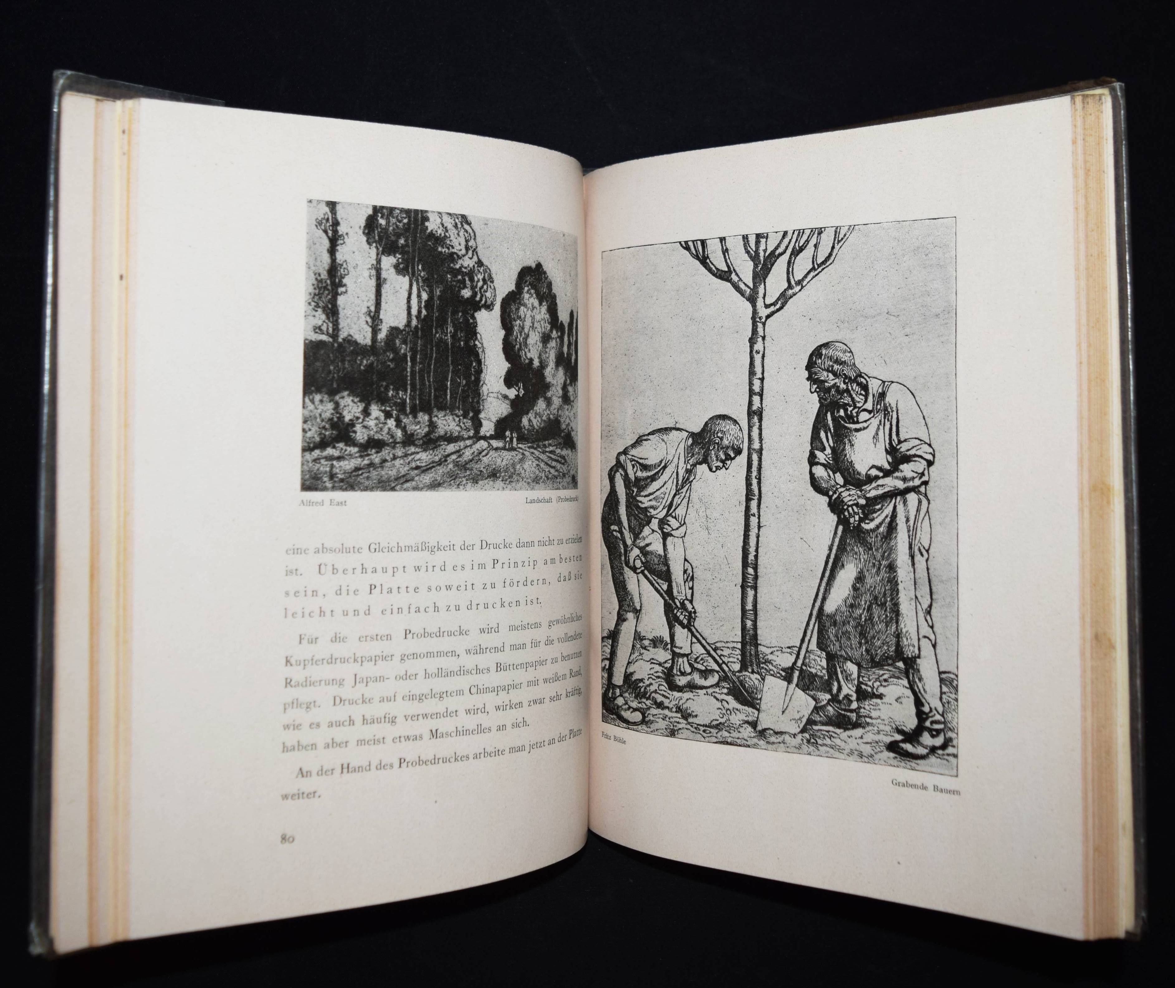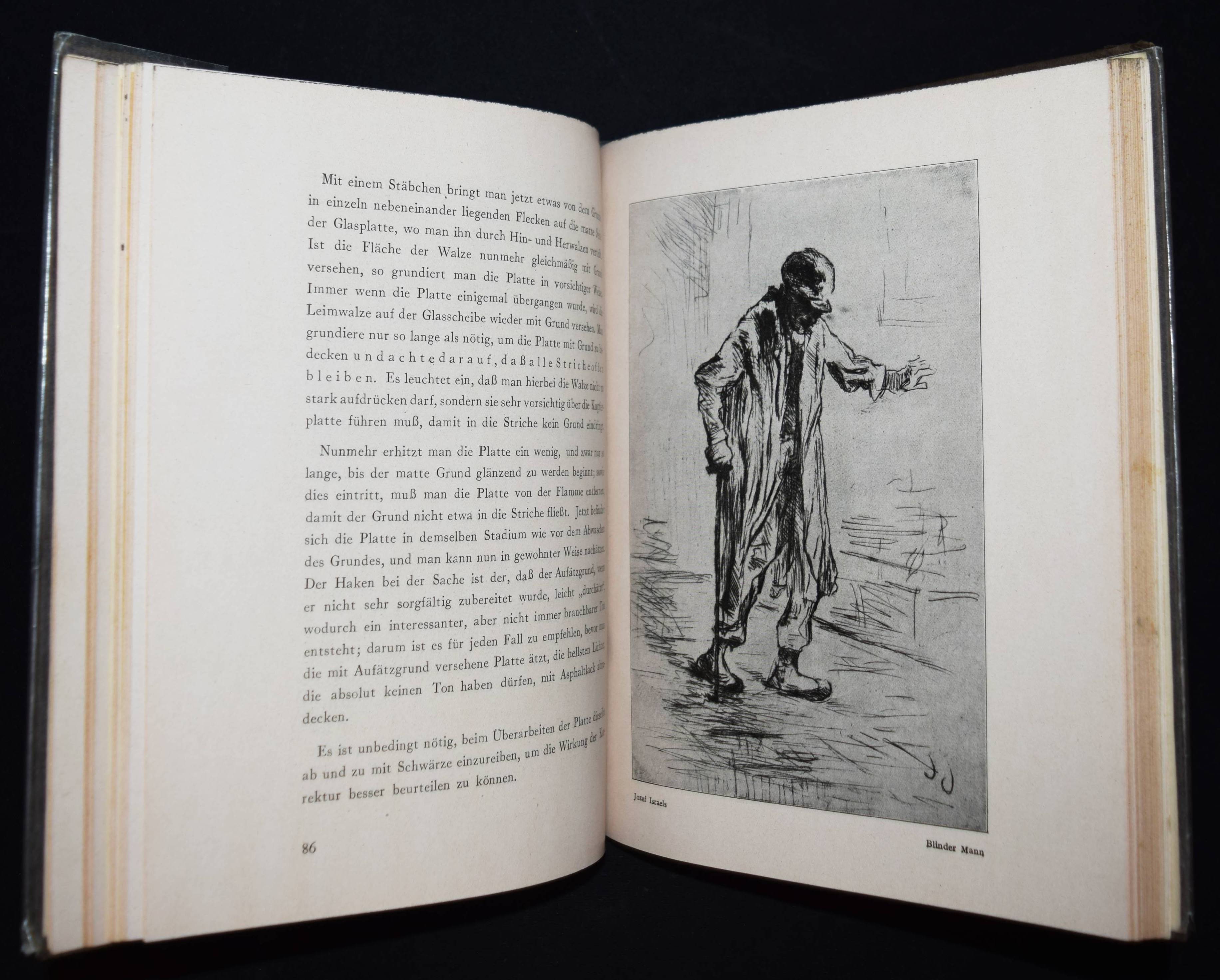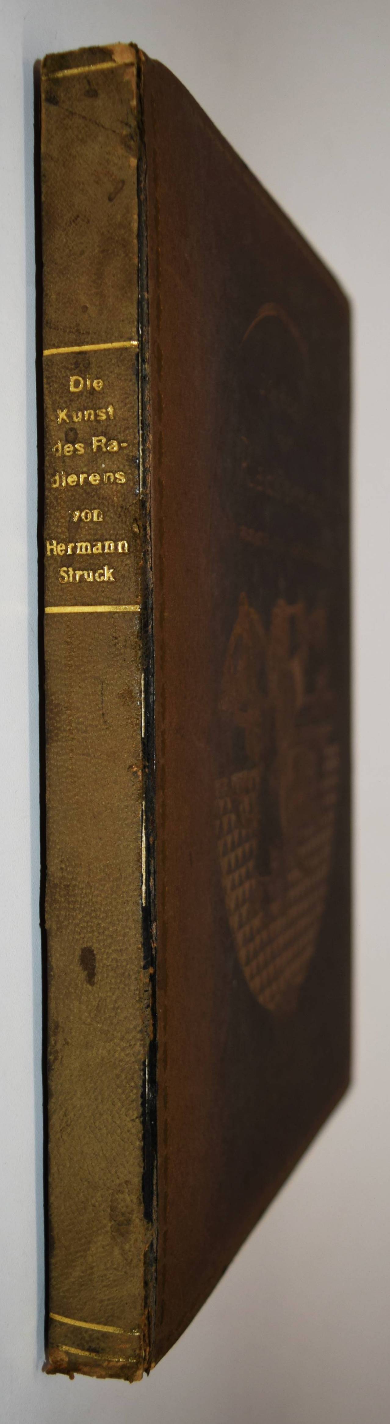 Struck, Hermann. Die Kunst des Radierens. Ein Handbuch. 4., verm. und verb. Aufl. Berlin, Paul Cassirer (1920). Gr.-8° (23,5 x 19 cm.). [4] Bl., 279, (1) S. mit 6 Original-Graphiken von Max Liebermann, Hermann Struck, Edvard Munch, Paul Baum, Max Slevogt und Hans Meid sowie zahlreichen weiteren Abbildungen im Text und auf Tafeln. Orig.-Pappband mit goldgepr. Rücken- und Deckeltitel, goldgepr. Deckel-Illustration (von Karl Walser) und Deckelfiletten. Feilchenfeldt-Brandis 193.4. Söhn, HDO 262. – Mit den Original-Graphiken von Max Liebermann: Amsterdamer Judengasse (Radierung); Edvard Munch: Norwegische Landschaft (Radierung); Hermann Struck: Alter Jude aus Jaffa (Radierung); Paul Baum: Aus Sluis (Radierung); Hans Meid: Der Maler in der Landschaft (Radierung) und Max Slevogt: Der Bildermann (Lithographie). – Gelenke etwas angeplatzt, gutes sauberes Exemplar der besten Ausgabe.