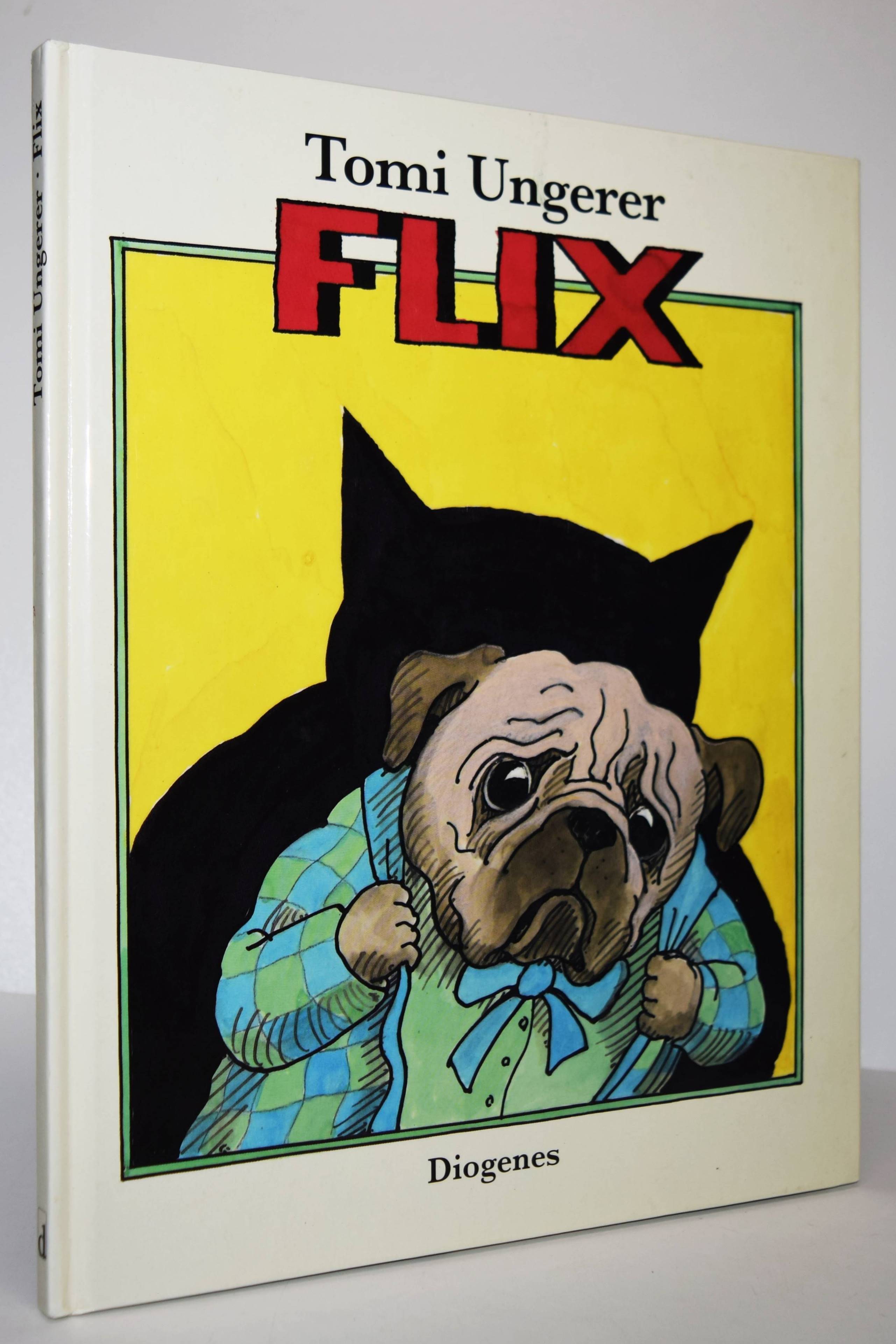 Ungerer, Tomi. Flix. Deutsch von Anna von Cramer-Klett. (Zürich), Diogenes (1997). 4°. 30 S. mit farb. Illustrationen. Farbig illustr. Orig.-Pappband. Erste deutsche Ausgabe. – „Das Ende der falschen Niedlichkeit, die Entrümplung des Bilderbuchs von pädagogischem Muff und artigen Nichtigkeiten verdanken wir neben Maurice Sendak auch Tomi Ungerer. Beide sind inzwischen Klassiker geworden“ (Brigitte). – Sehr gutes Exemplar.