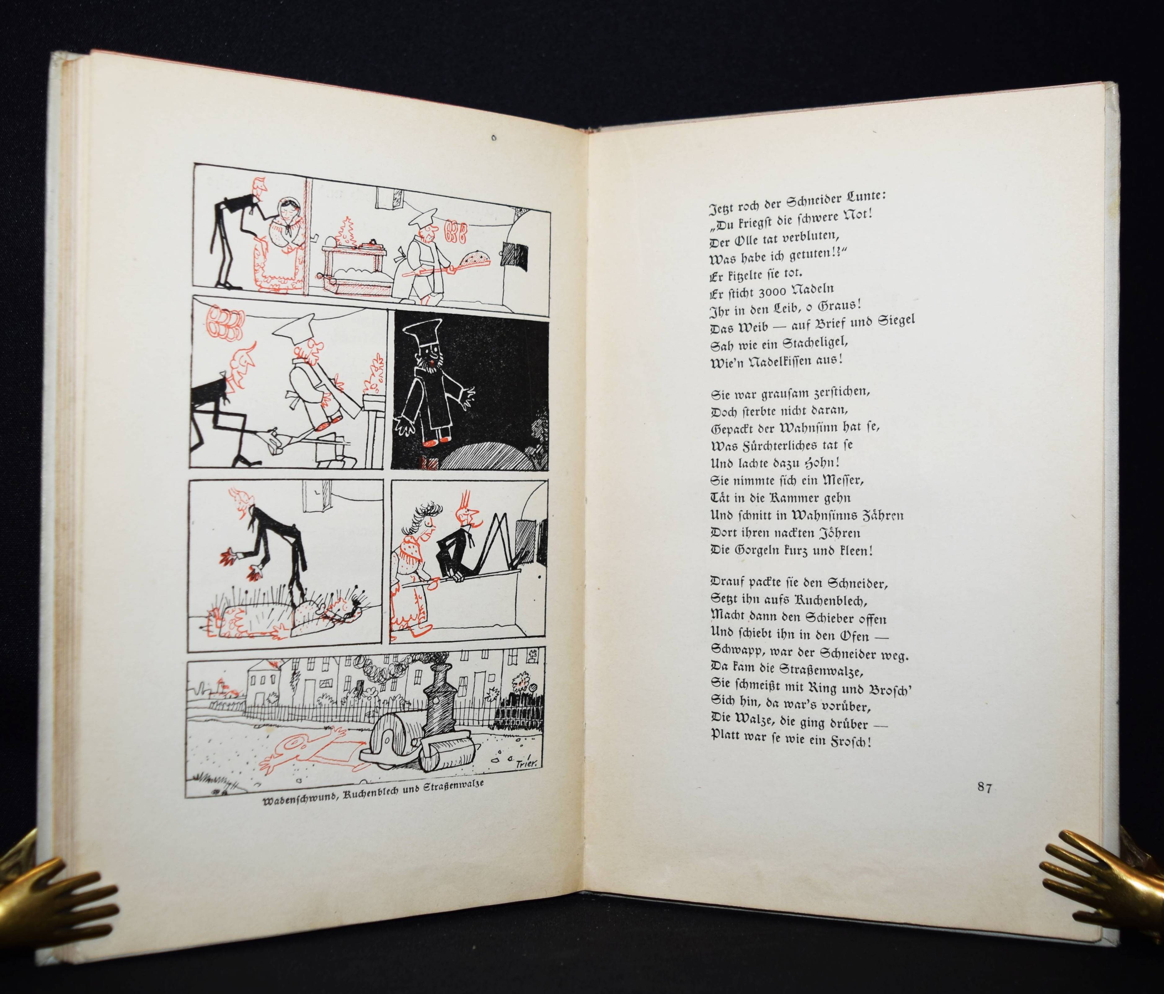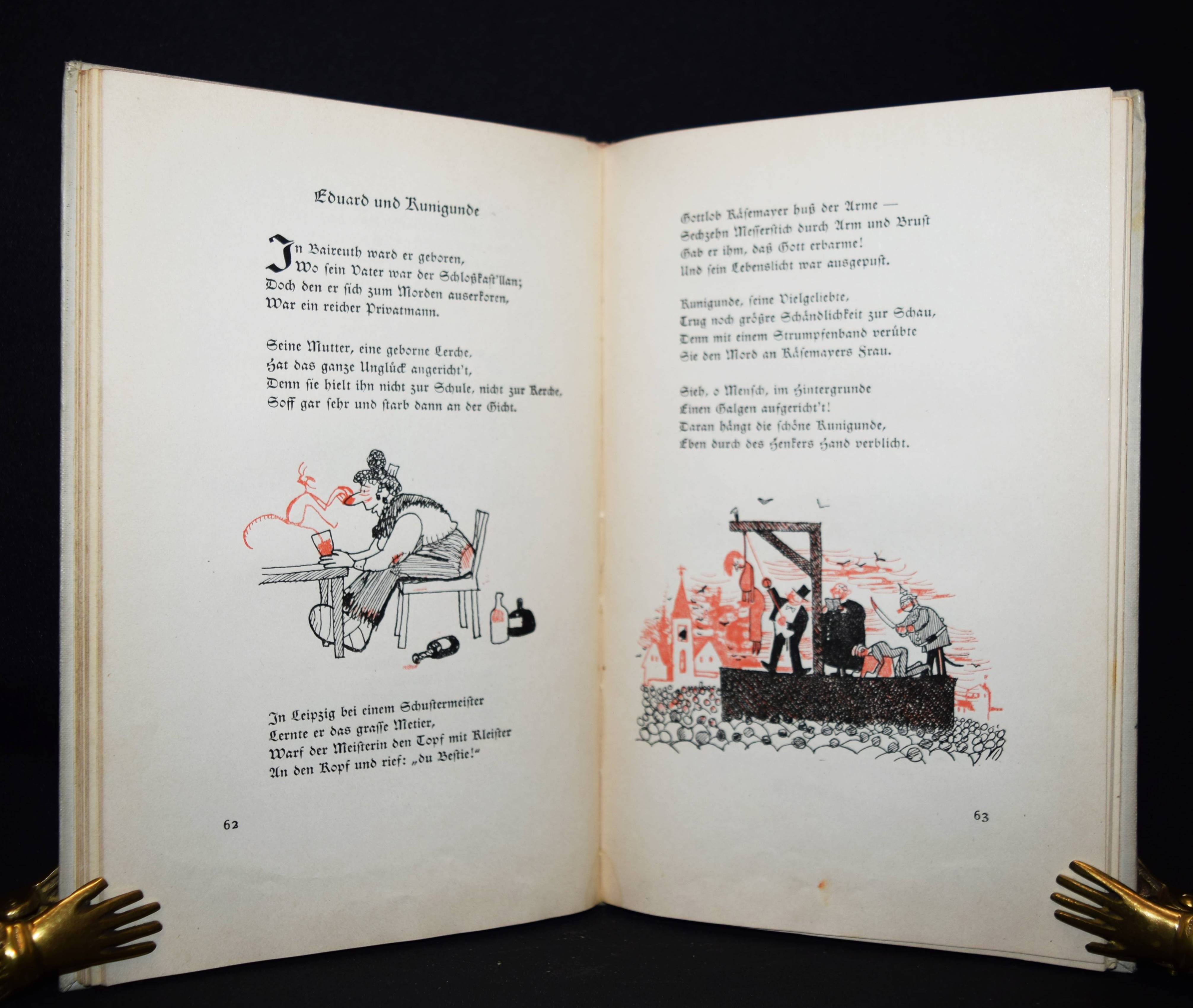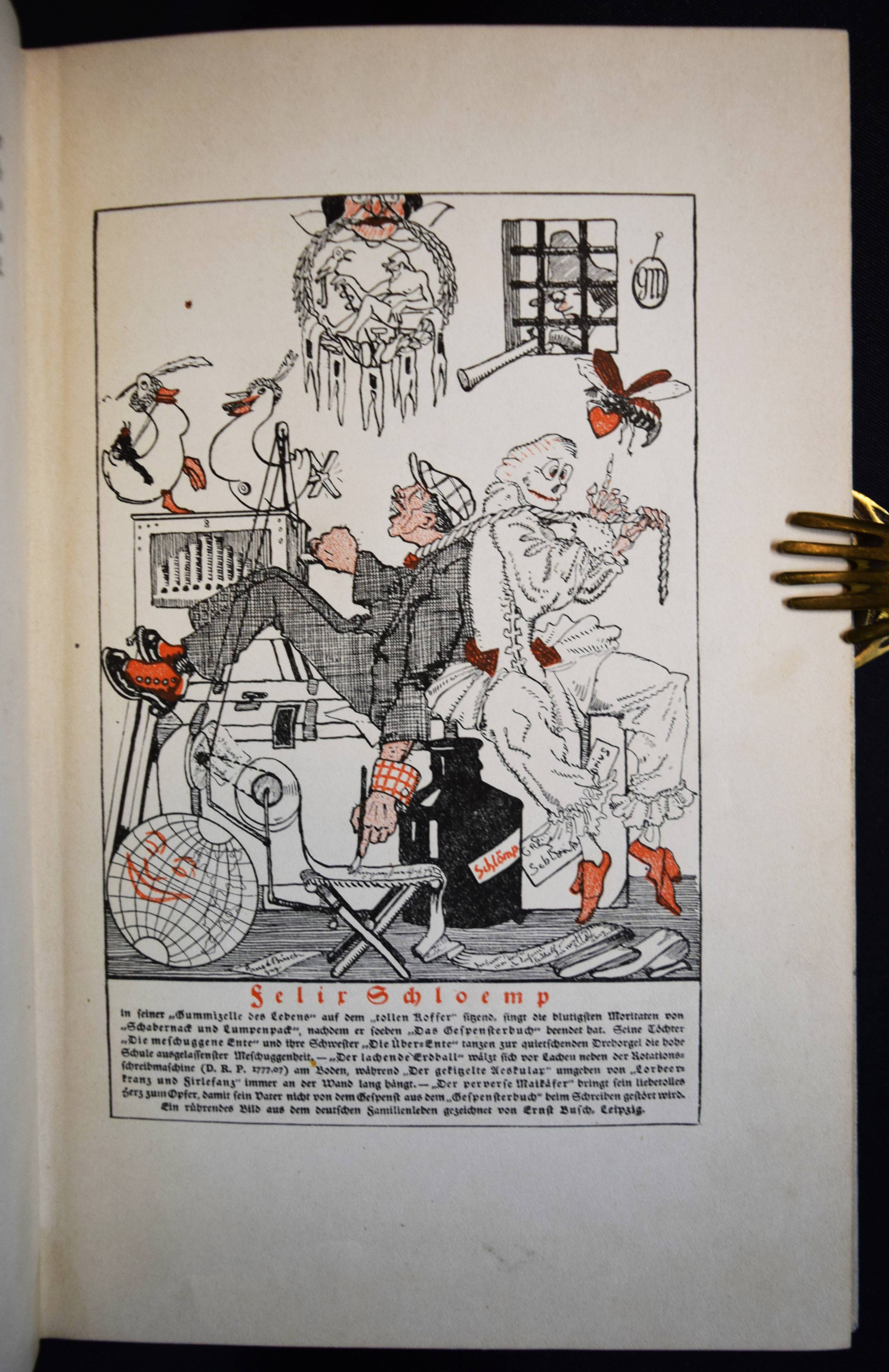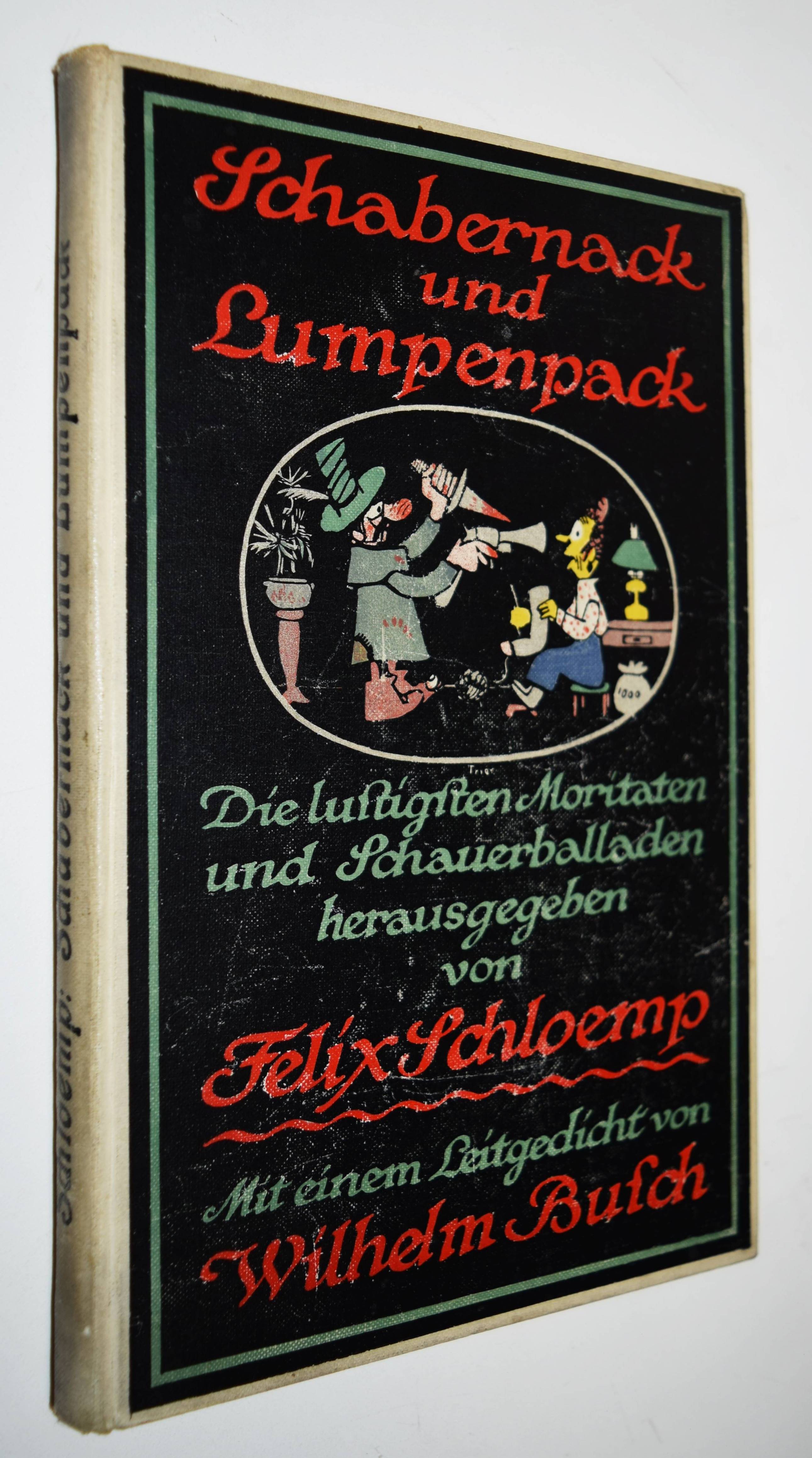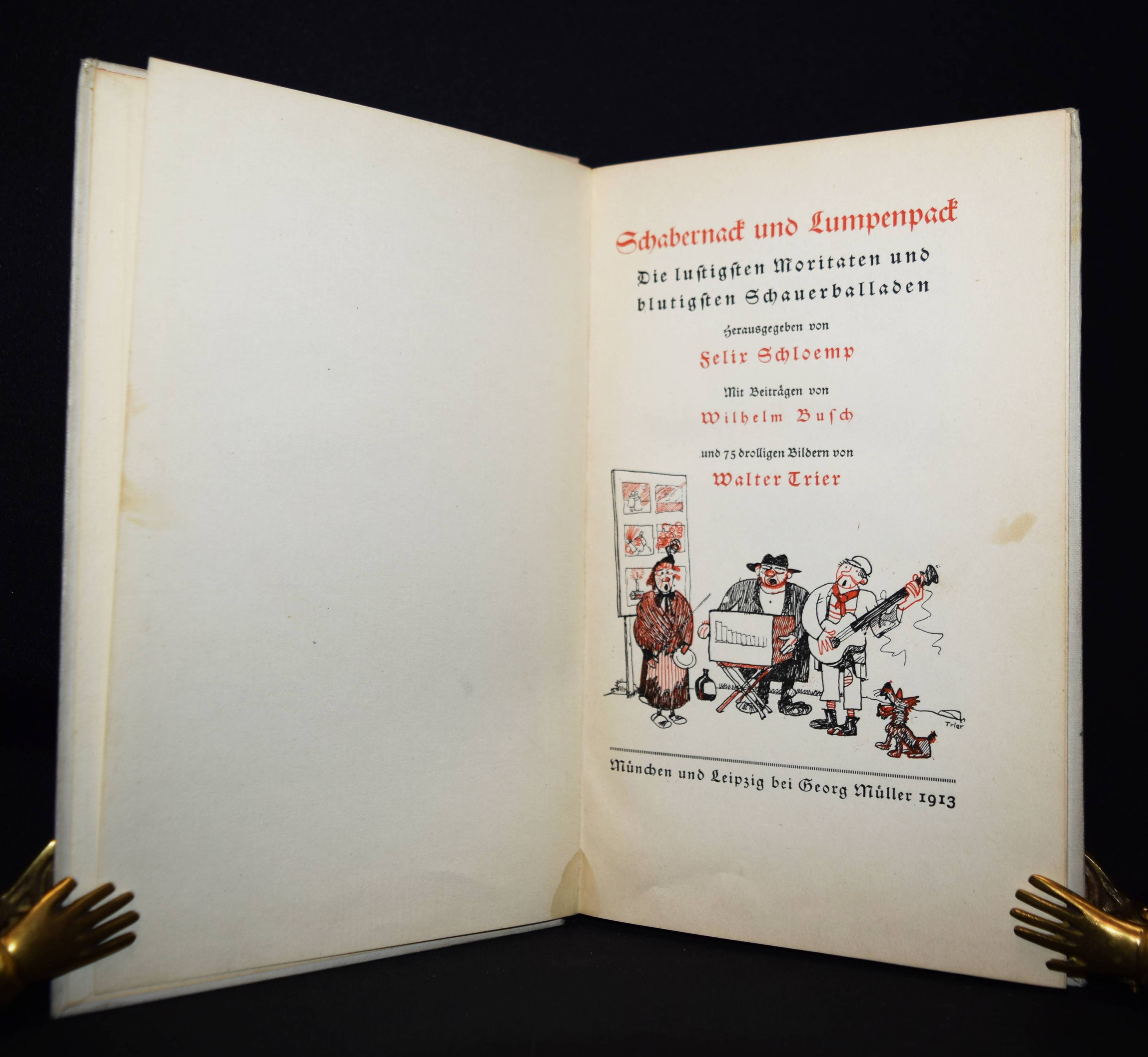 Schloemp, Felix (Hrsg.). Schabernack und Lumpenpack. Die lustigsten Moritaten und blutigsten Schauerballaden. Mit Beiträgen von Wilhelm Busch und 75 drolligen Bildern von Walter Trier. München und Leipzig, Georg Müller 1913. Gr.-8°. 118 S., [5] Bl. mit Titelvignette und 70 zweifarbigen Illustrationen, davon 5 ganzseitig. Farbig illustr. Orig.-Leinenband. Hatry 11. Lang 2. – Sechste Auflage. – Die dritte Buchgestaltung W. Triers. Mit literarischen Beiträgen von W. Busch, F. Wedekind, E. Mühsam, L. Thoma, D. v. Liliencron, T. Etzel und dem Herausgeber. – „Ein Standardwerk des tragikomischen Humors. Mit 100 (!) farbigen Originalbildern von dem Karikaturisten Walter Trier“ (G. Müller). – „Offensichtlich wollte der Verlag mehr Bilder, oder konnte nicht zählen, oder überschätzte die Produktivität Triers oder trieb Schabernack“ (T. Hatry). – Einband etwas berieben, gutes Exemplar der gebundenen Ausgabe.