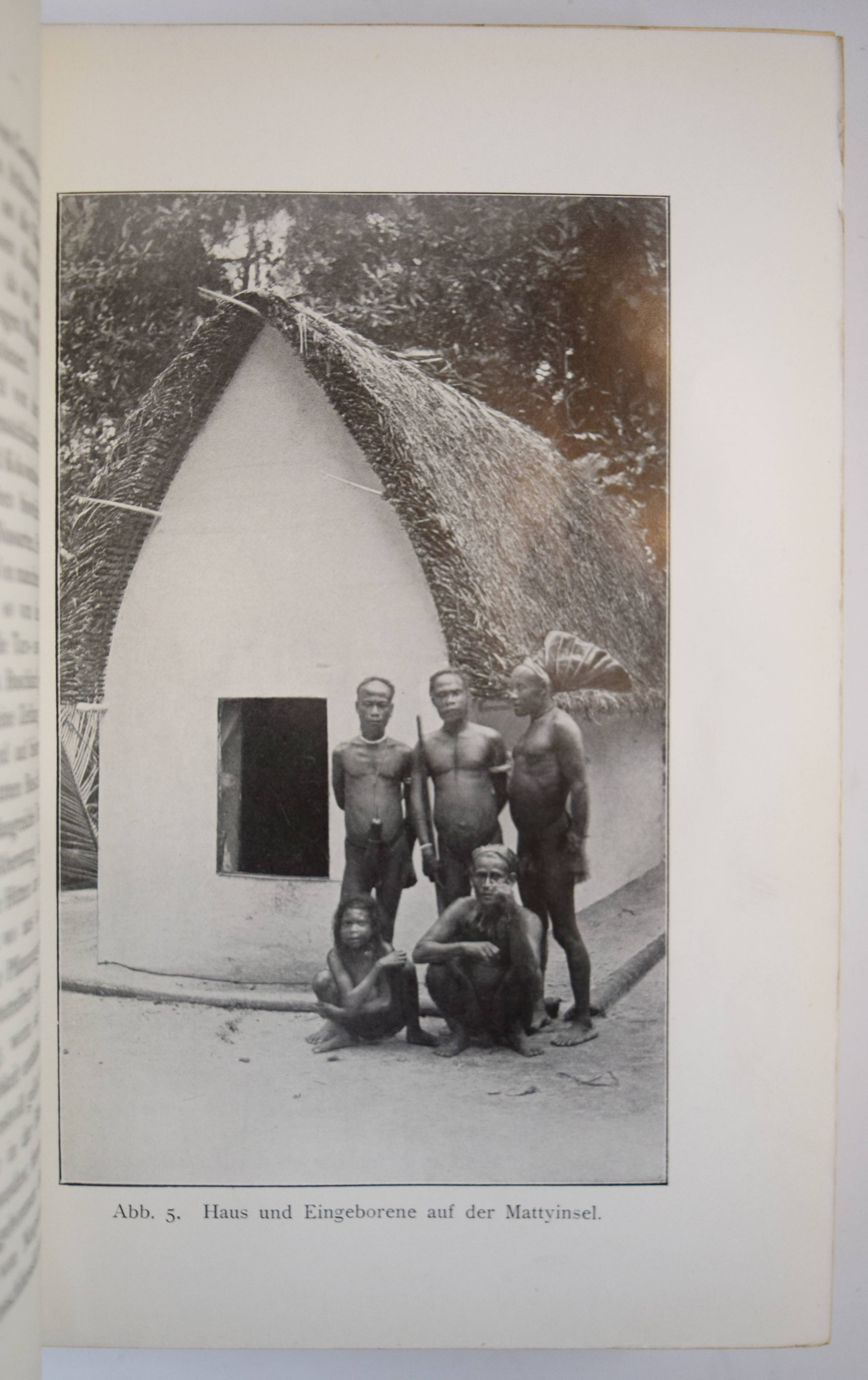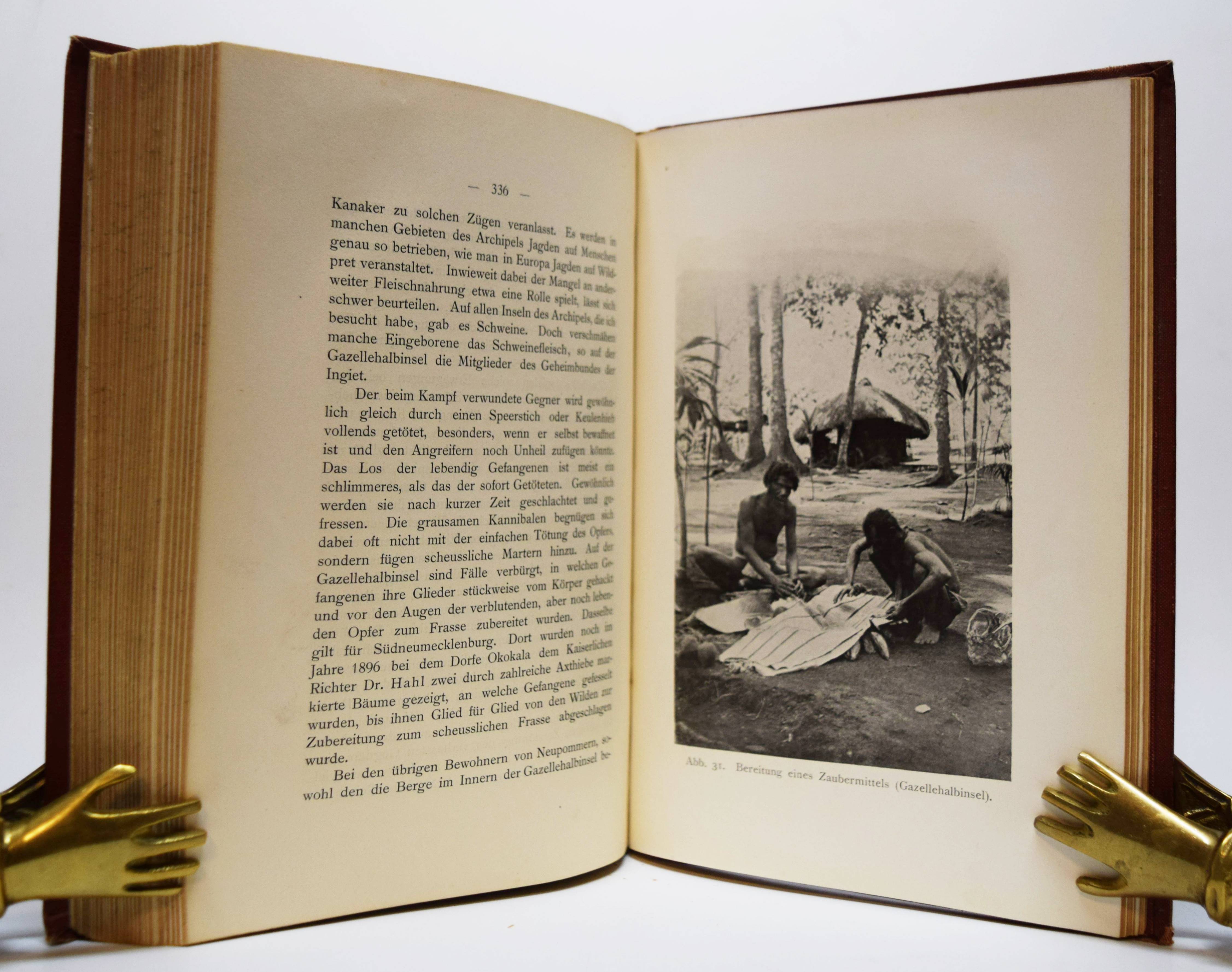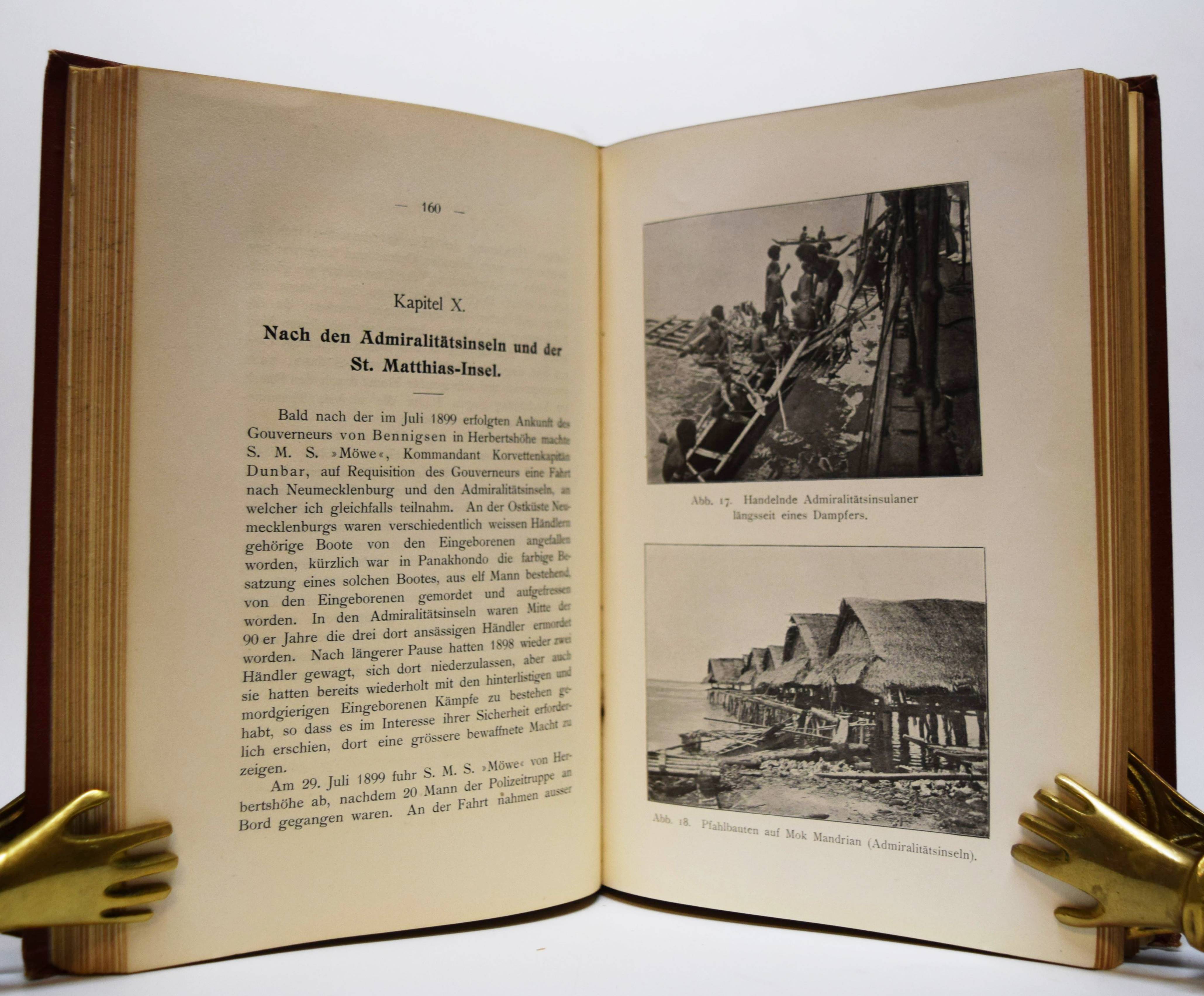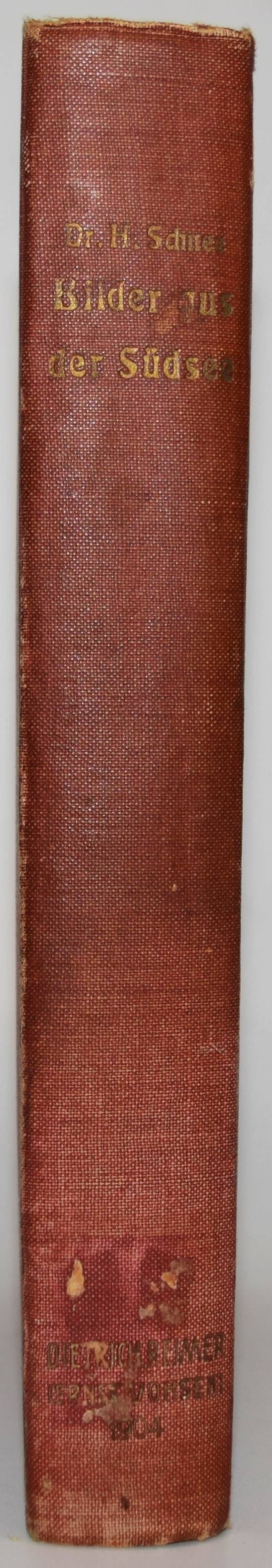 Schnee, H(einrich). Bilder aus der Südsee. Unter den kannibalischen Stämmen des Bismarck-Archipels. Mit 30 Tafeln enthaltend 37 Abb. nach Originalaufnahmen und einer Karte. Berlin, Dietrich Reimer 1904. 8°. XIII, 394 S. mit 30 Tafeln und 37 Abbildungen nach Fotografien. Illustr. Orig.-Leinenband mit goldgepr. Rücken- und Deckeltitel. NDB XXIII, 280. – Erste Ausgabe. – Das Werk enthält folgende Kapitel: Über Neu-Guinea nach Herbertshöhe. Herbertshöhe und die Blanchebucht. Der Bismarck-Archipel und seine eingeborene Bevölkerung. Verwaltung und Rechtsprechung auf der Gazellehalbinsel. Zug gegen die Napaparleute. Fahrt nach den Salomoninseln. Am Varzin. Nach den Admiralitätsinseln und den St. Matthiasinseln. Strafexpeditionen in den Admiralitätsinseln. In den Bainingbergen. Fahrt nach der Südküste Neupommerns. Amokläufer. Einiges über Fauna und Flora, von Dr. Paul Schnee. Sprachliches. Aberglaube, Zauberei. Kämpfe und Kannibalismus. Die wirtschaftliche Entwicklung des Bismarck-Archipels. – Heinrich Schnee (1871-1949) deutscher Kolonialpolitiker, war stellvertretender Gouverneur in Deutsch-Neuguinea, Bezirksamtsrat und Stellvertretender Gouverneur in Samoa und später Gouverneur von Deutsch-Ostafrika. – Einband etwas berieben, St.a.V.u.T., ohne die Karte, sonst gut erhalten.
