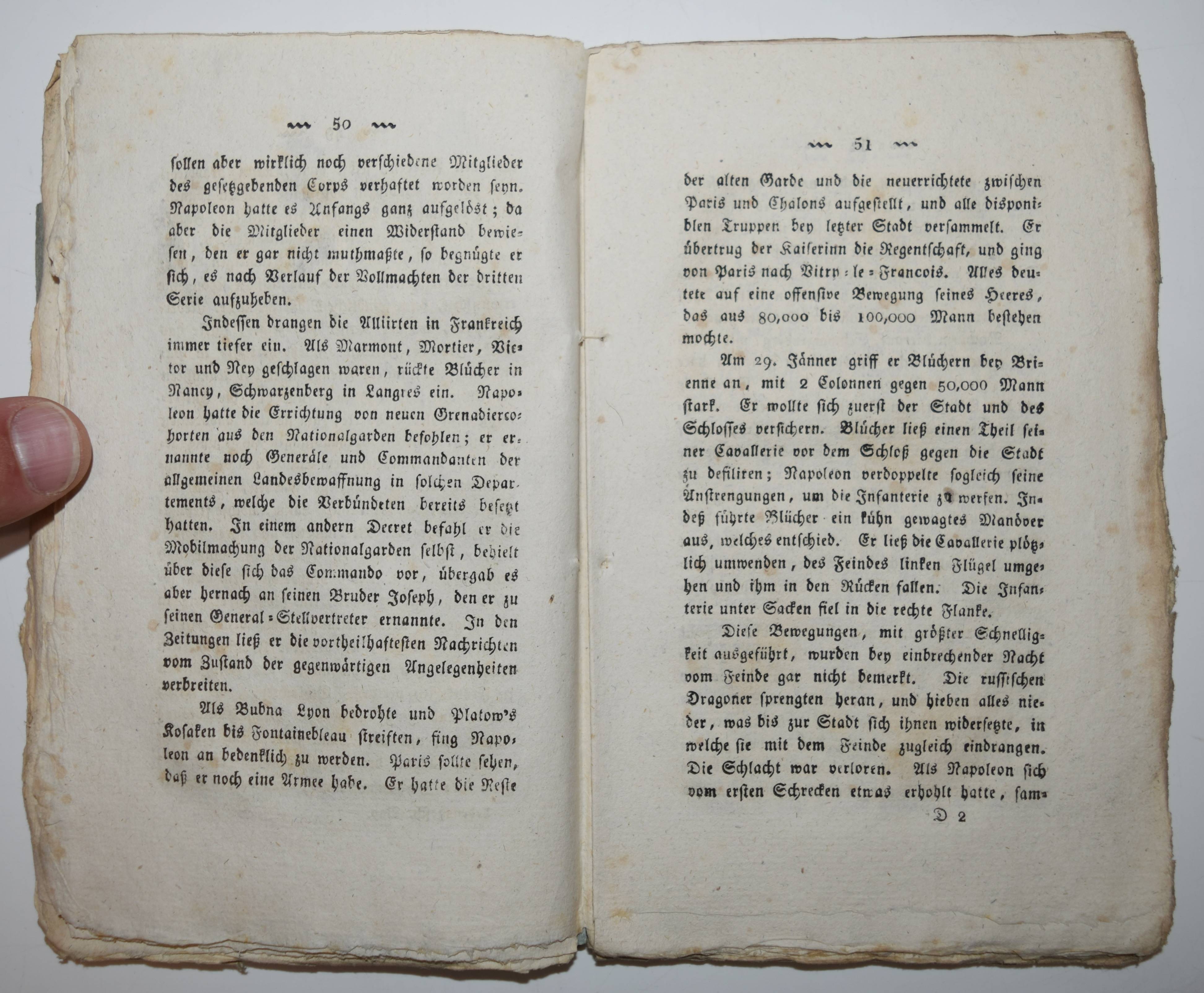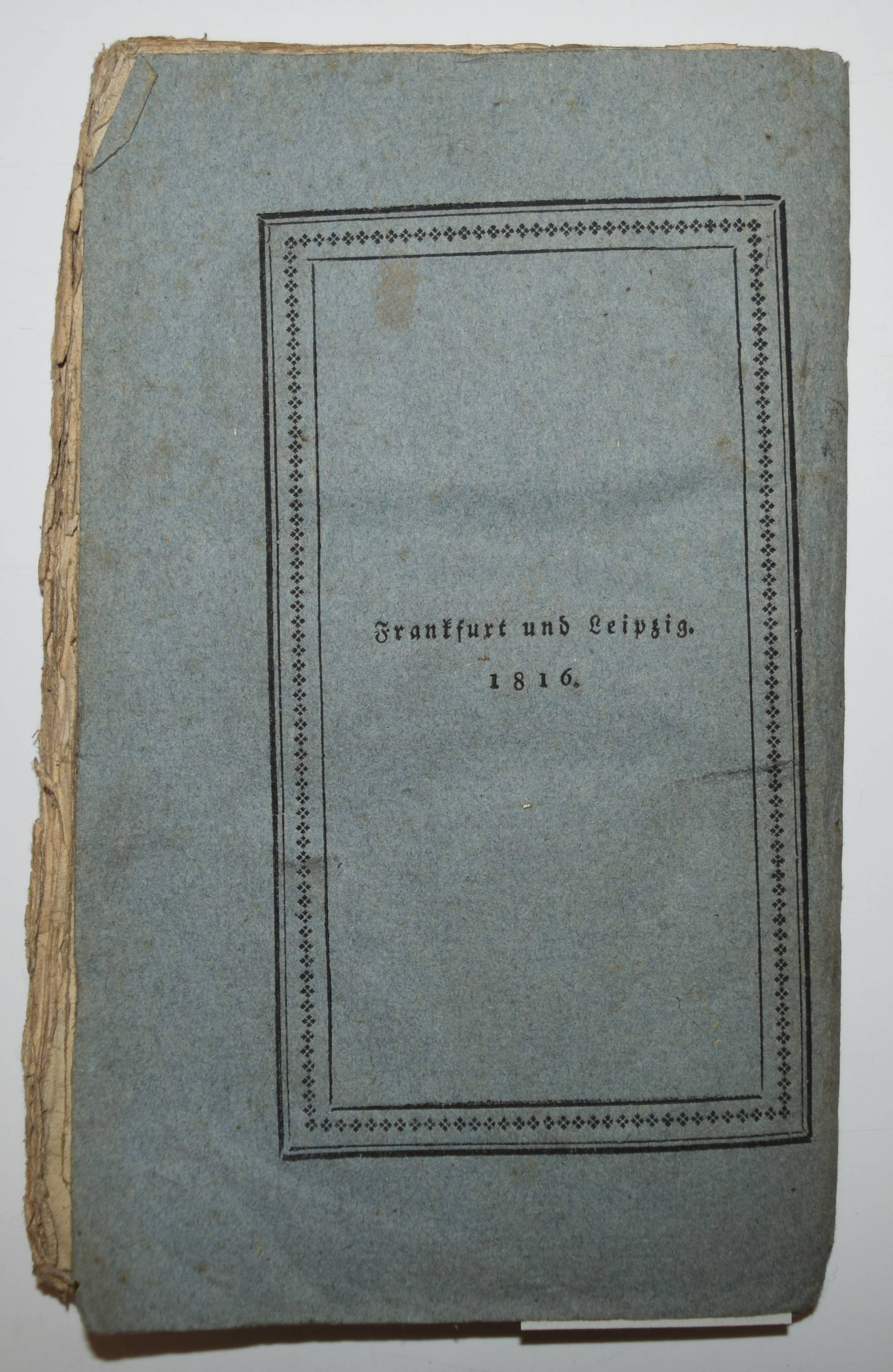 Napoleon I. – Kurze Lebensbeschreibung Napoleon Buonaparte’s. Von seiner Geburt an bis zu seiner Ankunft auf der Insel Elba. 2. verm. Aufl. Frankfurt u. Leipzig, o. Dr. 1816. 8°. 144 S. mit gefalt. gestoch. Frontispiz (Ansicht u. Karte von St. Helena). Typogr. Orig.-Broschur. Nicht bei Holzmann-Bohatta. – Gegenüber der ersten Ausgabe von 1815 (70 S.) wesentlich erweiterte 2. Ausgabe. – Das Frontispiz mit einer Ansicht des Hafens der Insel und einer Karte des Atlantiks. – Umschlag leicht fleckig und Knickspuren, dier ersten Bl. etwas eselsohrig, nur vereinzelt leicht braunfleckig, gutes unbeschnittenes Exemplar.