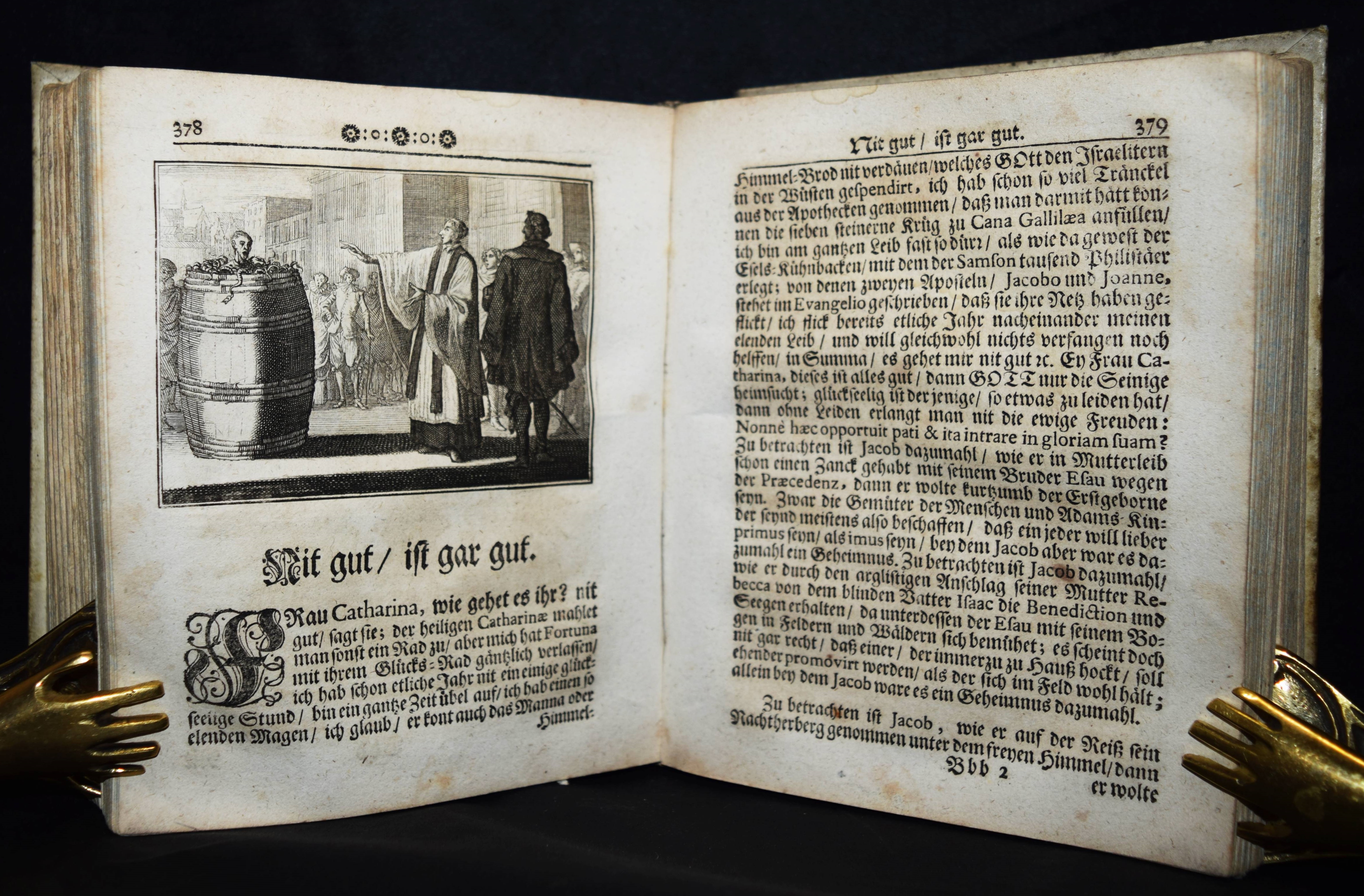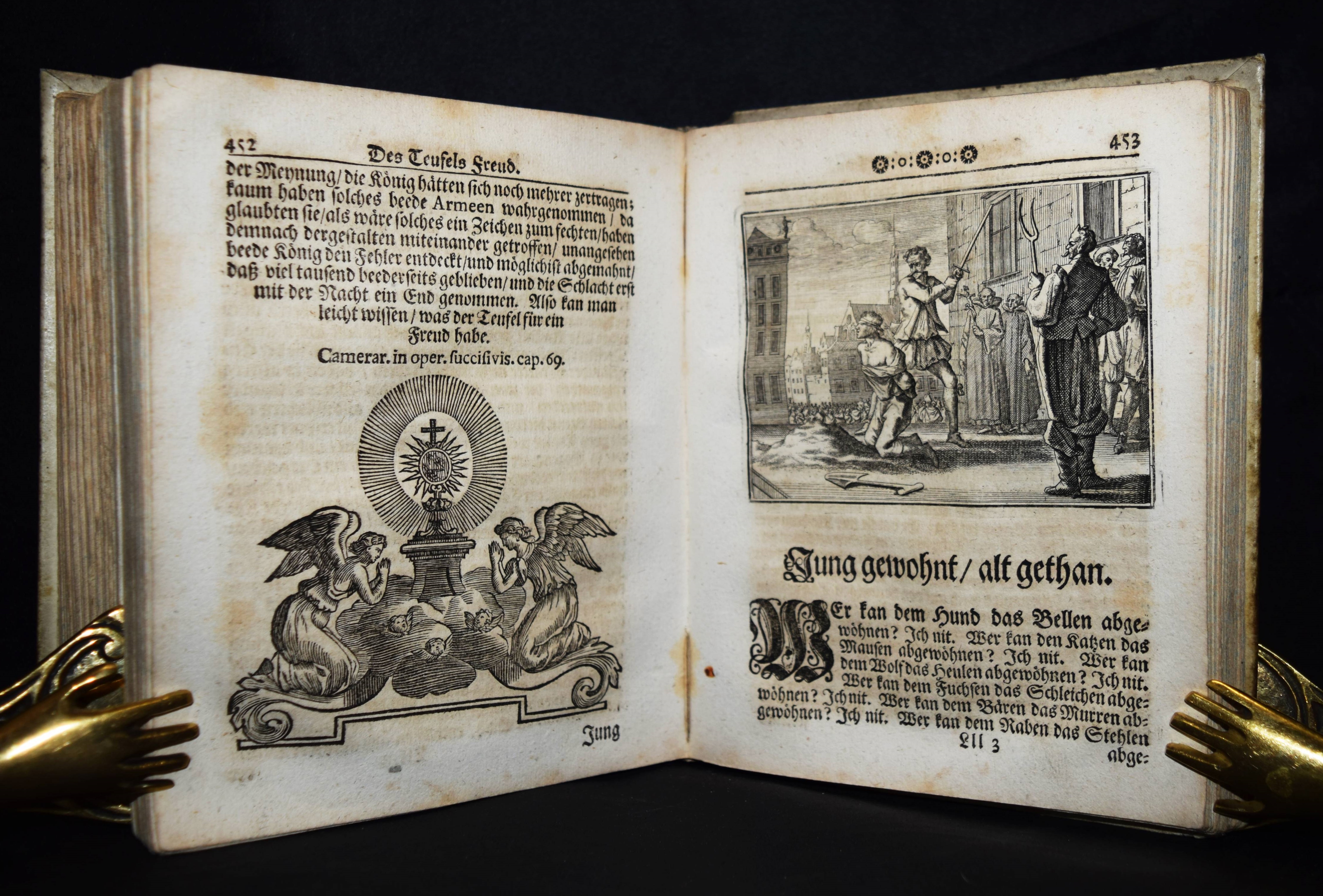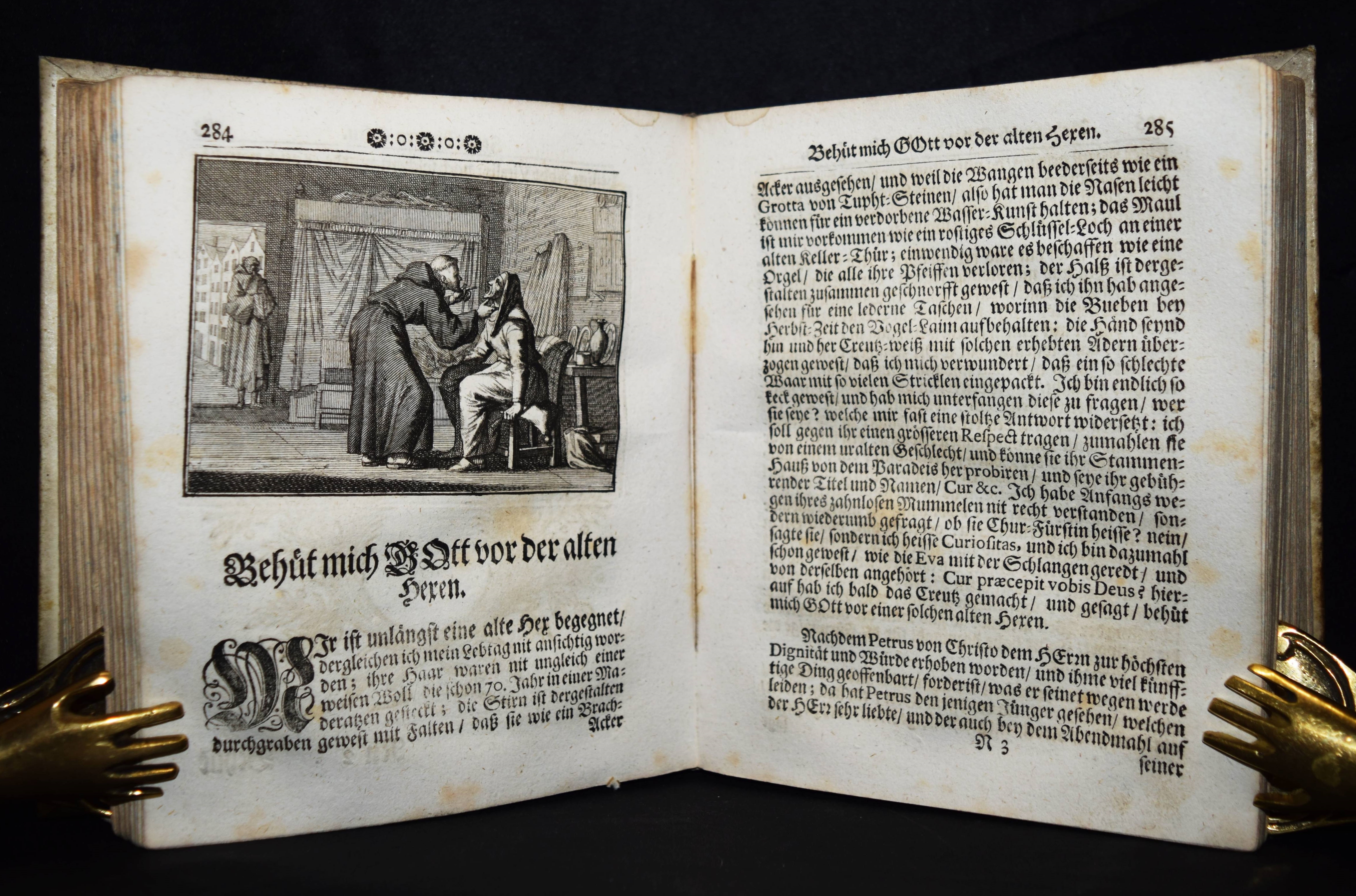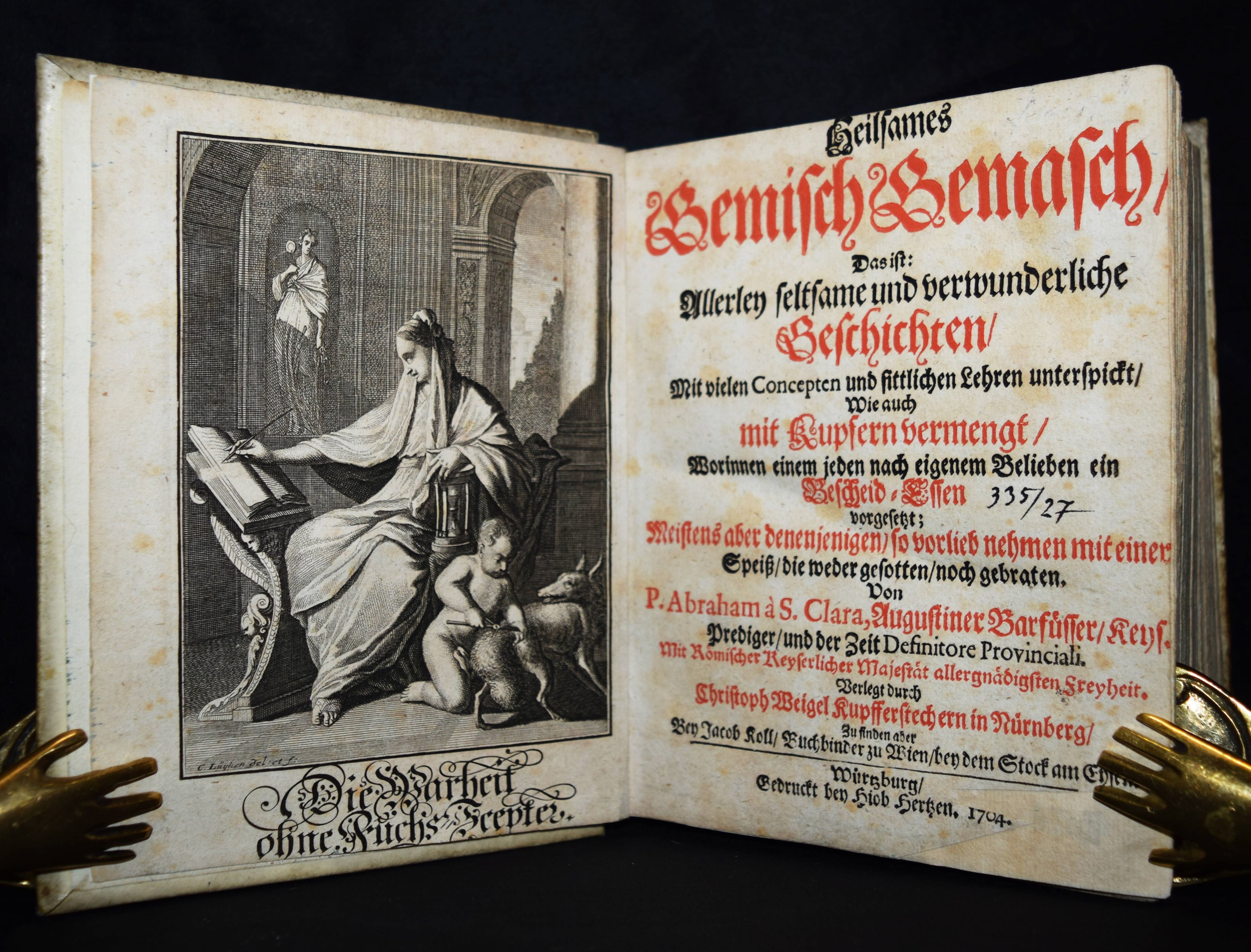 Abraham à Sancta Clara (d. i. Ulrich Megerle). Heilsames Gemisch-Gemasch. Das ist: Allerley seltsame und verwunderliche Geschichten, Mit vielen Concepten und sittlichen Lehren unterspickt, wie auch mit Kupfern vermengt, Worinnen einem jedem nach eigenem Belieben ein Bescheid-Essen vorgesetzt, Meistens aber denenjenigen, so vorlieb nehmen mit einer Speiß, die weder gesotten, noch gebraten. Nürnberg, Christoph Weigel 1704. 8°. [6] Bl., 538 S., [4] Bl. mit Titel in Rot und Schwarz, gestoch. Frontispiz, 50 halbseitigen Kupferstichen von Christian Luyken und zahlr. Schmuck-Vignetten in Holzschnitt. Pergamenteinband der Zeit. Bertsche 46a 1. Dünnhaupt 43.2. Faber du Faur 1124. Goedeke III, 240, 24. Seebaß-Edelmann III, 16. VD18 14375931. – Erster Druck der ersten Ausgabe (S. 244 beginnt mit „tere“; beim zweiten Druck „Säck“); „Zu finden aber bey Jacob Koll, Buchbinder zu Wien, bey dem Stock am Eysen. Würzburg, gedruckt bey Hiob Hertzen“. – „To the stories offered, Abraham adds entertaining admonitions written in the tone of popular sermons … What he meant to provide was a devotional book, prious at the same time entertaning, indeed entrancing“ (Faber du Faur). – „Das Frontispiz ist unterschrieben „Die Wahrheit ohne Fuchs-Scepter“; es stellt eine ins Schreiben vertiefte Frau dar, an deren Seite ein kl. Kind einem Fuchs den Schwanz abschneidet. Die einzelnen Kapitel sind meist schon durch drastische Überschriften gekennzeichnet: Pfuy Teufel wie stinckts, Pagatell führt in die Höll, Das Tau förscht der Wauwau, Behüt mich Gott vor der alten Hexen, Gute Creditores seyd grosse Debitores, Das geistliche Kräuter-Buch, Rosimunda du hertziger Schatz, u. ä. Die figurenreichen Kupfer passen gut zum Text und zeichnen sich durch hübsche Landschaften und Durchblicke aus“ (Seebaß-Edelmann). – Einband etwas angestaubt und am Kapital leicht eingerissen, stellenweise etwas braunfleckig und gebräunt, sehr gutes Exemplar.