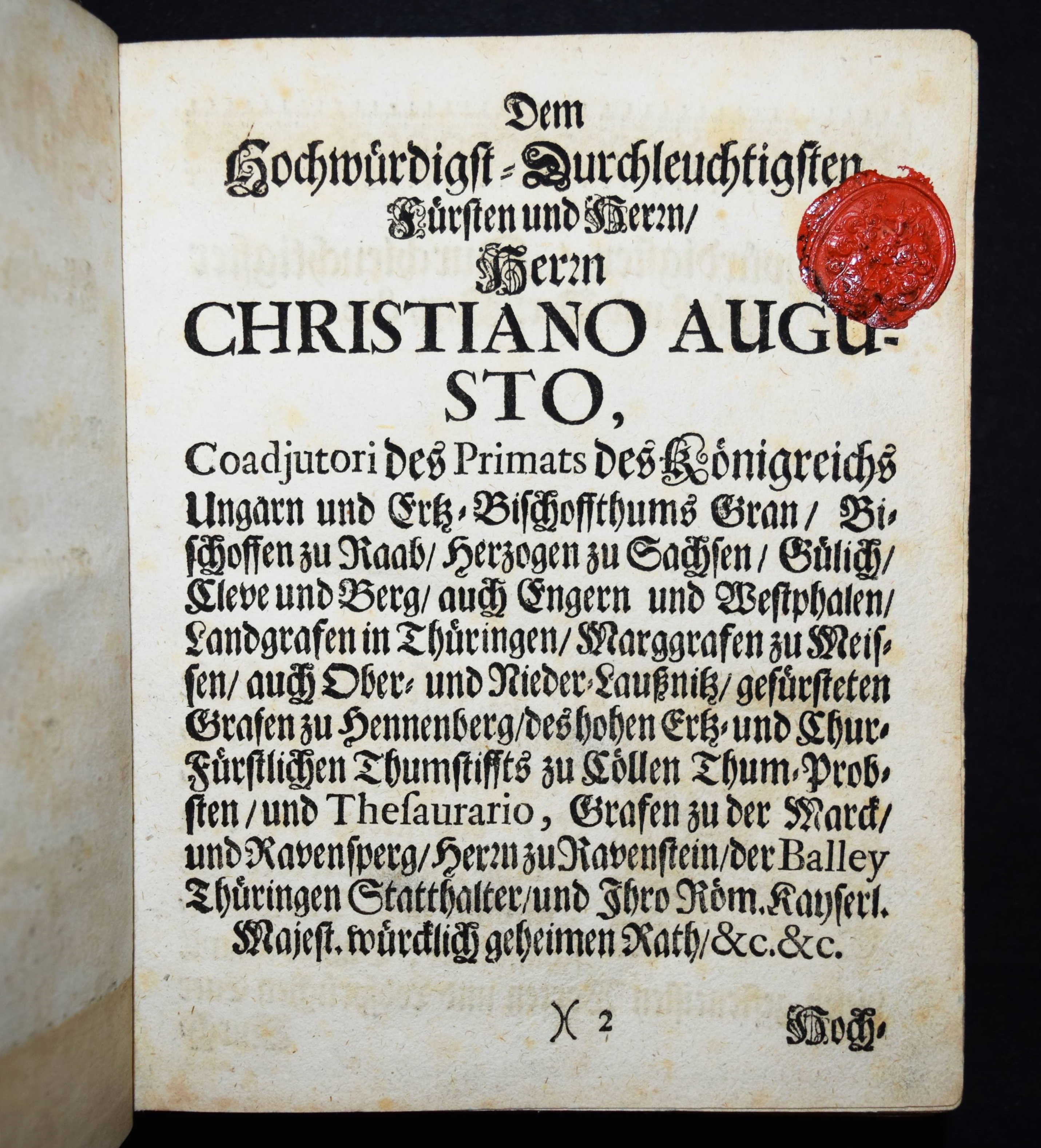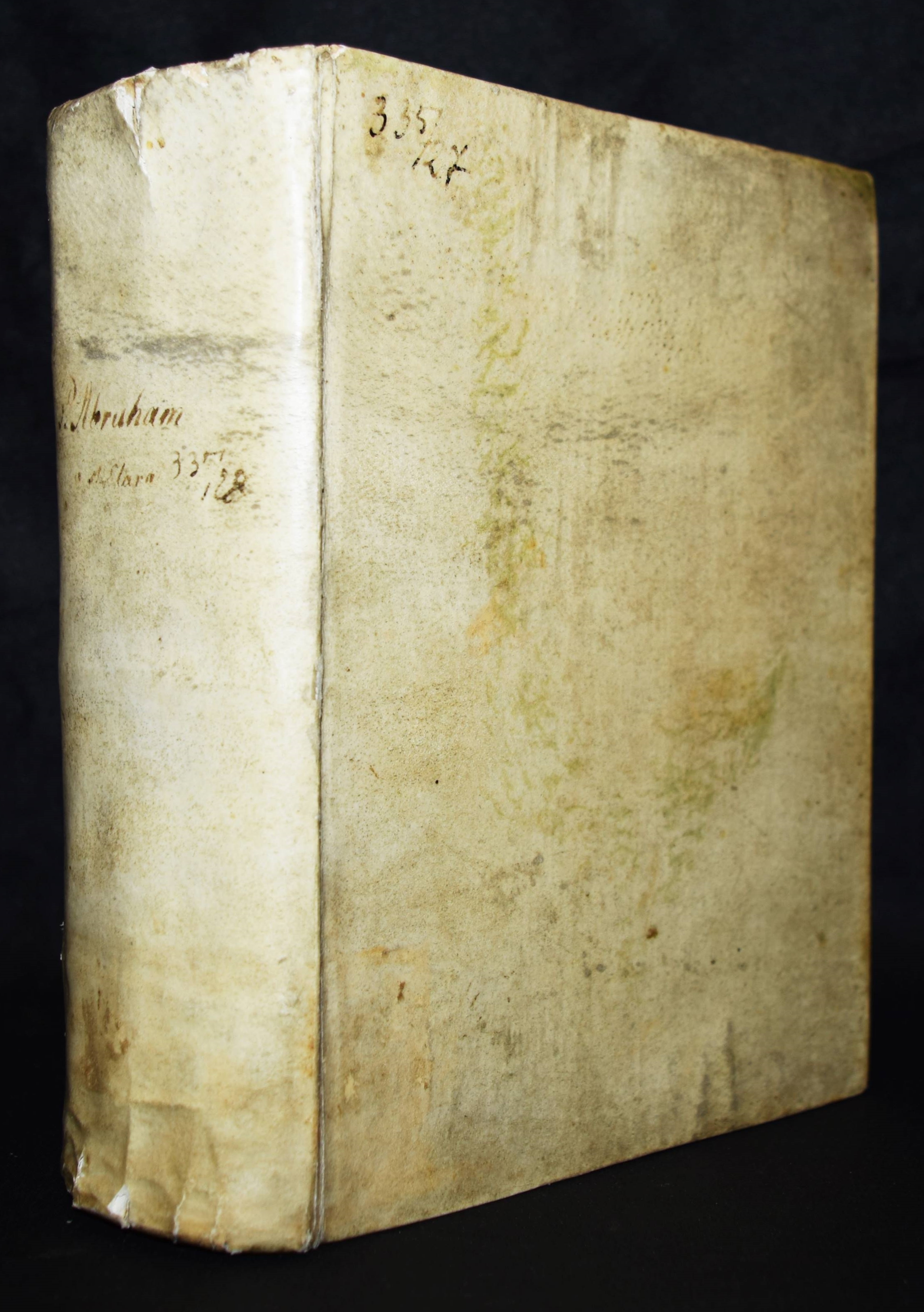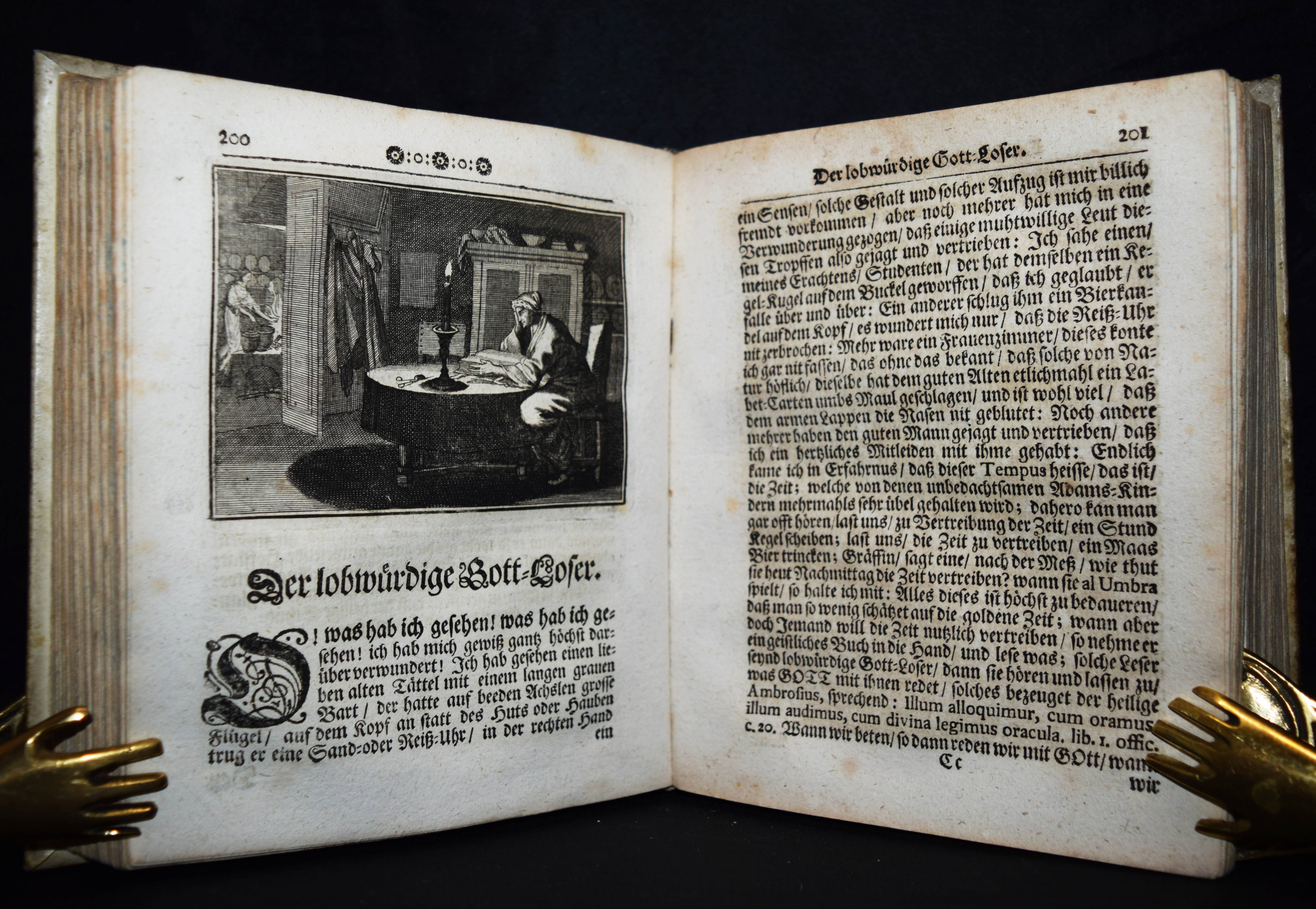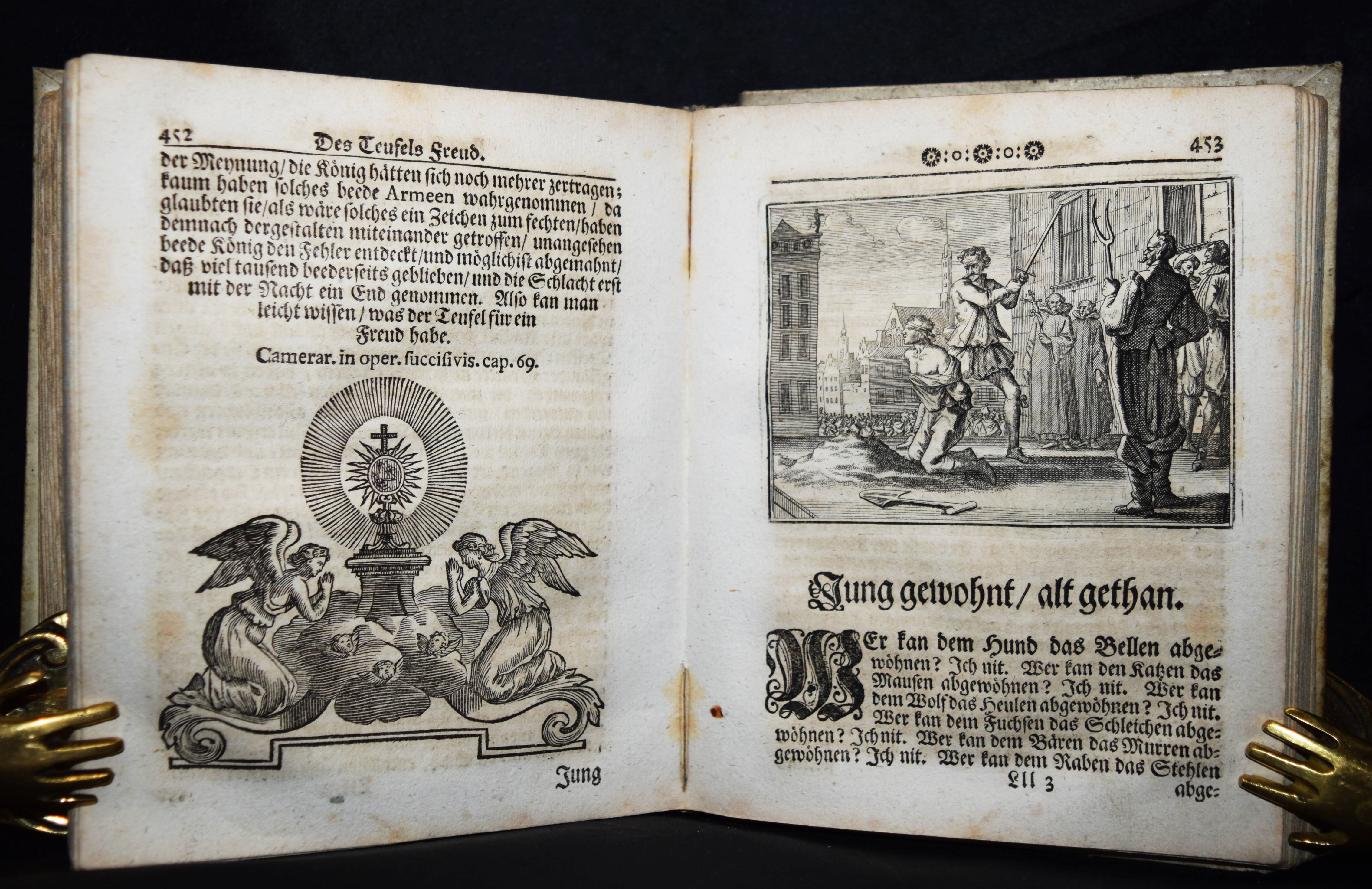Abraham à Sancta Clara (d. i. Ulrich Megerle). Heilsames Gemisch-Gemasch. Das ist: Allerley seltsame und verwunderliche Geschichten, Mit vielen Concepten und sittlichen Lehren unterspickt, wie auch mit Kupfern vermengt, Worinnen einem jedem nach eigenem Belieben ein Bescheid-Essen vorgesetzt, Meistens aber denenjenigen, so vorlieb nehmen mit einer Speiß, die weder gesotten, noch gebraten. Nürnberg, Christoph Weigel 1704. 8°. [6] Bl., 538 S., [4] Bl. mit Titel in Rot und Schwarz, gestoch. Frontispiz, 50 halbseitigen Kupferstichen von Christian Luyken und zahlr. Schmuck-Vignetten in Holzschnitt. Pergamenteinband der Zeit. Bertsche 46a 1. Dünnhaupt 43.2. Faber du Faur 1124. Goedeke III, 240, 24. Seebaß-Edelmann III, 16. VD18 14375931. – Erster Druck der ersten Ausgabe (S. 244 beginnt mit „tere“; beim zweiten Druck „Säck“); „Zu finden aber bey Jacob Koll, Buchbinder zu Wien, bey dem Stock am Eysen. Würzburg, gedruckt bey Hiob Hertzen“. – „To the stories offered, Abraham adds entertaining admonitions written in the tone of popular sermons … What he meant to provide was a devotional book, prious at the same time entertaning, indeed entrancing“ (Faber du Faur). – „Das Frontispiz ist unterschrieben „Die Wahrheit ohne Fuchs-Scepter“; es stellt eine ins Schreiben vertiefte Frau dar, an deren Seite ein kl. Kind einem Fuchs den Schwanz abschneidet. Die einzelnen Kapitel sind meist schon durch drastische Überschriften gekennzeichnet: Pfuy Teufel wie stinckts, Pagatell führt in die Höll, Das Tau förscht der Wauwau, Behüt mich Gott vor der alten Hexen, Gute Creditores seyd grosse Debitores, Das geistliche Kräuter-Buch, Rosimunda du hertziger Schatz, u. ä. Die figurenreichen Kupfer passen gut zum Text und zeichnen sich durch hübsche Landschaften und Durchblicke aus“ (Seebaß-Edelmann). – Einband etwas angestaubt und am Kapital leicht eingerissen, stellenweise etwas braunfleckig und gebräunt, sehr gutes Exemplar.