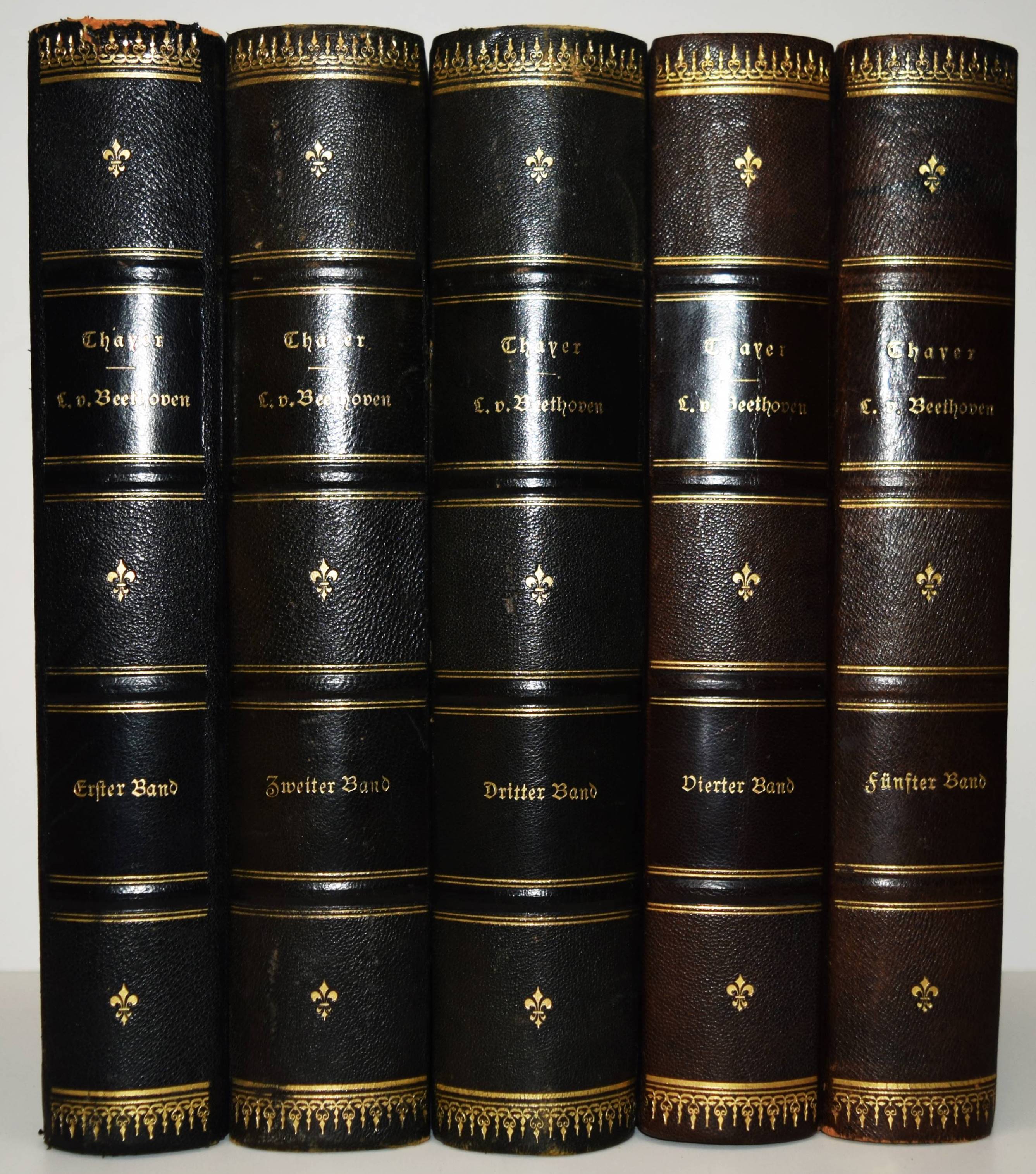 Beethoven – Thayer, Alexander Wheelock. Ludwig van Beethovens Leben. Nach dem Original-Manuskript deutsch bearbeitet von Hermann Deiters. Misch-Auflage, Revision der von H. Deiters bewirkten Neubearbeitung (1901) von Hugo Riemann. 5 Bände. Leipzig, Breitkopf & Härtel 1908-1917. Gr.-8°. Mit zahlr. Musik-Beispielen. Orig.-Halblederbände mit goldgepr. Rückentiteln und Rückenvergoldung. MGG I, 1563. NDB III, 572 f. (Deiters). Kat. Wolffheim II, 449. – „Vor allem … die deutsche Bearbeitung der damals noch nicht im englischen Original erschienenen Beethovenbiographie des Amerikaners Alexander Wheelock Thayer (1817-1897) seit 1866 (in 3 Bänden, denen, von Hugo Riemann betreut, noch 2 weitere folgten) sind Gipfelleistungen in der Geschichte der neueren Musikerbiographie geworden“ (NDB). – Band I am Kapital geringfügig beschädigt, schönes Exemplar der dekorativen Halblederausgabe.