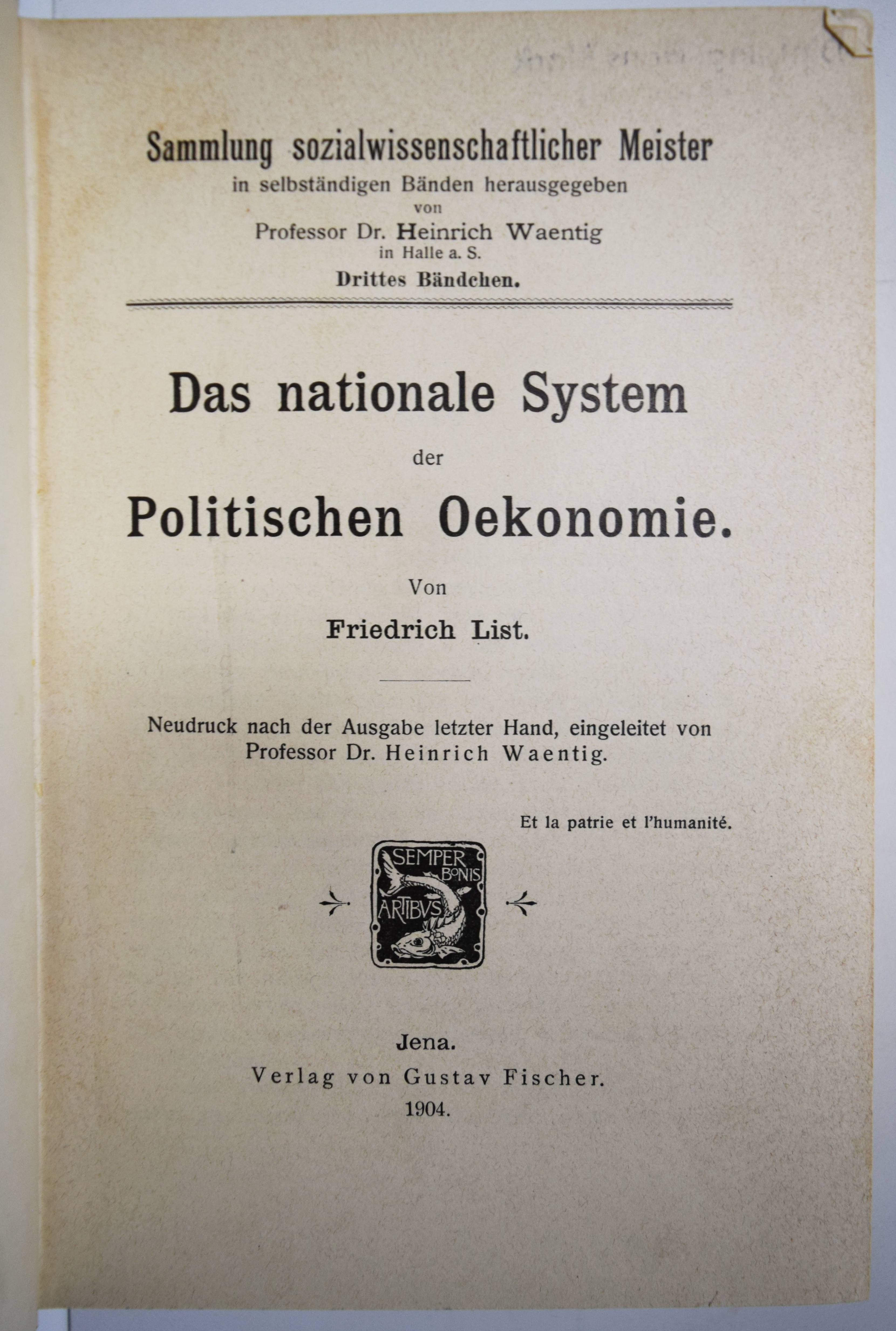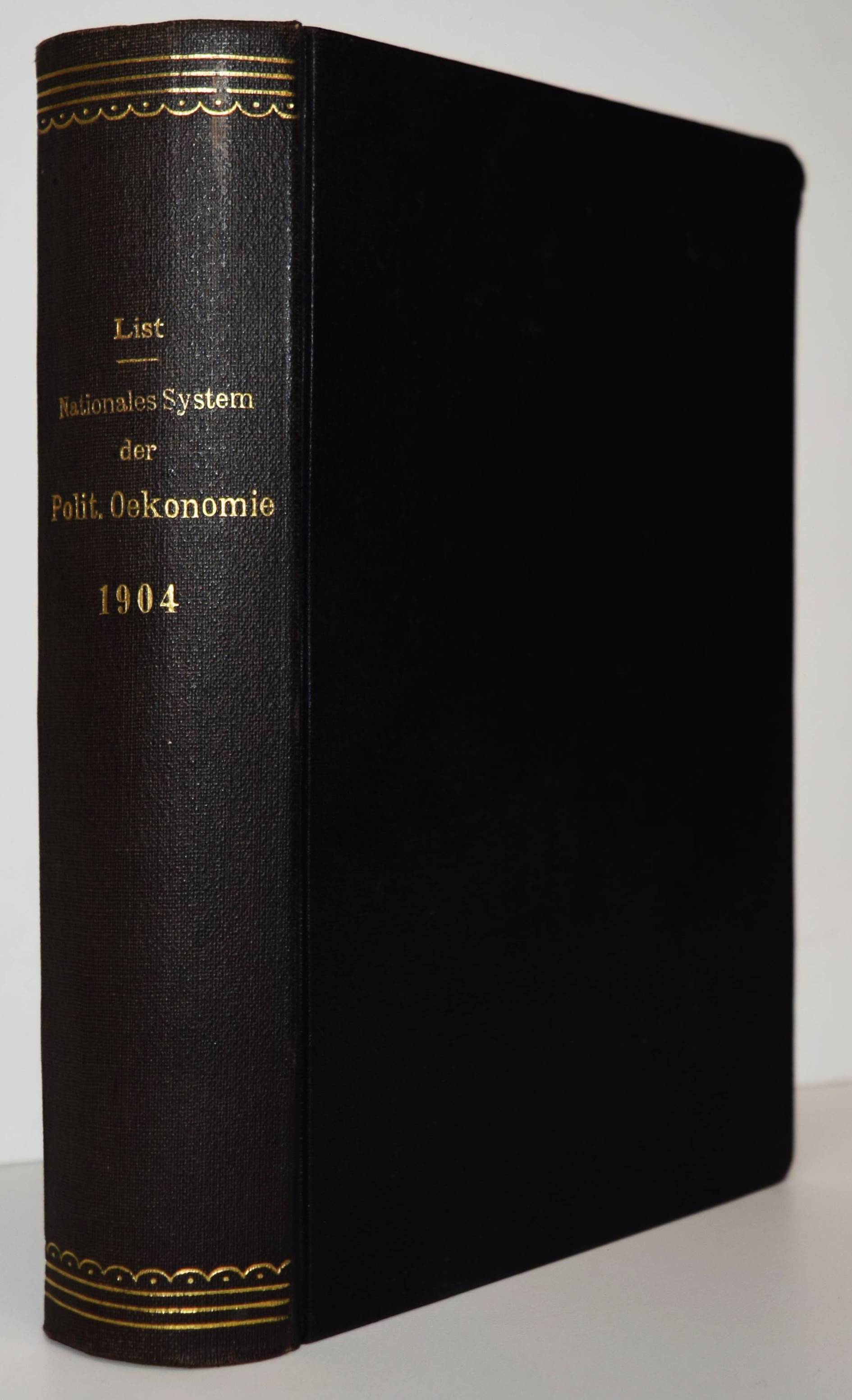 List, Friedrich. Das nationale System der politischen Ökonomie. Neudruck nach der Ausgabe letzter Hand eingeleitet von Heinrich Waentig. Jena, Gustav Fischer 1904. 8°. X, 552 S. Orig.-Leinenband mit goldgepr. Rückentitel. (Sammlung sozialwissenschaftlicher Meister, Band 3). Erste Auflage der Neuausgabe des „Evangeliums der Schutzzölle“. In seinem 1841 erschienenen Hauptwerk entwickelt List in Opposition zu Adam Smith’ Prinzip des Freihandels die Theorie eines wirtschaftspolitischen Systems, „das sich auf wechselseitiges Wirken von Freihandel und Kontrollen gründete, jedoch immer durch das Wohl des Staates bestimmt bleiben sollte … Diese Ansichten fielen mit dem Wiedererwachen des deutschen Nationalbewußtseins zusammen, so daß Lists Buch bei seiner Veröffentlichung großes Aufsehen erregte. Siebzig Jahre lang benutzten es die Verfechter von Schutzzöllen in Deutschland, Großbritannien und den Vereinigten Staaten als ihr Evangelium“ (Carter/Muir, PMM 311). – Mit Blick auf Donald Trumps Zollpolitik erschreckend aktuell.– Exlibris, St.a.V., sehr gutes sauberes Exemplar.