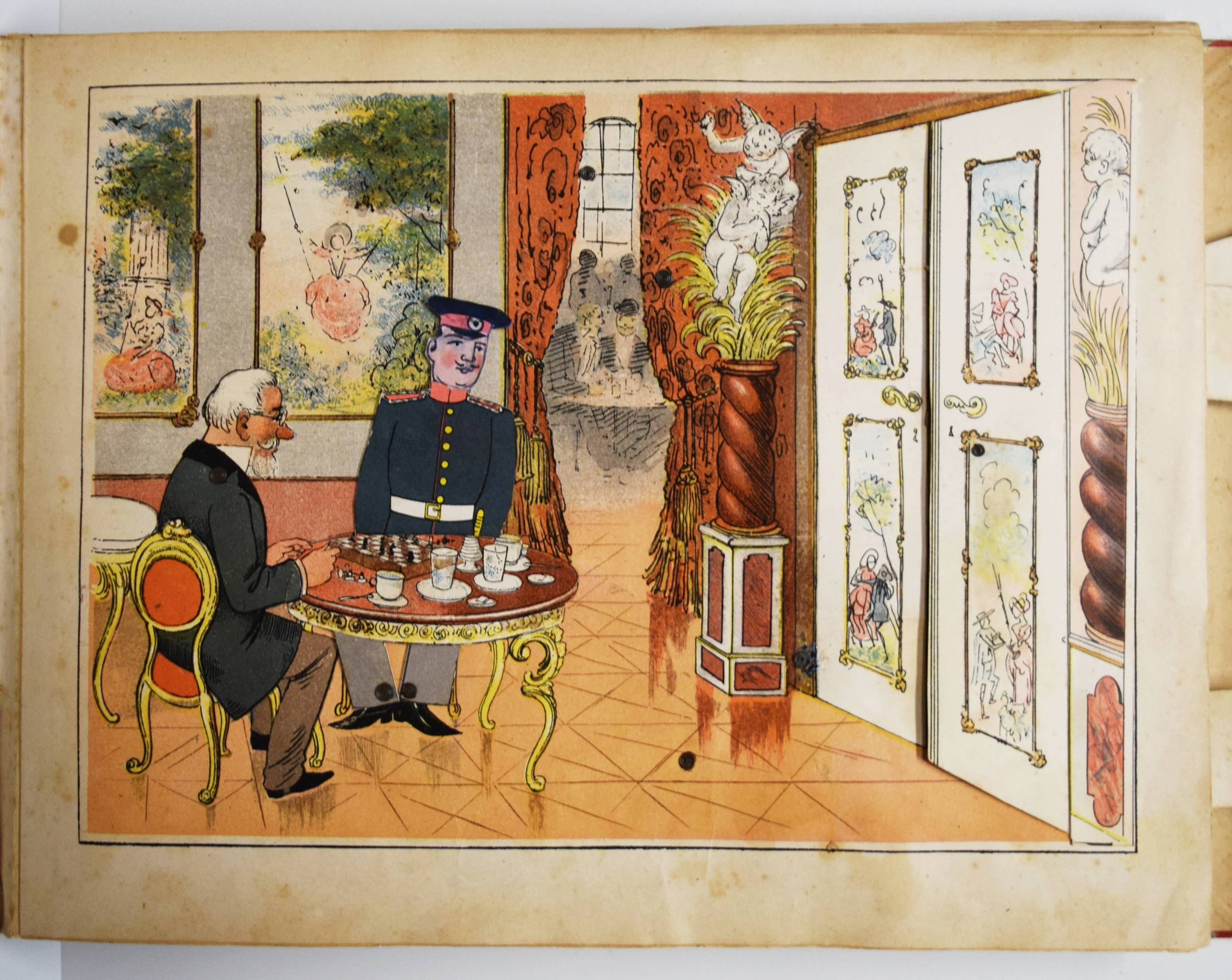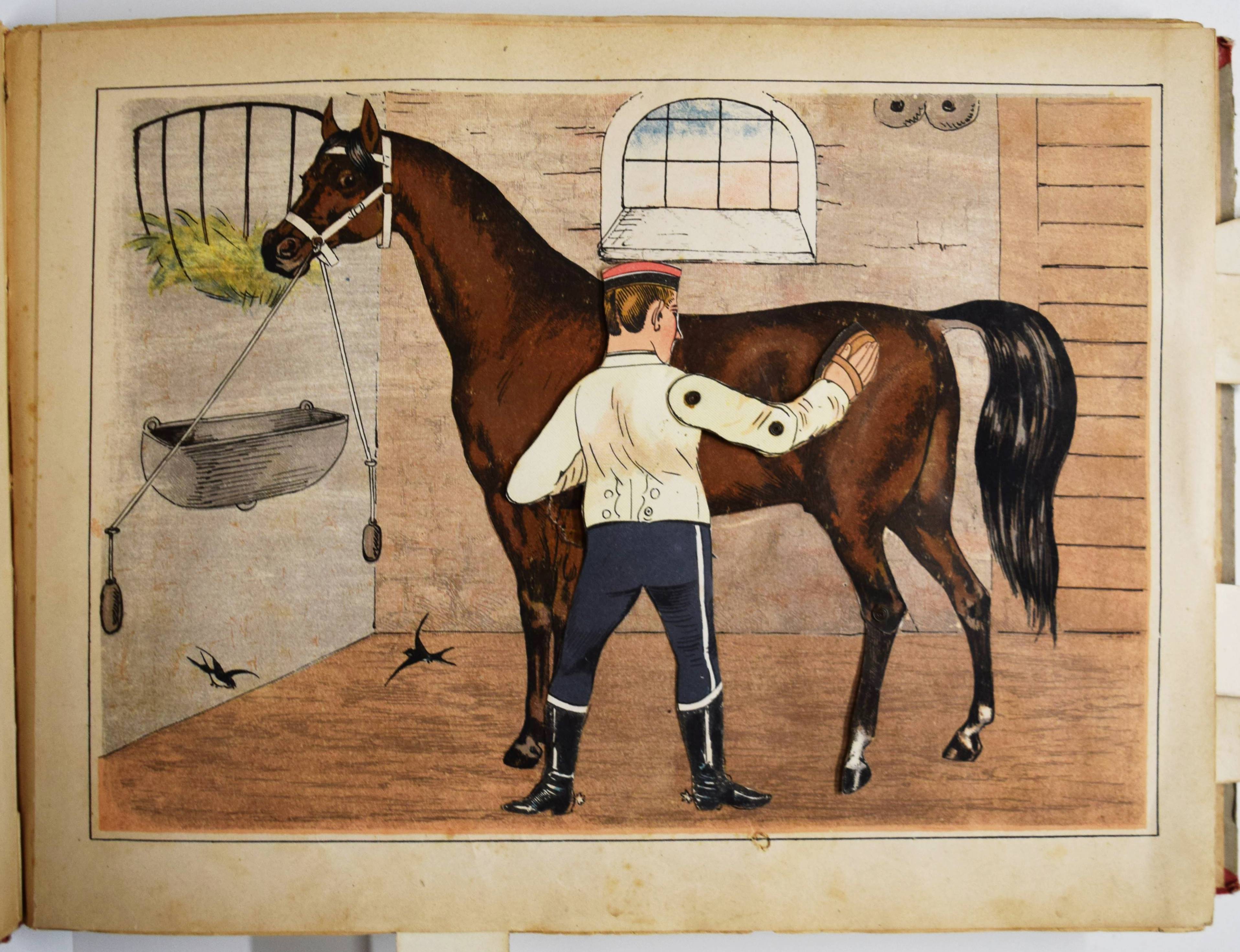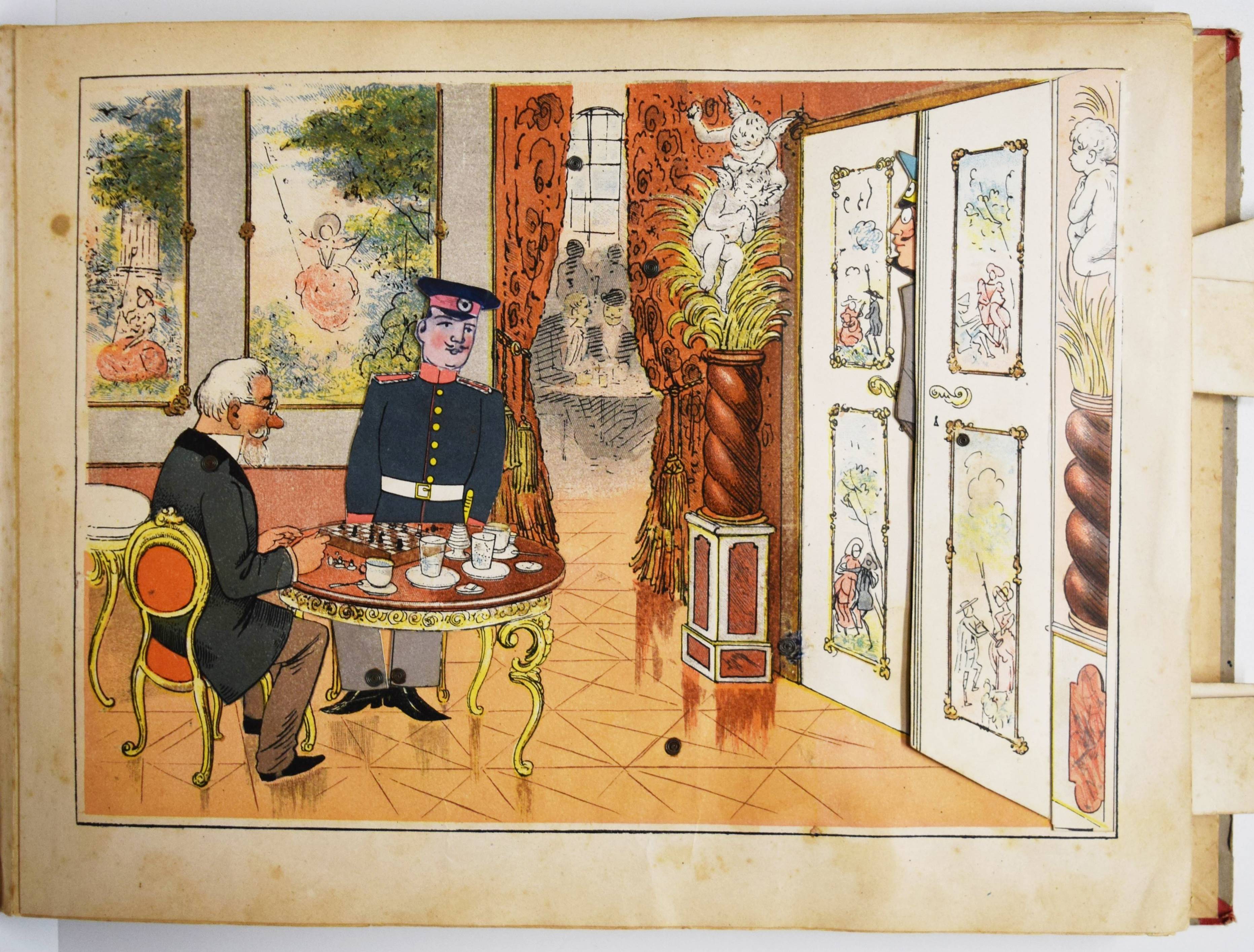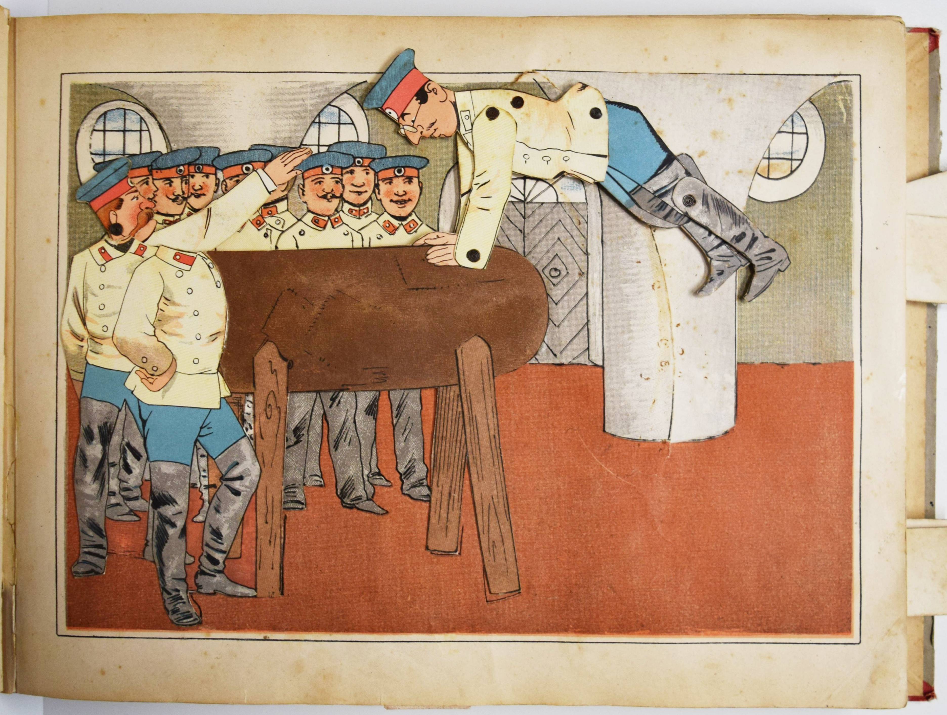 Meggendorfer, Lothar. Militärisches Ziehbilderbuch (Deckeltitel). München, Braun und Schneider o. J. (1890). Quer-4° (27 x 37 cm.). [17] S. mit 8 farblithogr. Tafeln mit beweglichen Teilen und Zieh-Mechanismus. Orig.-Halbleinenband mit farblithogr. Deckelbild. Hobrecker, Braunschweig 5080. Katzenheim 241 f. Krahé 95. LKJ II, 459 f. Ries 713, 73. Seebaß II, 1283. Wegehaupt IV, 2357 (vermutet irrig ein fehlendes Titelblatt). – Erste und einzige Ausgabe; eines der seltensten Spiel-Bilderbücher von L. Meggendorfer. Wie die meisten Spiel-Bilderbücher Meggendorfers ohne ein sep. Titelblatt; die erste Seite mit dem Vorwort. – „Aus dem Soldatenleben zeigt dies Buch Euch allerhand, die Jugend ist ja wohlgeneigt stets dem Soldatenstand“ (aus dem Vorwort). Zu sehen sind Rekruten, Husar, Musterung, Turnen, Außer Dienst, In der Schwemme, Bajonettfechten und Regimentsmusik. Meggendorfer verwendet hier nicht nur die von ihm bereits bekannten Ziehmechanismen, sondern dieses Buch verändert sich auch in der Dreidimensionalen. Als konstruktives Gestaltungsmittel benutzt Meggendorfer zur Veränderung der Bilder u. a. eine Tür, die sich in der Szene ‚Außer Dienst‘ öffnet und durch die ein Offizier tritt (der Offizier steckt den Kopf durch den Türschlitz) oder er läßt in der Szene ‚In der Schwemme‘ einen Reiter seinen Arm anheben um sein Pferd zu beruhigen (bei Betätigung des Ziehmechanismus und sein Pferd bewegt gleichzeitig den Schweif). – „Sogar das Militär wird von ihm lächerlich gemacht. In seinem Militärischen Ziehbilderbuch (1890) kontrolliert ein Offizier die Uniformen der angetretenen Soldaten. Als er einen fehlenden Knopf bemerkt, beugt er sich ruckartig vor und deutet mit dem Finger auf diese Stelle. Von einem Gefreiten wird der „Vorfall“ gleich in einem Buch notiert“ (C. Pohlmann, „Nur für brave Kinder“ – Spiel- und Verwandlungsbücher im 19. Jahrhundert). – Deckel leicht fleckig, die Köpfe von 2 Sodaten bei den Tafeln zu „Außer Dienst“ und „In der Schwemme“ in Farbkopie ersetzt, einige Textblätter mit restaurierten Randeinrissen, das Textblatt „Die Regimentsmusik“ mit restauriertem Abriss (kein Textverlust), stellenweise etwas braun- und fingerfleckig, gutes und voll funktionsfähiges Exemplar.