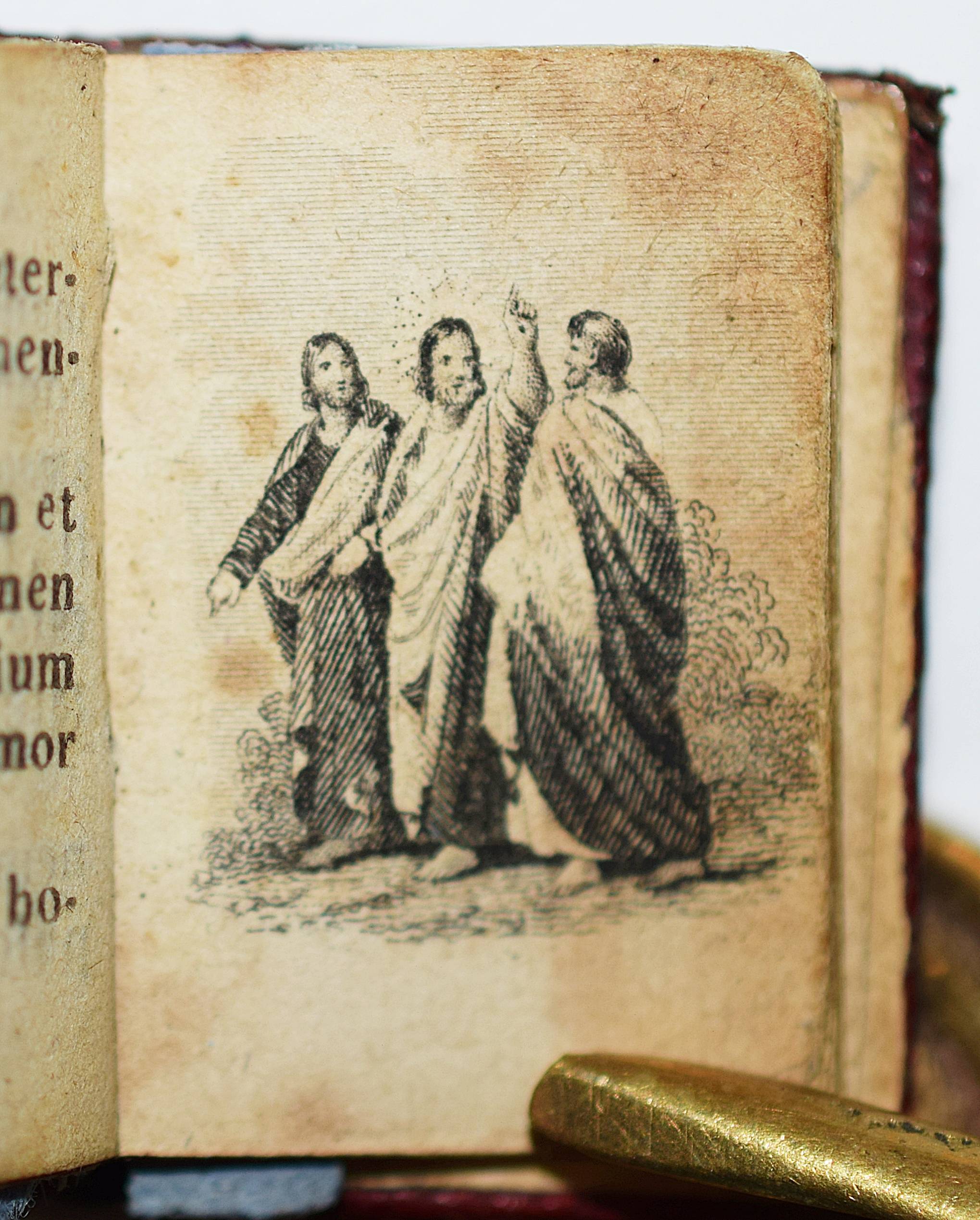 Miniaturbuch – Le petit Paroissien de l’enfance. Paris, (Firmin Didot) (1830-1835). 29 x 20 mm. 80 S. mit gestoch. Frontispiz (Kreuzigung) und 4 gestoch. Tafeln. Weinroter Maroquin-Lederband der Zeit mit Rückenvergoldung, goldgepr. Deckel-Filetten und Deckel-Vignetten sowie Goldschnitt. Bondy, Miniature Books S. 77 f. – Reizvolles franz. Miniatur-Gebetbuch für Kinder. – „Two religious children’s books of very small size must have been published in large numbers over quite a long period. They are Le Petit Paroissien de l’Enfance and Le Petit Paroissien de la Jeunesse which often bear the Marcilly imprint and were printed by Firmin Didot, Ad. B. Lainé, Rignoux, René et Cie., Maulde-Renou, Langlumé et Peltier, Eberhart and others in Paris and L. Lefort in Lille, Martial Ardant in Limoges and perhaps in other towns as well. These attractive prayerbooks for children measure usually about 1 13 by inches, have engraved titles and 5 plates, varying a great deal in quality and even design“ (L. W. Bondy). – Die letzten Blätter mit Fehlstellen im unteren Rand (kein Textverlust), sonst gut erhalten.