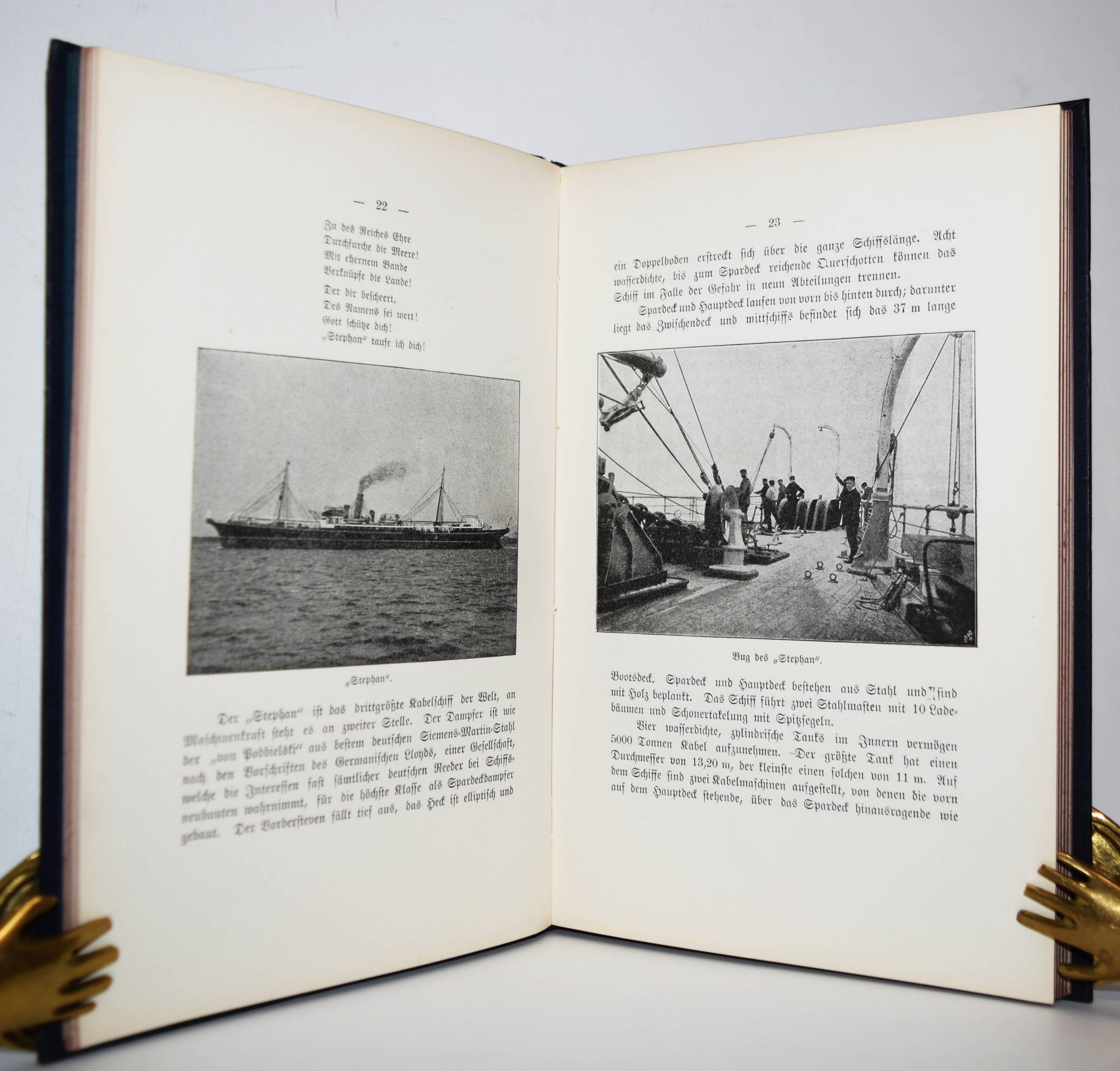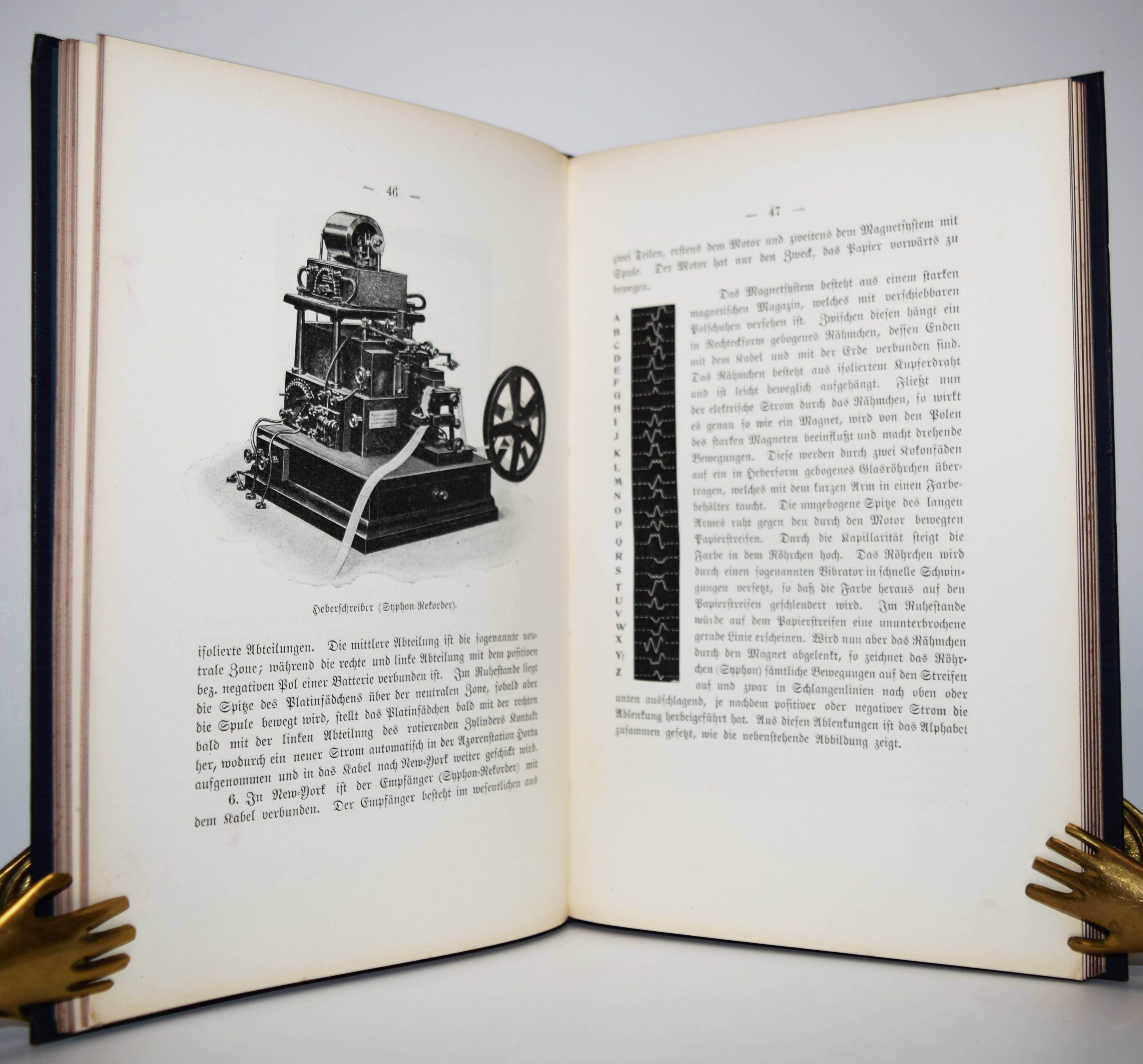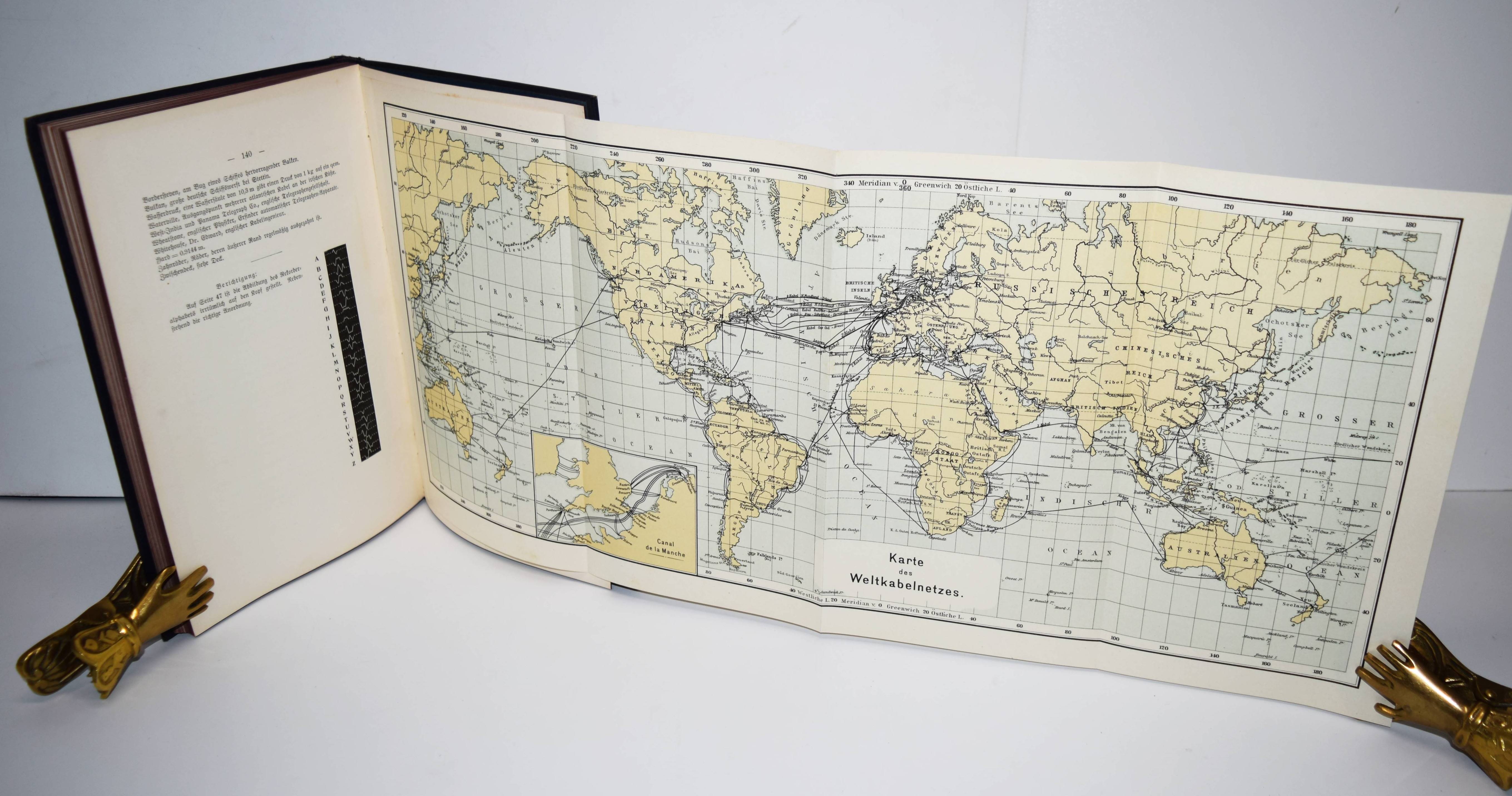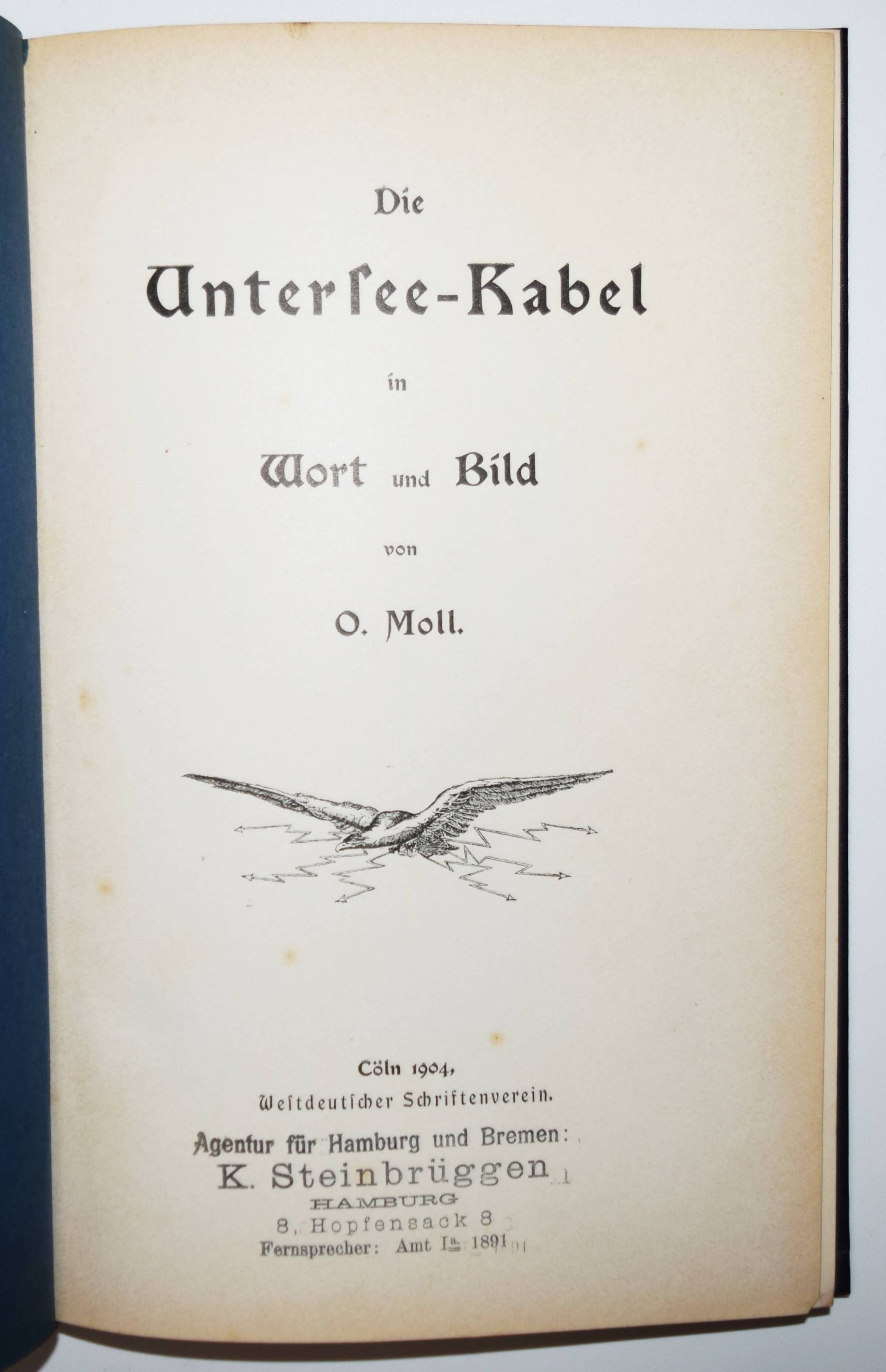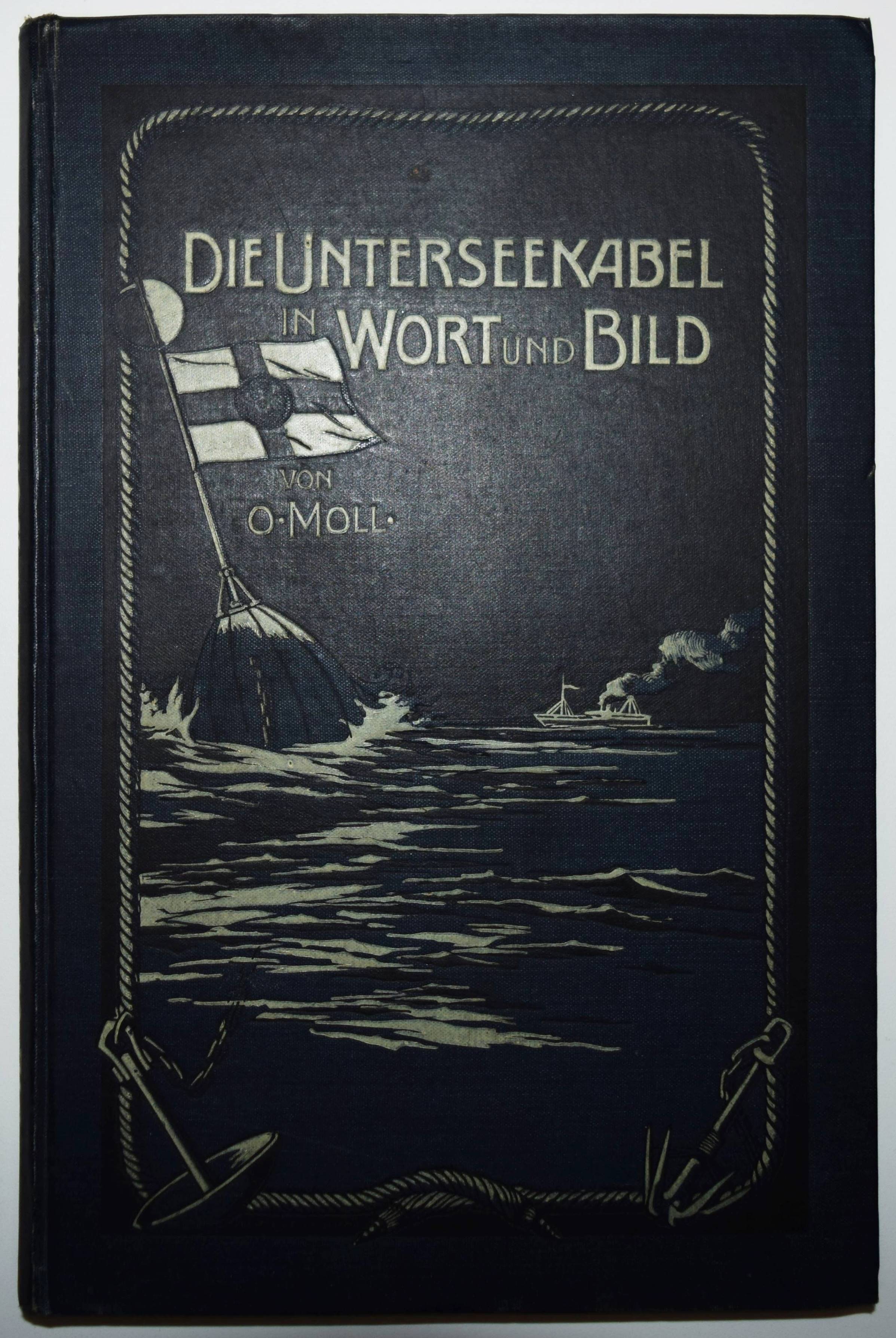 Moll, O. Die Untersee-Kabel in Wort und Bild. Cöln, Westdeutscher Schriftenverein 1904. Gr.-8°. VIII, 140 S. mit zahlr. Abb. und 1 gefalt. farb. Karte. Illustr. Orig.-Leinenband. Erste Ausgabe. – „Das wichtigste und interessanteste dringt ja nicht sofort in die Öffentlichkeit. Die Bedeutung, welche die Marine heute der Funkentelegraphie beilegt, hat sie veranlasst, ununterbrochen die Erfinder zu immer weiteren Fortschritten anzustacheln. Aber die Resultate und die Mittel, mit denen das erzielt ist, werden heute nicht mehr veröffentlicht, sondern geheimgehalten. Man bedenke, daß bei der Marine drahtlose Telegramme nicht nur eines Geschwaderverbandes übermittelt werden, sondern mit 1000 und mehr Kilometern entfernten Flotten gewechselt werden, daß diese Telegramme sich einen Weg suchen, der ihnen von dem Telegraphisten einfach vorgeschrieben ist, und die sich gegenseitig nicht stören“ (R. Goldschmidt und A. Slaby, Drahtlose Telegraphie. In: Verhandlungen der Kolonial-Technischen Kommission des Kolonial-Wirtschaftlichen Komitees. Heft 1, 1911, S. 30). – „Bereits 1811 schickte der Deutsche Samuel Thomas von Soemmerring elektrische Signale durch einen mit Kautschuk isolierten Draht, welcher bei München durch die Isar verlegt worden war. Im Jahr 1842 unternahm der US-amerikanische Erfinder und Wissenschaftler Samuel F. B. Morse Versuche, Seekabel auf dem Grund des Hafens von New York zu verlegen. Hierbei kamen erstmals spezielle Kabellegefahrzeuge beziehungsweise Pontons zum Einsatz, die, von Schleppern gezogen, die Kabel ausbrachten. Diese frühen Versuche krankten jedoch vor allem an geeigneten Isolierungen. So wurden für die Idee der Verlegung von Unterwasserkabeln seit Erfindung der elektrischen Telegraphen mehrere Methoden ausprobiert. Doch erst die Erfindung der Guttapercha-Presse 1847 durch Werner Siemens machte für die Unterwasserverlegung gut isolierte Kabel möglich“ (Wikipedia). – Stempel auf dem Titel, sehr gutes sauberes Exemplar.