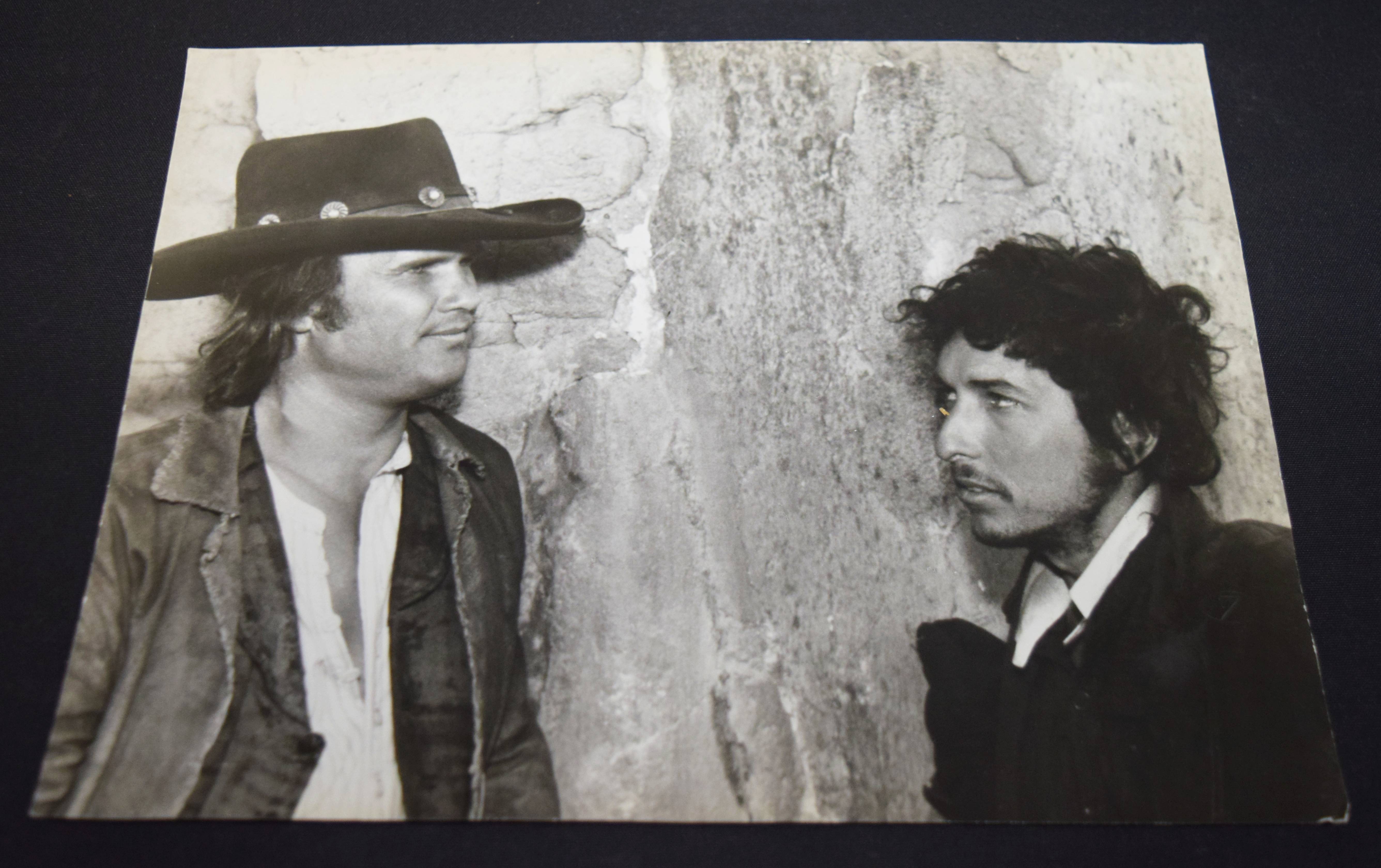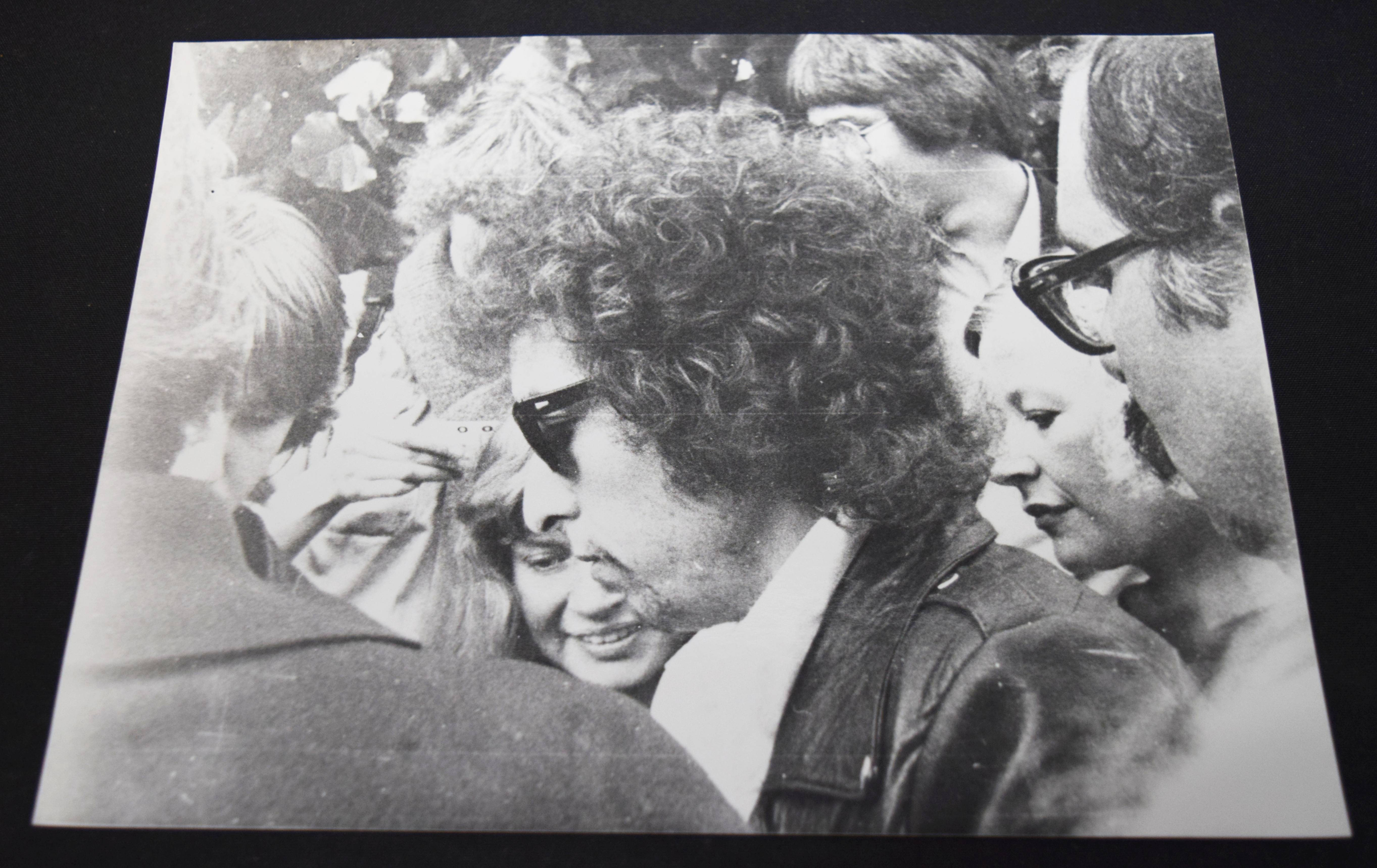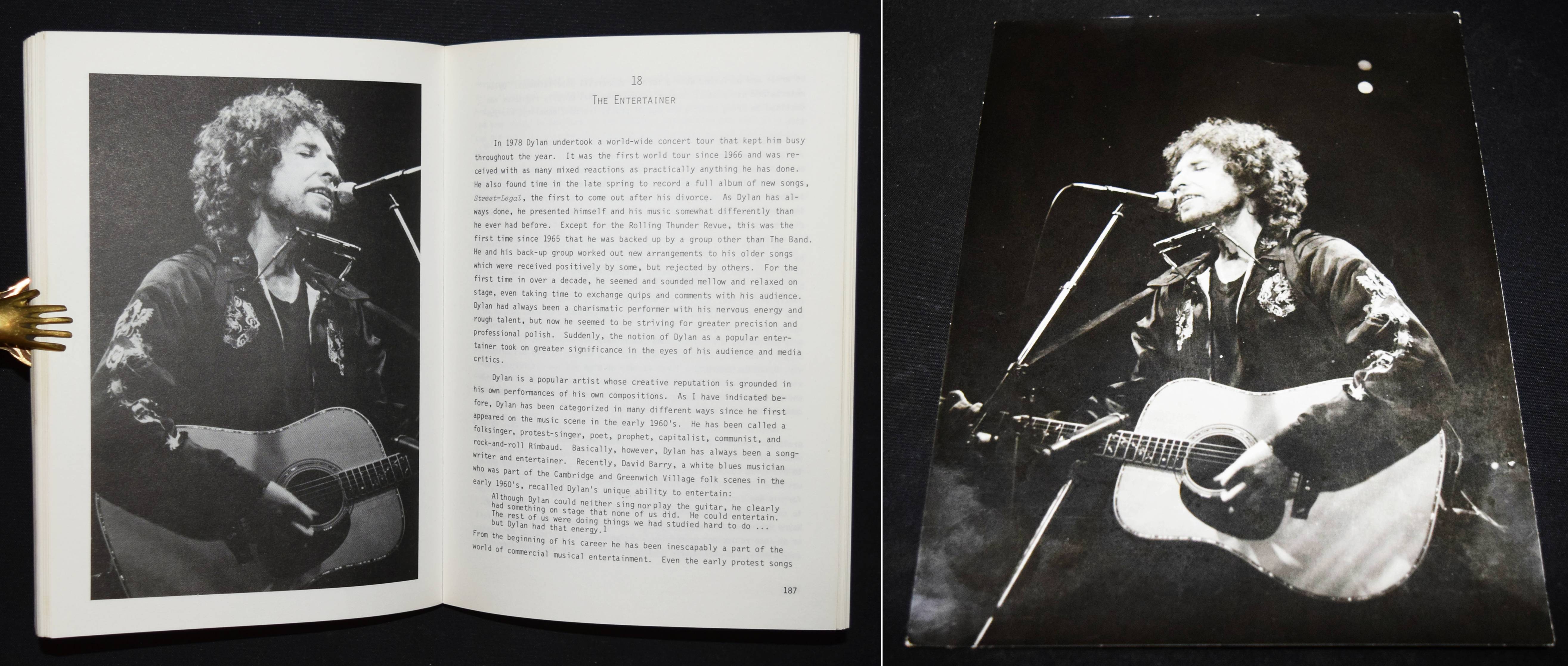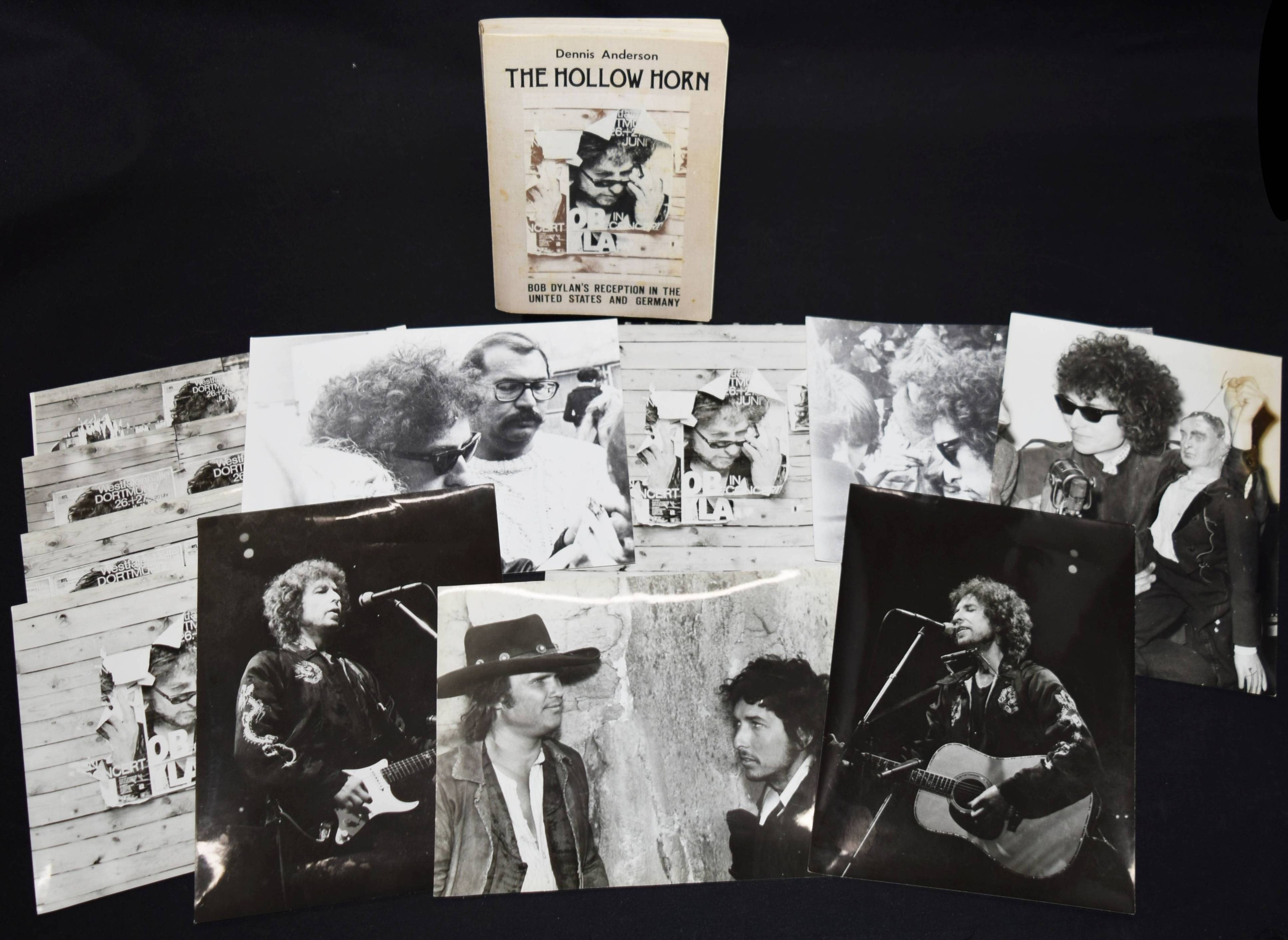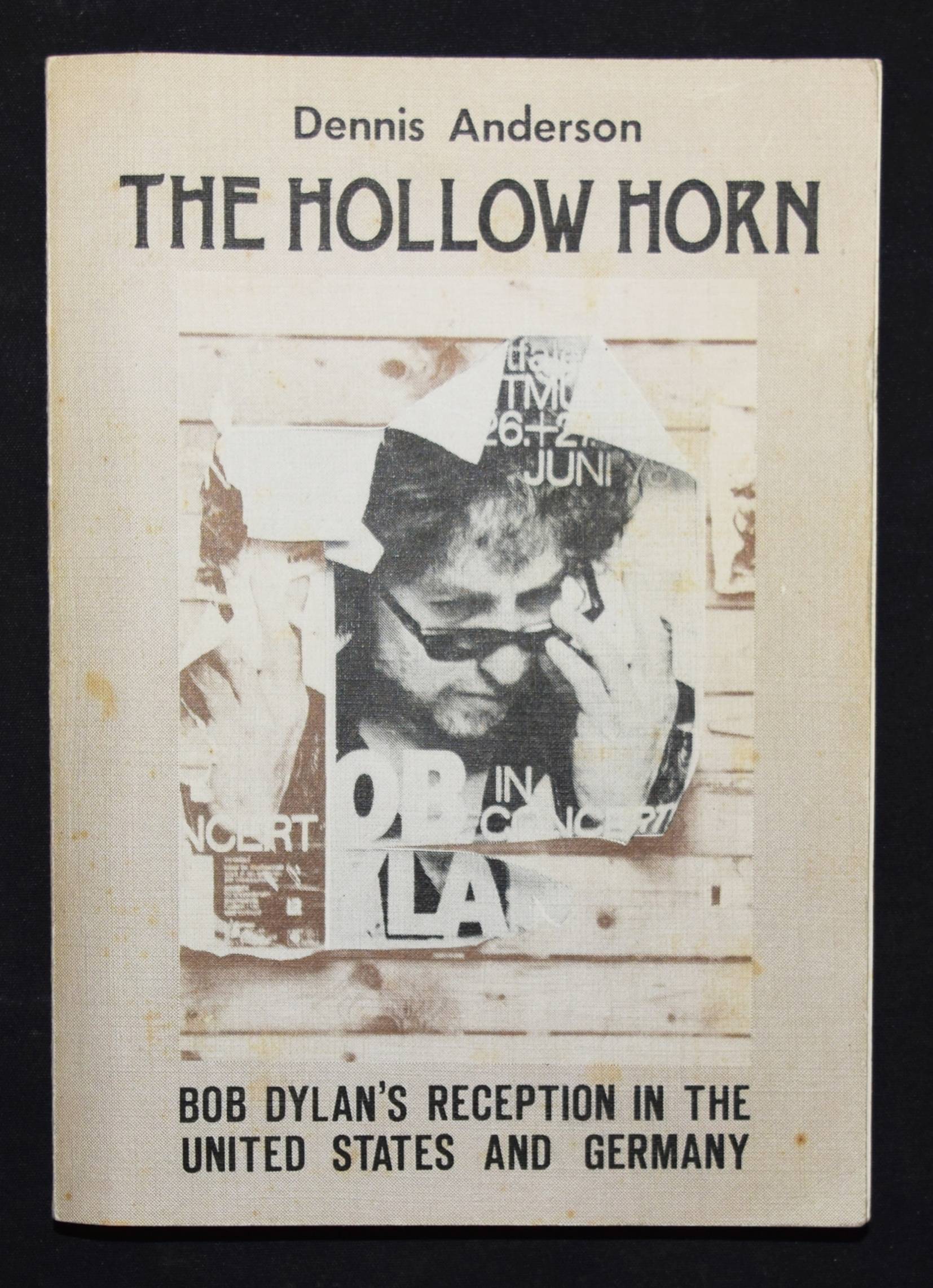 Dylan – Anderson, Dennis. The hollow horn. Bob Dylan’s reception in the United States and Germany. München, Hobo Press (1981). 8°. IX, 280 S. mit 13 Abb. von Hajo Bernhard (6, inkl. Umschlag), Angela Dierks (3), Carl Harding (4) und Gerfried Zwicker sowie 11 Orig.-Photographien (Silbergelatine, jeweils 18 x 24 cm.) von Hajo Bernhard. Illustr. Orig.-Kartonumschlag (Entwurf: Hajo Bernhard). (Dylanology – Whatever that is, vol. 1). Mit eigenhändiger Widmung von D. Anderson „Für Hajo (Bernhard) mit schönem Dank für die ausgezeichnete Design-Arbeit und Photos – Dennis Anderson“. – Die beiligenden Orig.-Fotos zeigen Konzert-Plakate des legendären Dylan-Konzerts in der Westfalen-Halle in Dortmund im Juni 1978 (5 verschiedene Abzüge, wovon einer für das Cover-Bild verwendet wurde). Von zwei beiliegenden Konzert-Fotos, ist eines im Buch abgedruckt. Die anderen Aufnahmen, meist bei Interviews oder Pressekonferenzen entstanden, sind nicht im Buch abgedruckt. Das Buch enthält Aufnahmen von Konzerten in München, Bonn und Berlin; eine Aufnahme zeigt Dylan am Flughafen in Sydney. – Umschlag und Schnitt etwas braunfleckig, sonst gut erhalten.