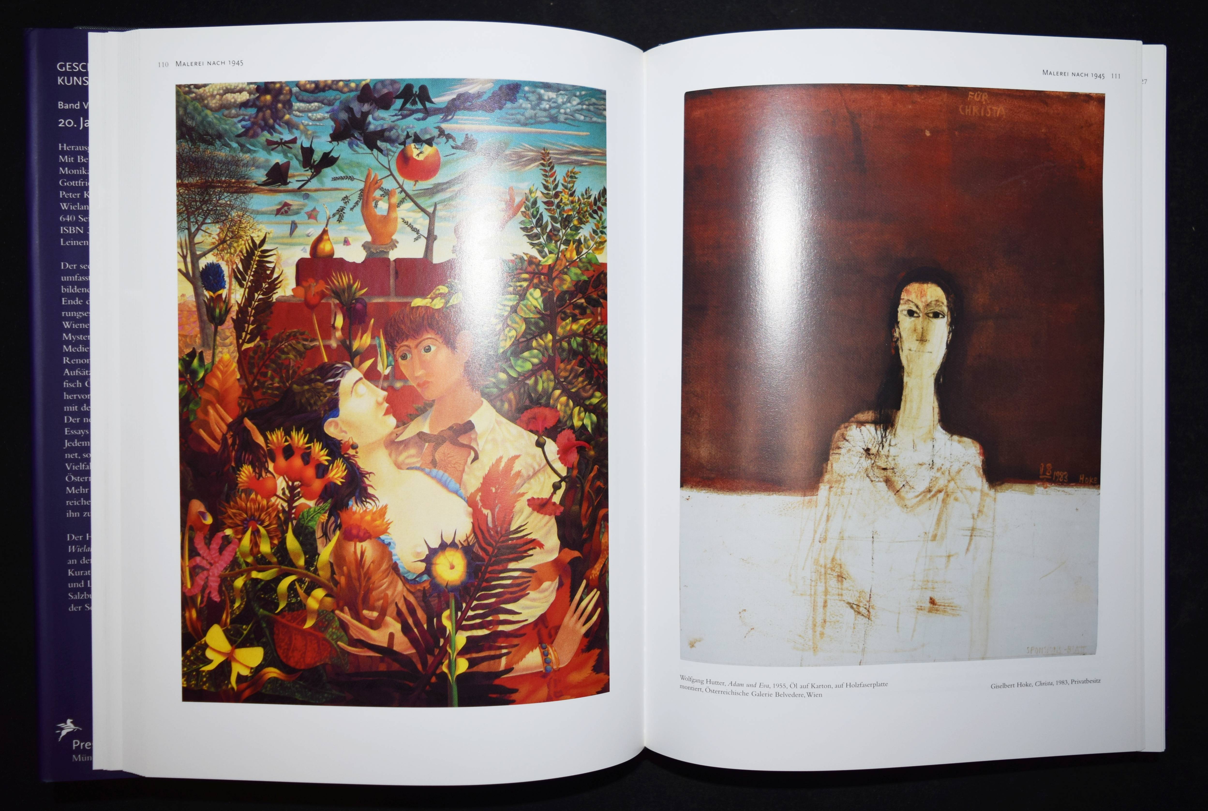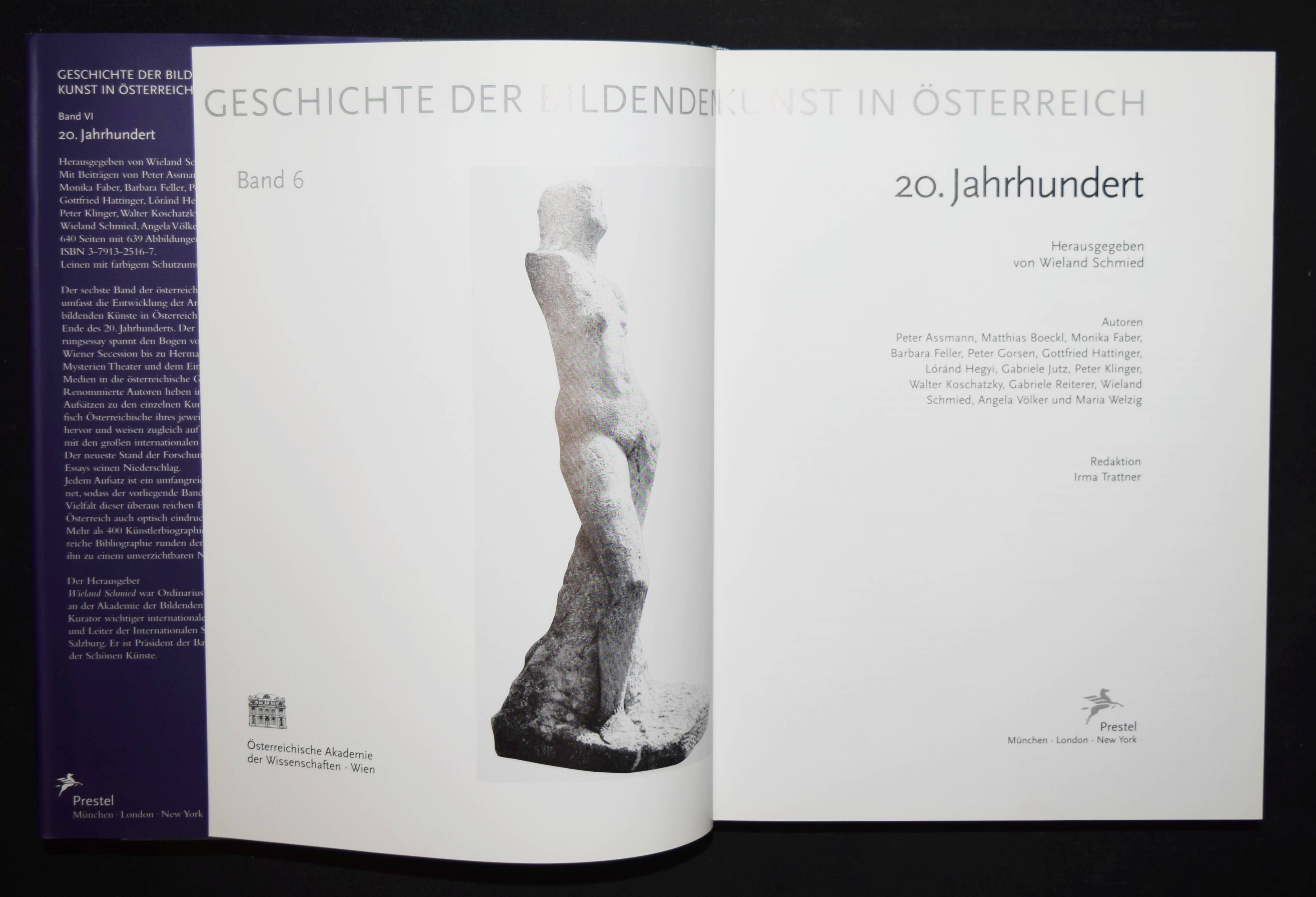 Fillitz, Hermann (Hrsg.). Geschichte der bildenden Kunst in Österreich. Band VI. 20. Jahrhundert. Herausgegeben von Wieland Schmied. München, London, New York, Prestel (2002). 4°. 653 S., [1] Bl. mit zahlr. teils farb. Abb. Orig.-Leinenband mit farbig illustr. Schutzumschlag. Autoren: Peter Assmann, Matthias Boeckl, Monika Faber, Barbara Feller, Peter Gorsen, Gottfried Hattinger, Lorand Hegyi, Gebriele Jutz, Peter Klinger, Walter Koschatzky, Gabriele Reiterer, Wieland Schmied, Angela Völker und Maria Welzig. – Redaktion: Irma Trattner. – Sehr gutes Exemplar.