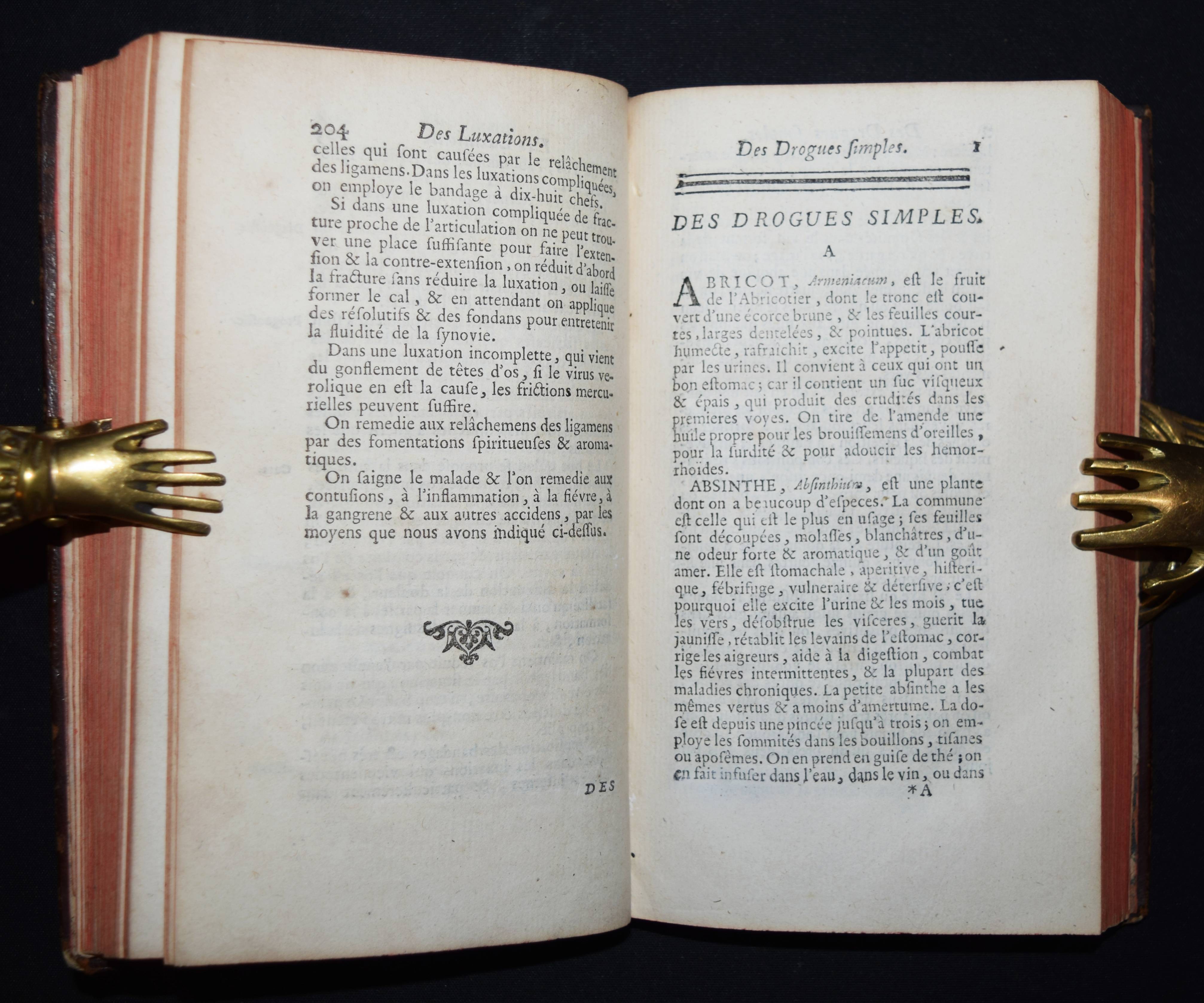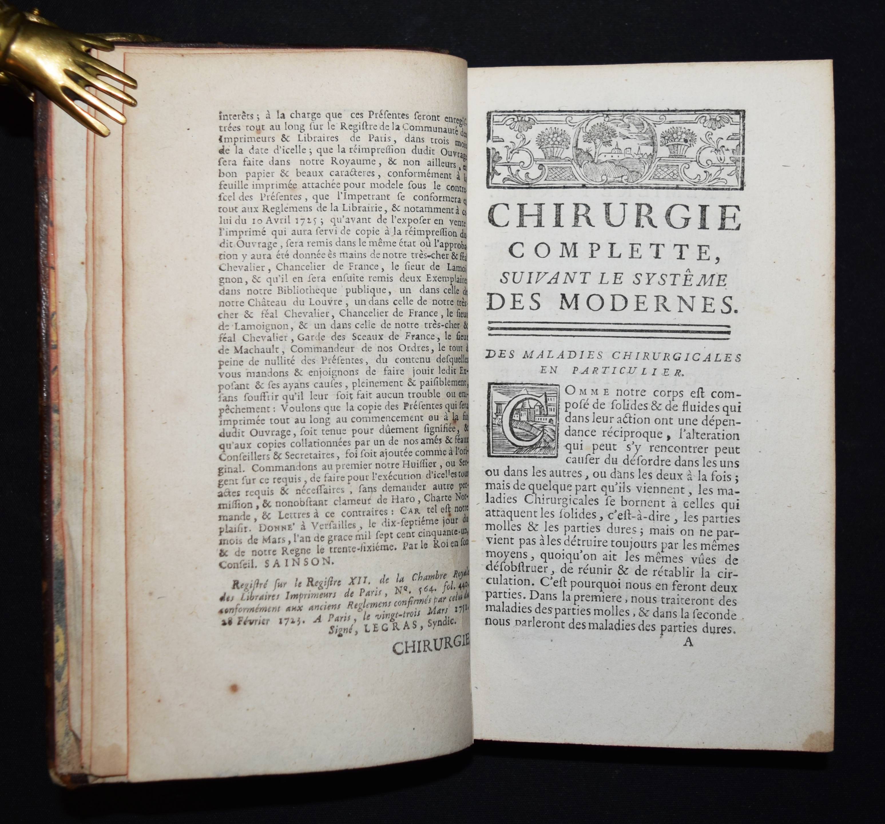 Planque, François. Chirurgie complette, suivant le système des modernes. Contenant les maladies chirurgicales, en particulier, tant des parties molles que des parties dures, le tout suivi des vertus des drogues simples; & des etymologies des termes les plus en usage. (Volume II de 2). Seconde edition. Revue, corrigée et augmentée par l’auteur. Paris, Veuve de Charles-Maurice d’Houry 1757. Kl.-8° (17 x 9,5 cm.). [3] Bl., 204 S.; 251 S. Kalbslederband der Zeit mit goldgepr. Rückenschild und floraler Rückenvergoldung. In sich abgeschlossener Band II des zuerst 1744 erschienenen Handbuchs des franz. Chirurgen François Planque (1696 – 1765). – Contenant: Des maladies chirurgicales en particulier. – Des maladies des parties molles. – Des maladies des parties dures. – Des drogues simples. – Etymologies Latines & Grecques. – Kapital und Fuss mit kl. Fehlstellen, nur vereinzelt etwas braunfleckig, gutes dekorativ gebundenes Exemplar.