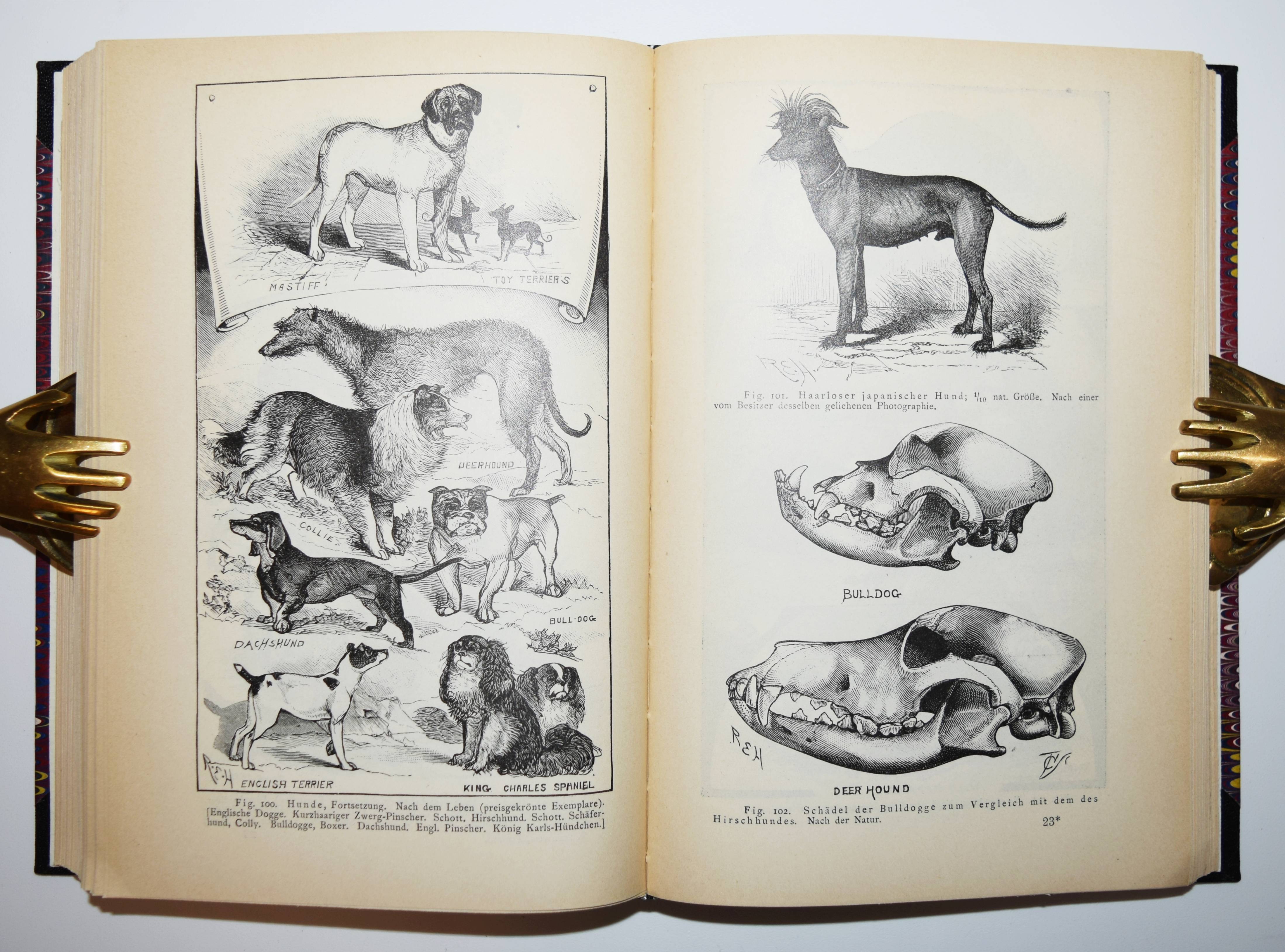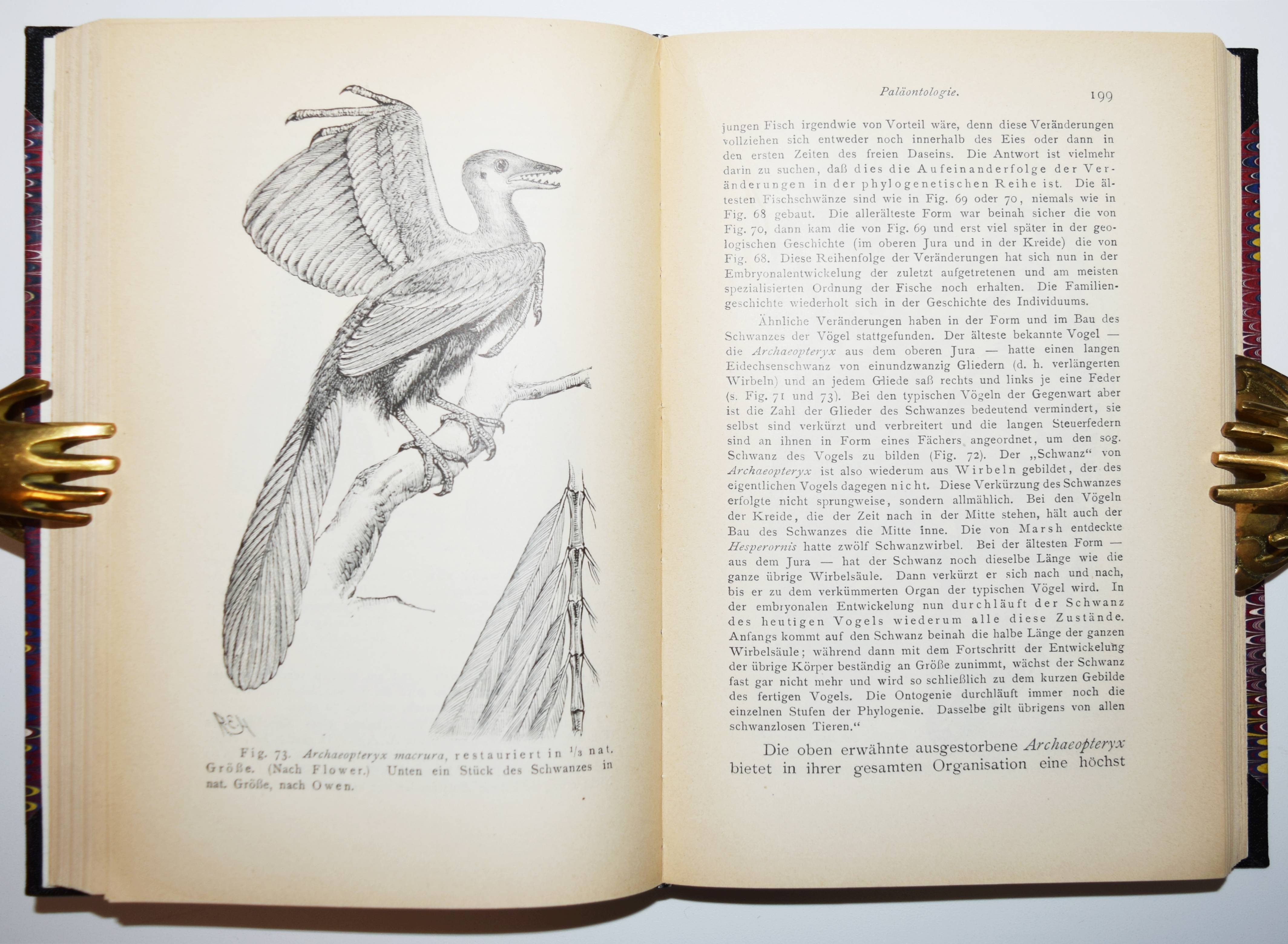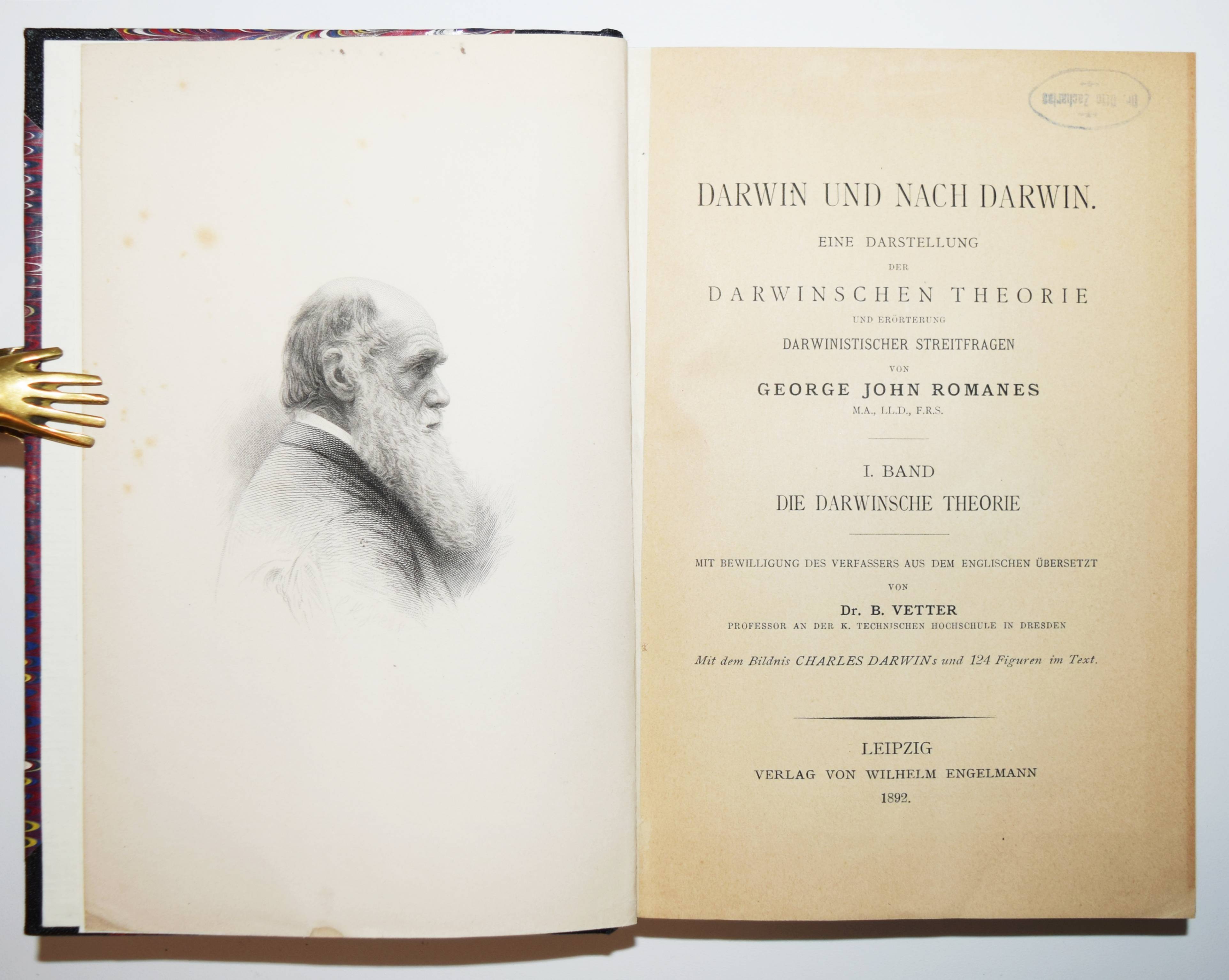 Romanes, George John. Darwin und nach Darwin. Eine Darstellung der Darwinschen Theorie und Erörterung Darwinistischer Streitfragen. I. Band. Die Darwinsche Theorie. Mit Bewilligung des Verfassers aus dem Englischen übersetzt von B. Vetter. Leipzig, Wilhelm Engelmann 1892. 8°. V, [1] Bl., 542 S. mit 1 Portrait und 124 Holzstichen im Text. Moderner Halbleinenband mit goldgepr. Rückenschild und Linienvergoldung. Seltene erste deutsche Ausgabe des ersten Teils der wichtigen Abhandlung über Darwins Evolutions-Theorie. 1895 und 1897 erschienen noch weitere Bände „Darwinistische Streifragen. Vererbung und Nützlichkeit“ und „Darwinistische Streitfragen. Isolation und physiologische Auslese“. – Der britische Evolutionsbiologe G. J. Romanes (1848-1894) „legte den Grundstein für die Tierpsychologie und sagte Ähnlichkeiten zwischen den kognitiven Prozessen bei Menschen und Tieren voraus, schrieb Tieren jedoch auch in weit stärkerem Maß menschliche Eigenschaften zu als dies wissenschaftlich gesichert war (Anthropomorphismus). Er war der jüngste von Charles Darwins akademischen Freunden. Seine Sicht auf die Evolution hat historische Bedeutung. Romanes führte den Begriff Neodarwinismus ein, der heute noch genutzt wird, um eine neuere Form des Darwinismus zu bezeichnen. Sein früher Tod stellte einen Verlust für die britische Evolutionsbiologie dar. Innerhalb von sechs Jahren wurden die mendelschen Arbeiten wiederentdeckt und neue Ansichten zur Debatte gestellt“ (Wikipedia). – Sehr gutes Exemplar.