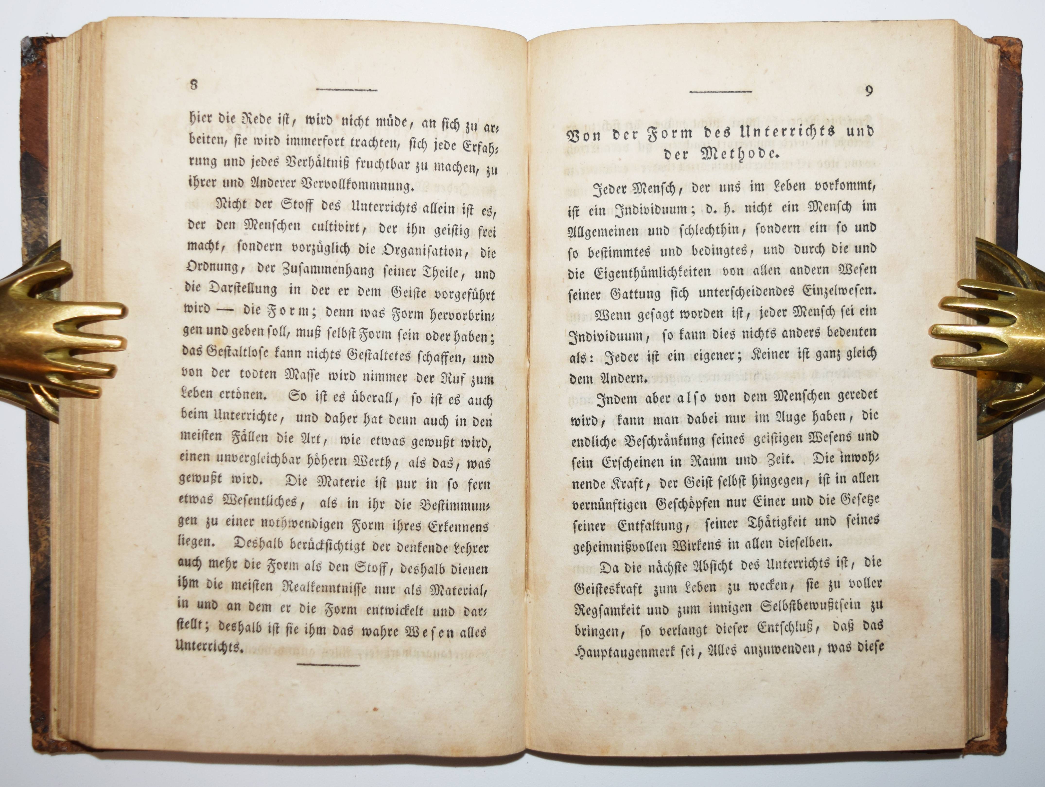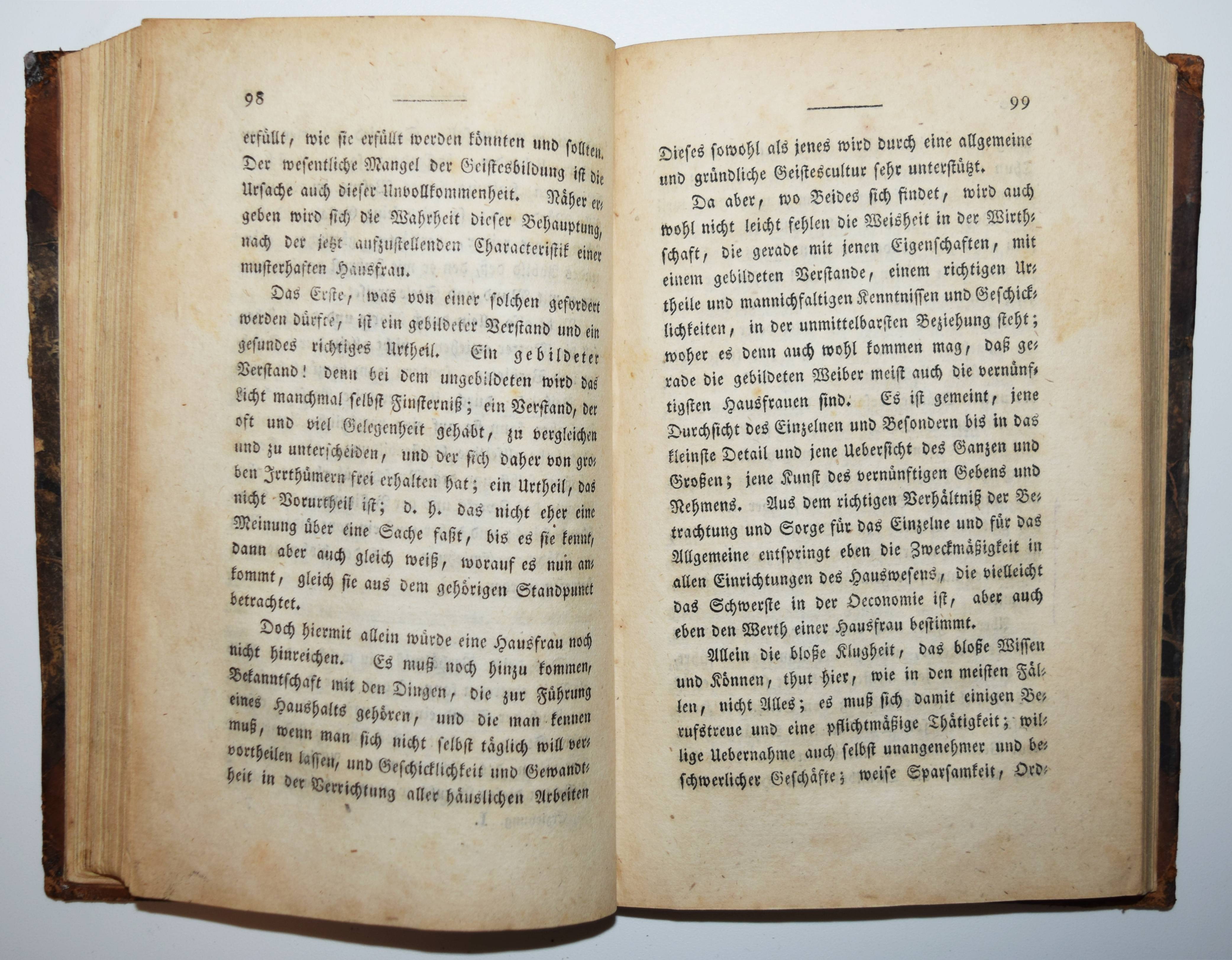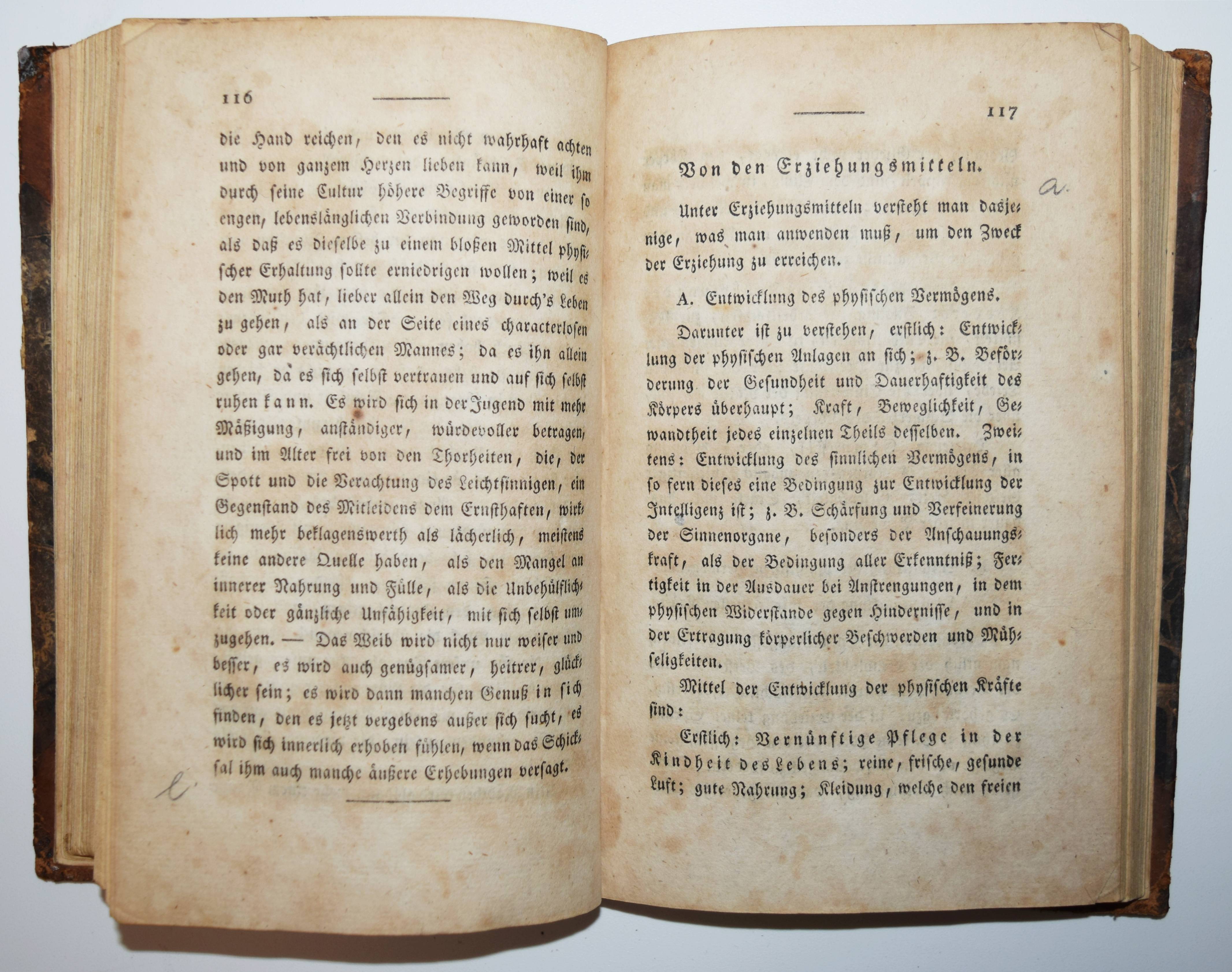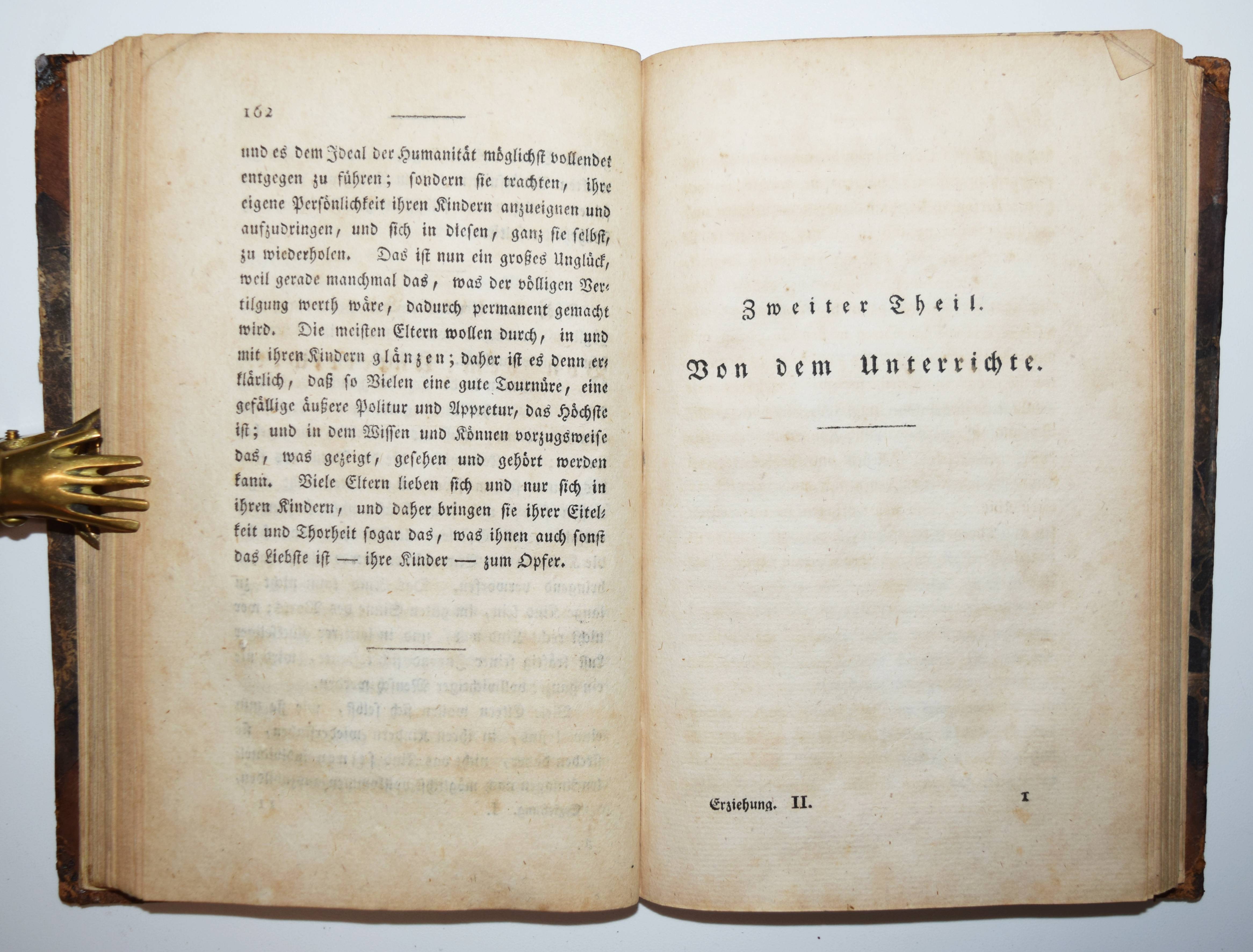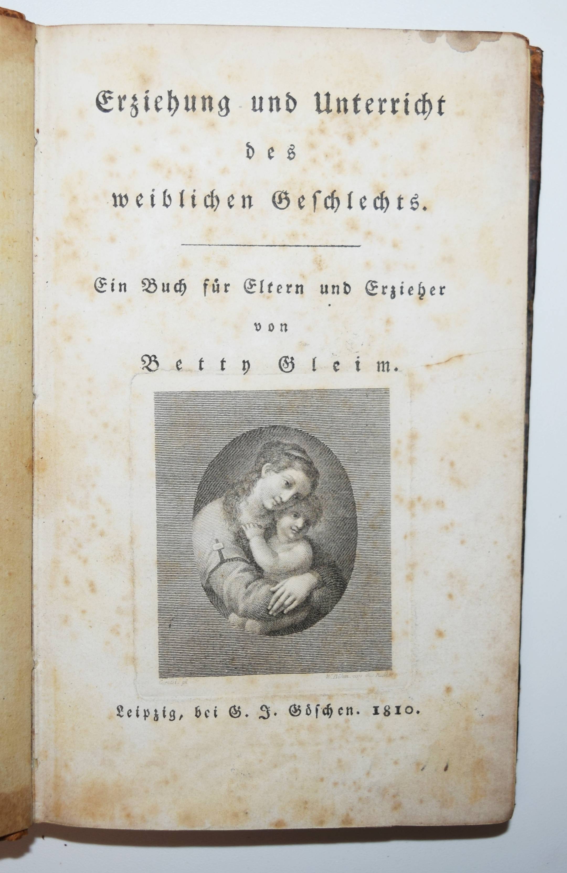 Gleim Betty. Erziehung und Unterricht des weiblichen Geschlechts. Ein Buch für Eltern und Erzieher 2 Teile in 1 Band. Leipzig, G. J. Göschen 1810. Kl.-8°. Titel mit gestoch. Vignette, XVI, 162 S.; 154 S. [2] Bl. Halblederband der Zeit. Kosch VI, Sp. 393. Lexikon der Frau I, Sp. 1241. Nicht bei Pataky I, 260 (erwähnt nur das Bremer Kochbuch von B. Gleim). – Erste Ausgabe des seltenen pädagogischen Hauptwerkes von Betty Gleim (1781-1827), einer Nichte des Dichters J. W. L. Gleim. Sie wuchs in einem angesehenen und weltoffenen Bremer Elternhaus auf. Durch zwei Geistliche, die für eine Reform des Bremer Unterrichtswesens im Geiste Pestalozzis wirkten, wurde sie für dessen Ideen begeistert und gründete 1805 eine eigene Mädchenschule. Das vorliegende Lehrbuch „ist sozusagen der ausführliche Commentar zu dem Lehrplane der Gleim’schen Schule und verdient durchaus das gleiche Lob wie dieser. Man ist erstaunt, wie fast modern-social … Betty Gleim die Frauenfrage erörtert – ein schlagender Beweis für den neuerdings mit Recht betonten socialen Charakter der Pestalozzi’schen Pädagogik als deren wenngleich selbständige und eigenartige Anhängerin sie zu bezeichnen ist“ (Sander in ADB 49, 392). – Einband etwas berieben und am Kapital geringfügig beschädigt, Rückenschild fehlt, durchgehend teils stärker braunfleckig, vereinzelt Bleistiftanstreichungen, insgesamt jedoch gutes Exemplar aus der Bibliothek des bedeutenden Pädagogen August Kippenberg (1830-1889) mit dessen Exlibris und eigenhändigem Besitzvermerk.
