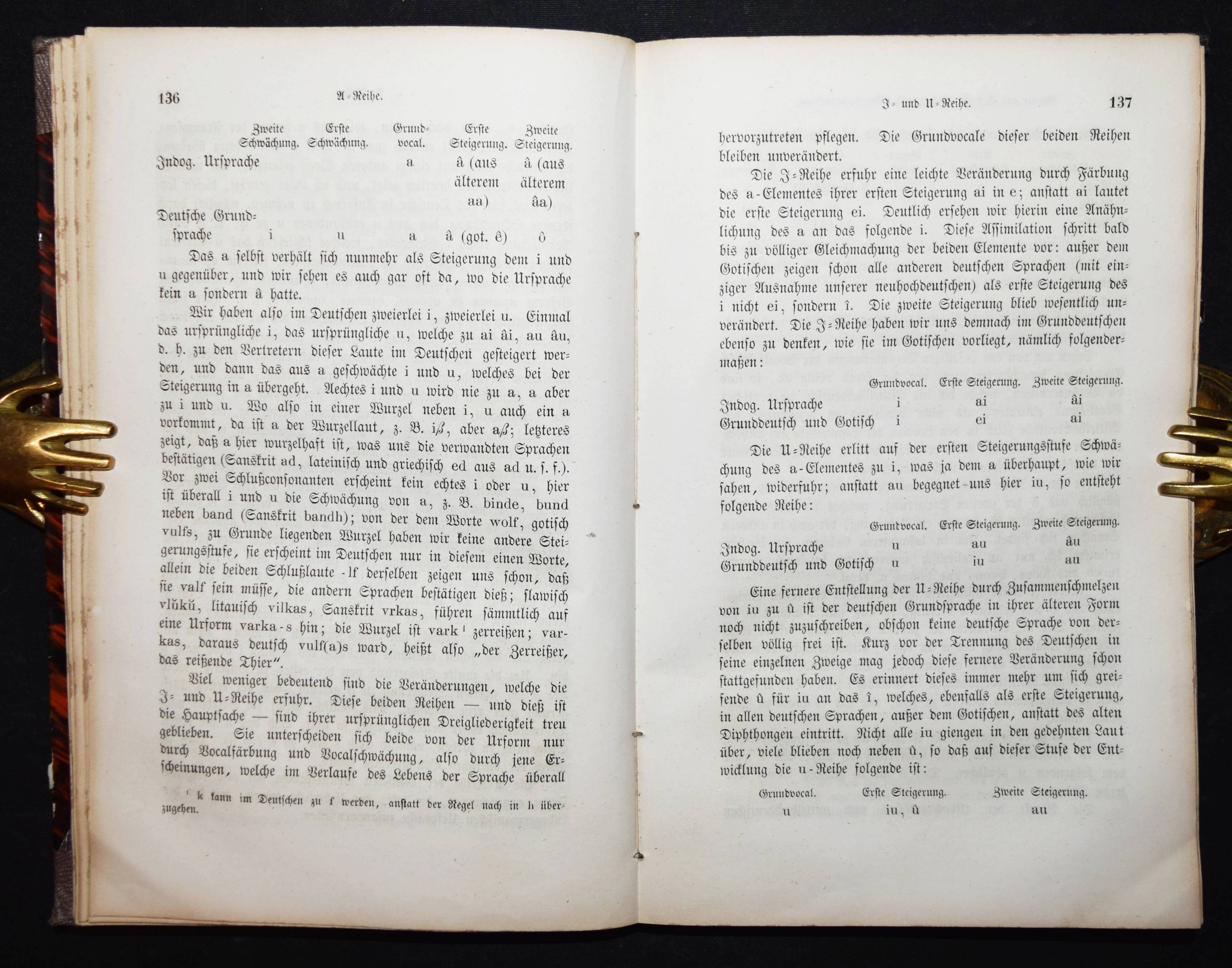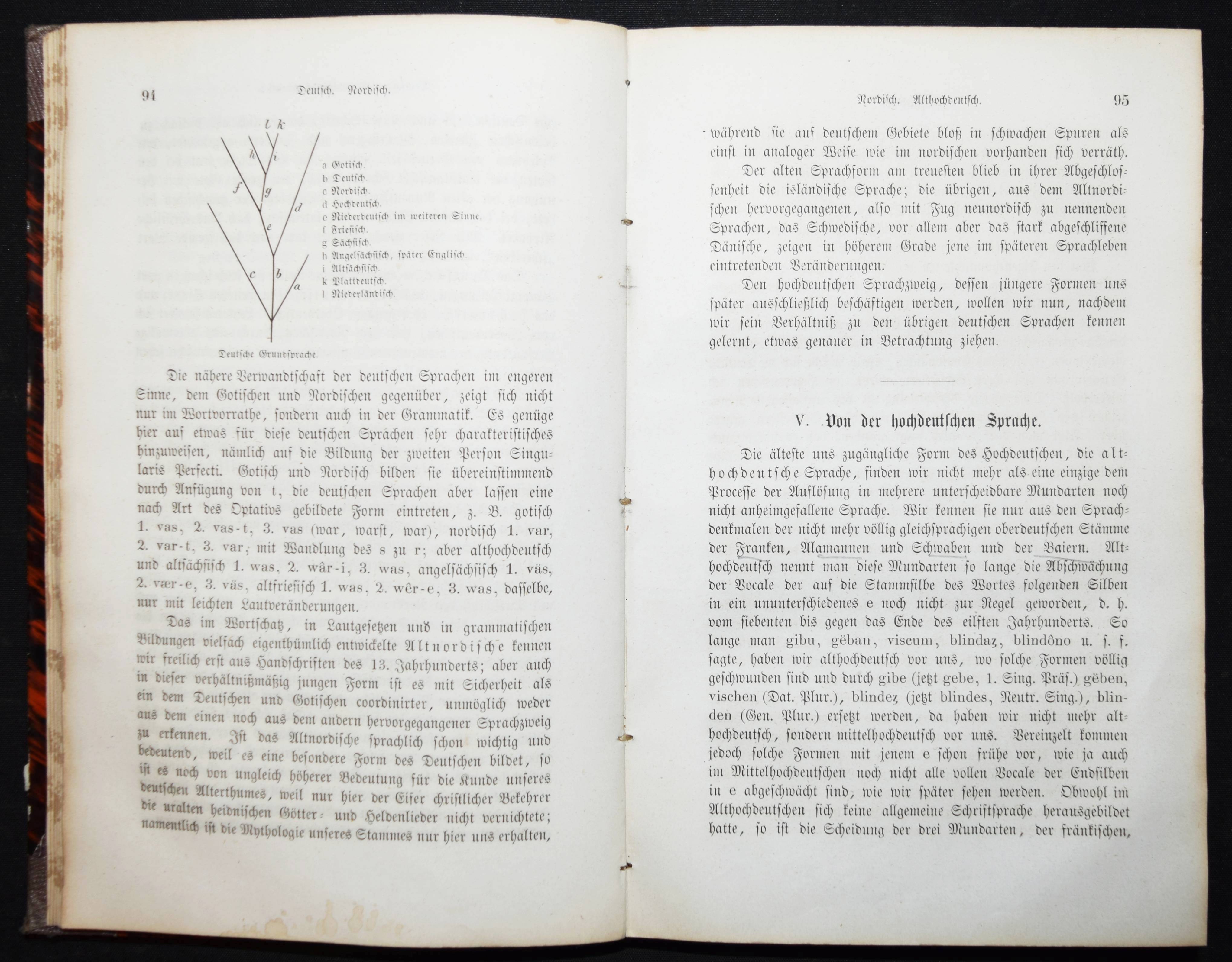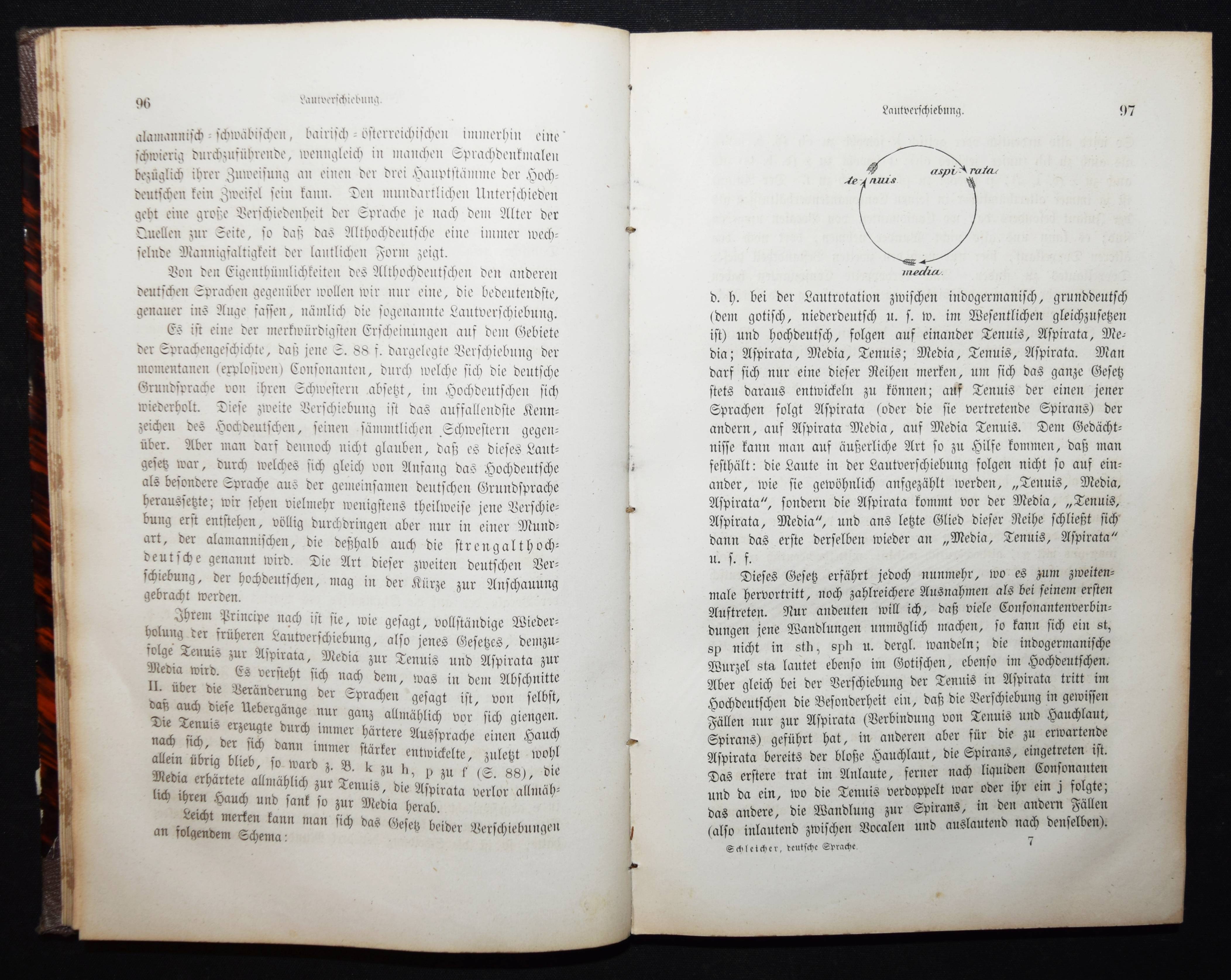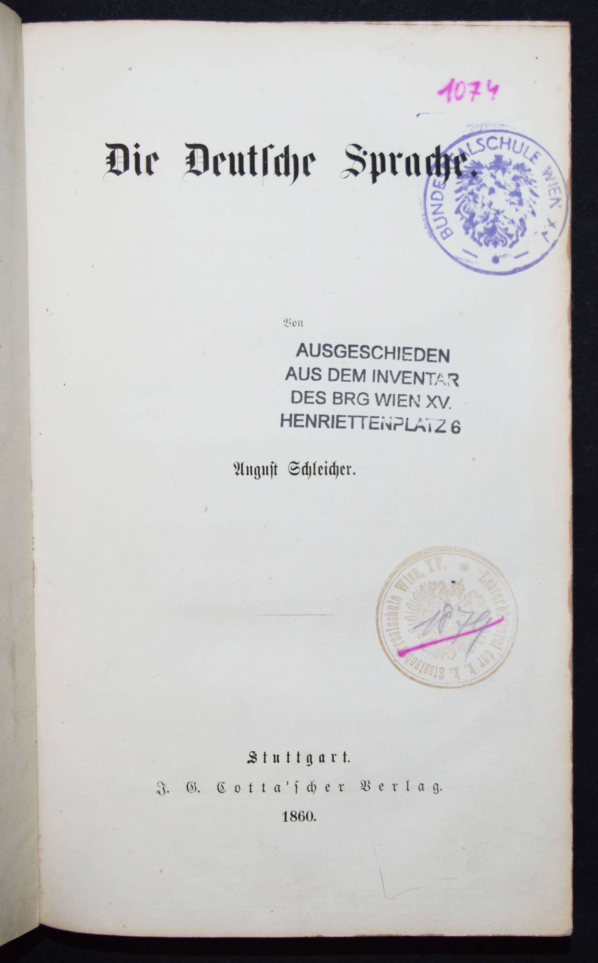 Schleicher, August. Die deutsche Sprache. Stuttgart, J. G. Cotta 1860. 8°. VI, 340 S. Halbleinenband der Zeit. NDB XXIII, 50. – Erste Ausgabe. – Der Sprachwissenschaftler A. Schleicher (1821-1868), seit 1853 ordentlicher Professor der deutschen und vergleichenden Sprachwissenschaft und des Sanskrit in Prag, „leistete Hervorragendes sowohl auf theoretischem als auch praktisch-philologischem Gebiet, so in seinem „Compendium der vergleichenden Grammatik der indogerman. Sprachen“ (2 Bde., 1861/62, 41876, Nachdr. 1974). Von Hegelianischen Ideen beeinflußt, bevorzugte er hinsichtlich der geschichtlichen Beziehungen von Sprachen zueinander bzw. von Sprachgruppierungen eine dialektische Sehweise“ (G. Bense in NDB). – Titelblatt mehrfach gestempelt, gutes Exemplar.