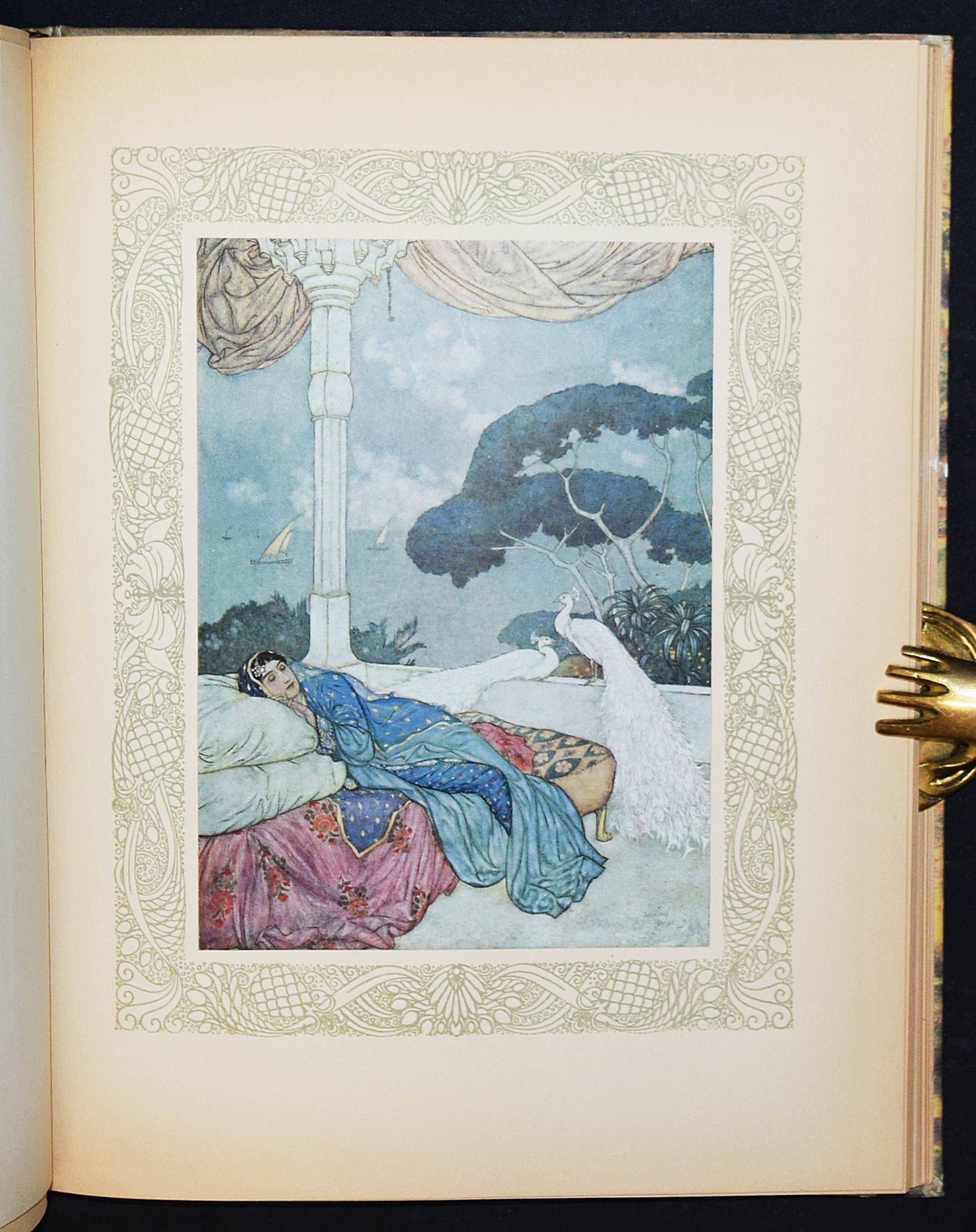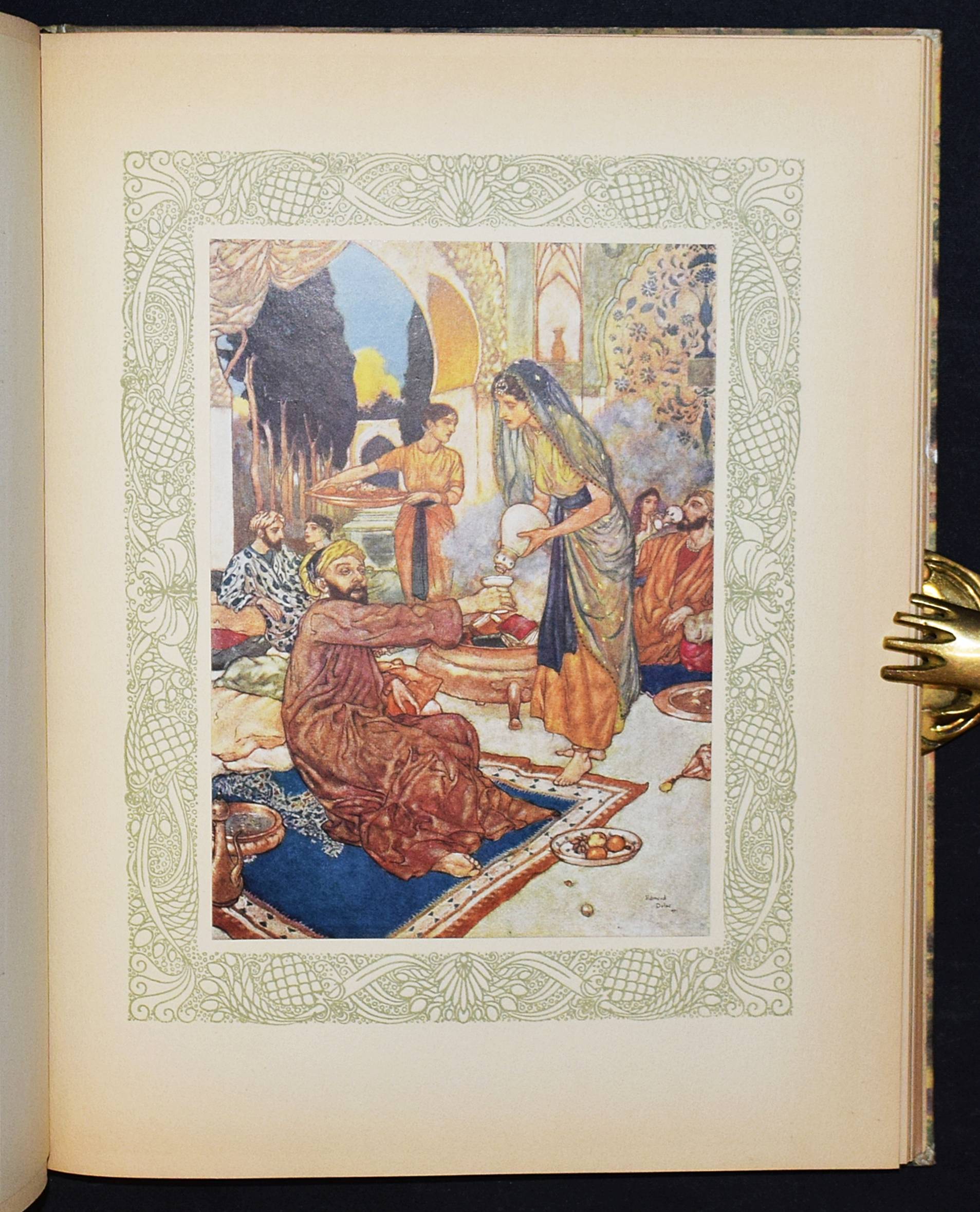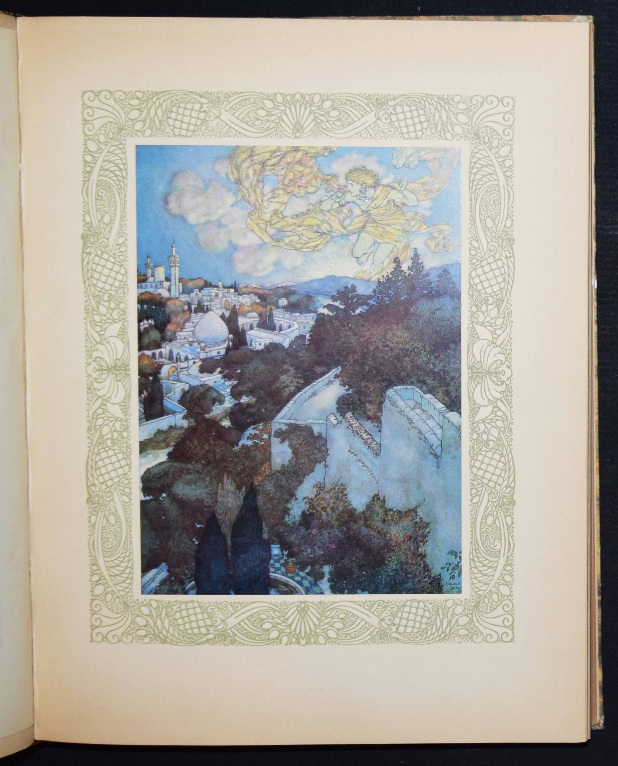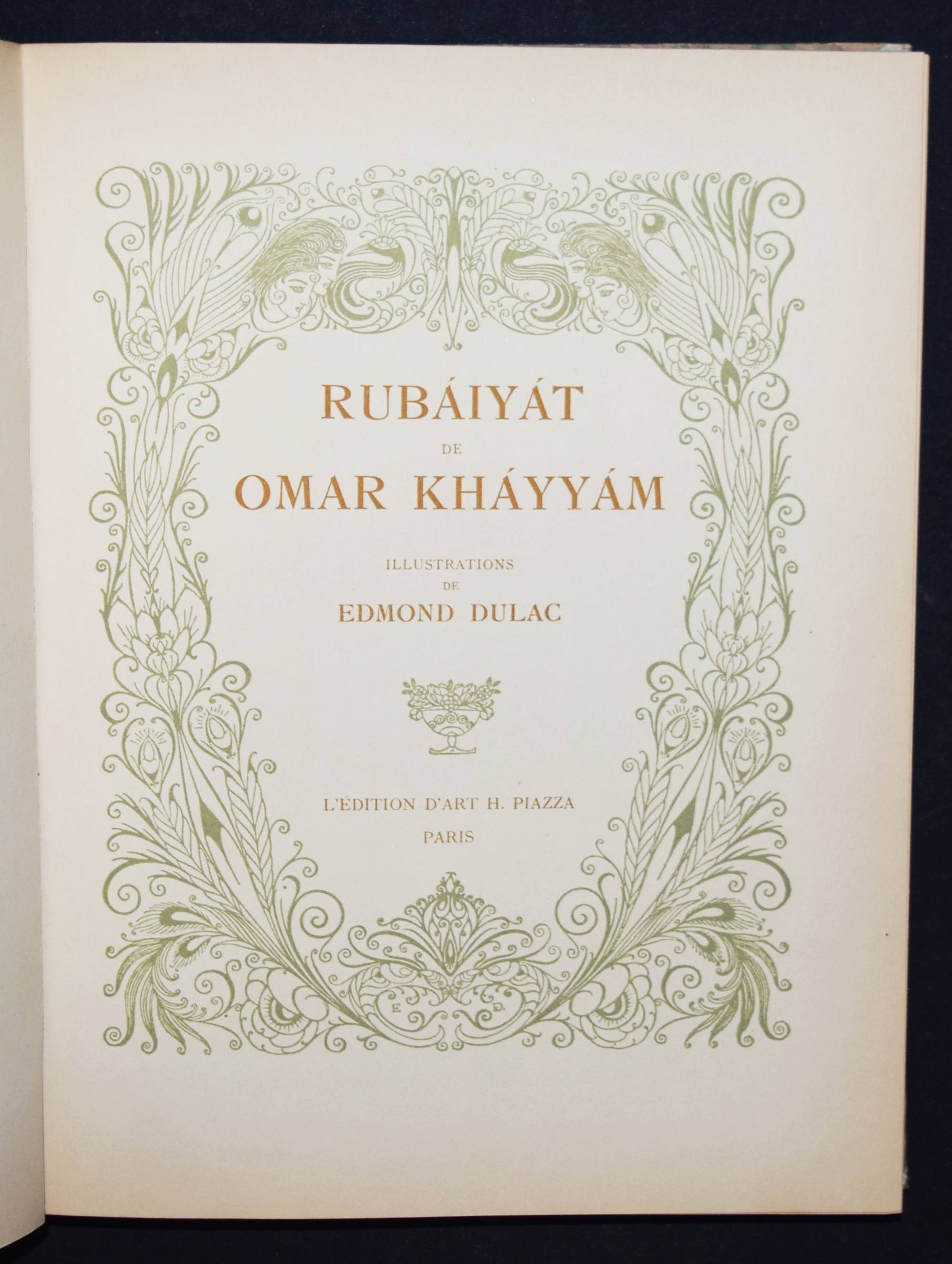 Kháyyám, Omar. Rubaiyat de Omar Kháyyám. Illustrations de Edmond Dulac. Paris, L’Edition d’Art H. Piazza o. J. (1910). 4° (30 x 23,5 cm.). [64] Bl. mit illustr. Titelbordüre und 20 montierten Farbtafeln. Orig.-Halbpergamentband mit goldgepr. Rückentitel. Erste französische Ausgabe. – „Cette traductio à été faite par Edmond Dulac d’après la version poétique de Edward Fitzgerald.“ – Jede Textseite und die Farbtafeln mit dekorativer Bordüre in Olivgrün. – Rücken leicht fleckig, Besitzvermerk auf dem Vortitel, gutes sauberes Exemplar.