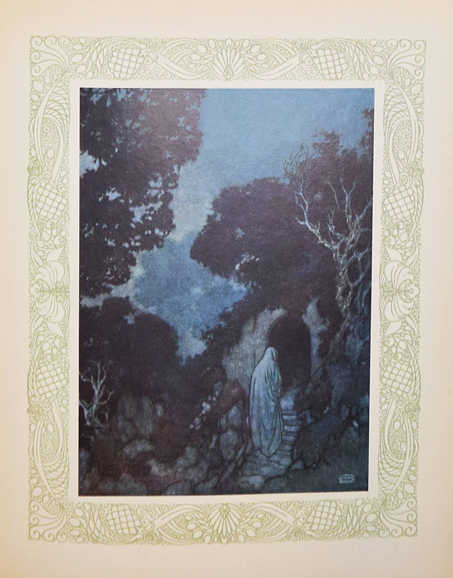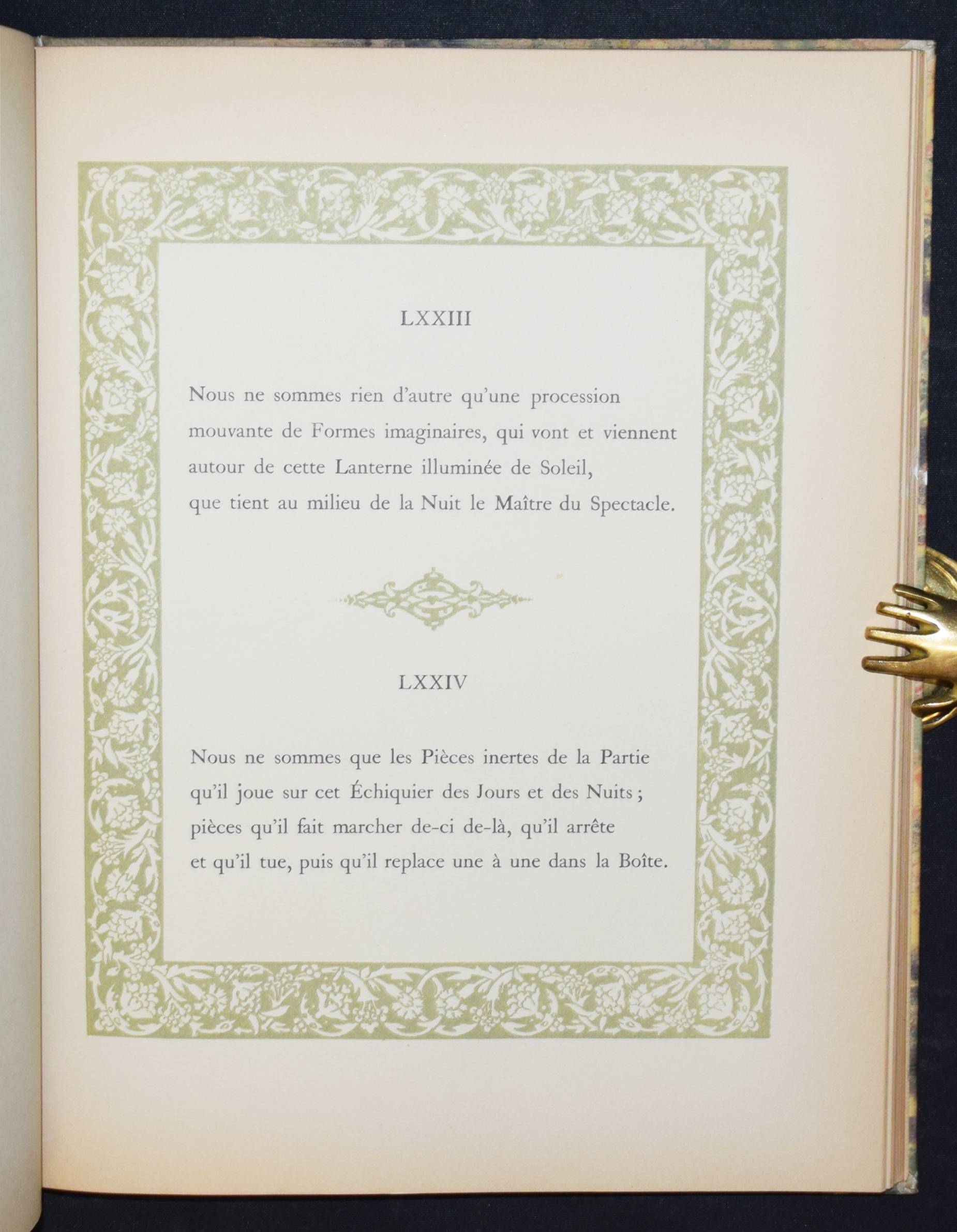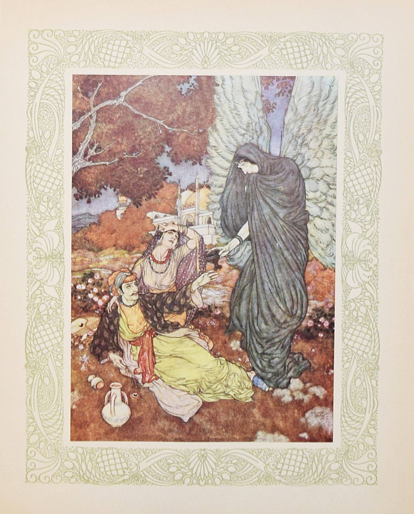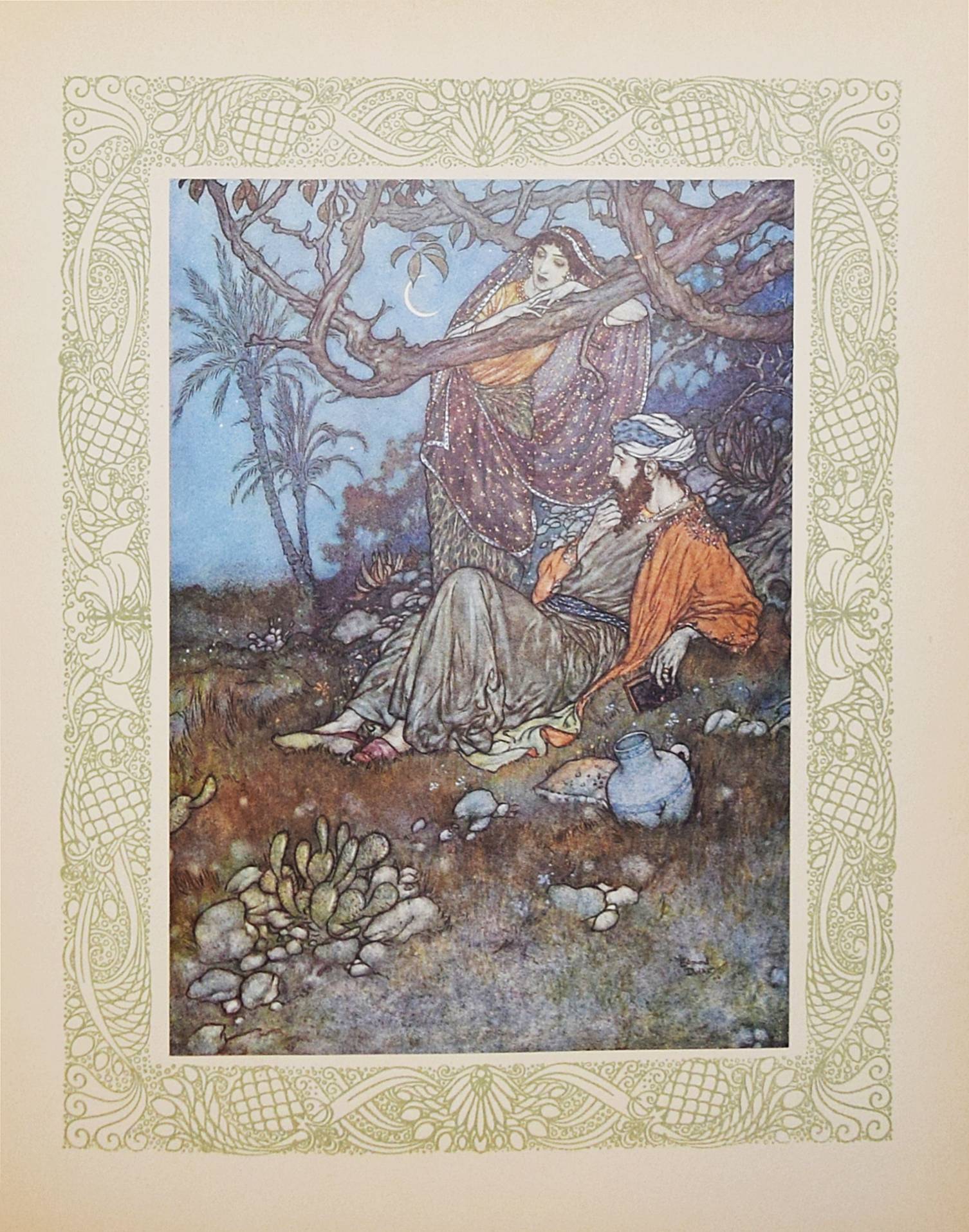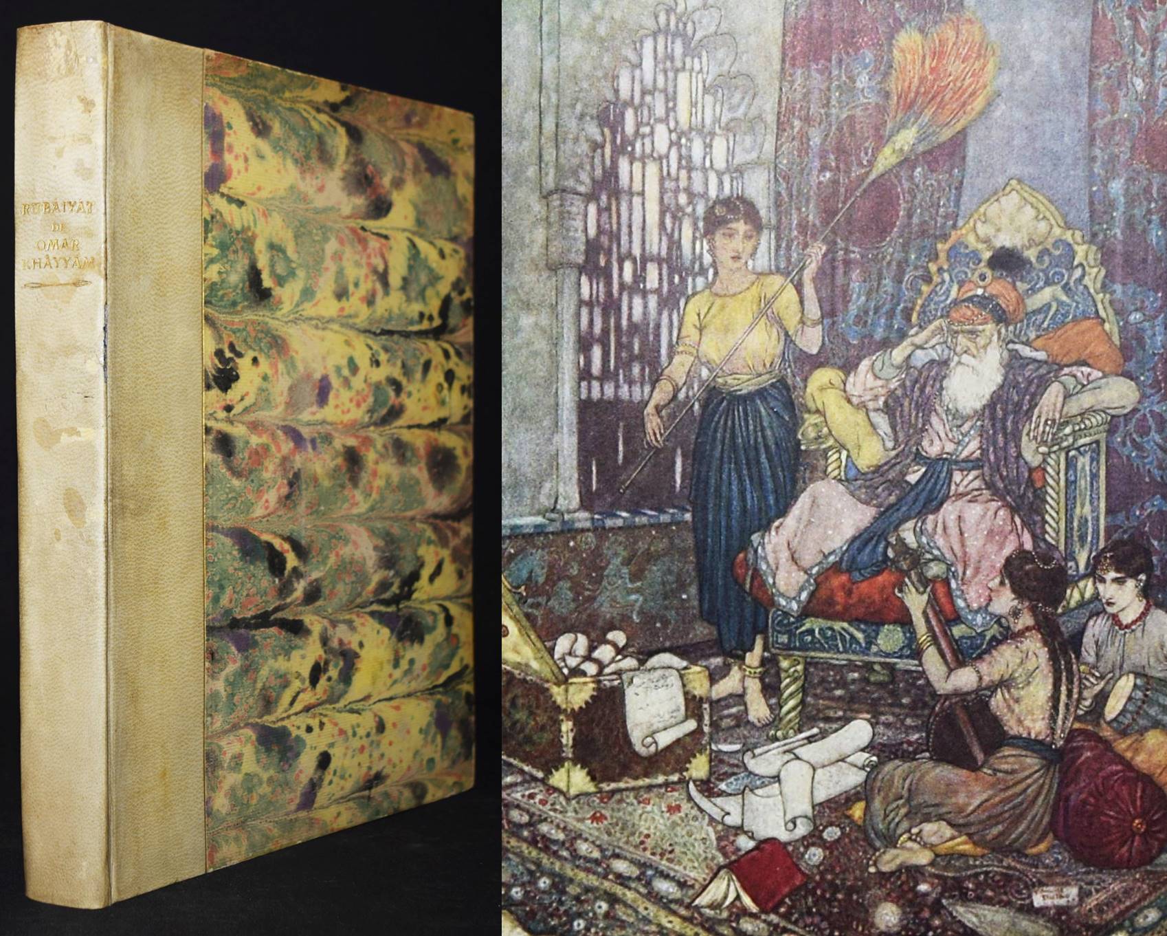 Kháyyám, Omar. Rubaiyat de Omar Kháyyám. Illustrations de Edmond Dulac. Paris, L’Edition d’Art H. Piazza o. J. (1910). 4° (30 x 23,5 cm.). [64] Bl. mit illustr. Titelbordüre und 20 montierten Farbtafeln. Orig.-Halbpergamentband mit goldgepr. Rückentitel. Erste französische Ausgabe. – „Cette traductio à été faite par Edmond Dulac d’après la version poétique de Edward Fitzgerald.“ – Jede Textseite und die Farbtafeln mit dekorativer Bordüre in Olivgrün. – Rücken leicht fleckig, Besitzvermerk auf dem Vortitel, gutes sauberes Exemplar.