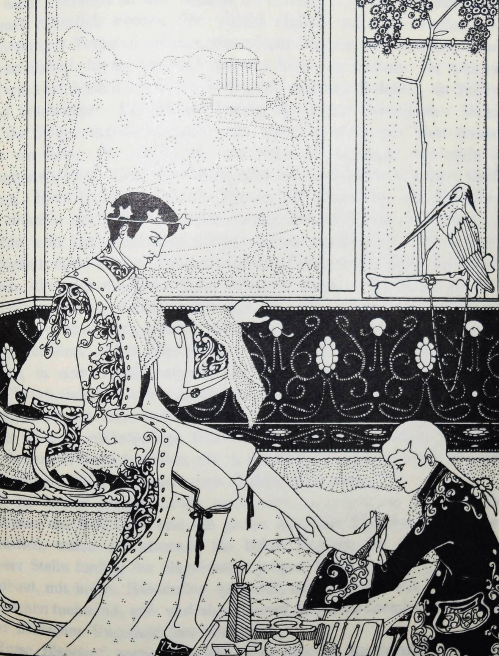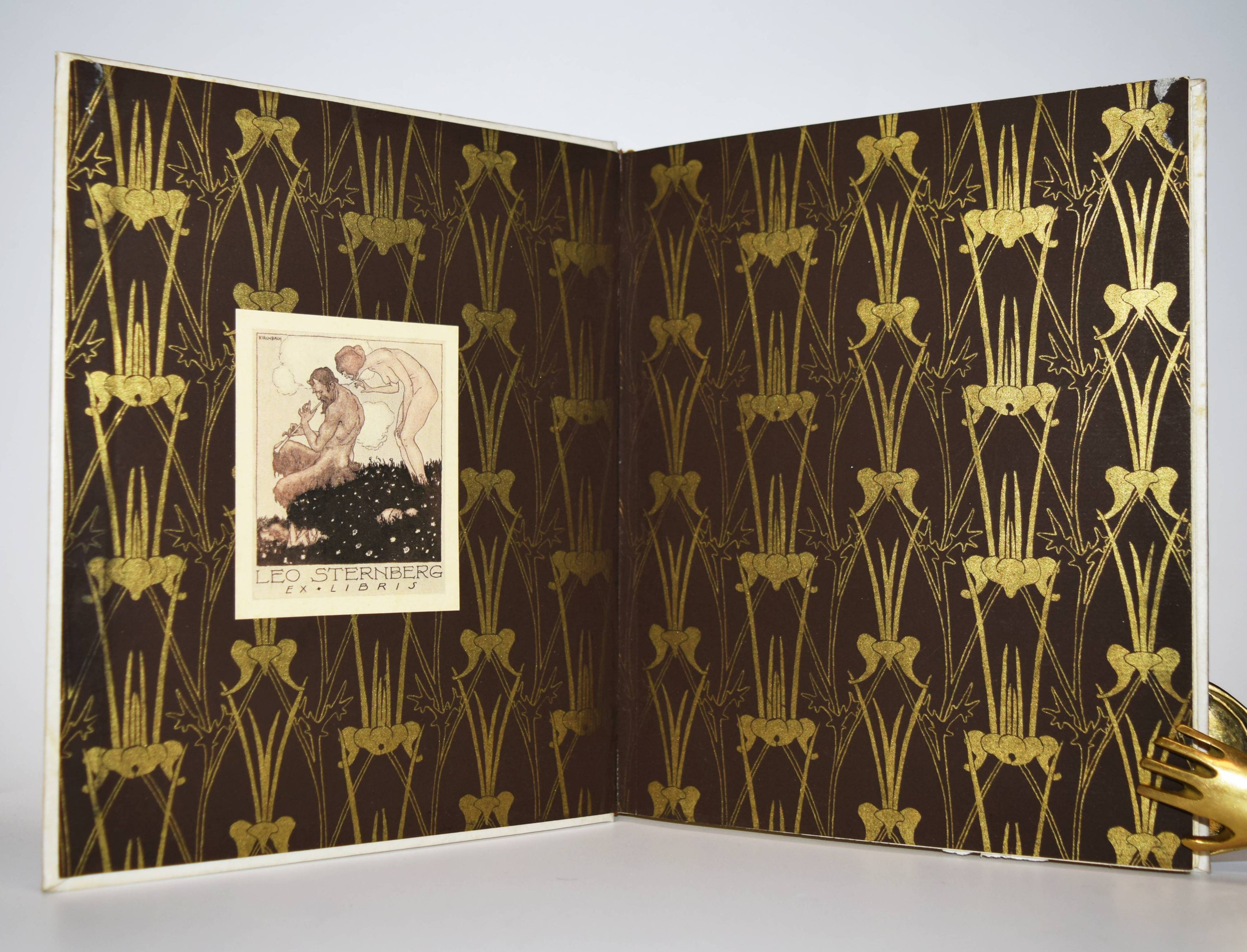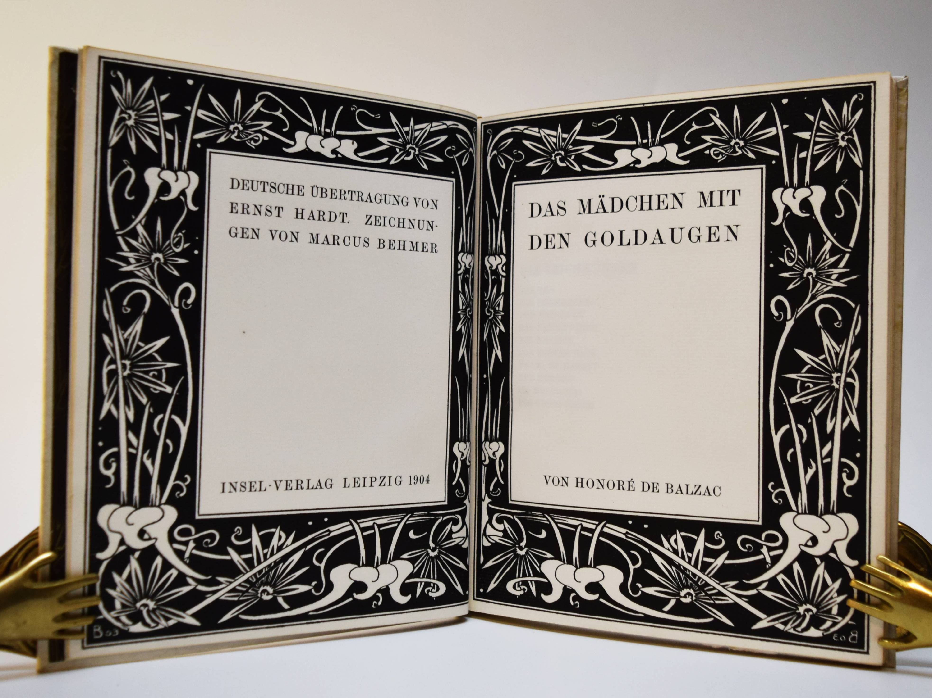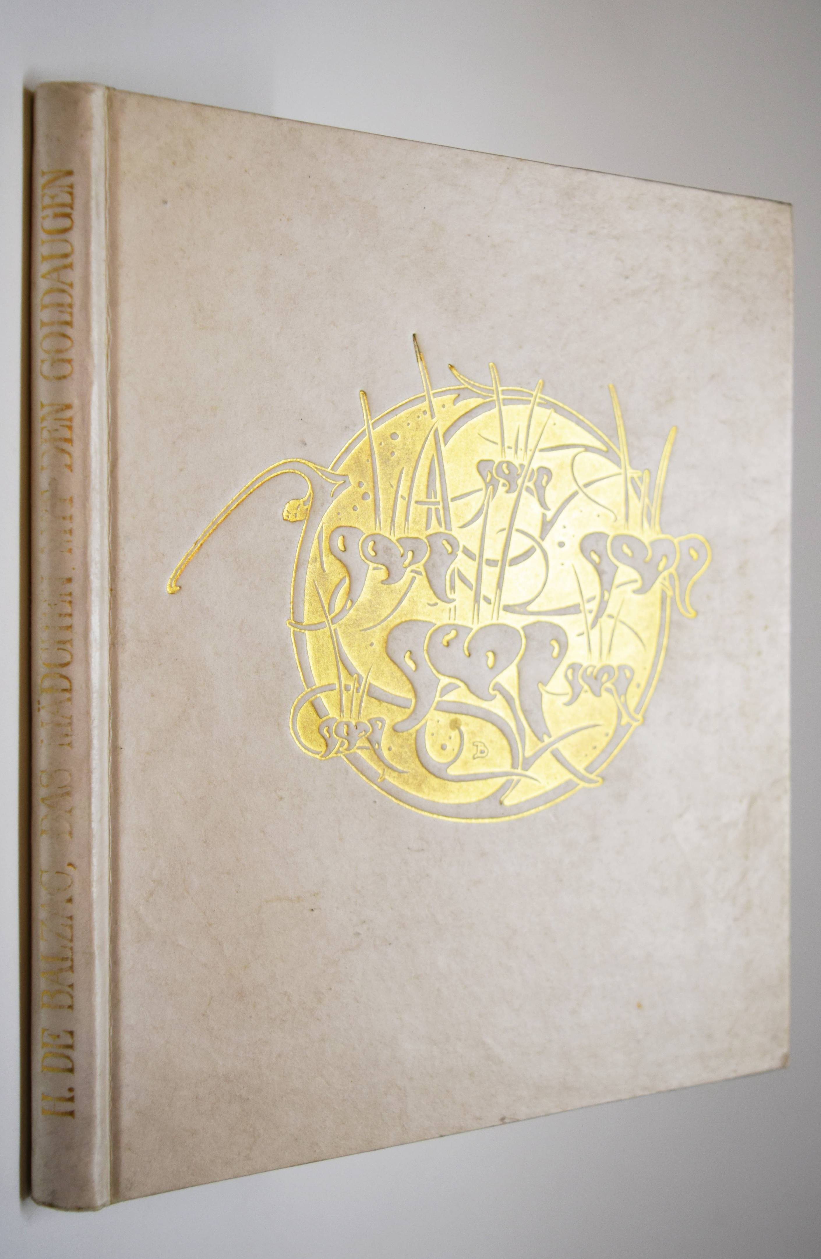 Balzac, Honoré de. Das Mädchen mit den Goldaugen. Deutsche Übertragung von Ernst Hardt. Zeichnungen von Marcus Behmer. Leipzig, Insel-Verlag 1904. Gr.-8°. 91, (1) S., 1 Bl. mit 10 Tafeln und Buchschmuck nach Zeichnungen. Orig.-Pergamentband mit goldgepr. Rückentitel, goldgepr. Deckelvignette, Vorsätze in floraler Jugendstil-Ornamentik in Braun und Gold und Kopfgoldschnitt (Ausführung: A. Köllner, Leipzig). Fromm 1533. Haucke 5. Sarkowski 86. Schauer II, 45. – Eines von 500 Exemplaren. – Gedruckt bei Poeschel & Trepte auf Van Gelder-Bütten, die Illustrationen als Zinkographien auf Japan. – Behmer entwarf auch die große Deckelvignette und die schönen braun-gold gedruckten Vorsatzpapiere. – Nach Oscar Wildes „Salome“ die zweite umfangreiche und selbständige buchkünstlerische Arbeit des damals gerade 25jährigen Behmer. – Ohne den Schuber, schönes sauberes Exemplar aus der Bibliothek des Schriftstellers Leo Sternberg (1876-1937) mit dessen schönen Jugendstil-Exlibris (signiert: Kirchbach).