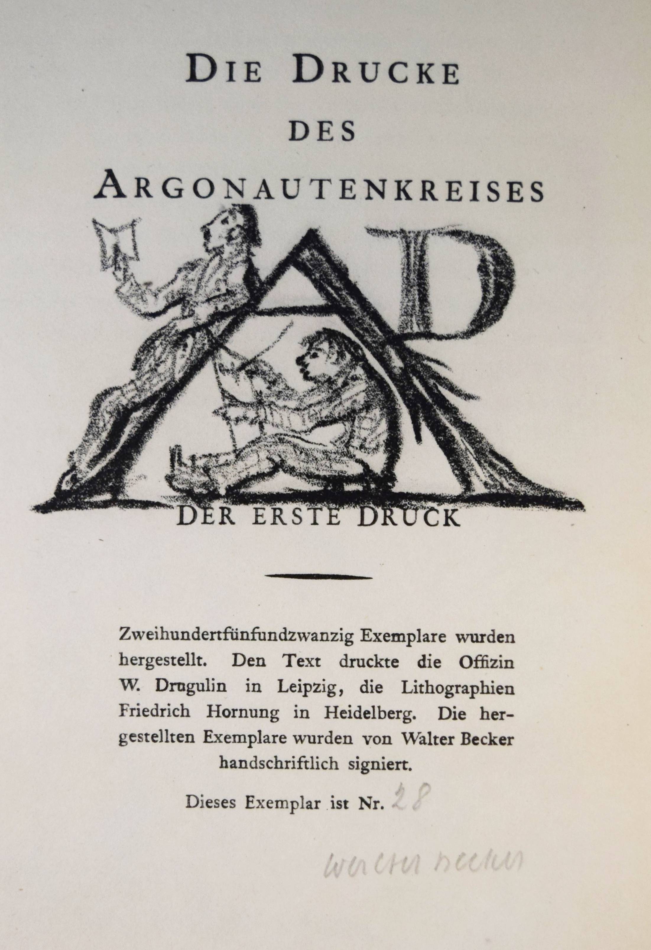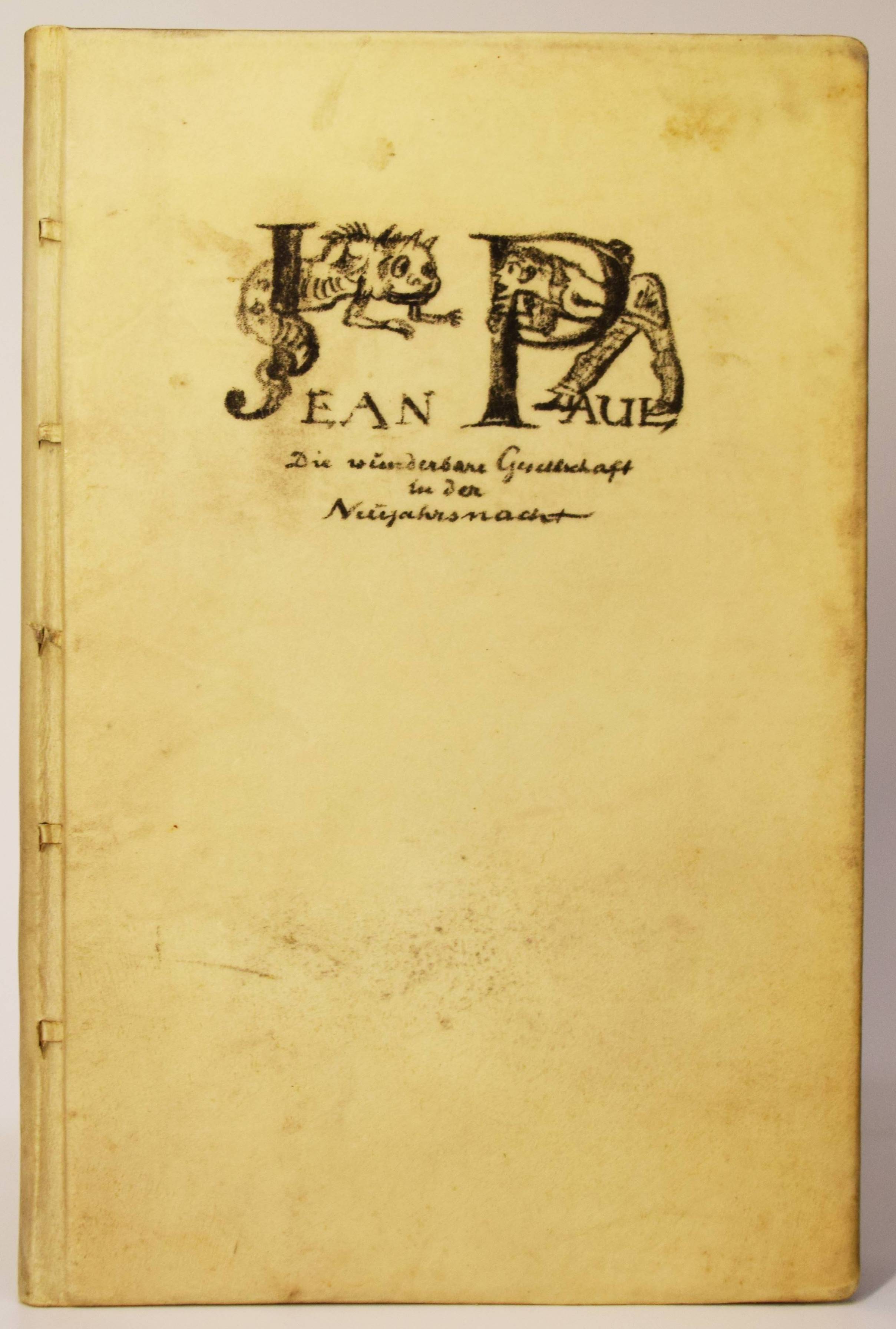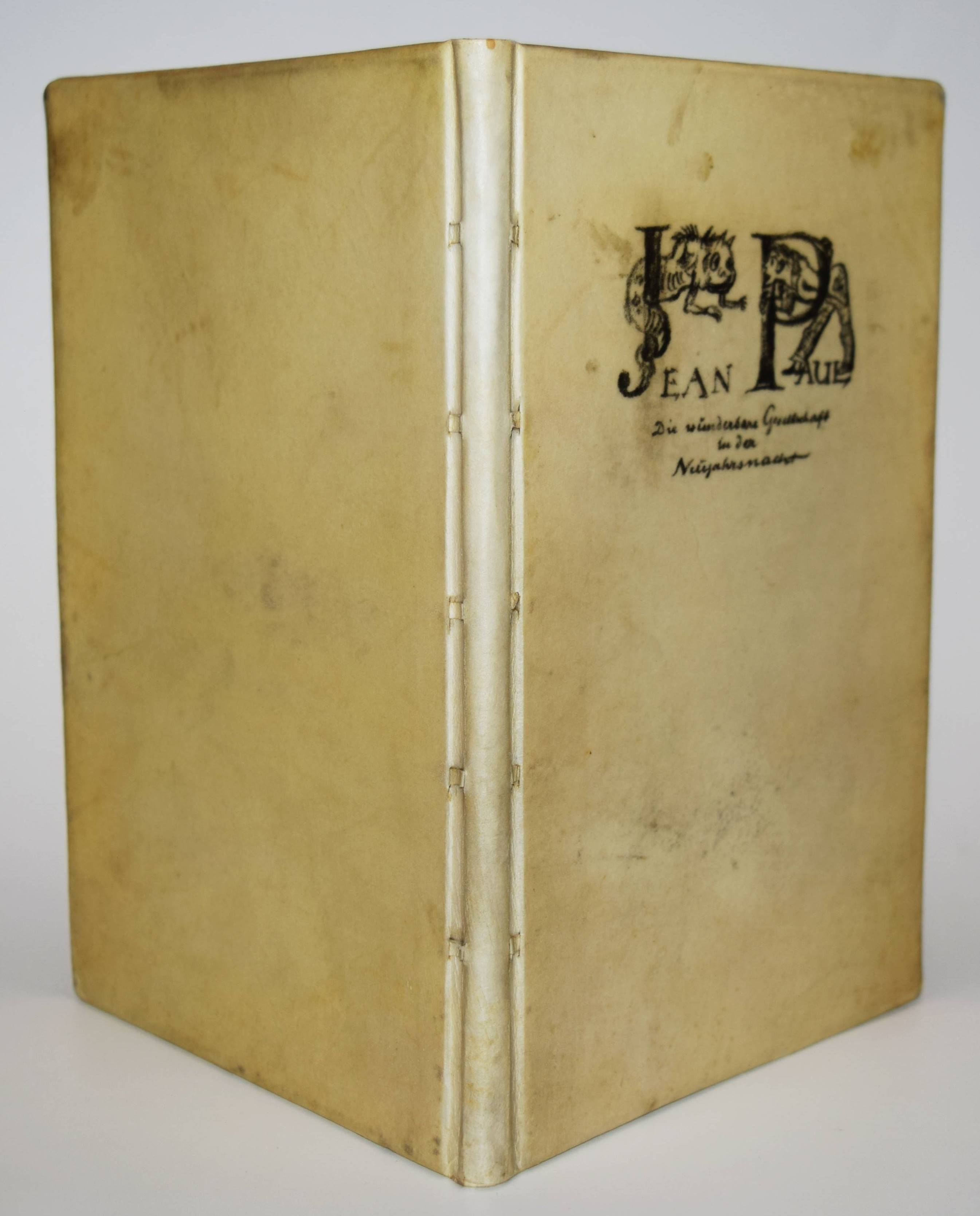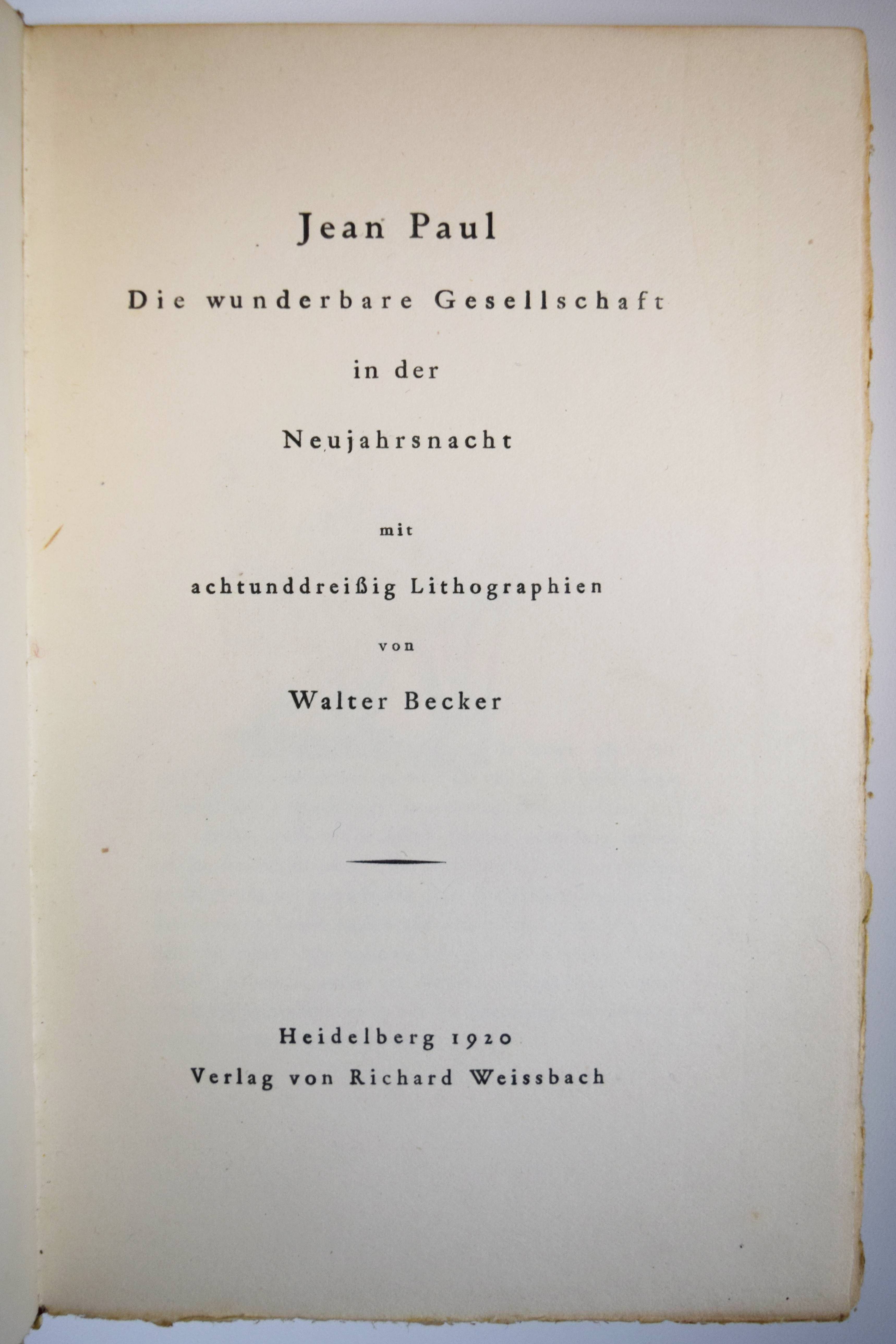 Jean Paul (d. i. Johann Paul Friedrich Richter). Die wunderbare Gesellschaft in der Neujahrsnacht. Mit einunddreißig Lithographien von Walter Becker. Heidelberg, Richard Weissbach 1920. Gr.-8° (23 x 14,5 cm.). 43 S., [1] Bl. mit 31 Orig.-Lithographien. Pergamentband der Zeit mit kalligraphischem Deckeltitel mit figürlichen Initialen (signiert O(tto) Heinisch, Heidelberg). (Die Drucke des Argonautenkreises, erster Druck). Rodenberg I, 349. Sennewald 14, 20, 6. – Eines von 225 num. Exemplaren; im Druckvermerk von W. Becker signiert. – „Den Text druckte die Offizin W. Drugulin in Leipzig, die Lithographien Friedrich Hornung in Heidelberg.“ – Walter Becker (1893-1984), Ausbildung an der Kunstgewerbe-Schule in Essen 1910 bis 1913), danach Meisterschüler von W. Conz an der Akademie Karlsuhe (1915-1918) und 1922 bis 1923 an der Akademie Dresden. Von 1952 bis 1958 war Becker Professor an der Akademie Karlsruhe. – Einband geringfügig angestaubt, schönes Exemplar in einem interessanten Künstlereinband des Heidelberger Buchbinders Otto Heinisch, der 1907 die 1878 gegründete Buchbinderei Freudenberg übernommen hatte und bis zum Beginn des zweiten Weltkrieg seine Werkstatt in der Hauptstrasse 5 hatte.