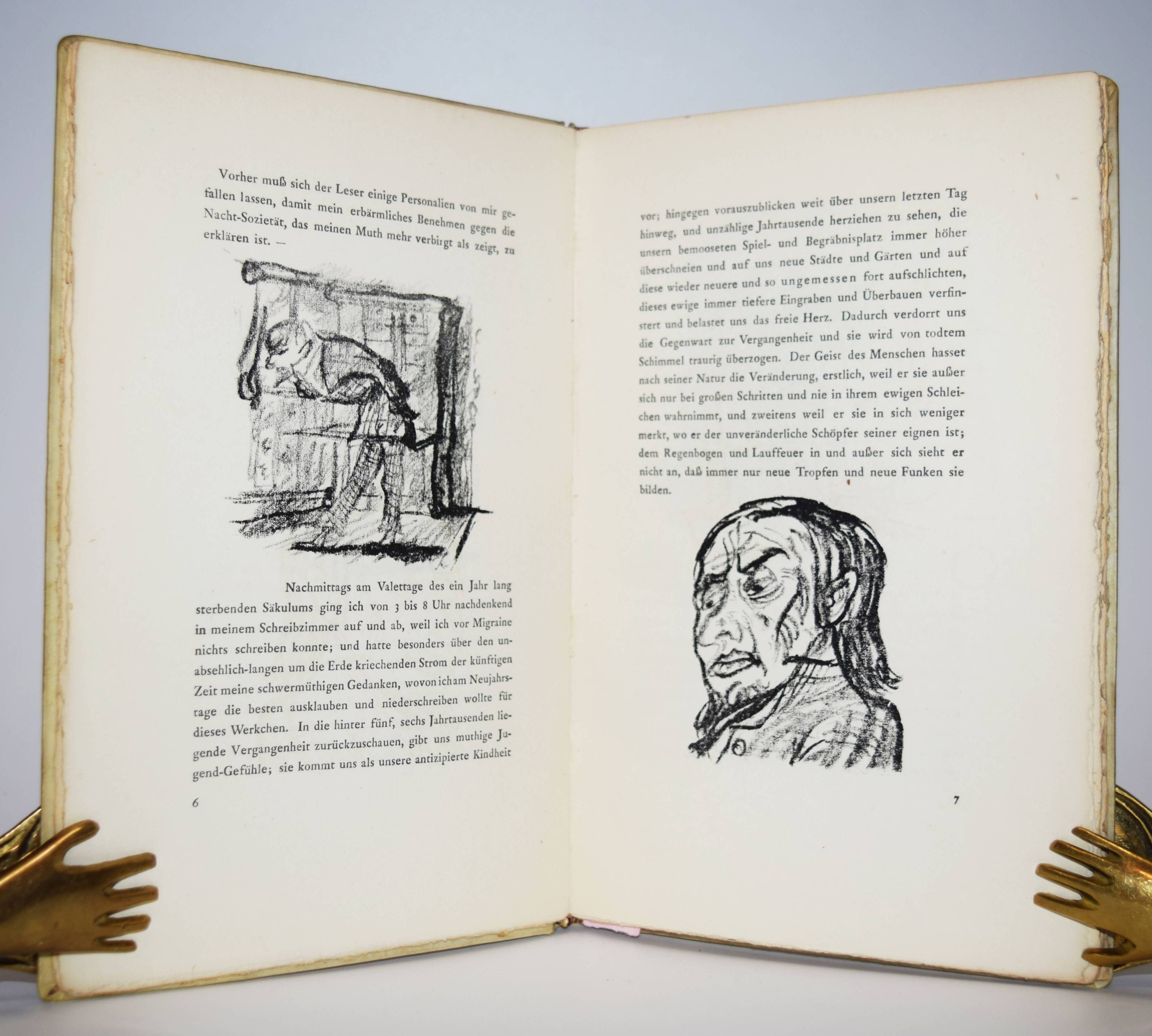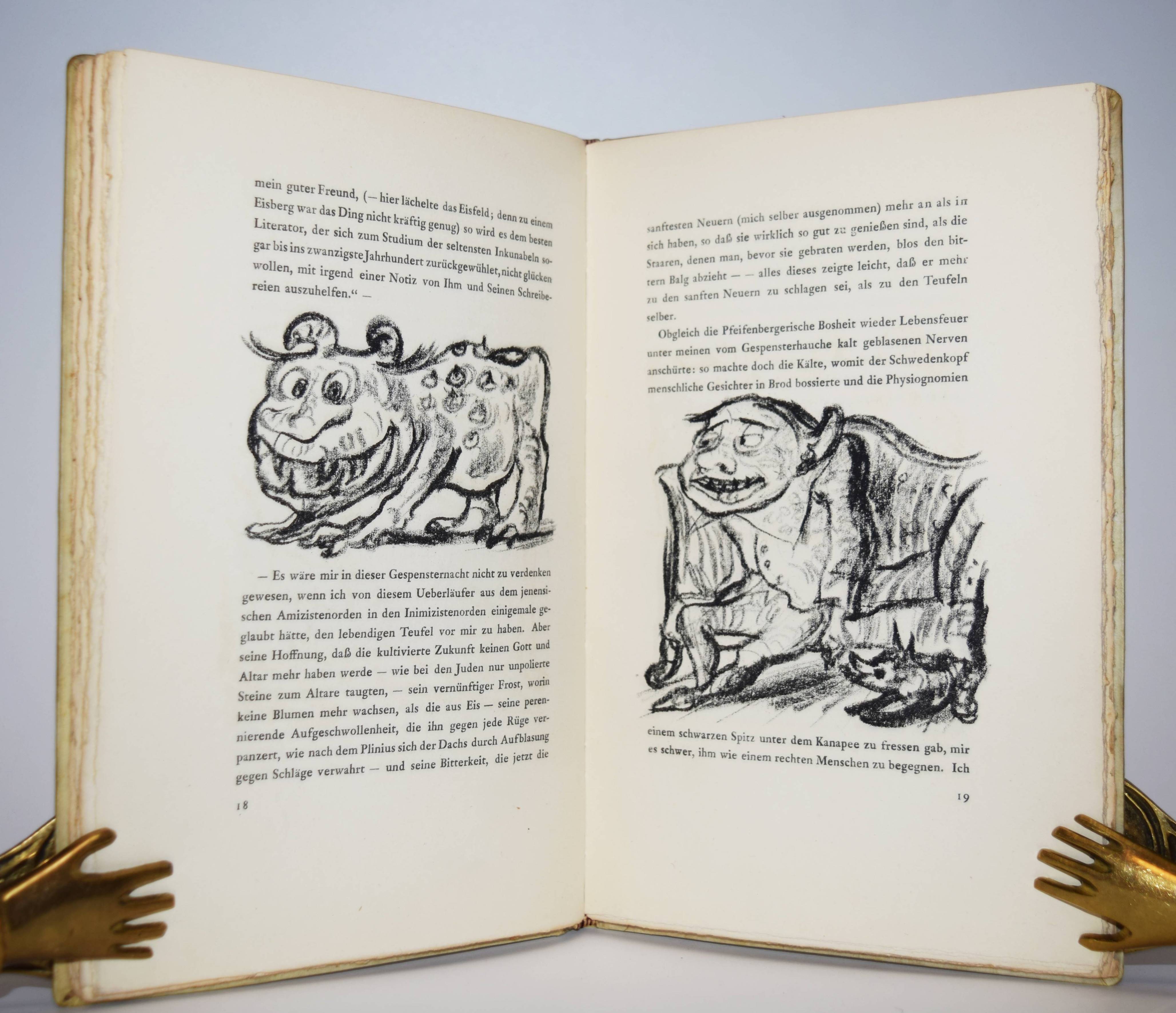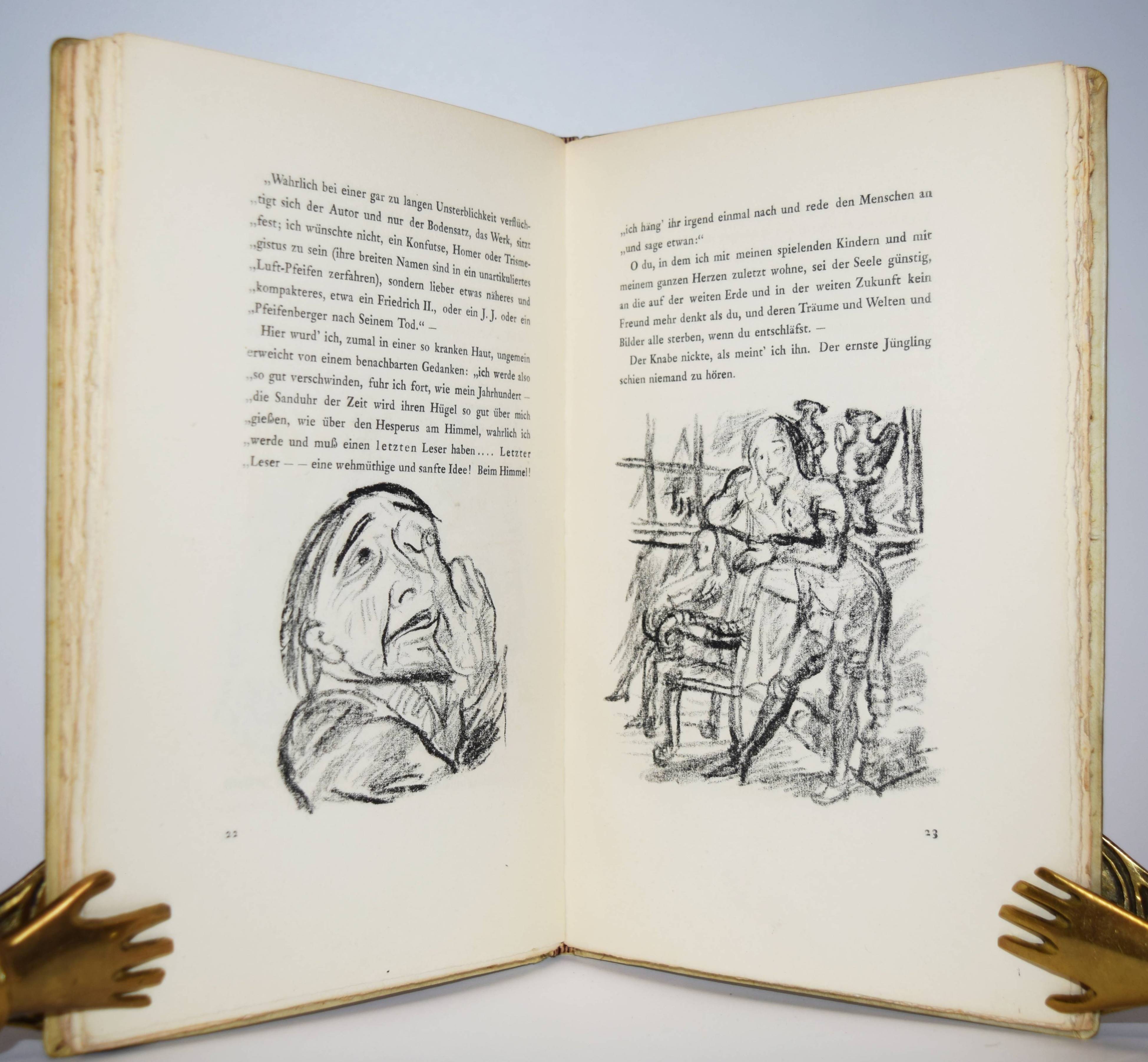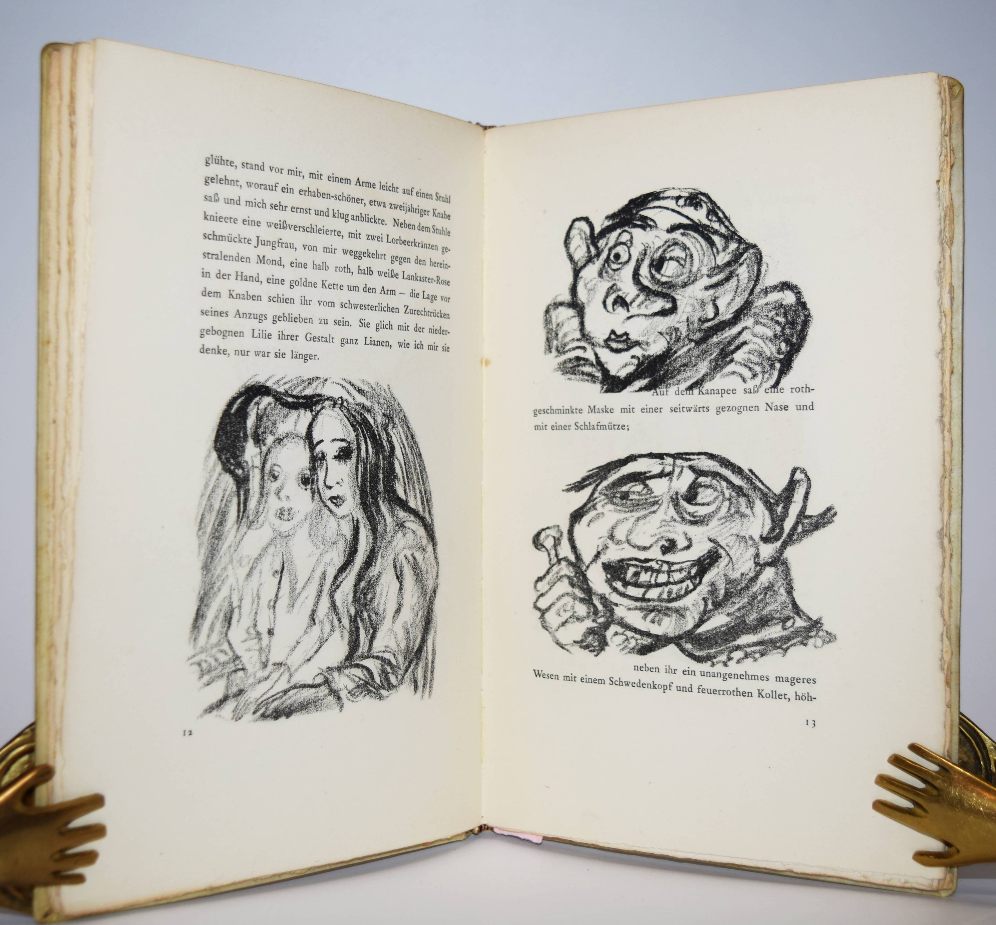 Jean Paul (d. i. Johann Paul Friedrich Richter). Die wunderbare Gesellschaft in der Neujahrsnacht. Mit einunddreißig Lithographien von Walter Becker. Heidelberg, Richard Weissbach 1920. Gr.-8° (23 x 14,5 cm.). 43 S., [1] Bl. mit 31 Orig.-Lithographien. Pergamentband der Zeit mit kalligraphischem Deckeltitel mit figürlichen Initialen (signiert O(tto) Heinisch, Heidelberg). (Die Drucke des Argonautenkreises, erster Druck). Rodenberg I, 349. Sennewald 14, 20, 6. – Eines von 225 num. Exemplaren; im Druckvermerk von W. Becker signiert. – „Den Text druckte die Offizin W. Drugulin in Leipzig, die Lithographien Friedrich Hornung in Heidelberg.“ – Walter Becker (1893-1984), Ausbildung an der Kunstgewerbe-Schule in Essen 1910 bis 1913), danach Meisterschüler von W. Conz an der Akademie Karlsuhe (1915-1918) und 1922 bis 1923 an der Akademie Dresden. Von 1952 bis 1958 war Becker Professor an der Akademie Karlsruhe. – Einband geringfügig angestaubt, schönes Exemplar in einem interessanten Künstlereinband des Heidelberger Buchbinders Otto Heinisch, der 1907 die 1878 gegründete Buchbinderei Freudenberg übernommen hatte und bis zum Beginn des zweiten Weltkrieg seine Werkstatt in der Hauptstrasse 5 hatte.