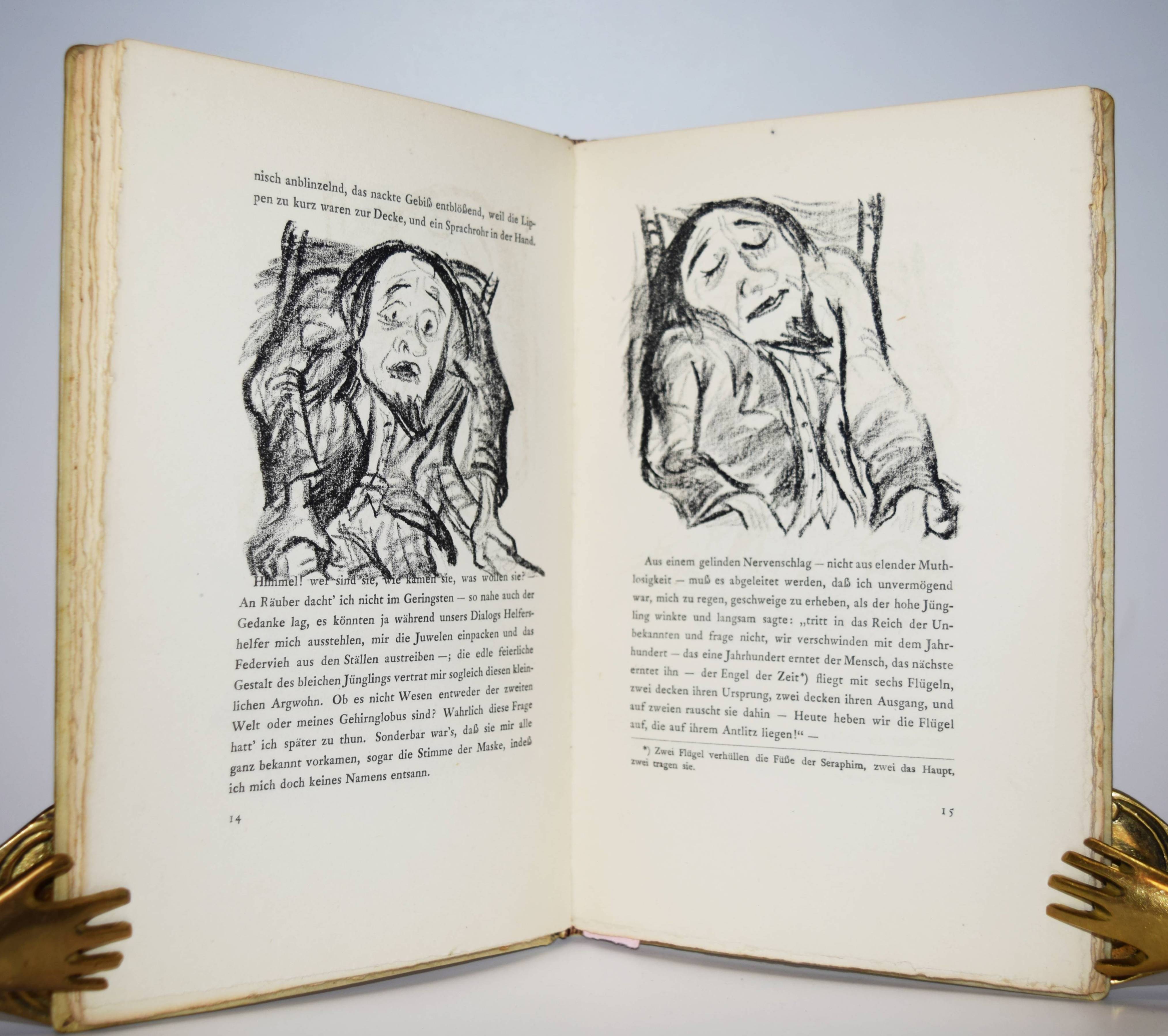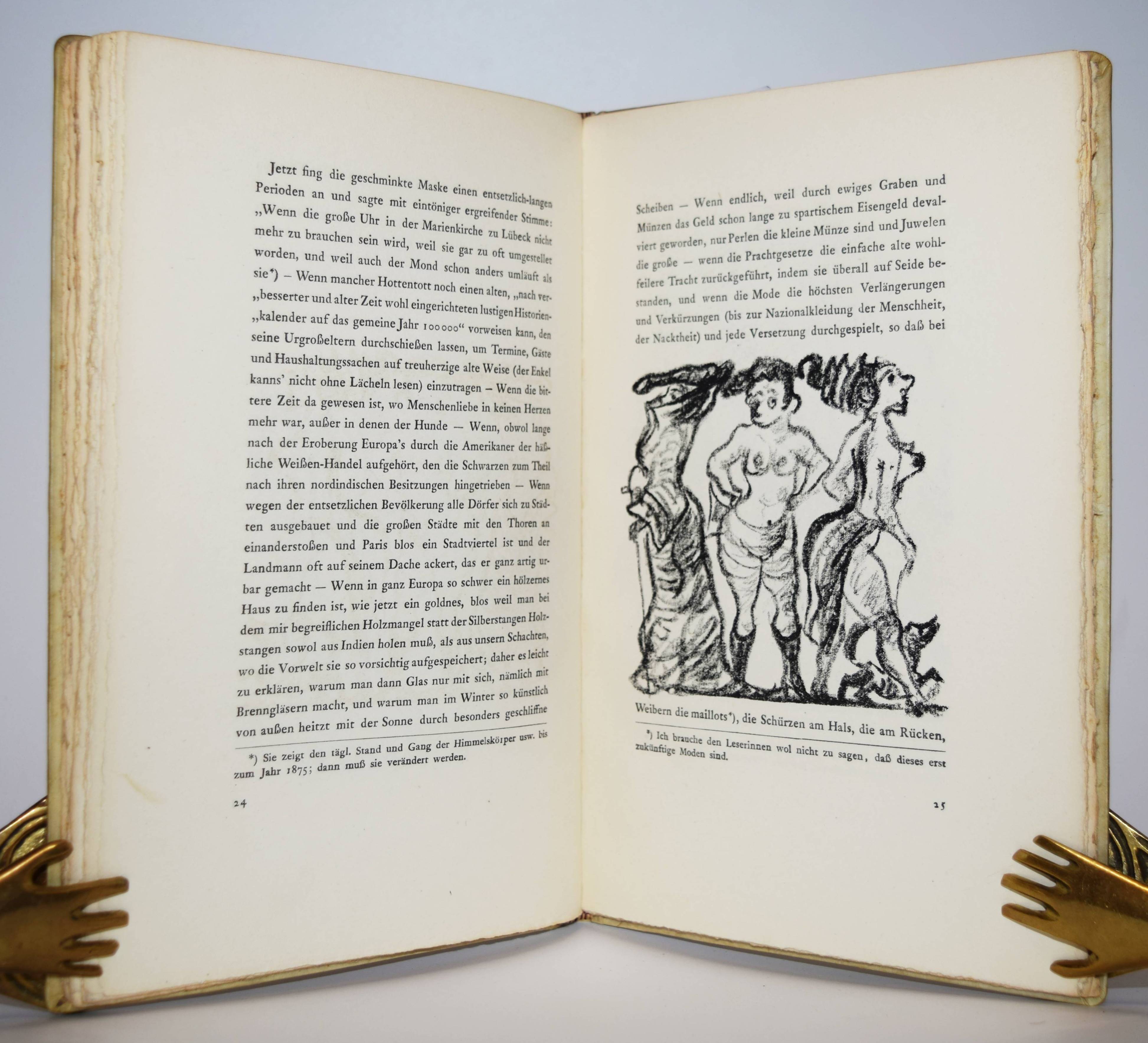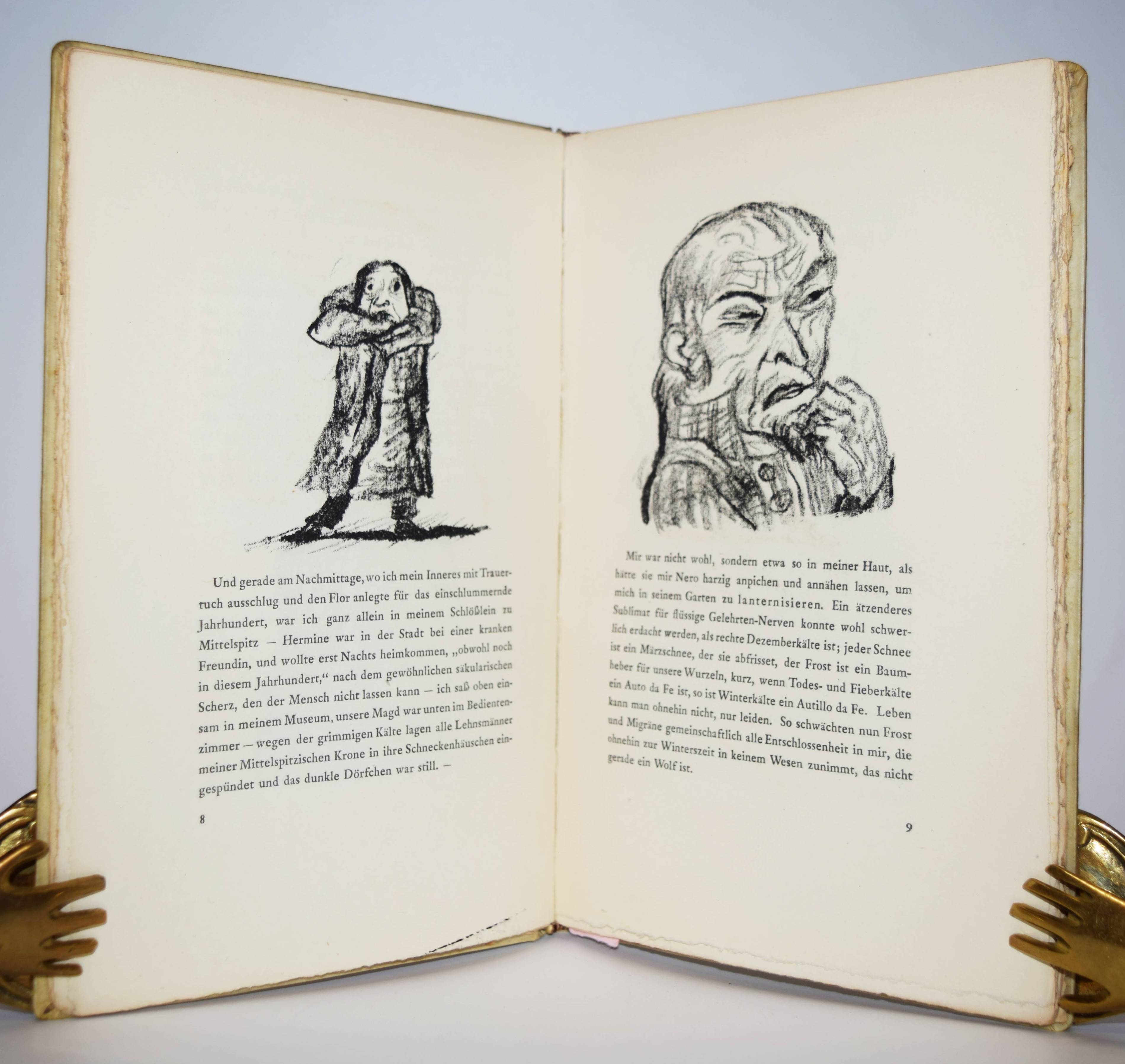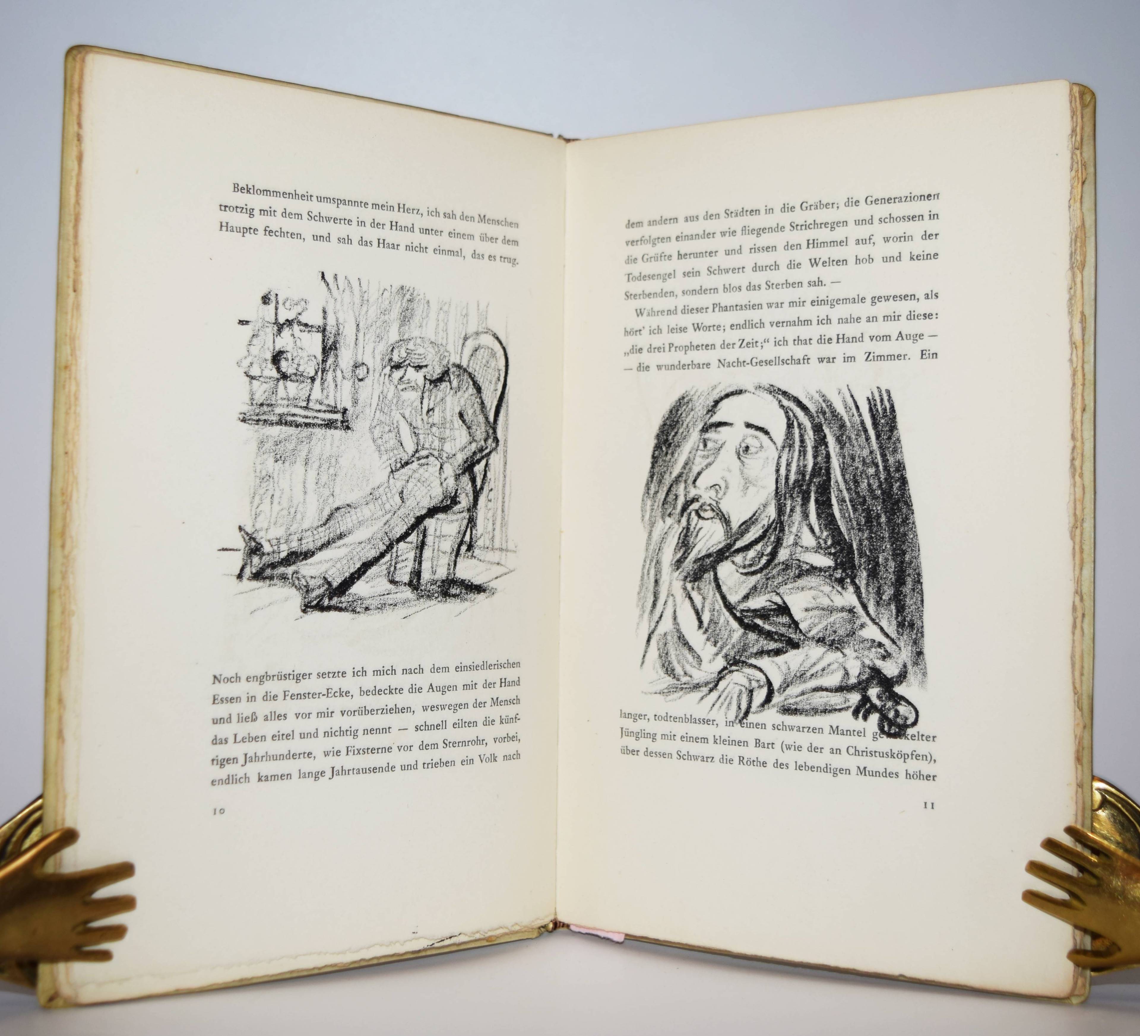 Jean Paul (d. i. Johann Paul Friedrich Richter). Die wunderbare Gesellschaft in der Neujahrsnacht. Mit einunddreißig Lithographien von Walter Becker. Heidelberg, Richard Weissbach 1920. Gr.-8° (23 x 14,5 cm.). 43 S., [1] Bl. mit 31 Orig.-Lithographien. Pergamentband der Zeit mit kalligraphischem Deckeltitel mit figürlichen Initialen (signiert O(tto) Heinisch, Heidelberg). (Die Drucke des Argonautenkreises, erster Druck). Rodenberg I, 349. Sennewald 14, 20, 6. – Eines von 225 num. Exemplaren; im Druckvermerk von W. Becker signiert. – „Den Text druckte die Offizin W. Drugulin in Leipzig, die Lithographien Friedrich Hornung in Heidelberg.“ – Walter Becker (1893-1984), Ausbildung an der Kunstgewerbe-Schule in Essen 1910 bis 1913), danach Meisterschüler von W. Conz an der Akademie Karlsuhe (1915-1918) und 1922 bis 1923 an der Akademie Dresden. Von 1952 bis 1958 war Becker Professor an der Akademie Karlsruhe. – Einband geringfügig angestaubt, schönes Exemplar in einem interessanten Künstlereinband des Heidelberger Buchbinders Otto Heinisch, der 1907 die 1878 gegründete Buchbinderei Freudenberg übernommen hatte und bis zum Beginn des zweiten Weltkrieg seine Werkstatt in der Hauptstrasse 5 hatte.