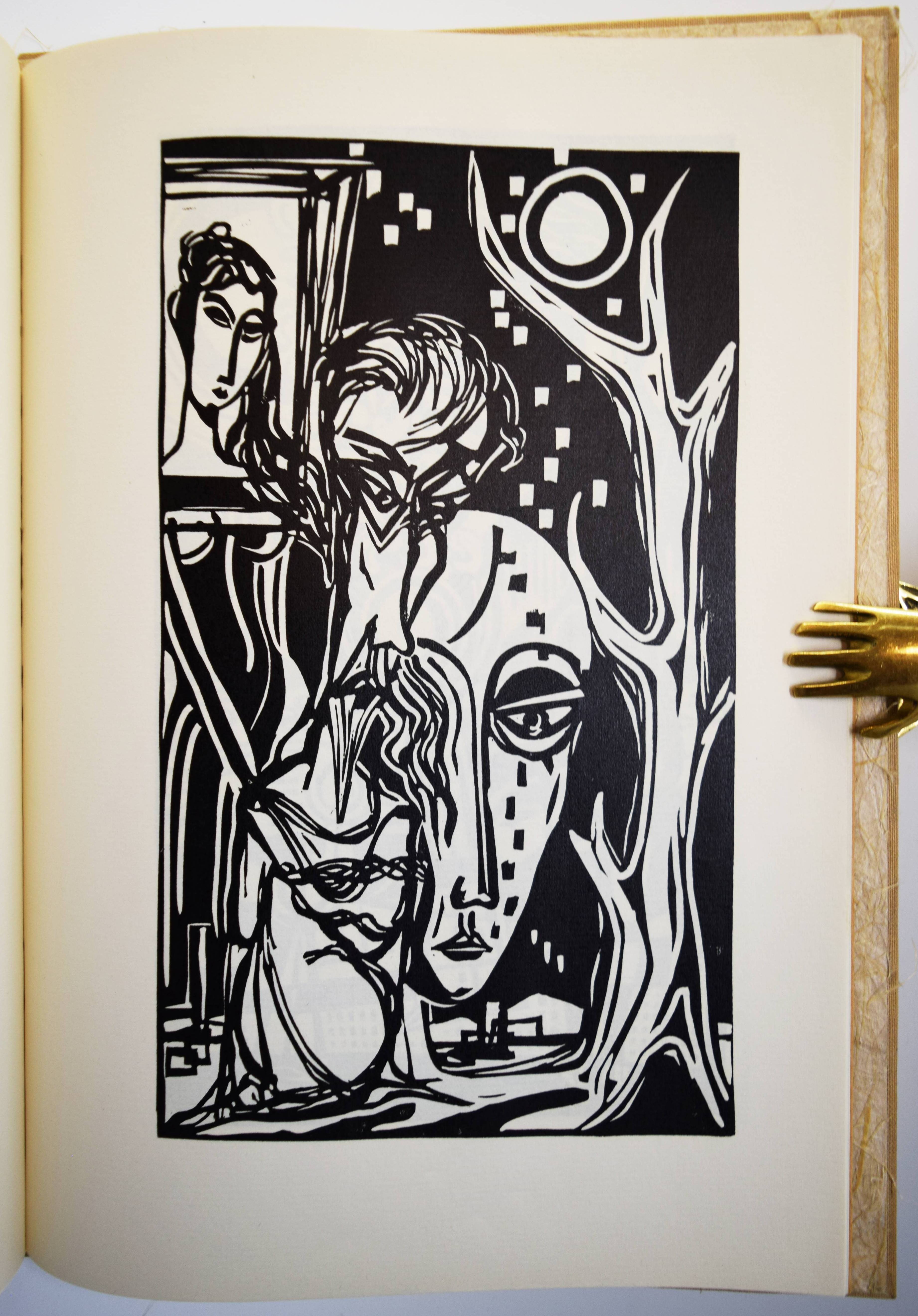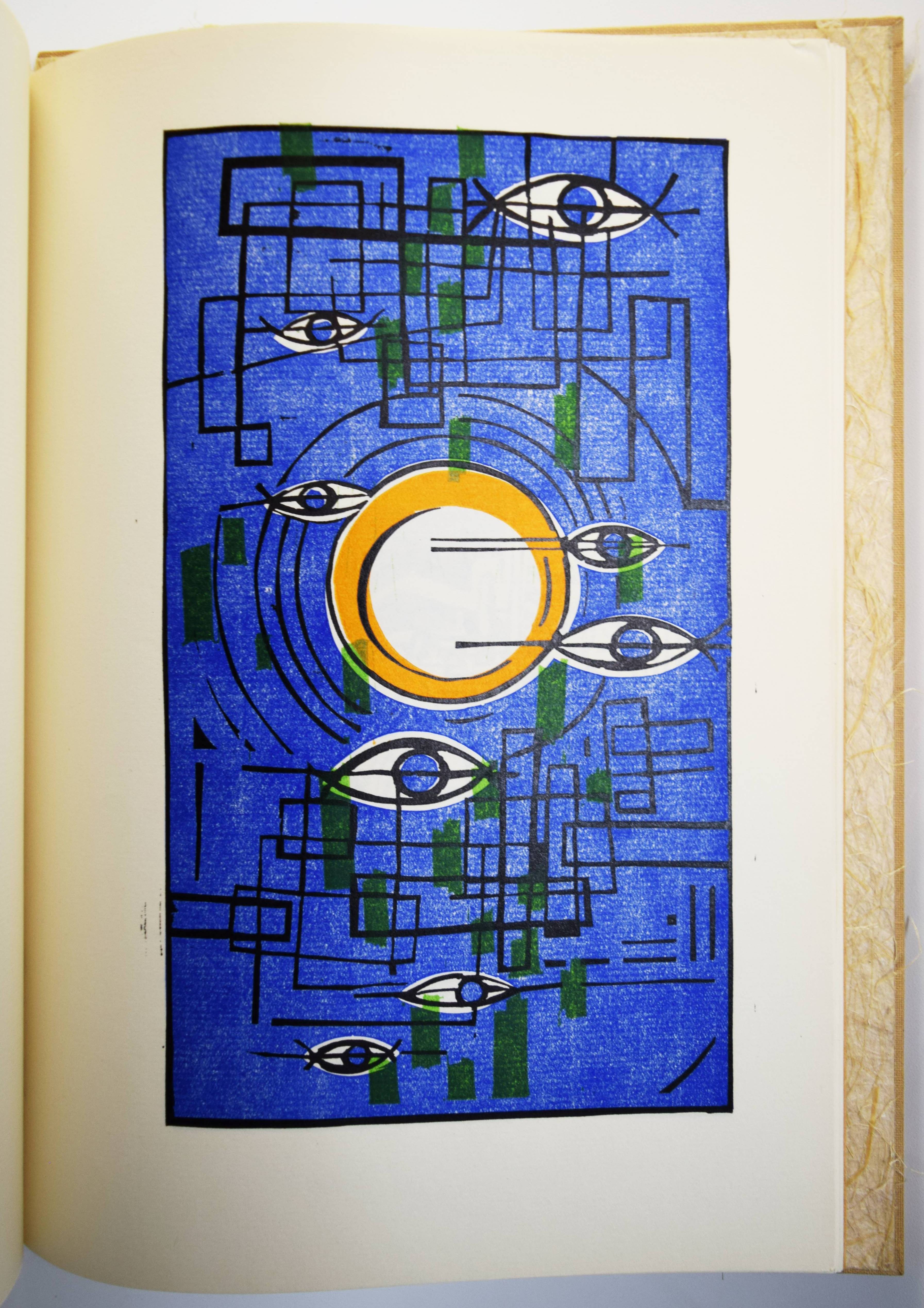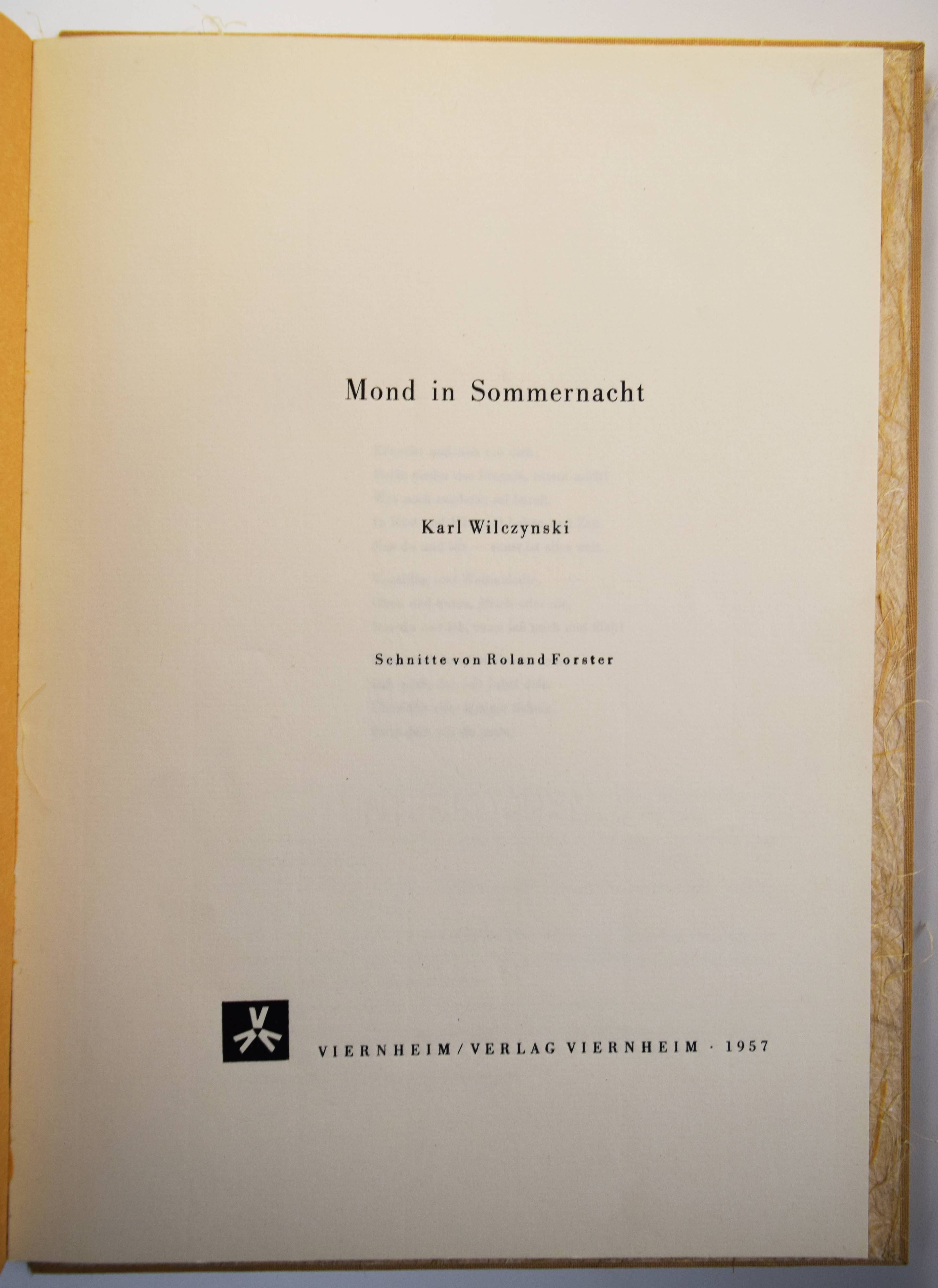 Wilczynski, Karl. Mond in Sommernacht. Schnitte von Roland Forster. Viernheim, Zürich, Verlag Viernheim 1957. 4°. [14] eins. bedr. Bl. (Text) und 11 (5 farbige) Orig.-Linolschnitte. Orig.-Broschurumschlag in Halbleinen-Schuber mit Japanpapier-Bezug. Eines von 150 num. Exemplaren; im Druckvermerk von K. Wilczynski und R. Forster signiert. – Sehr gutes Exemplar.