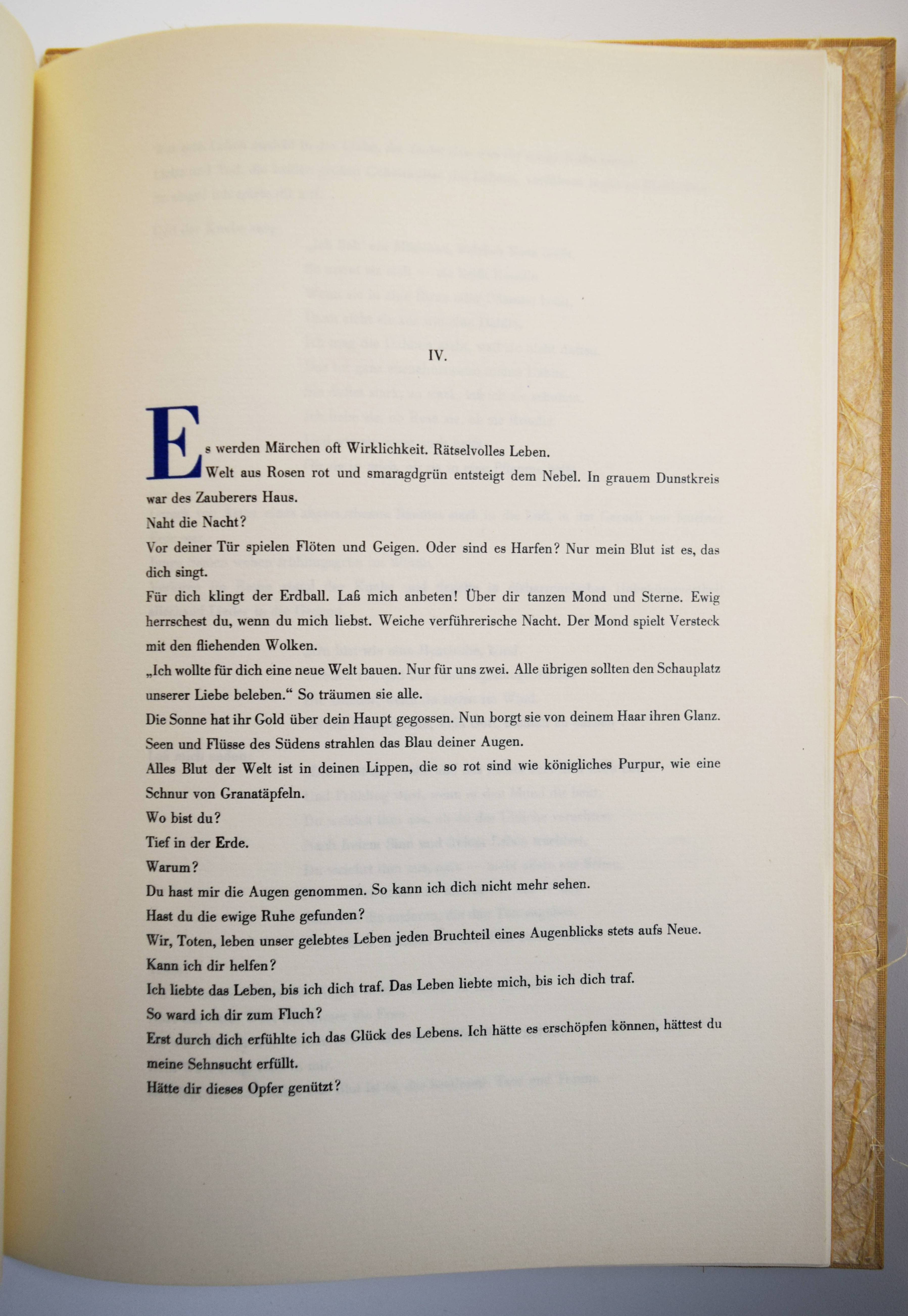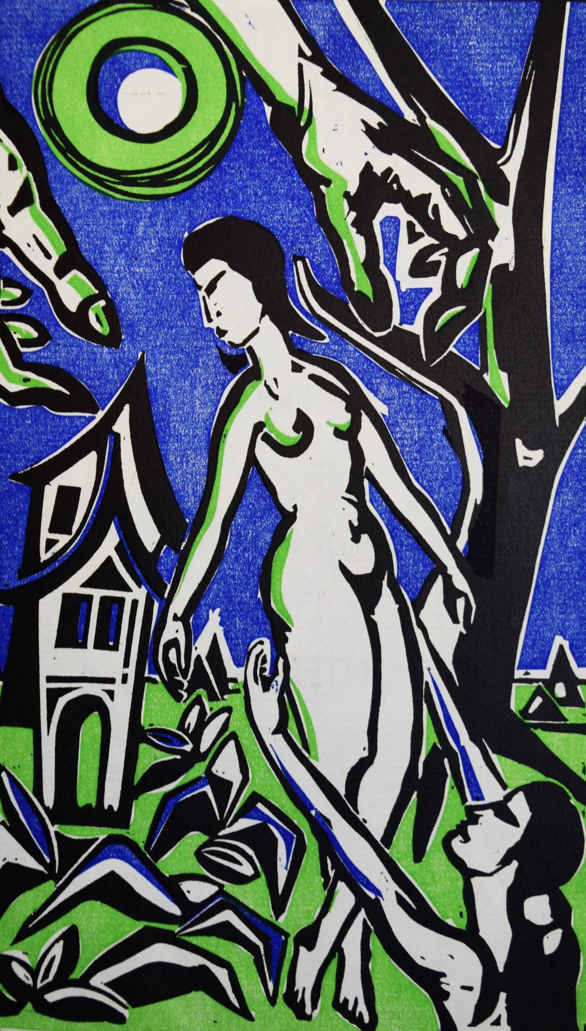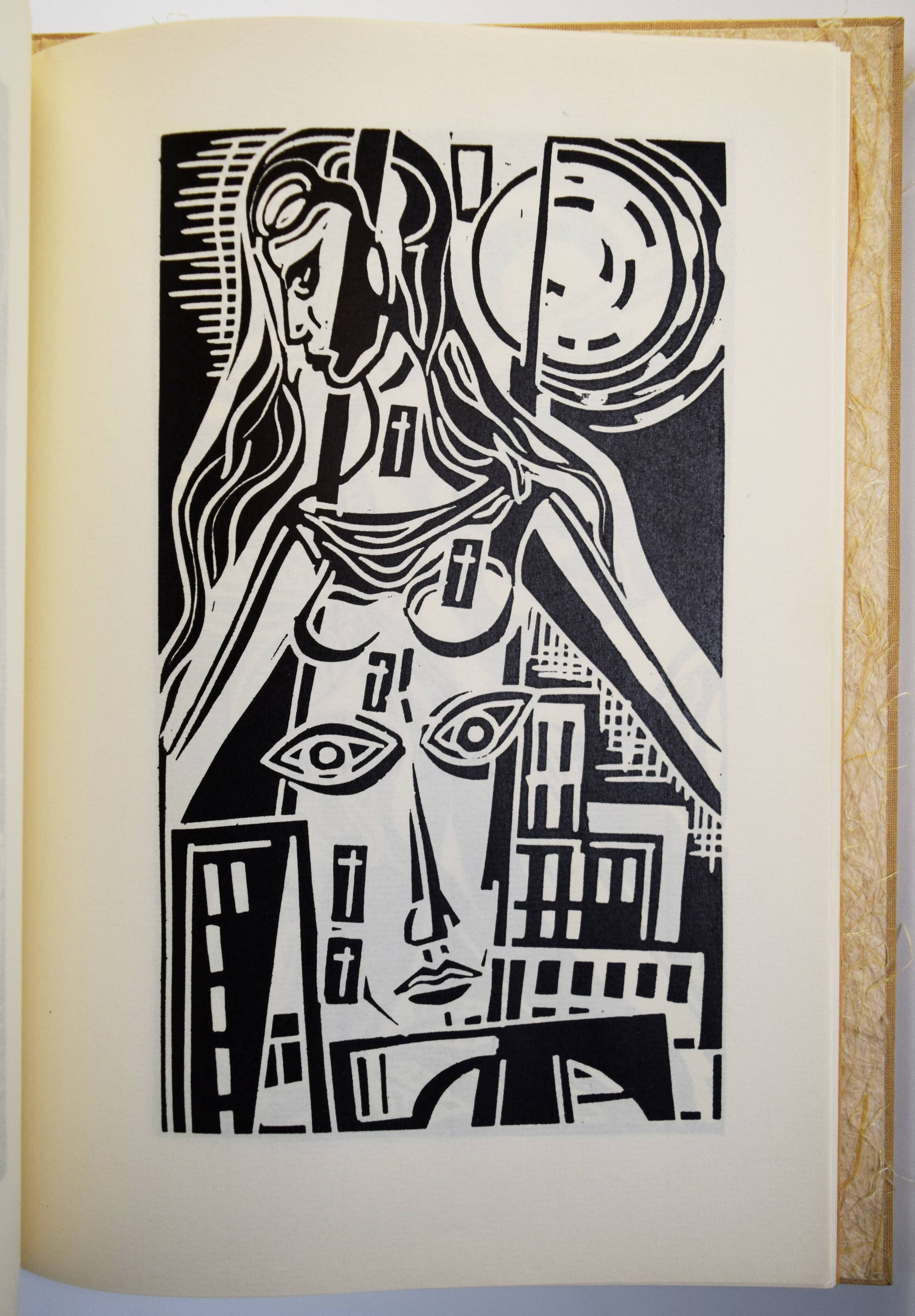 Wilczynski, Karl. Mond in Sommernacht. Schnitte von Roland Forster. Viernheim, Zürich, Verlag Viernheim 1957. 4°. [14] eins. bedr. Bl. (Text) und 11 (5 farbige) Orig.-Linolschnitte. Orig.-Broschurumschlag in Halbleinen-Schuber mit Japanpapier-Bezug. Eines von 150 num. Exemplaren; im Druckvermerk von K. Wilczynski und R. Forster signiert. – Sehr gutes Exemplar.