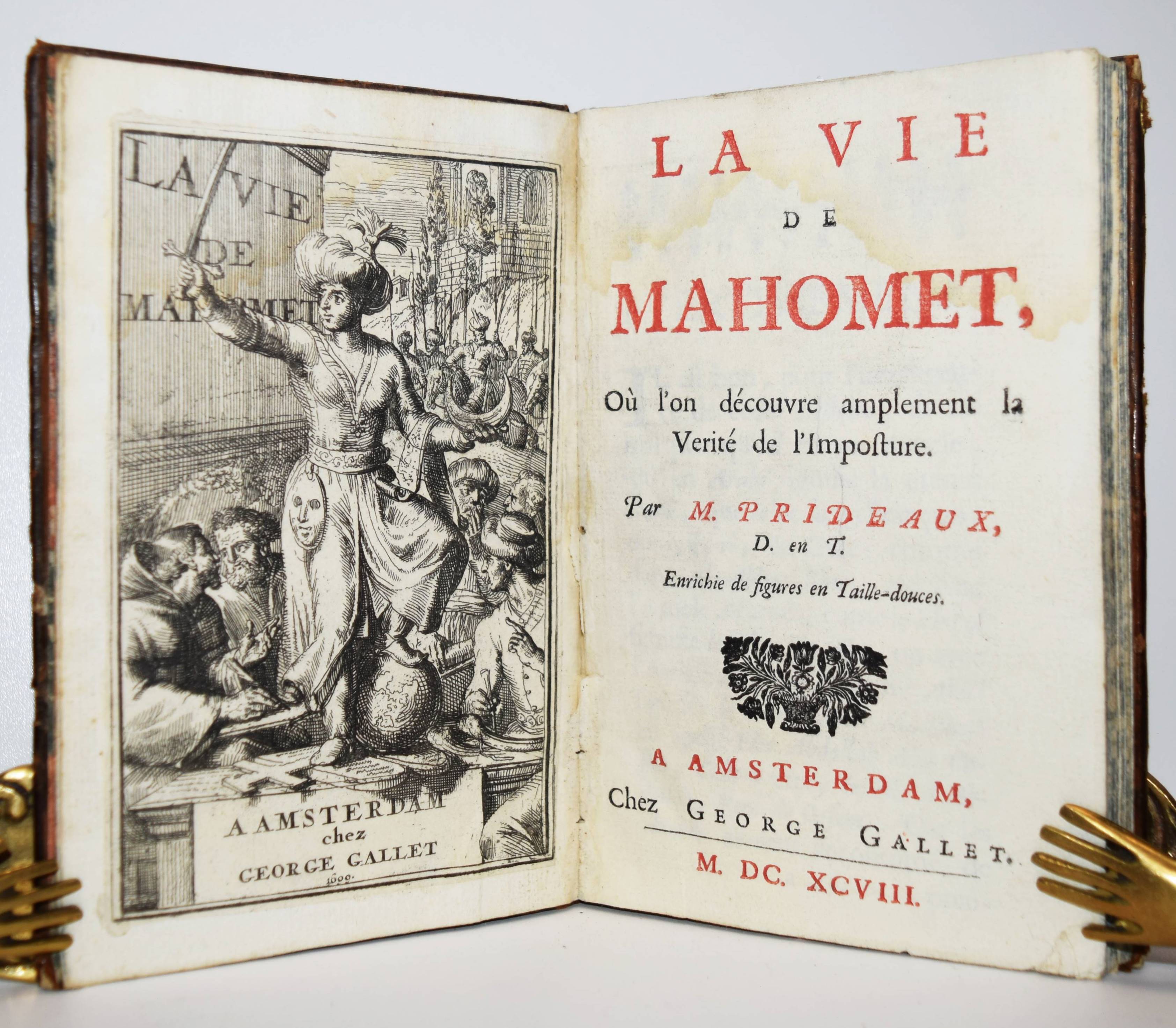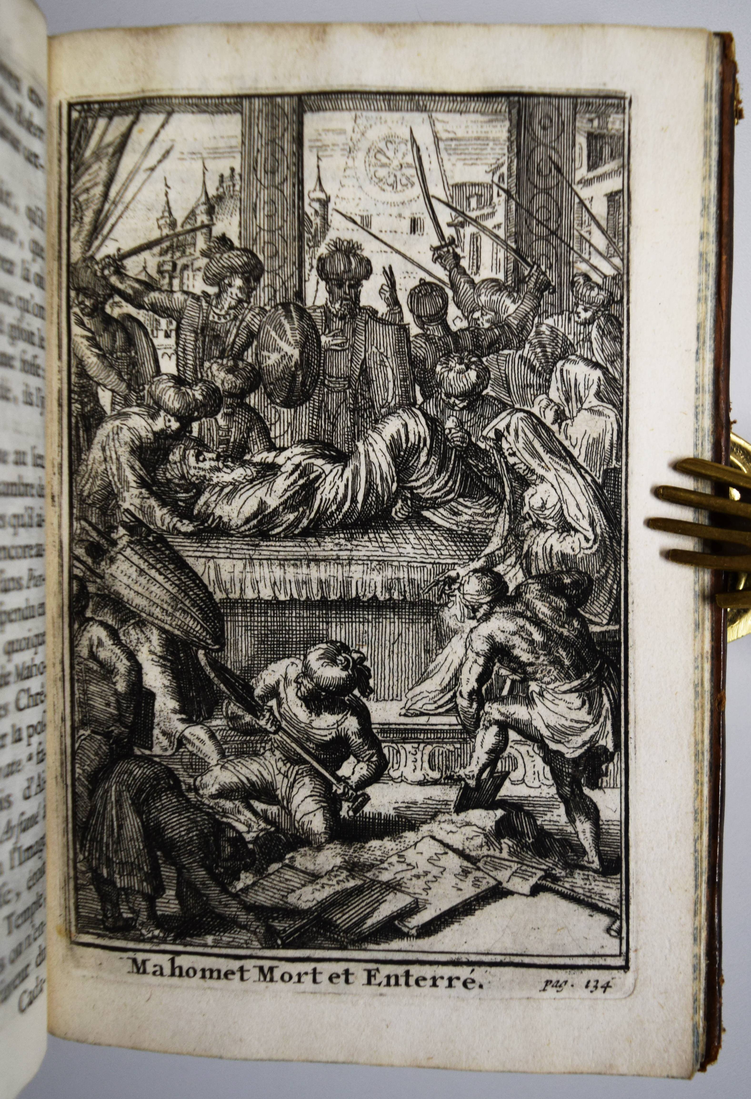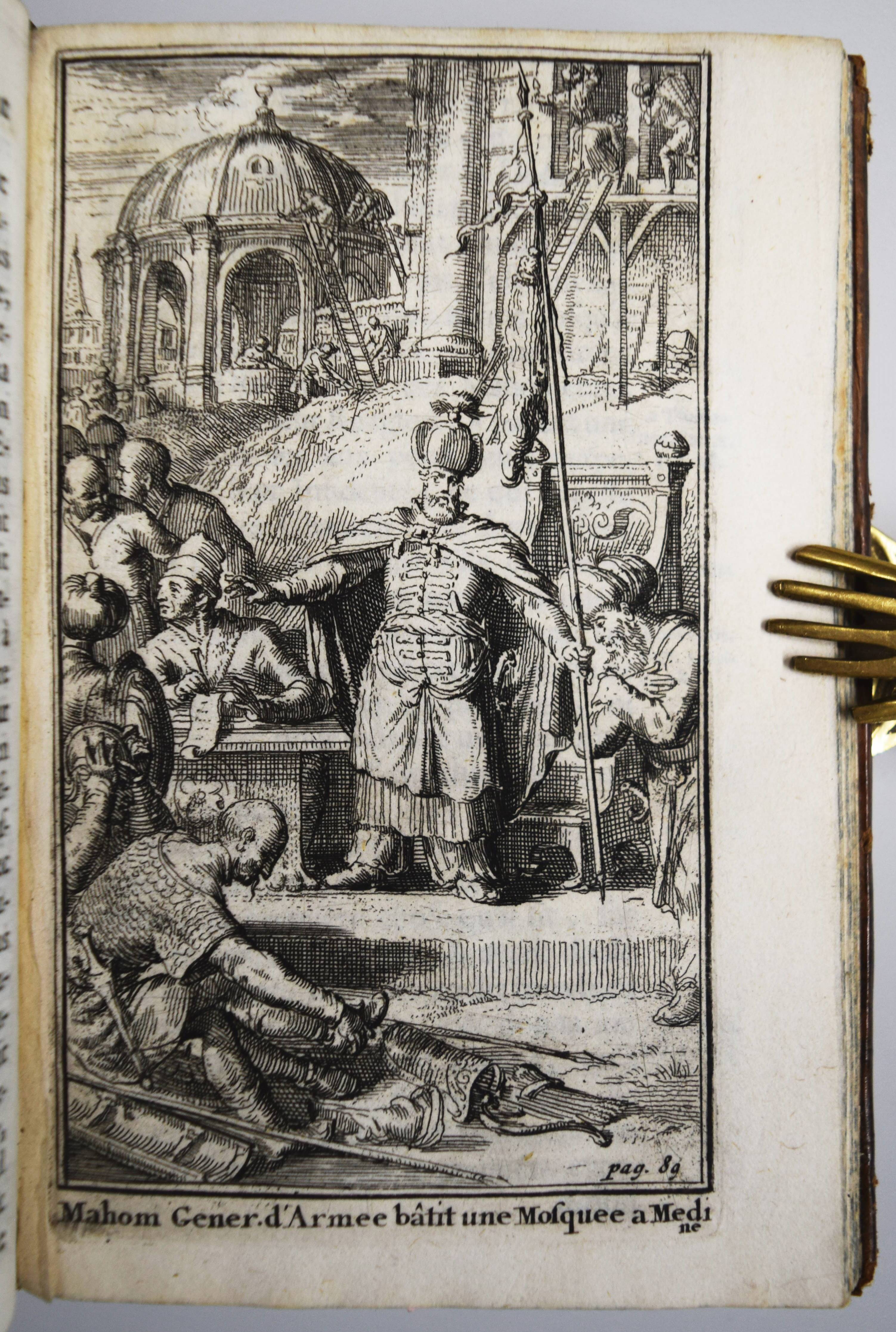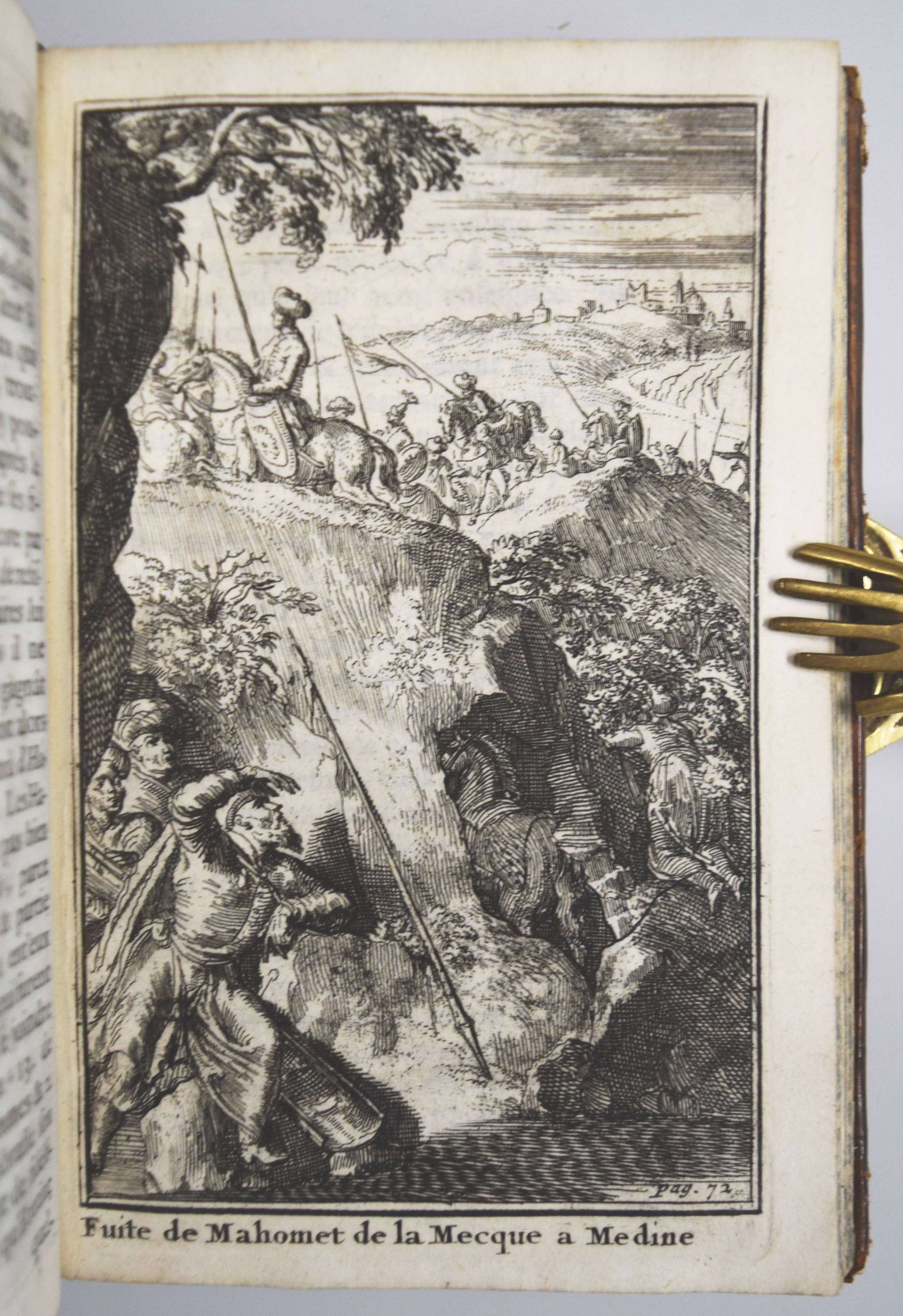 Prideaux, (Humphrey). La vie de Mahomet, où l’on découvre amplement la vérité de l’imposture. Enrichie de figures en taille-douces. (Traduit par Daniel Larroque). Amsterdam, George Gallet 1698. Kl.-8° (15 x 10 cm.). [3] Bl., 164 S., [2] Bl. mit Titelblatt in Rot und Schwarz gestoch. Frontispiz und 9 Kupfertafeln im Stil von Romeyn de Hooghe. Kalbslederband der Zeit mit goldgepr. Rückenschild und floraler Rückenvergoldung. Brunet, VI, 28001. Chahine, Bibliographie du Levant 3859. – Erste französische Ausgabe. Die britische Originalausgabe erschien 1697. – „The Life of Mahomet was in fact printed as a polemical tract against the deists. As a biography it is valueless from the point of view of moderne knowledge. Some of its error were noted by Sale in the discourse and notes to his translation of the Koran 1734. Prideaux had thought of writing a history of the Saracen empire but turned insted for his next historical subject to th interval between the Old and the New testament“ (Dict. of Nat. Biogr. XLV, 352). – Der britische Theologe und Orientalist Humphrey Prideaux (1648-1724) beruft sich in dem vorliegenden Werk auf die Studien des bedeutenden Orientalisten und Bibelforschers Edward Pococke (1604-1691), der eine Sammlung von über 400 orientalischen Manuskripten besaß. – Stempel auf dem Vorsatz, sehr gutes sauberes und dekorativ gebundenes Exemplar.