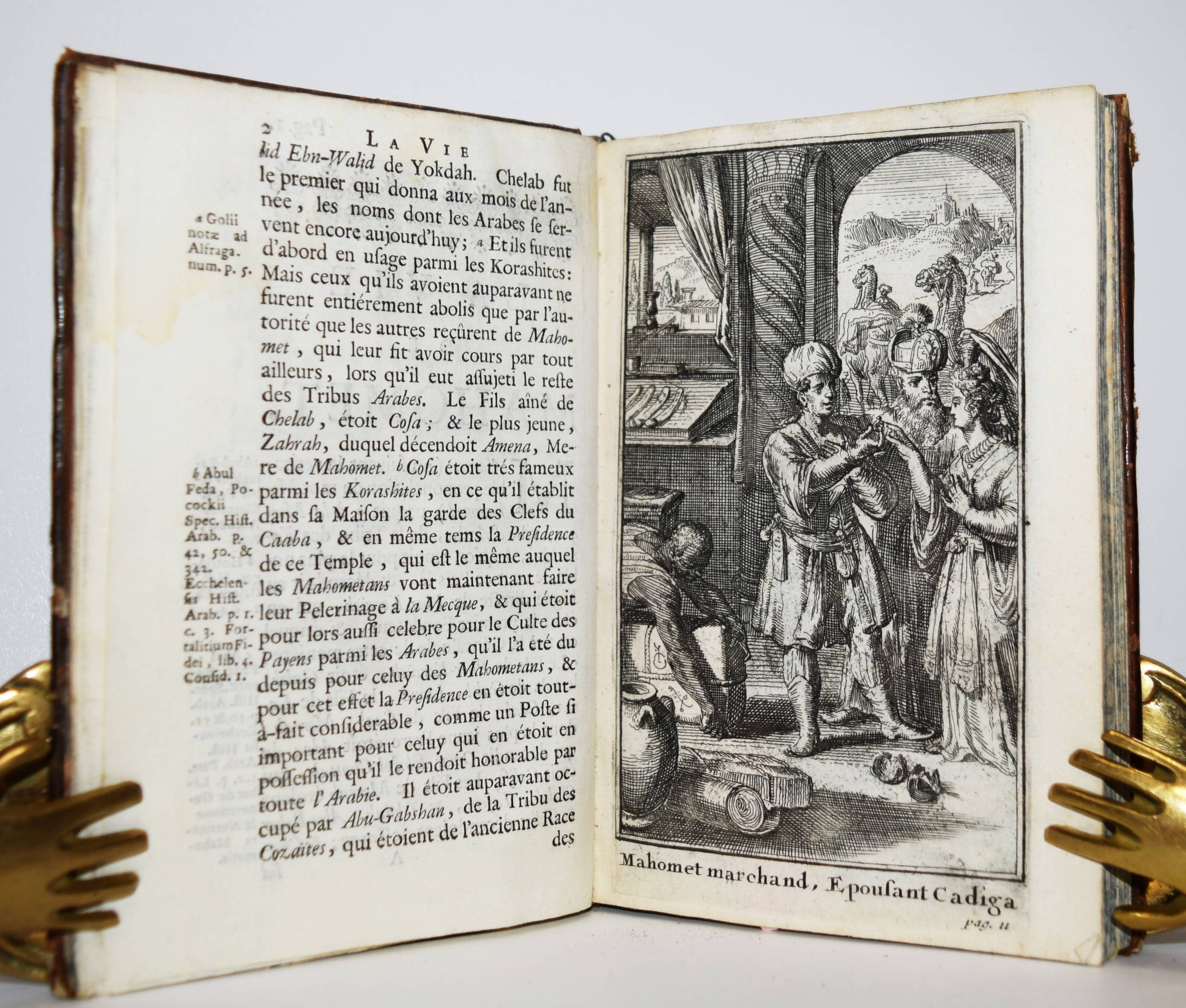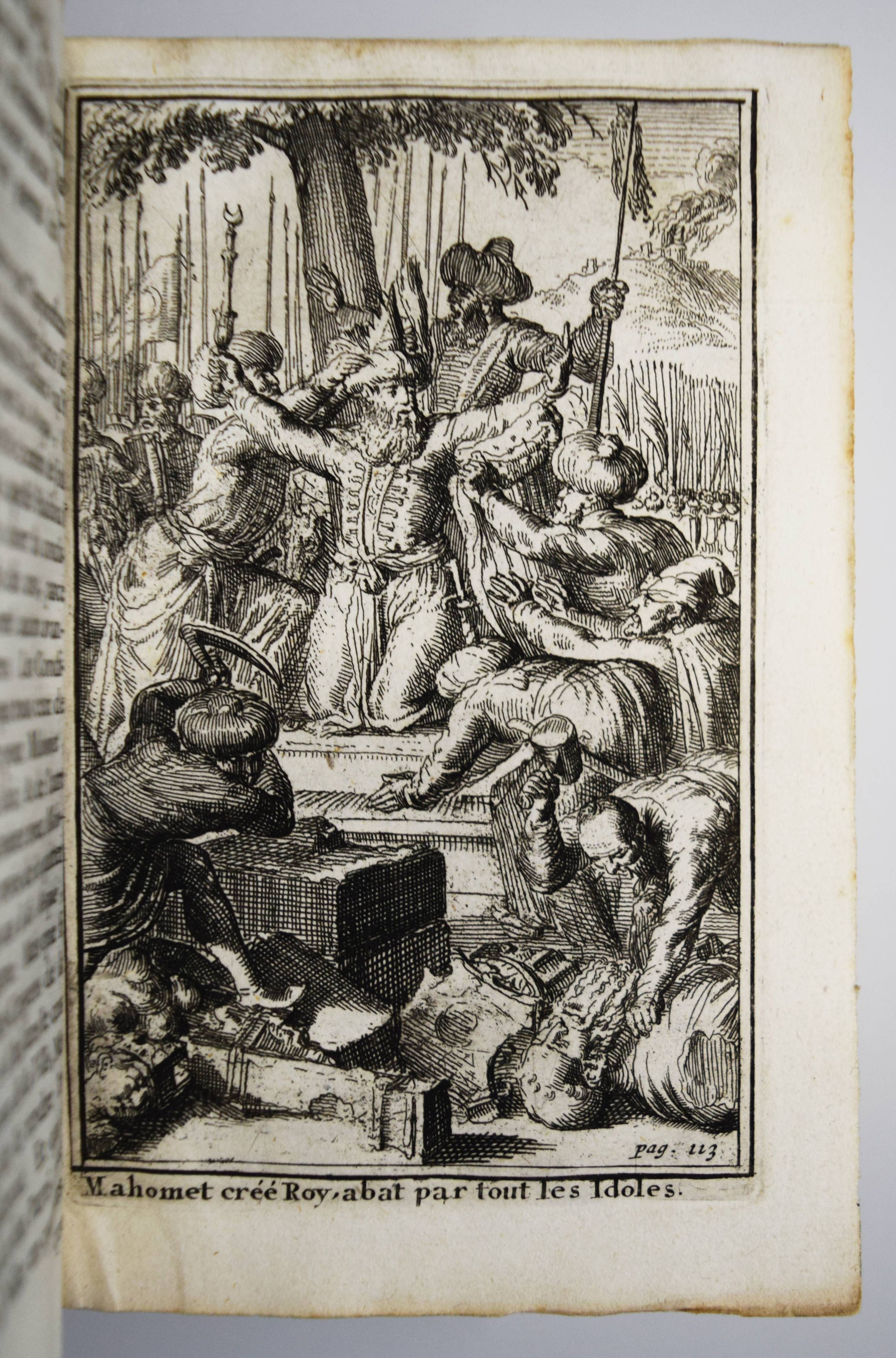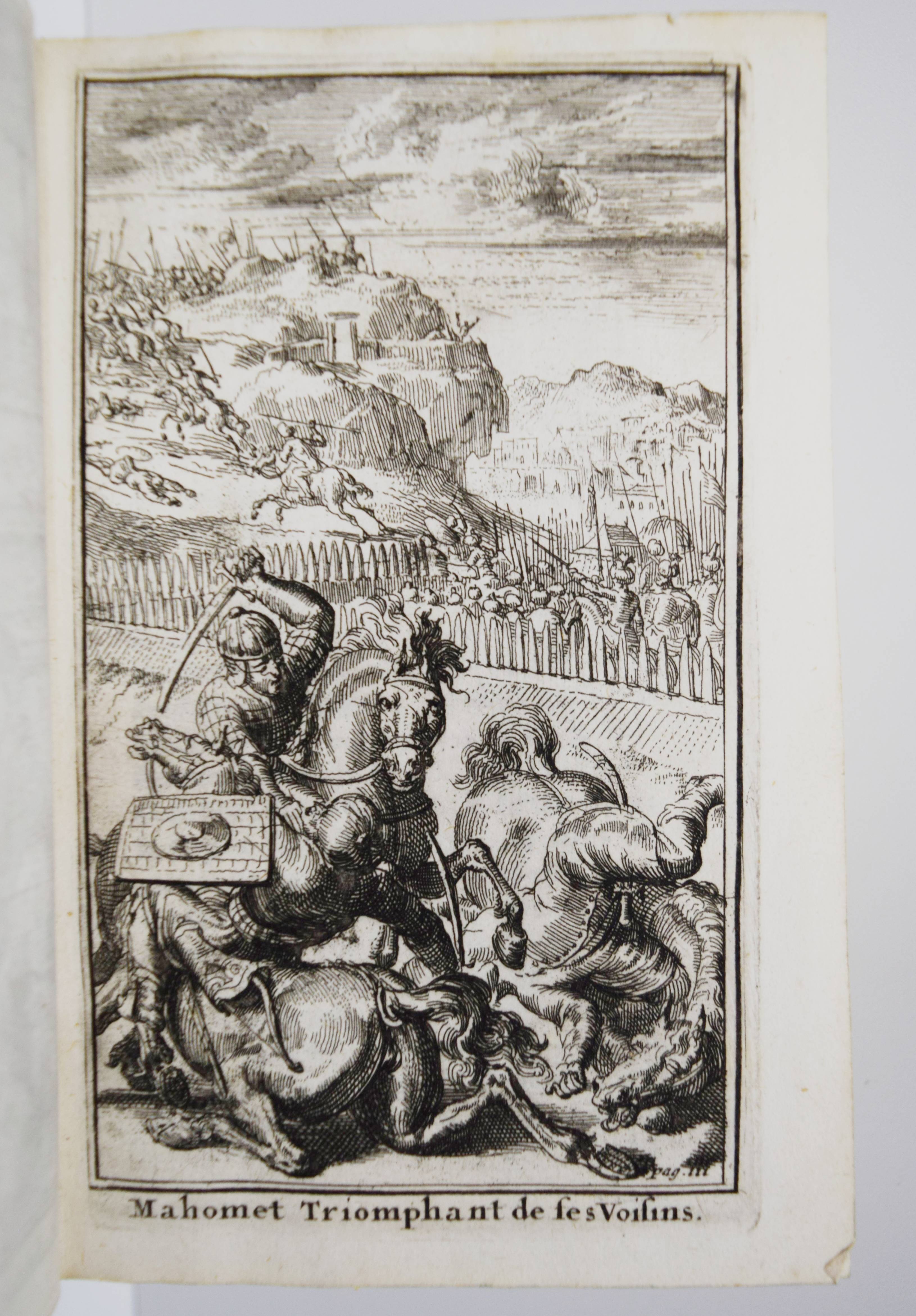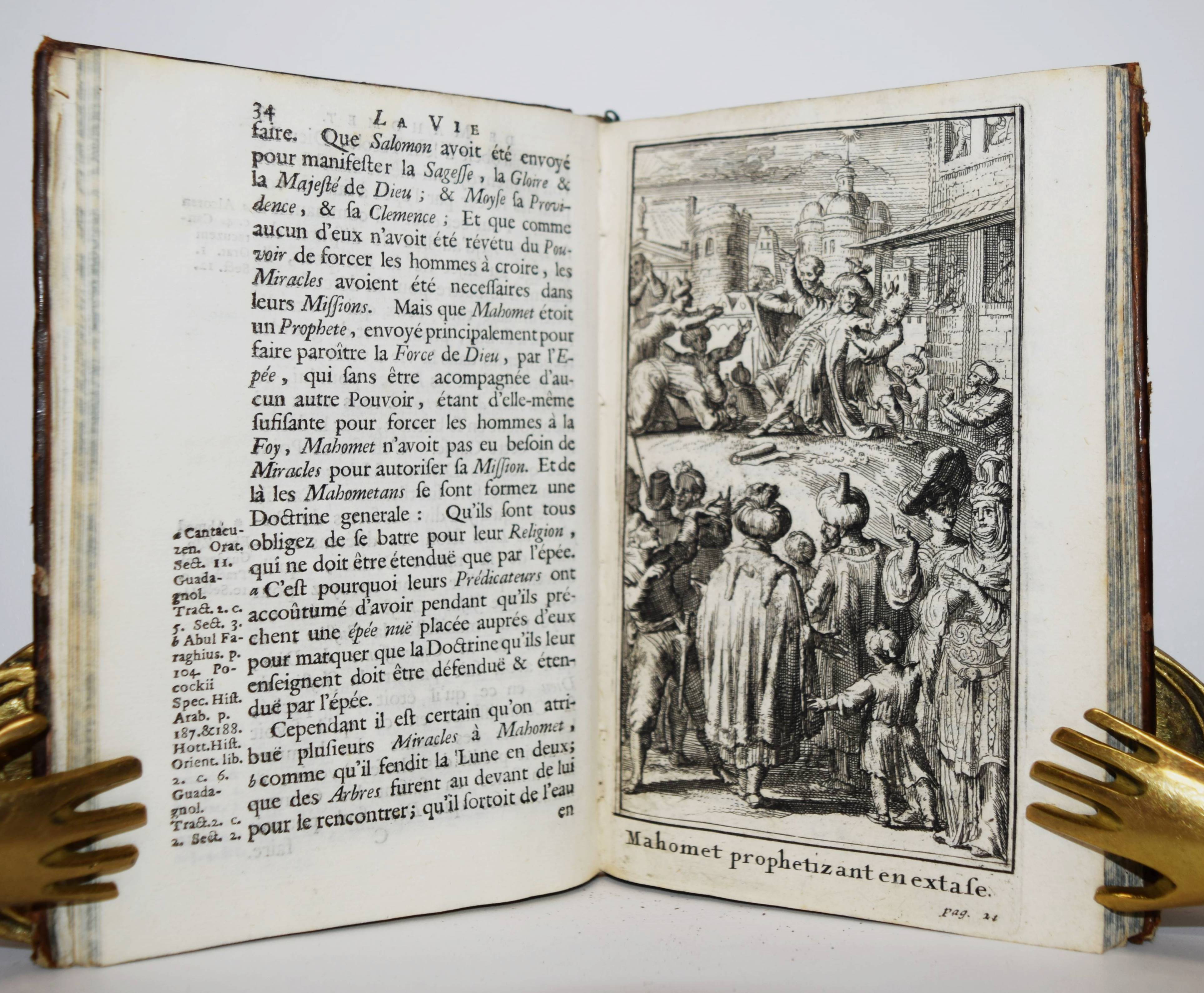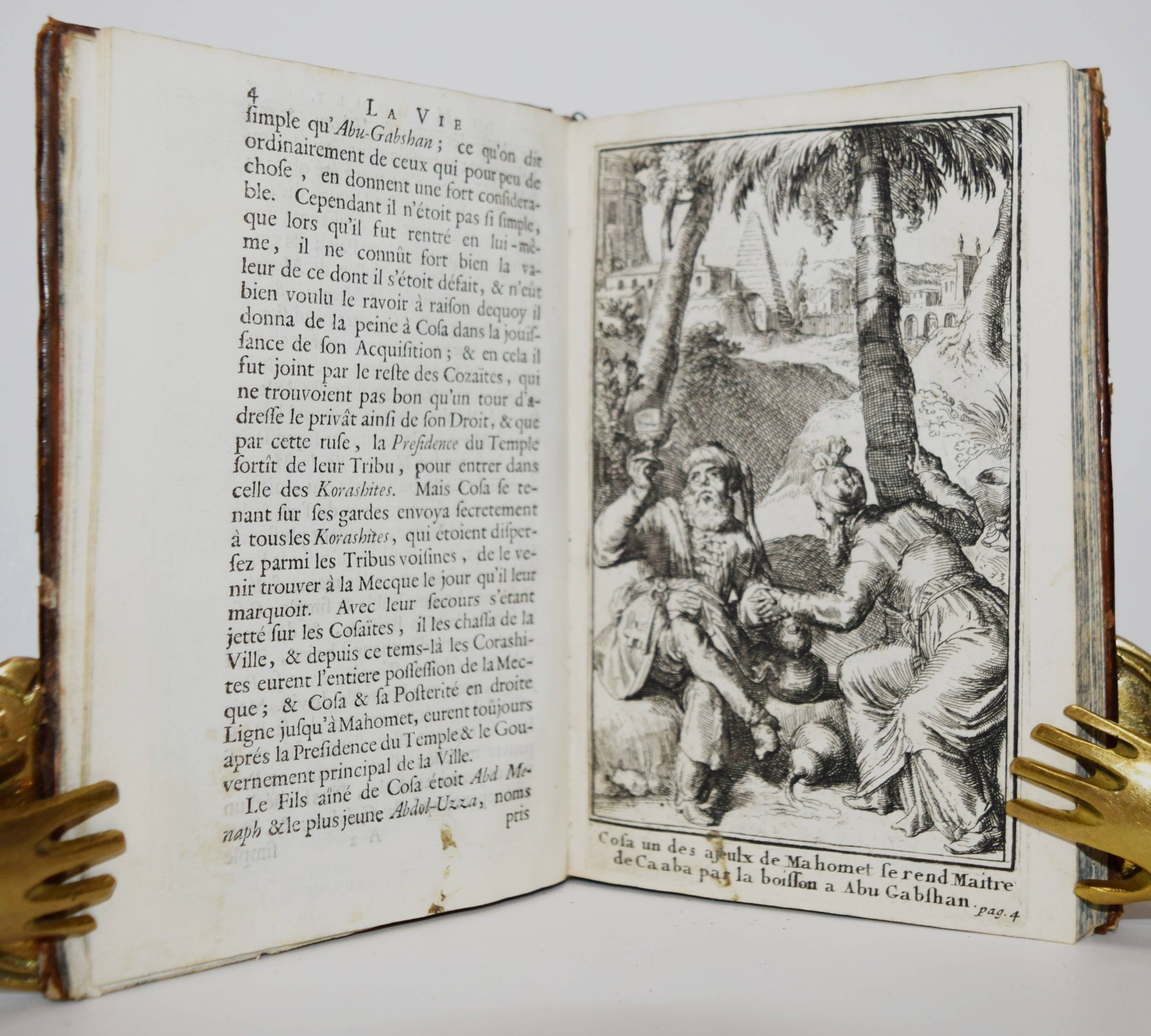 Prideaux, (Humphrey). La vie de Mahomet, où l’on découvre amplement la vérité de l’imposture. Enrichie de figures en taille-douces. (Traduit par Daniel Larroque). Amsterdam, George Gallet 1698. Kl.-8° (15 x 10 cm.). [3] Bl., 164 S., [2] Bl. mit Titelblatt in Rot und Schwarz gestoch. Frontispiz und 9 Kupfertafeln im Stil von Romeyn de Hooghe. Kalbslederband der Zeit mit goldgepr. Rückenschild und floraler Rückenvergoldung. Brunet, VI, 28001. Chahine, Bibliographie du Levant 3859. – Erste französische Ausgabe. Die britische Originalausgabe erschien 1697. – „The Life of Mahomet was in fact printed as a polemical tract against the deists. As a biography it is valueless from the point of view of moderne knowledge. Some of its error were noted by Sale in the discourse and notes to his translation of the Koran 1734. Prideaux had thought of writing a history of the Saracen empire but turned insted for his next historical subject to th interval between the Old and the New testament“ (Dict. of Nat. Biogr. XLV, 352). – Der britische Theologe und Orientalist Humphrey Prideaux (1648-1724) beruft sich in dem vorliegenden Werk auf die Studien des bedeutenden Orientalisten und Bibelforschers Edward Pococke (1604-1691), der eine Sammlung von über 400 orientalischen Manuskripten besaß. – Stempel auf dem Vorsatz, sehr gutes sauberes und dekorativ gebundenes Exemplar.