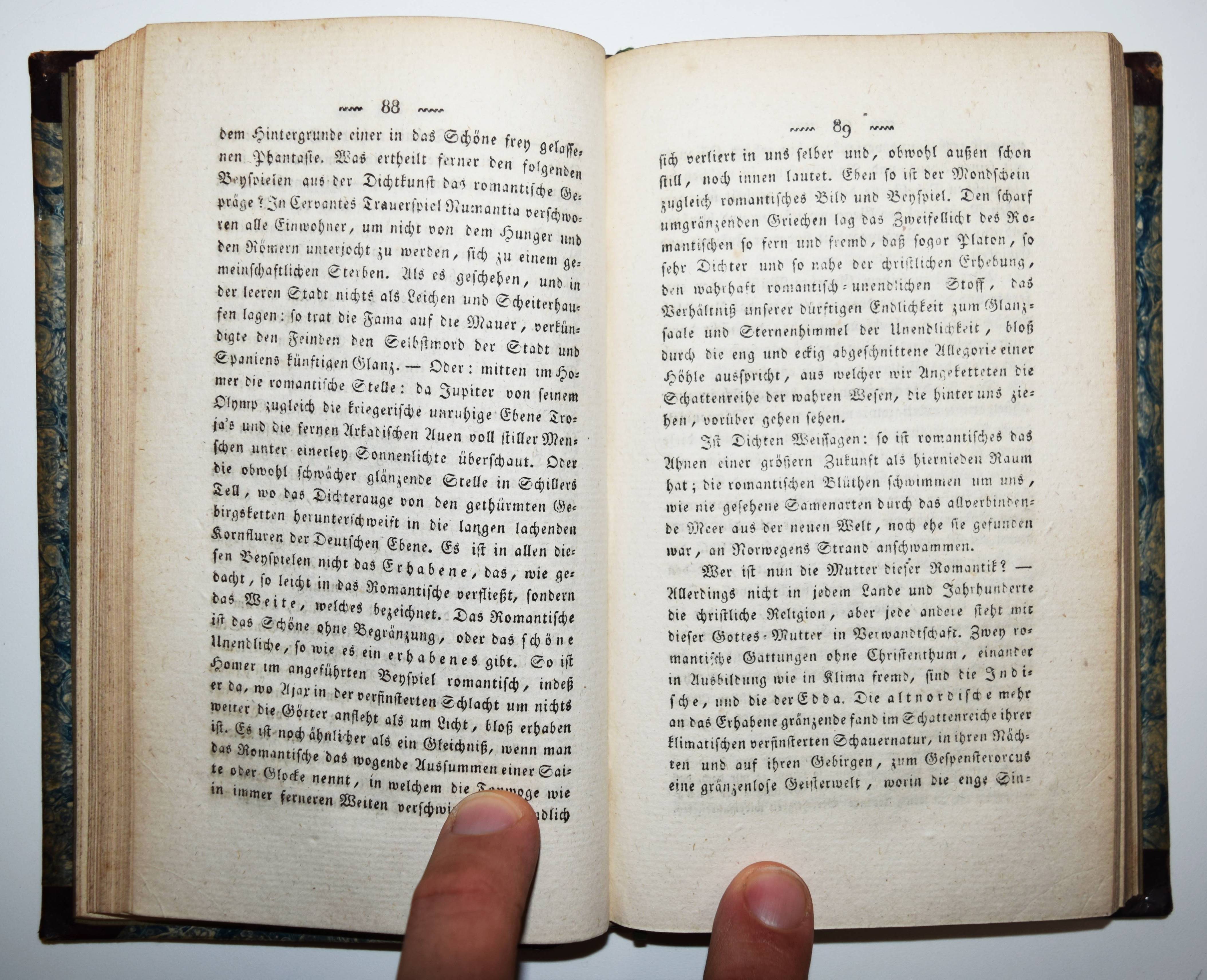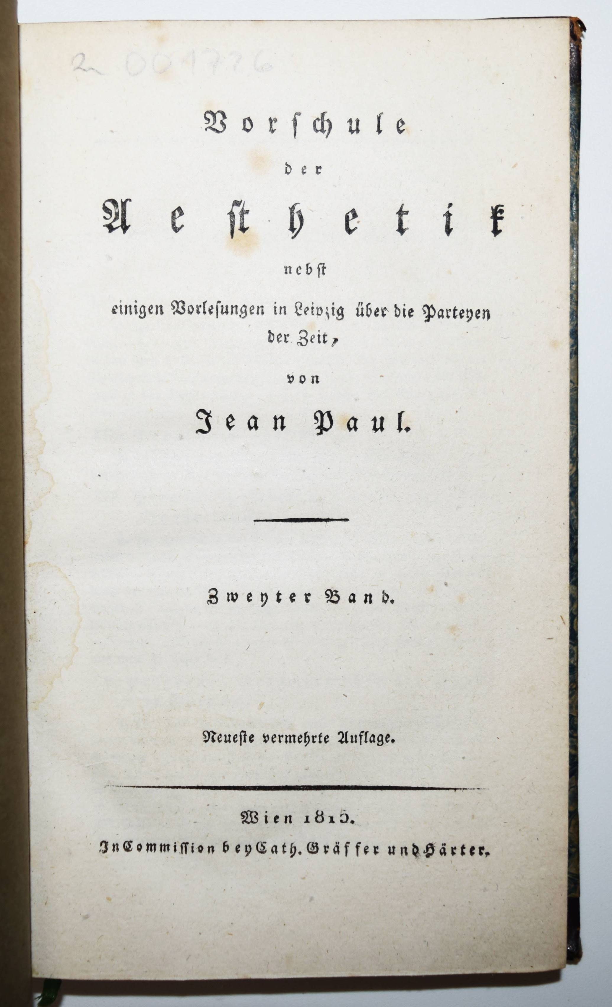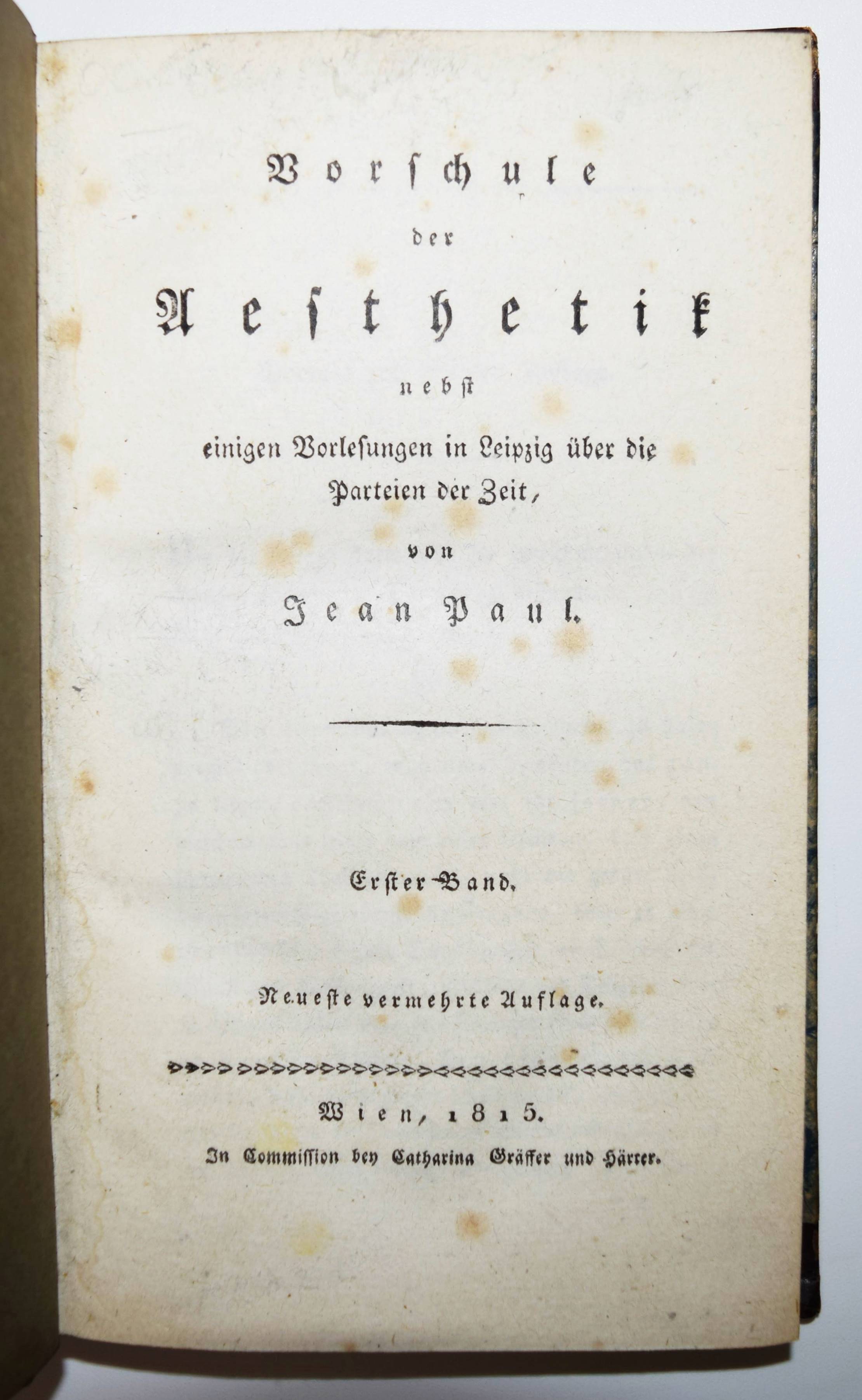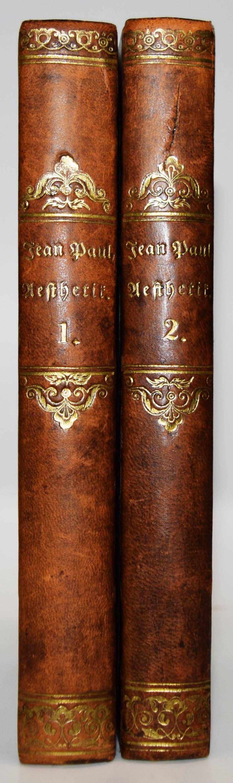 Jean Paul (d. i. Johann Paul Friedrich Richter). Vorschule der Aesthetik. Nebst einigen Vorlesungen in Leipzig über die Parteien der Zeit. Neueste vermehrte Auflage. 2 Bände. Wien, Gräffer & Härter 1815. 8°. XXXII, 318 S.; [2] Bl., 299 S. Halblederbände der Zeit mit goldgepr. Rückentitel und Rückenvergoldung. Vgl. Berend 18 b. und Goed. V, 465, 18. – Wiener Nachdruck der erweiterten zweiten Auflage des zuerst 1804 erschienenen Werkes. – Einband etwas berieben, Exlibris, stellenweise leicht braunfleckig, gutes dekorativ gebundenes Exemplar.