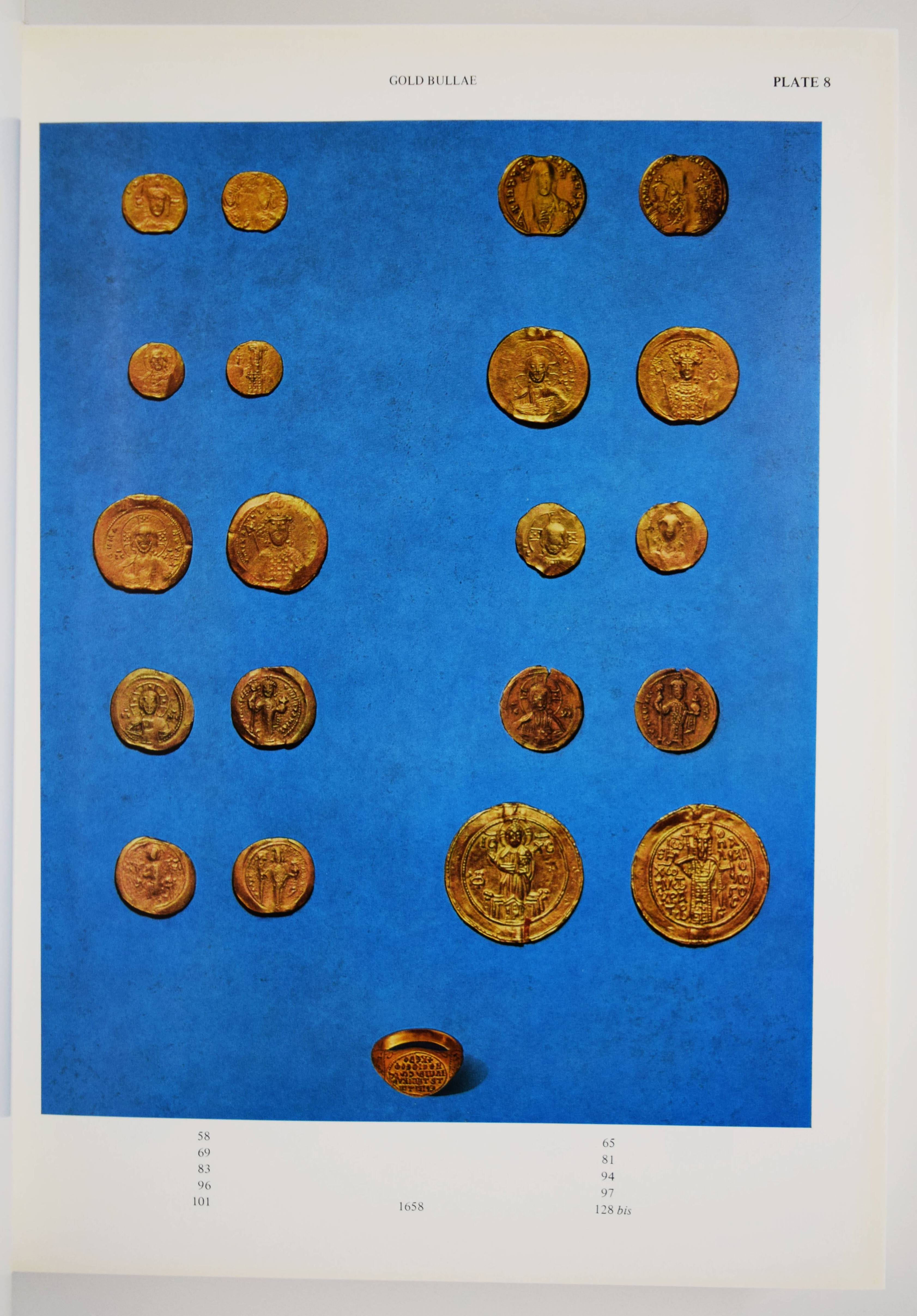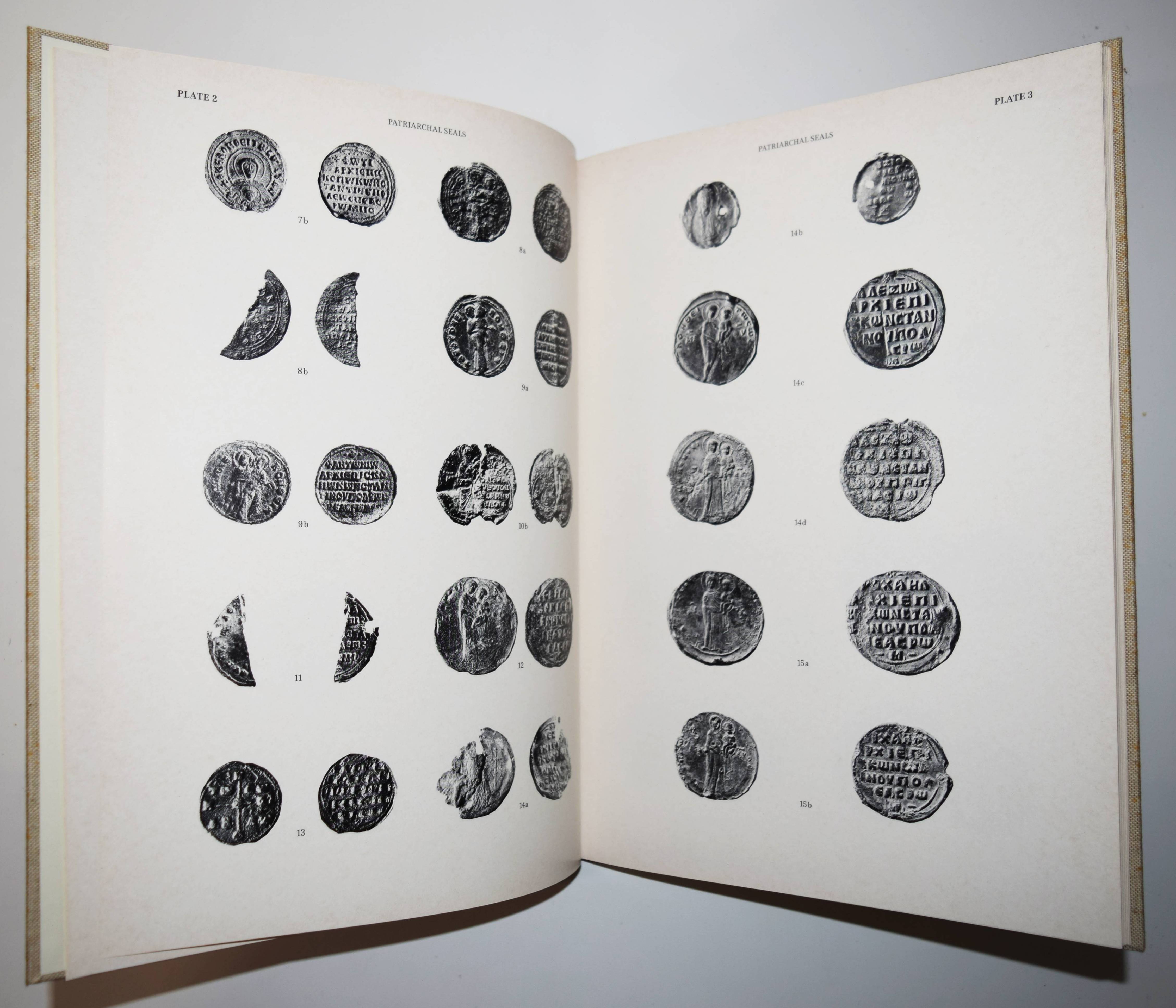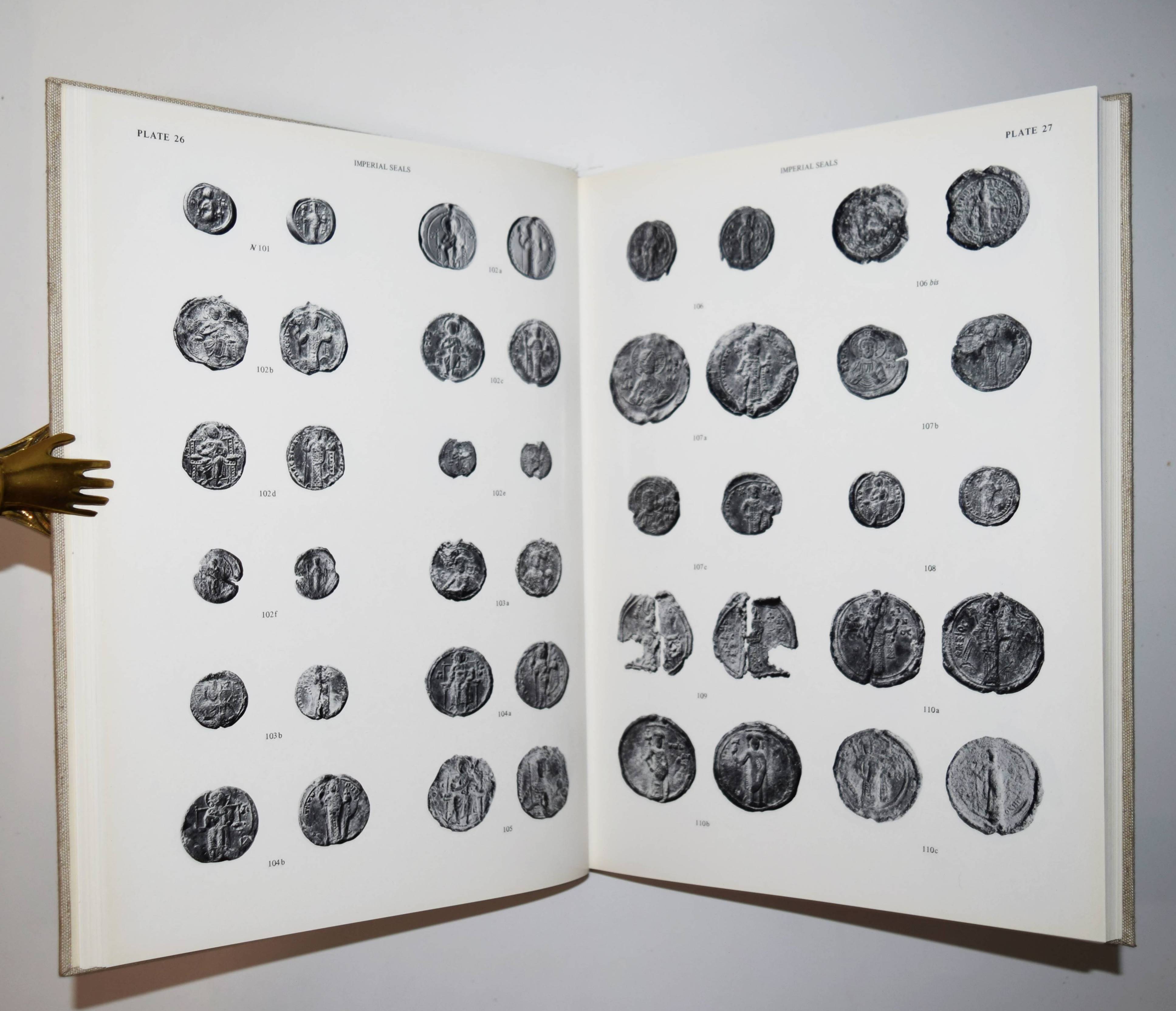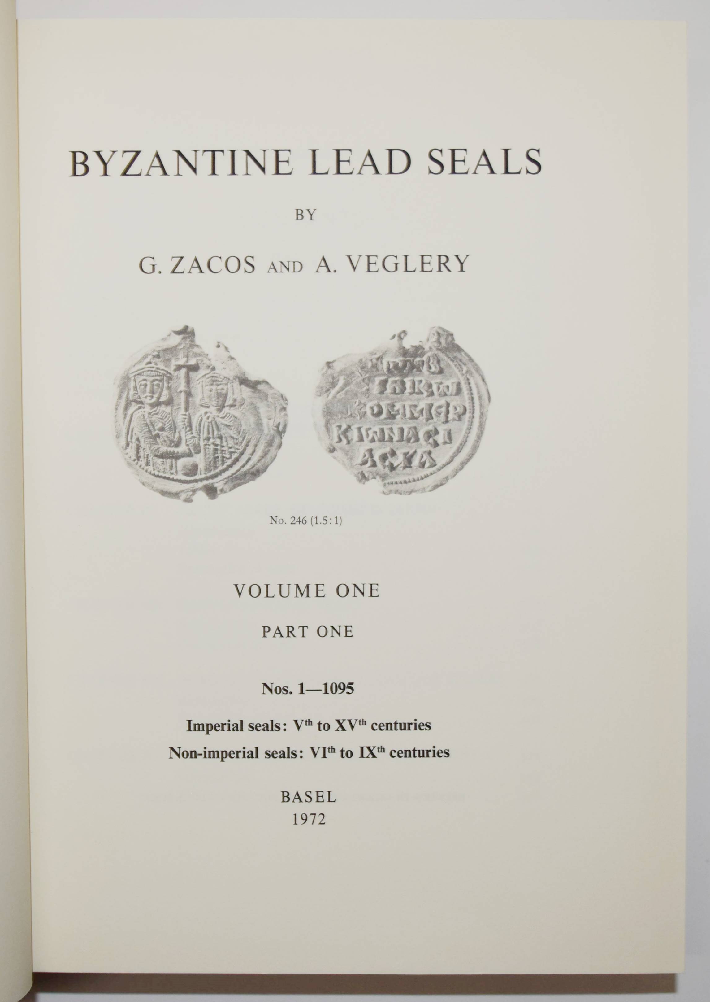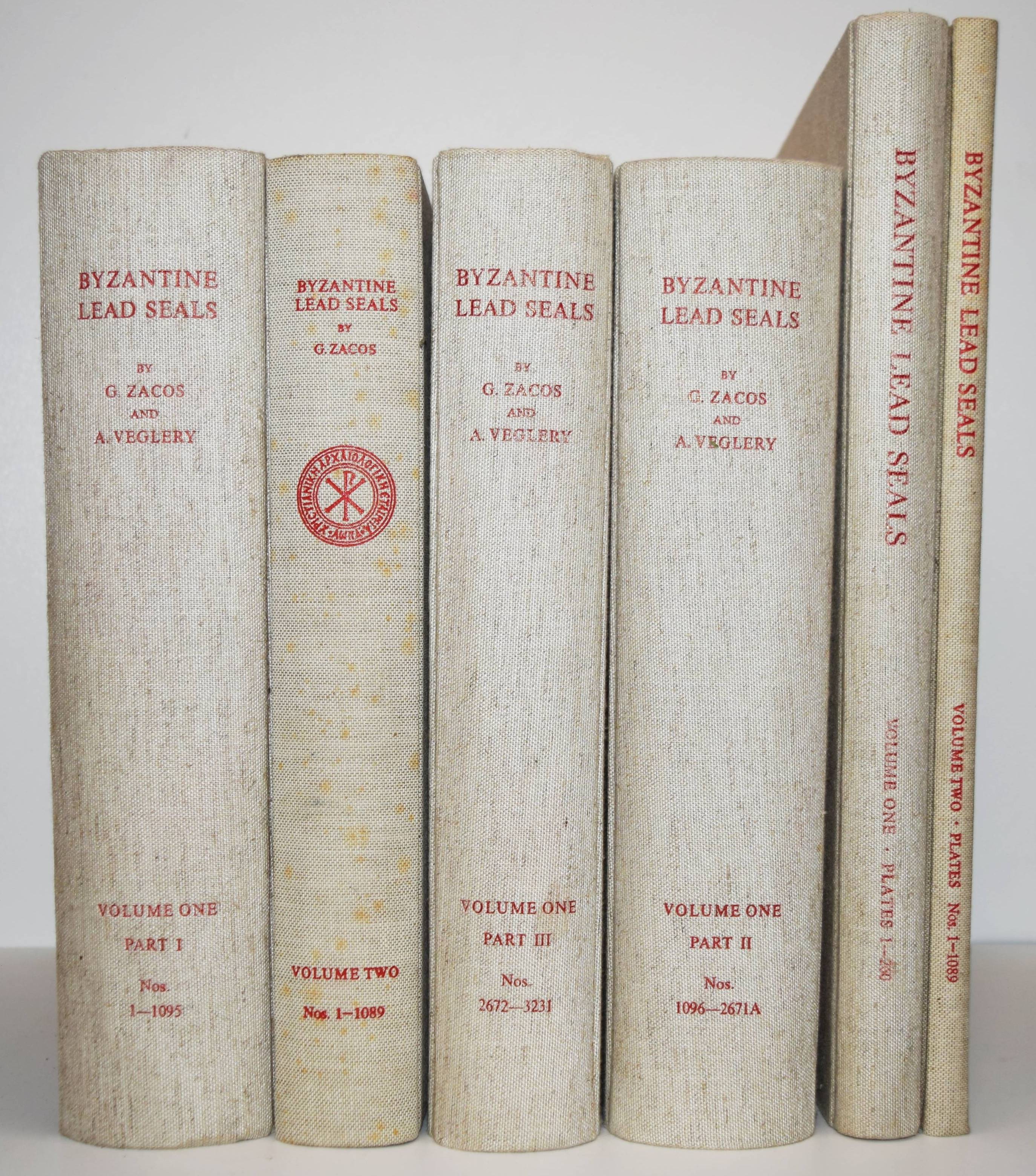 Zacos, G(eorge) and A. Veglery. Byzantine lead seals. Volume one, part I-III and plates. (And) Volume two and plates. Zus. 6 Bände (4 Text und 2 Tafelbände). Basel und Bern, Benteli Publishers 1972-1984. 4° (30 x 23 cm.) und Folio (35 x 26,5 cm.). Mit zahlr. Abbildungen auf 360 Tafeln. Orig.-Leinenbände. Part I: Nos. 1-1095 – Imperial seals: V to XV centuries; Non-imperial seals: VI to IX centuries. – Part 2: Nos. 1096-2671A – Non-imperial seals: VI to IX centuries. Part 3: Nos. 2672-3231 – Imperial and allied seals: V to XIV centuries; Non-imperial seals: VI to IX centuries. – Sehr gutes Exemplar des Standardwerks, vollständig mit den Tafelbänden selten.