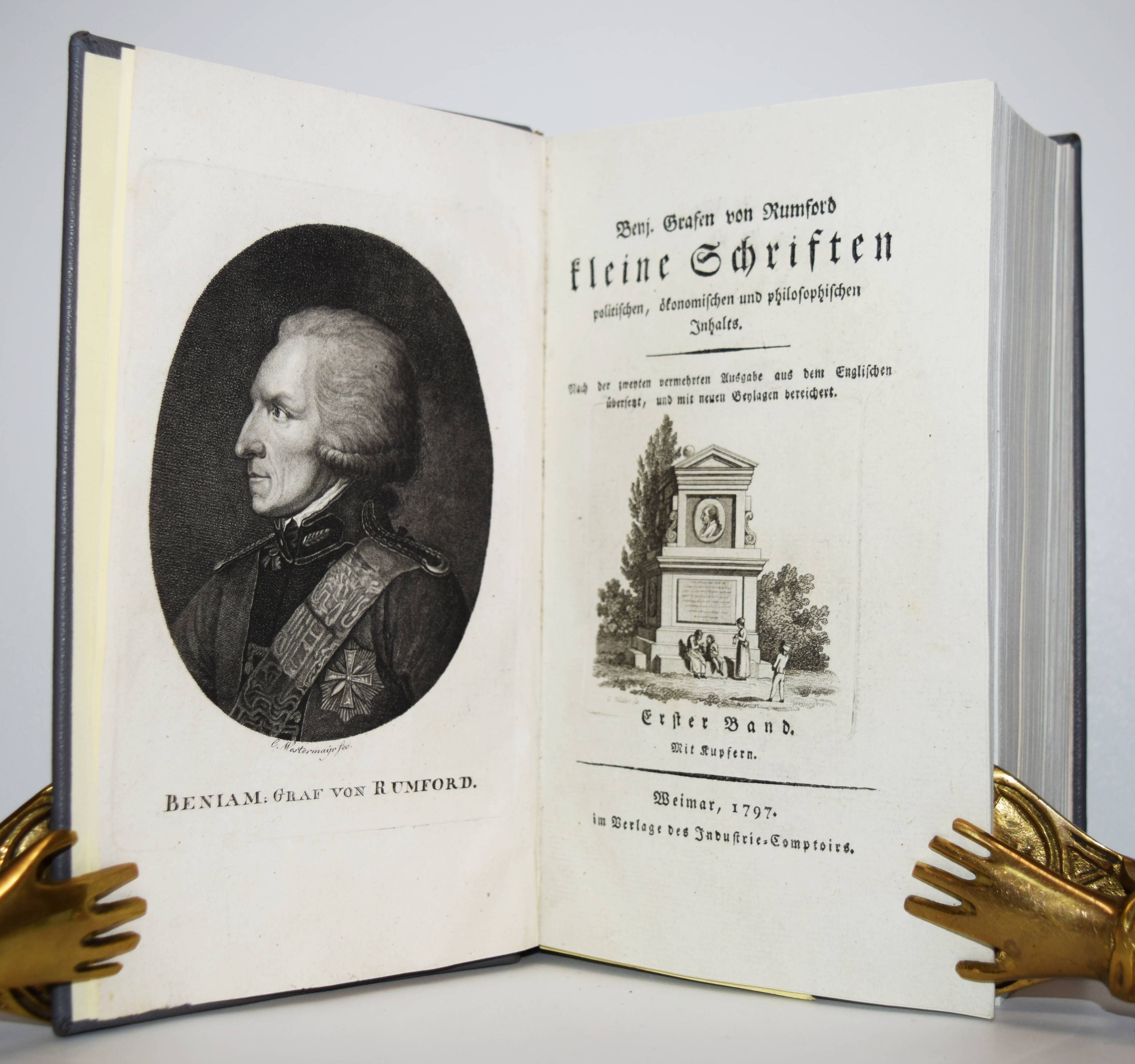 Rumford, Benj(amin) (Thompson) v. Kleine Schriften politischen, ökonomischen und philosophischen Inhalts. Nach der zweyten vermehrten Ausgabe aus dem Englischen übersetzt, und mit neuen Beylagen bereichert. Erster Band (von 5). Weimar, Verlag des Industrie-Comptoirs 1797. 8°. Gestoch. Frontispiz, XX, 484 S. mit gestoch. Titelvignette und 2 gestoch. Vignetten im Text, [61] teils gefalt. Bl. (Tabellen) und 4 gefalt. Kupfertafeln. Moderner Lederband mit goldgepr. Rückenschild und Rückenvergoldung. Horn/Arndt 329. Humpert 13112. Poggendorff II, 718. VD18 80438776. Slg. Walterspiel 438. – Erste Ausgabe des ersten Teils der Sammlung überwiegend technologischer und physikalischer Schriften des amerikanischen Physikers, der etwa die Hälfte seines Lebens im bayerischen Staats- und Militärdienst verbrachte. Er führte die Kartoffel in Bayern ein, gründete fortschrittliche Armenhäuser, reorganisierte das Heer und legte den Englischen Garten in München an. – Im vorliegenden Band berichtet Rumford von der Einrichtung „einer Armen-Anstalt zu München“, „Von der in Bayern herrschenden Betteley zu der Zeit, als die Maasregeln zu deren Abschaffung im Werke waren“ etc. – „Ueber die allgemeinen Grundsätze, welche allgemeine Armen-Anstalten in allen andern Ländern gebauet werden müssen“ – „Ueber Speiße und verzüglich über Beköstigung der Armen“ – „Ueber Camin-Feuerheerde, nebst Vorschlägen zur Verbeßerung, derselben, um Brennstoff zu spahren, die Wohnhäuser angenehmer und gesünder zu machen und das Rauchen der Schornsteine ganz zu verhüthen“ – „Kurze Nachrichten von verschiedenen neuerlich in Bayern gemachten nützlichen öffentlichen Anstalten“. – Sehr gutes sauberes und dekorativ gebundenes Exemplar.