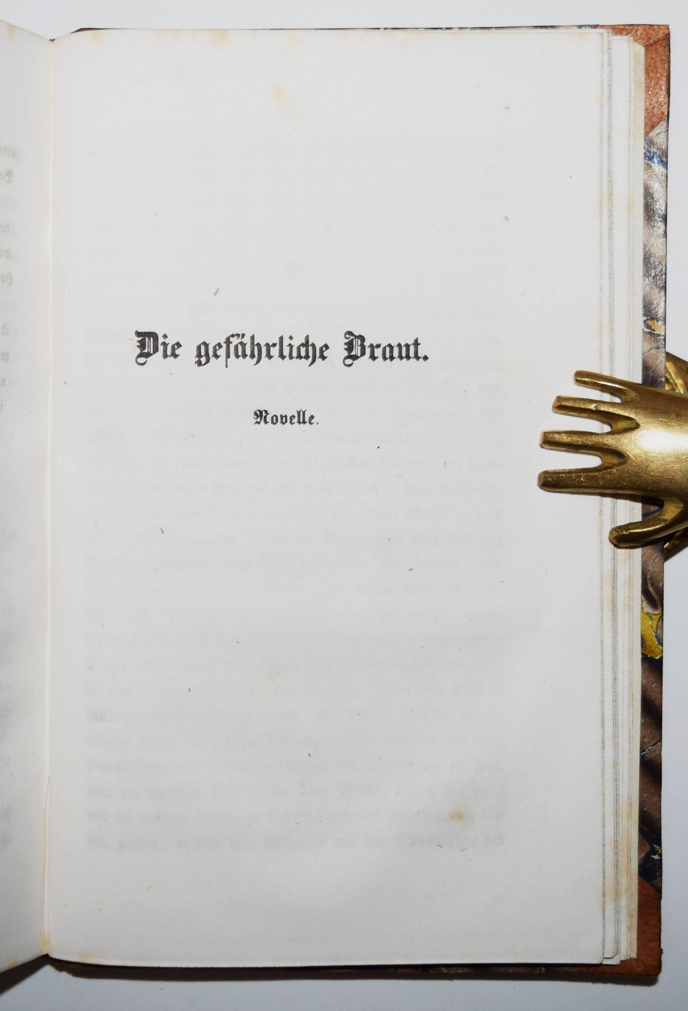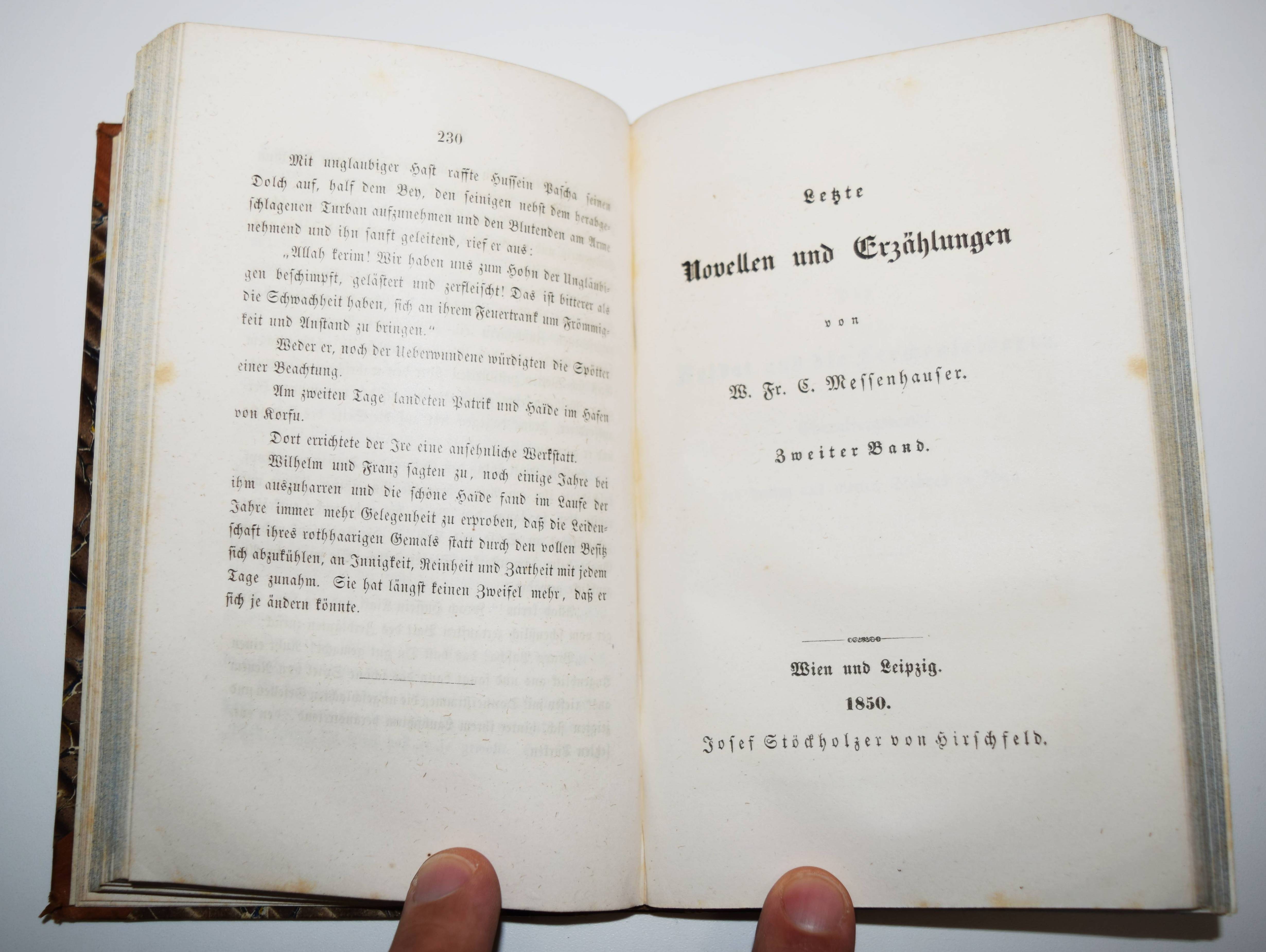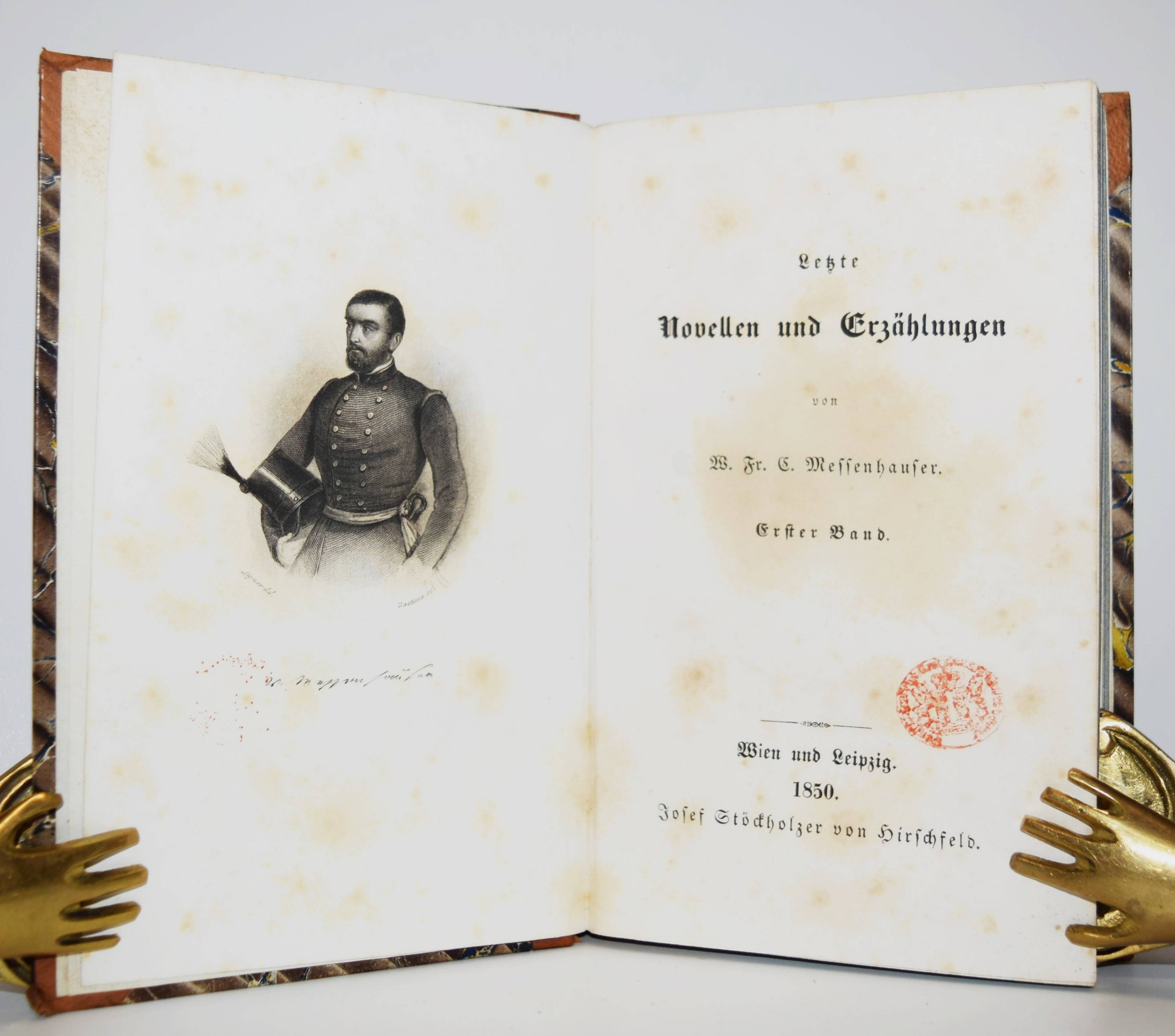 Messenhauser, W(enzel) Fr(iedrich) C(äsar). Letzte Novellen und Erzählungen. 2 Teile in 1 Band. Wien und Leipzig, Josef Stöckholzer von Hirschfeld 1850. 8°. 230 S.; 204 S. mit gestoch. Frontispiz. Halblederband der Zeit mit goldgepr. Rückentitel und Rückenvergoldung. NDB XVII, 214. – Erste Ausgabe. – Der Wiener Schriftsteller W. F. C. Messenhauser (1813-1848) war „seit 1845 Oberleutnant … (und) 1847 in Lemberg stationiert. Dort wurde er 1848 von der Bürgerschaft in das Komitee zur Errichtung einer Nationalgarde gewählt, wobei seine politischen Äußerungen zu seiner Versetzung nach Wien und einer Arreststrafe von drei Tagen führten. Daraufhin quittierte M. den Dienst (28.4.1848) und widmete sich während der folgenden Monate unter dem Namen „Cäsar“ ausschließlich seiner schriftstellerischen Tätigkeit. In diese Zeit fällt auch die Herausgabe seiner Zeitschrift „Die Volkstribüne“, die jedoch nach der vierten Nummer wieder eingestellt wurde. Bisher kaum am Revolutionstreiben beteiligt, wurde M. am 12.10.1848 ohne sein Zutun zum provisorischen Oberkommandanten der Wiener Nationalgarde gewählt, wobei er als Mittler zwischen der radikalen und der gemäßigten Partei Wiens bald zwischen beide Fronten geriet. Nachdem er am 28.10.1848 in einer Kommandantenversammlung aufgrund der aussichtslosen Lage die Kapitulation der Stadt durchgesetzt hatte, wollten die unter seinem Kommando stehenden Wiener bei Bekanntwerden des Anrückens der ungar. Armee den Kampf erneut aufnehmen. M. legte daraufhin sein Oberkommando nieder, wurde aber von der radikalen Menge zur Wiederaufnahme der Kampfhandlungen gezwungen. Nach der Einnahme der Stadt Wien durch Windischgrätz am 31.10.1848 verweigerte M. trotz der Ratschläge seiner Freunde in völliger Verkennung seiner Lage die Flucht und stellte sich nach seiner Proskription am 5. November dem Stadtkommandanten. Die Militärbehörden verurteilten M. trotz vieler Interventionen am 11. November zum Tod“ (K. Dirschmied und H. Grössing in NDB). – Anfangs etwas braunfleckig, gutes dekorativ gebundenes Exemplar aus einer Schloß-Bibliothek.