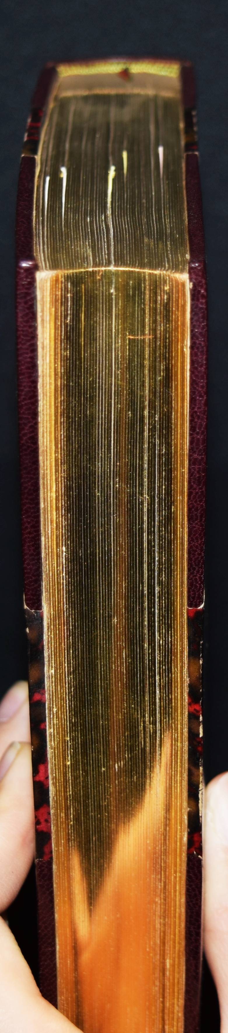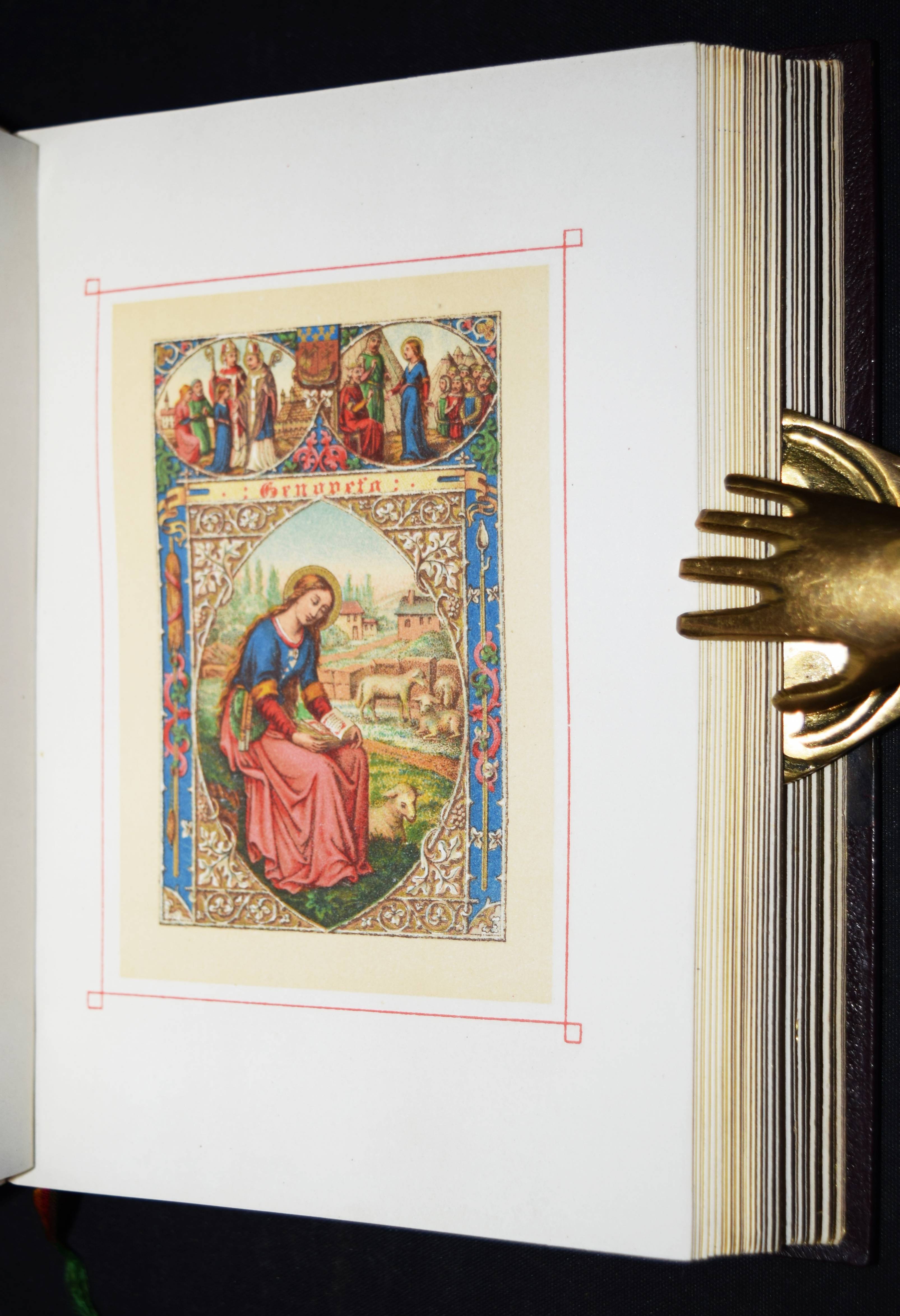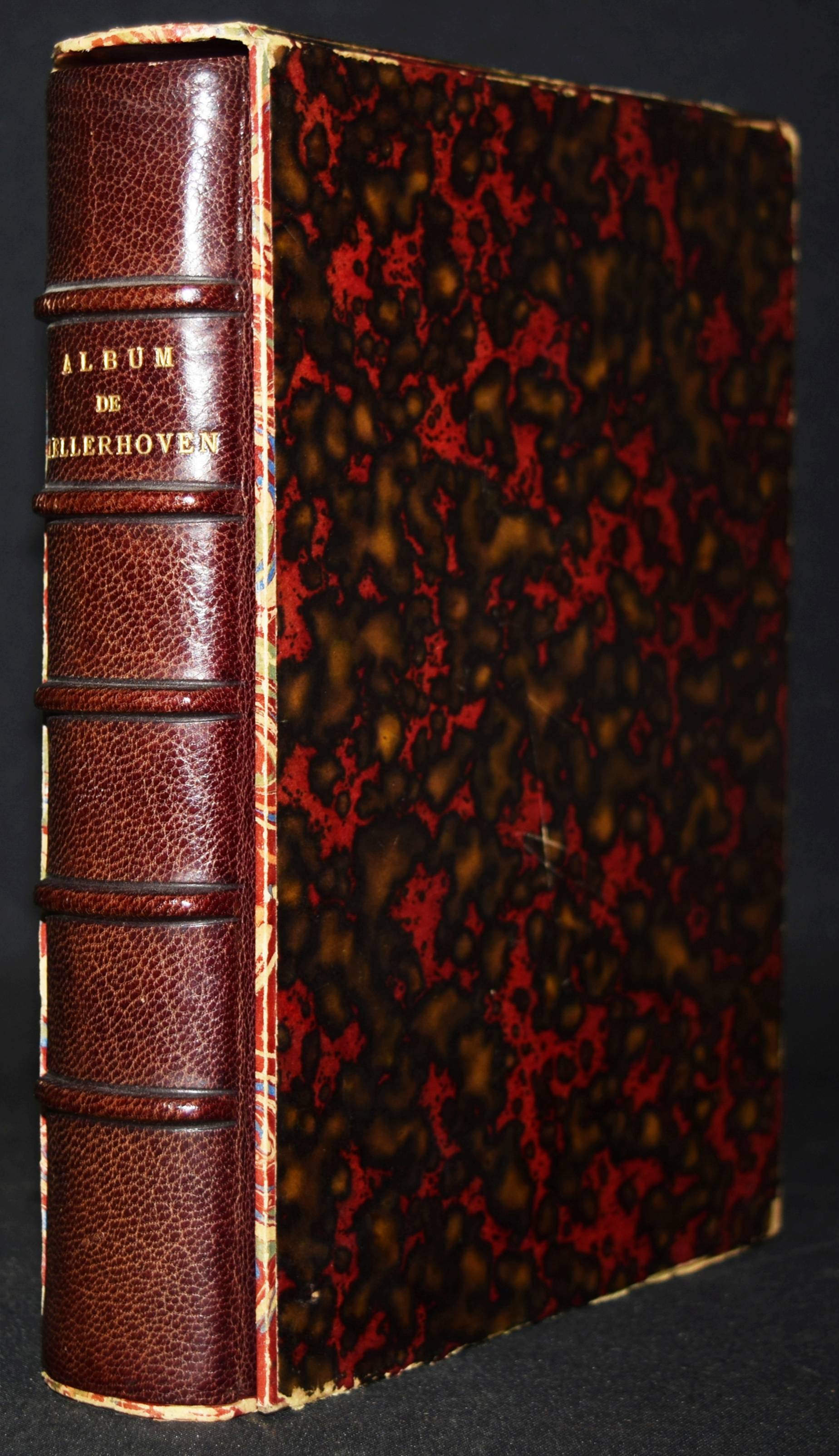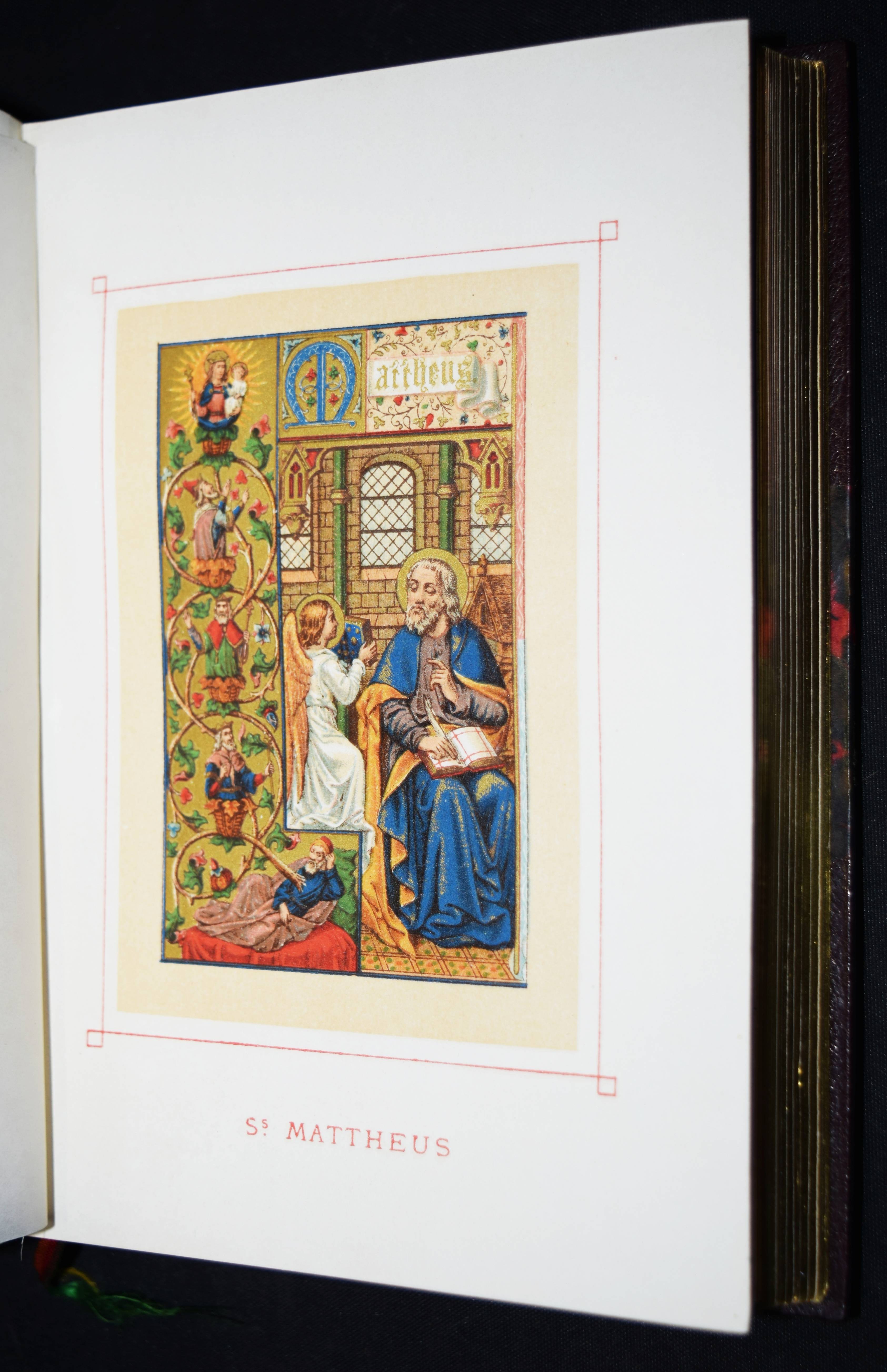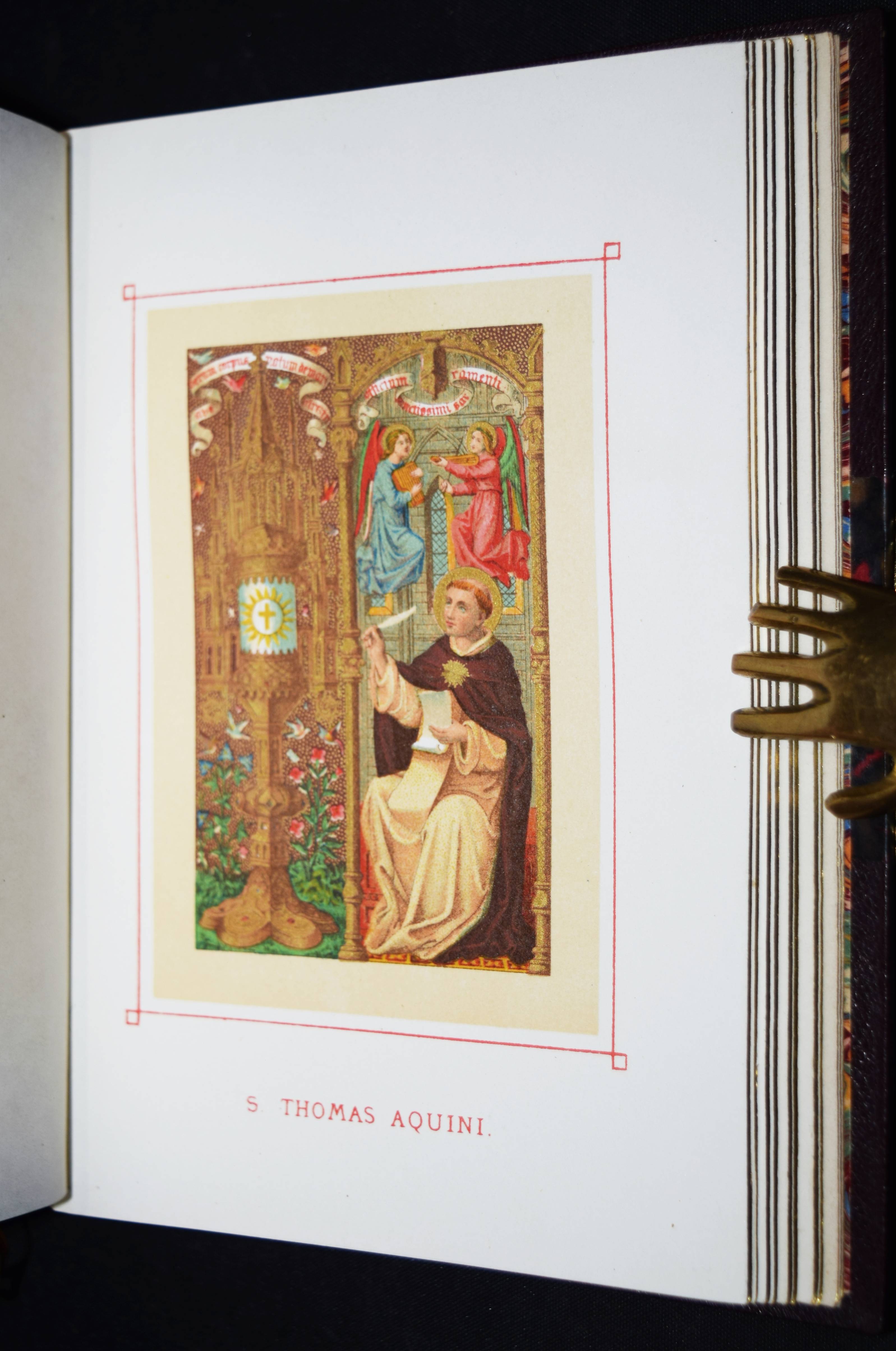 Kellerhoven, (Franz). Album de Kellerhoven. Vie des Saints Illustrée d’après les plus anciens manuscrits. Paris, Gaume et Cie. s. d. (um 1870). 8°. [2] Bl., 48 mont. chromolithogr. Tafeln auf dünnem Karton. Dunkelroter Halblederband der Zeit mit goldgepr. Rückentitel und Goldschnitt und marmoriertem Pappschuber. Mit hervorragenden Portraits berühmter Heiliger nach mittelalterlichen Miniaturen, lithographiert von dem deutschen Graphiker F. Kellerhoven (1814-1872), der seit 1859 in Paris arbeitete. Die dekorativen Chromo-Lithographien wurden von A. Lemercier in Paris gedruckt. – Sehr schönes sauberes und dekorativ gebundenes Exemplar.