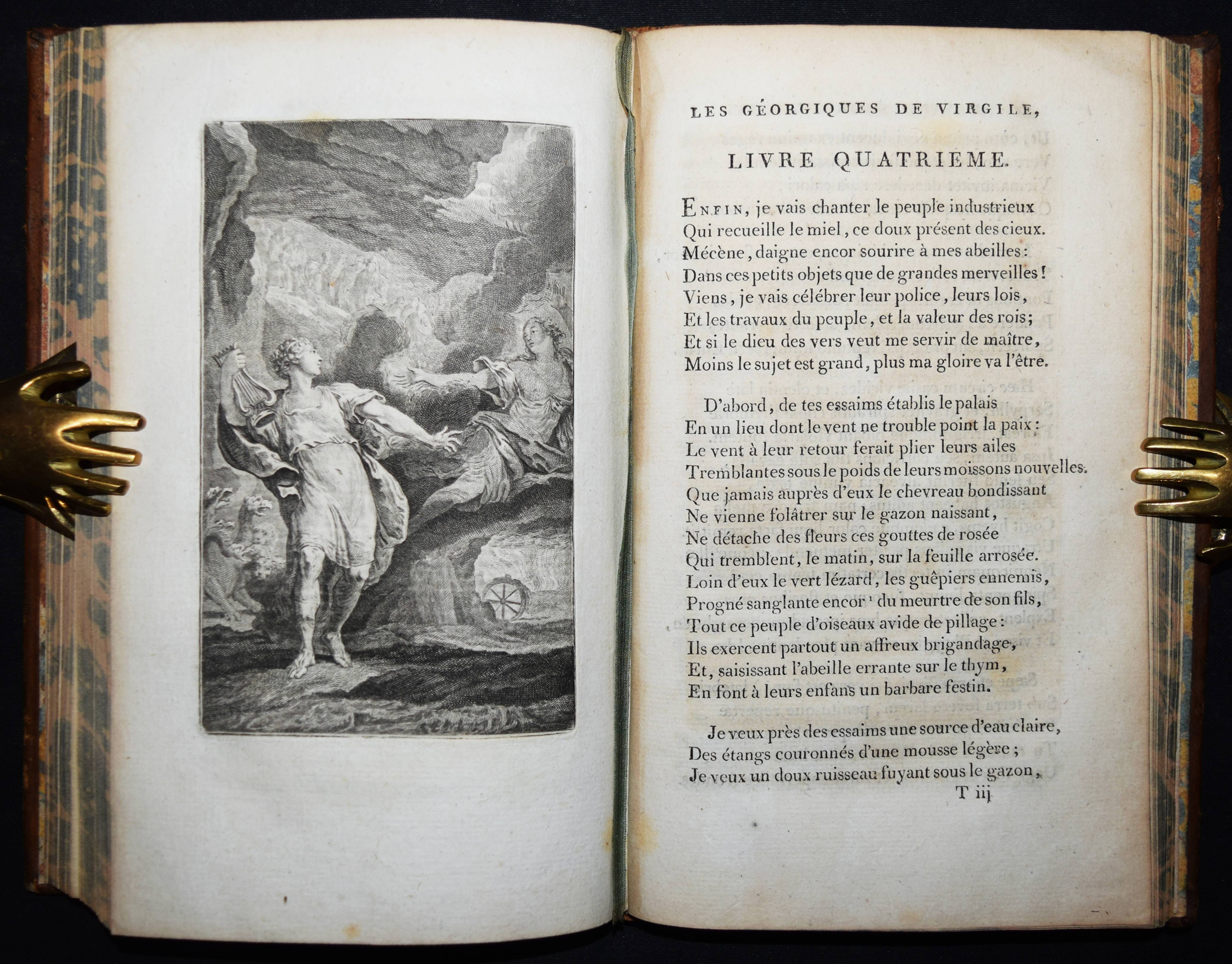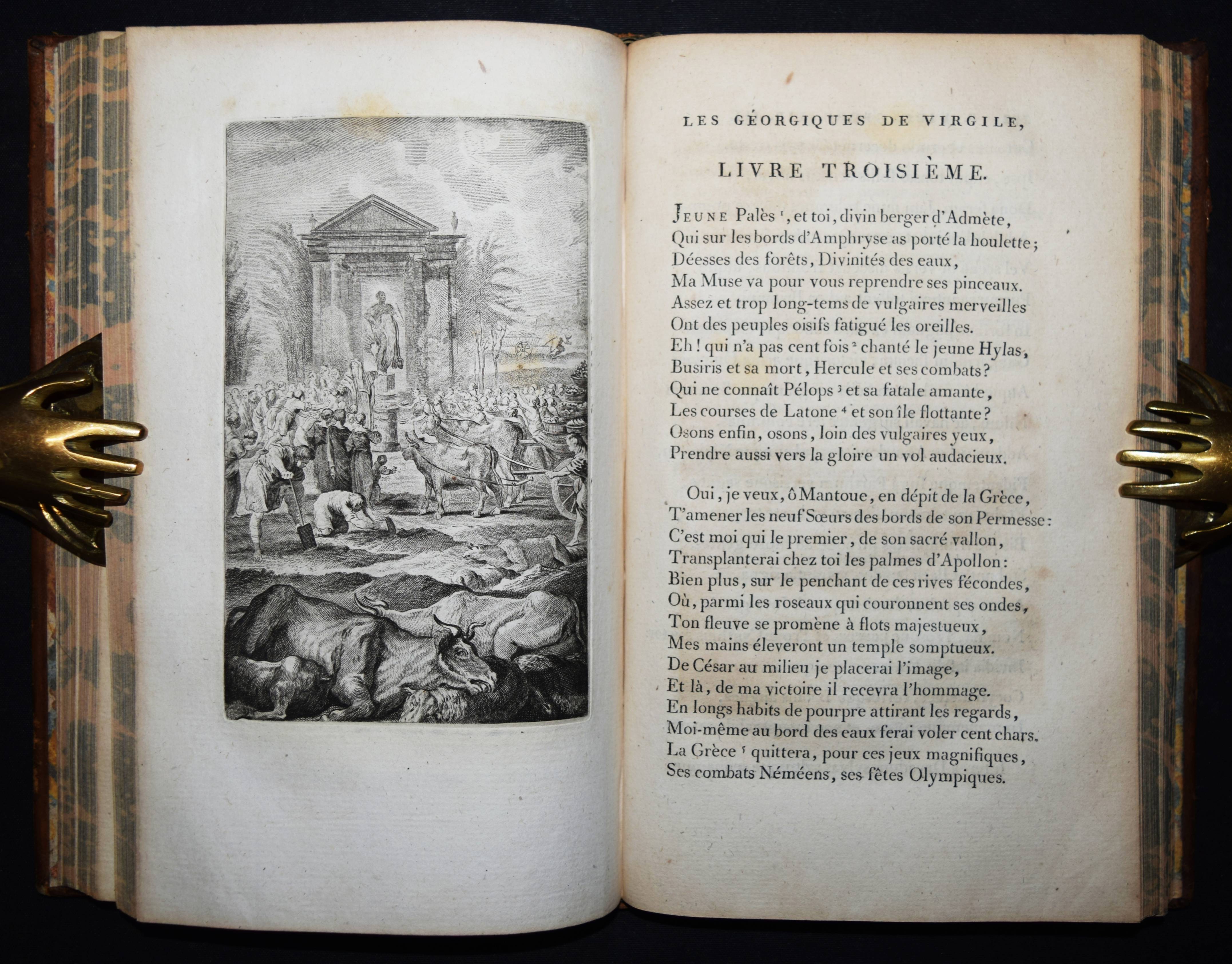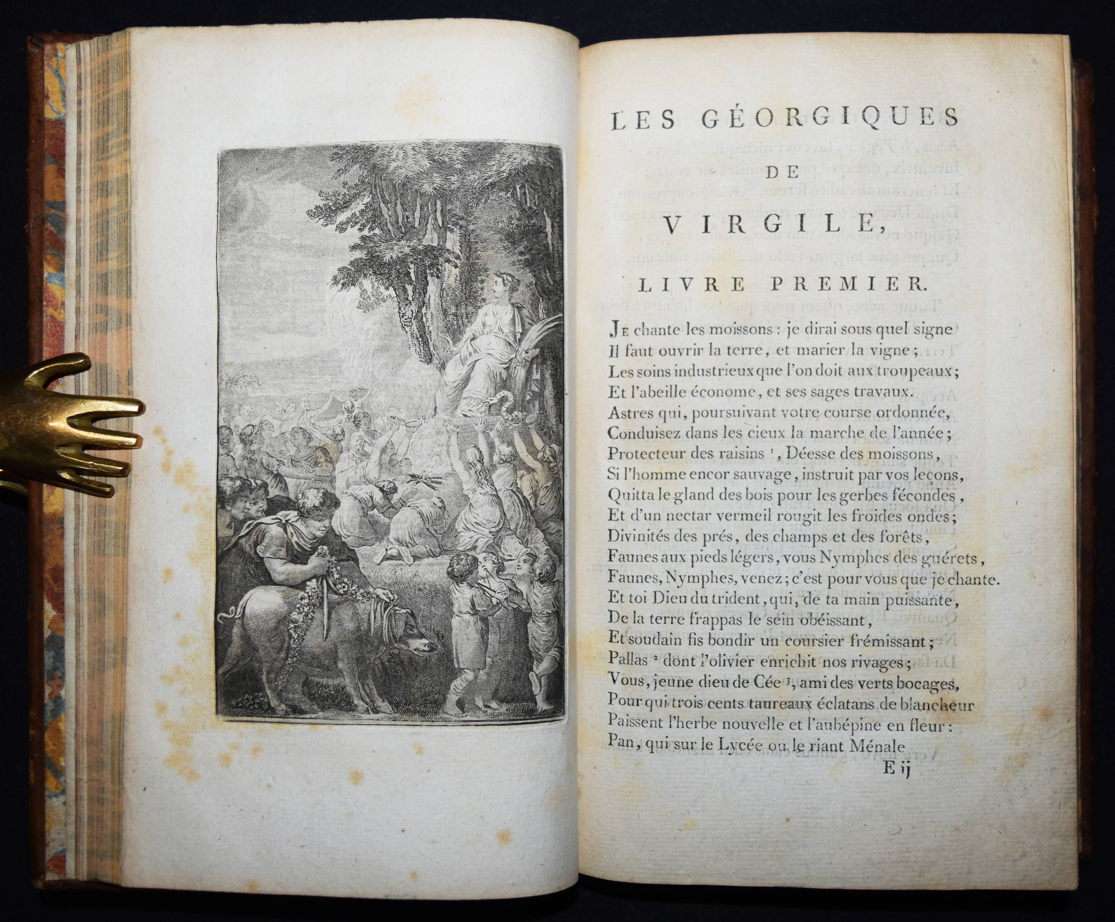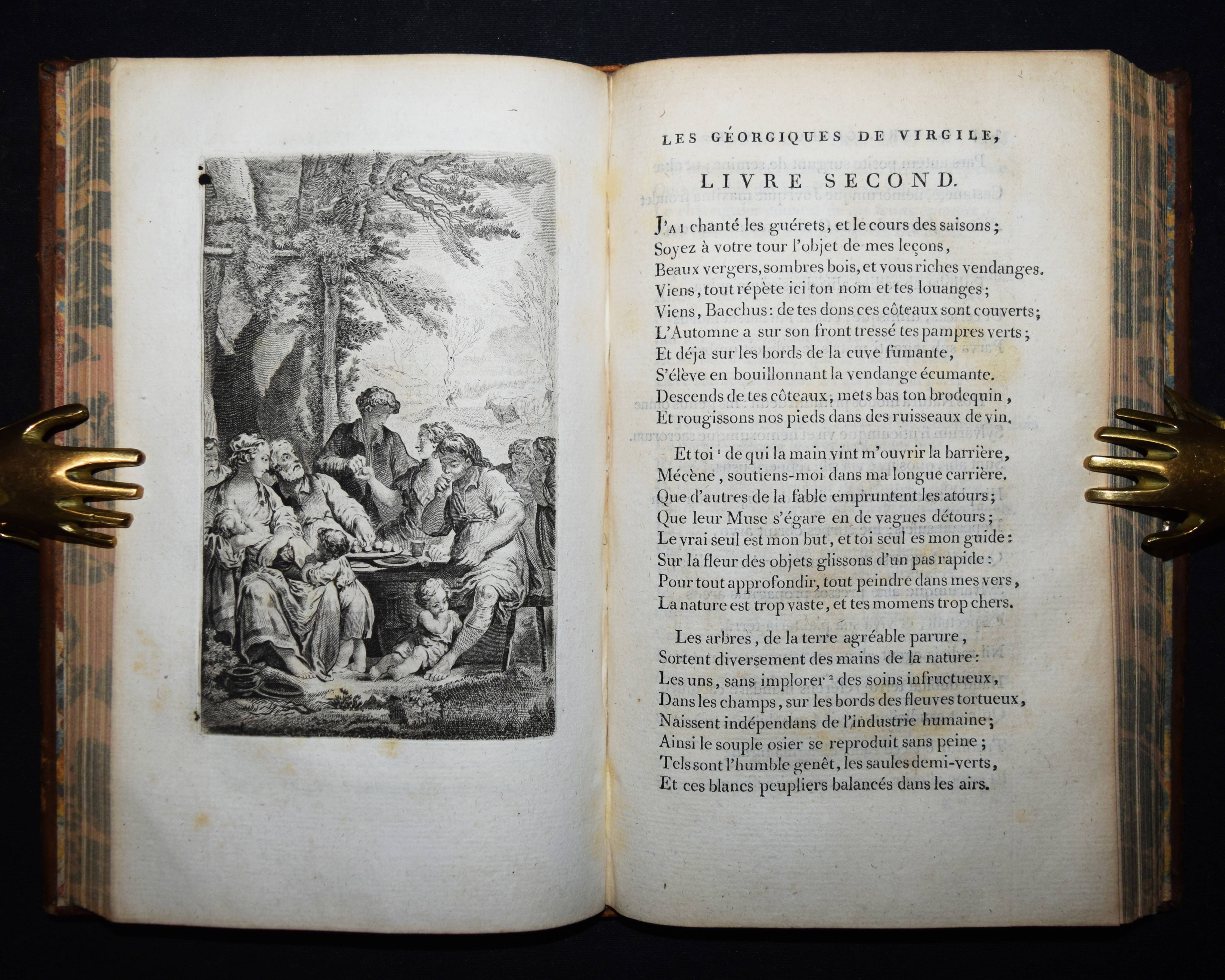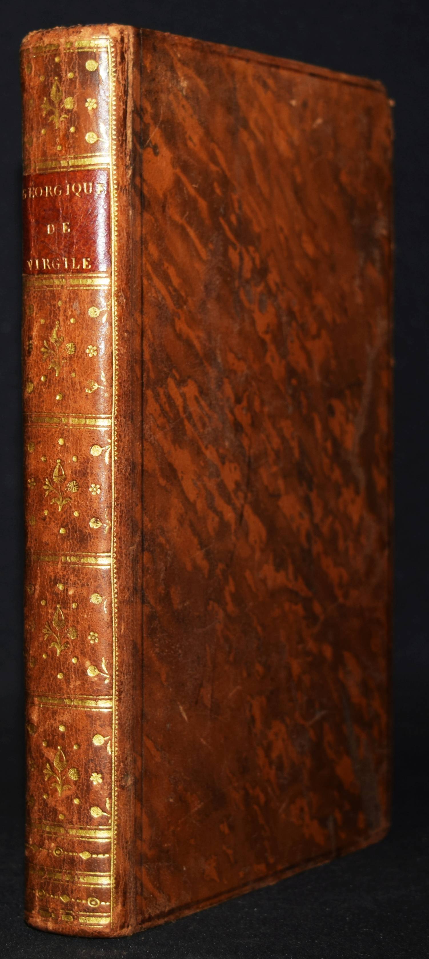 Vergilius Maro, Publius. Les Géorgiques de Virgile, traduites en vers français par (Jacques) Delille. Édition à laquelle on à joint le texte latin, avec les notes et les variantes. Paris, Didot Jeune pour Bleuet père l’an 2 (1790). 8°. 384 S. mit 5 Kupfertafeln von François Villerey nach François Joseph Casanova und Charles Eisen. Kalbslederband der Zeit mit goldgepr. Rückenschild und floraler Rückenvergoldung. Brunet II, 575 ff. Graesse II, 353 f. Quérard II, 451 f. – Zweite Ausgabe der berühmten Übersetzung von J. Delille (1738-1813). – Mit zeittypischen Illustrationen. – Vergil verfasste sein berühmtes Lehrgedicht in vier Büchern die Georgica (Gedichte vom Landbau) zwischen 37 und 29 vor Christus. Das erste Buch der Georgica behandelt hauptsächlich den Ackerbau, das zweite den Obst- und Weinbau, das dritte die Viehzucht und das vierte die Imkerei. Die Georgica gelten als eine der vollendetsten Dichtungen der antiken Literatur. – Stellenweise etwas braunfleckig, gutes dekorativ gebundenes Exemplar.