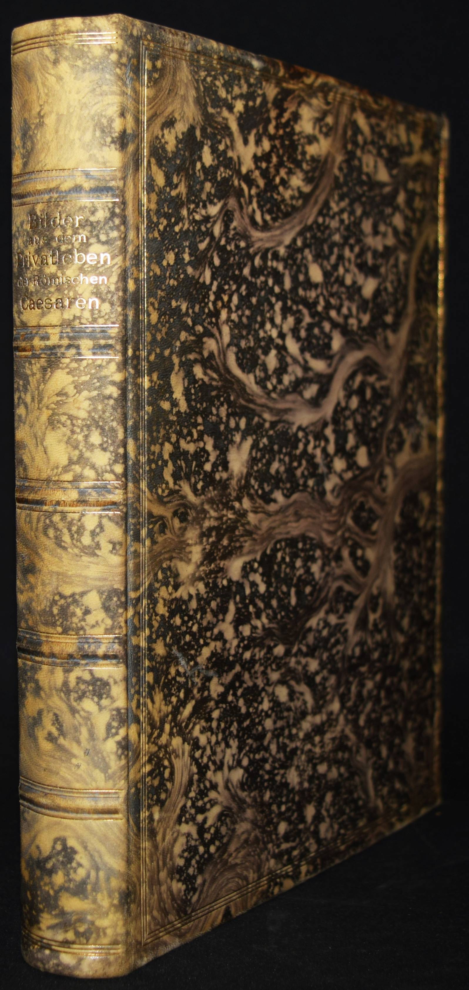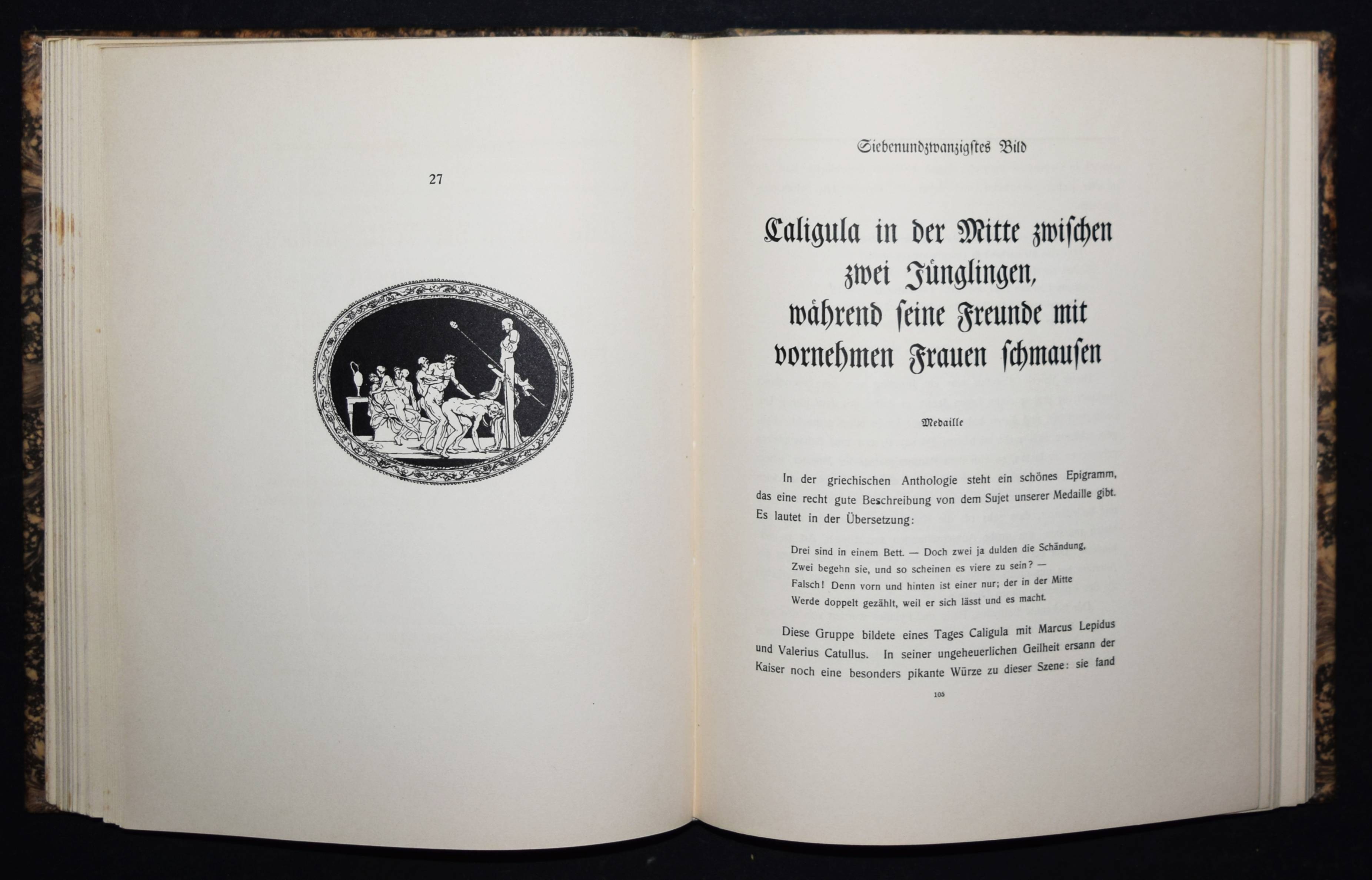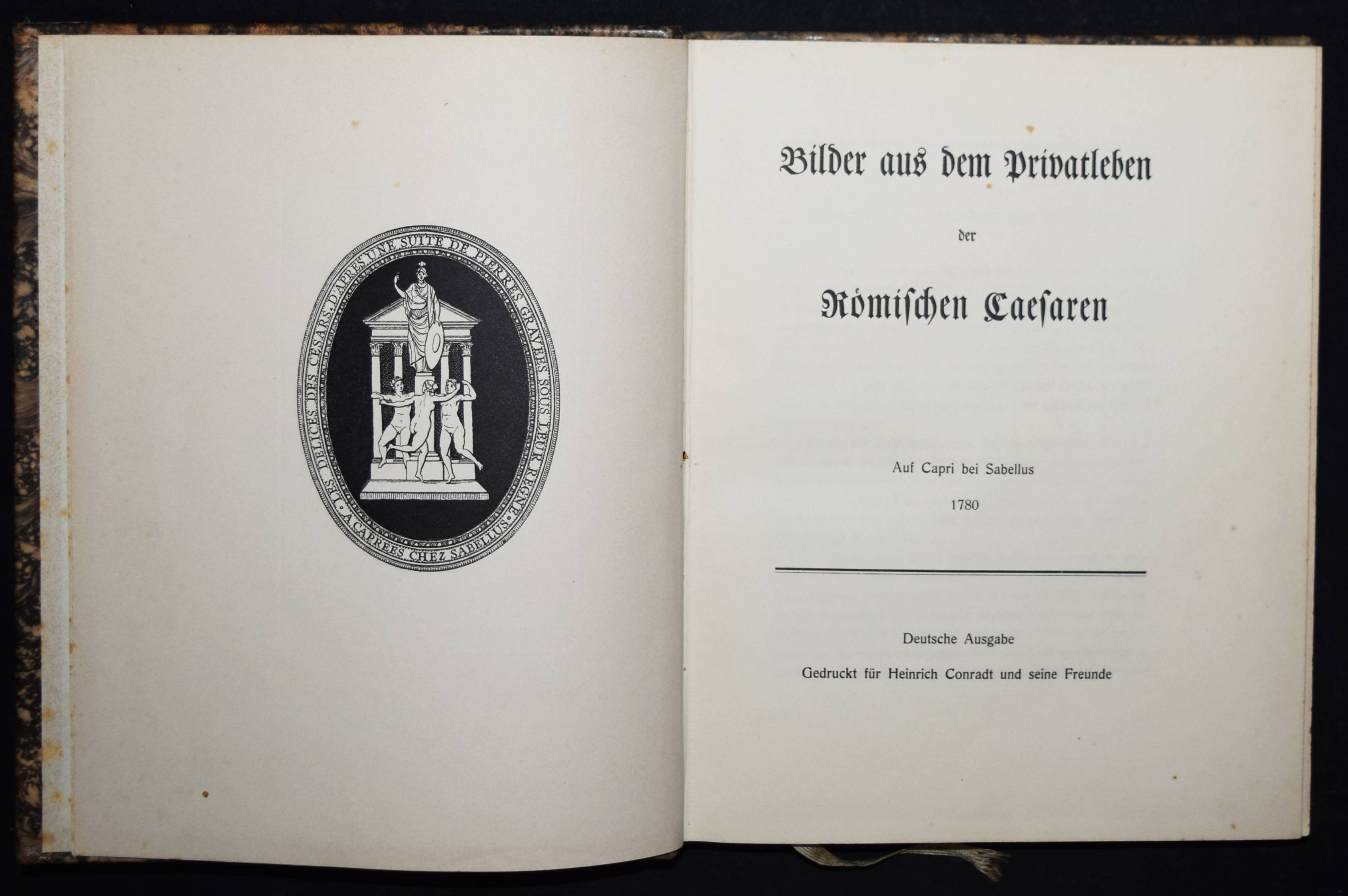 (Hancarville, Pierre-François Hugues Baron de). Bilder aus dem Privatleben der Römischen Caesaren. Auf Capri bei Sabellus 1780. Deutsche Ausgabe. (Siena), Gedruckt für Heinrich Conradt und seine Freunde o. J. (1906). 4° (25,5 x 21 cm.). X, 196 S. mit Frontispiz und 50 Tafeln. Marmorierter Orig.-Kalbslederband mit goldgepr. Rückentitel, Linienvergoldung, Deckel-Filetten und Kopfgoldschnitt. Hayn-Gotendorf III, 59 ff. – Erste deutsche Übersetzung von Heinrich Conradt (1866-1918). Privatdruck mit den antikisierenden erotischen Illustrationen der Originalausgabe, „welche Hancarville als Wiedergaben römischer Gemmen und Caméen ausgab, während sie seiner eigenen Phantasie entsprungen waren. Also eine mehr als kühne Mystification!“ (Hayn-Gotendorf). – Das Werk des französischen Kunsthistorikers und Abenteurers Pierre-François Hugues Baron d’Hancarville (1719-1805) ist zuerst 1780 erschienen. – Rücken etwas aufgehellt, Exlibris, Vorsätze etwas braunfleckig, gutes Exemplar.