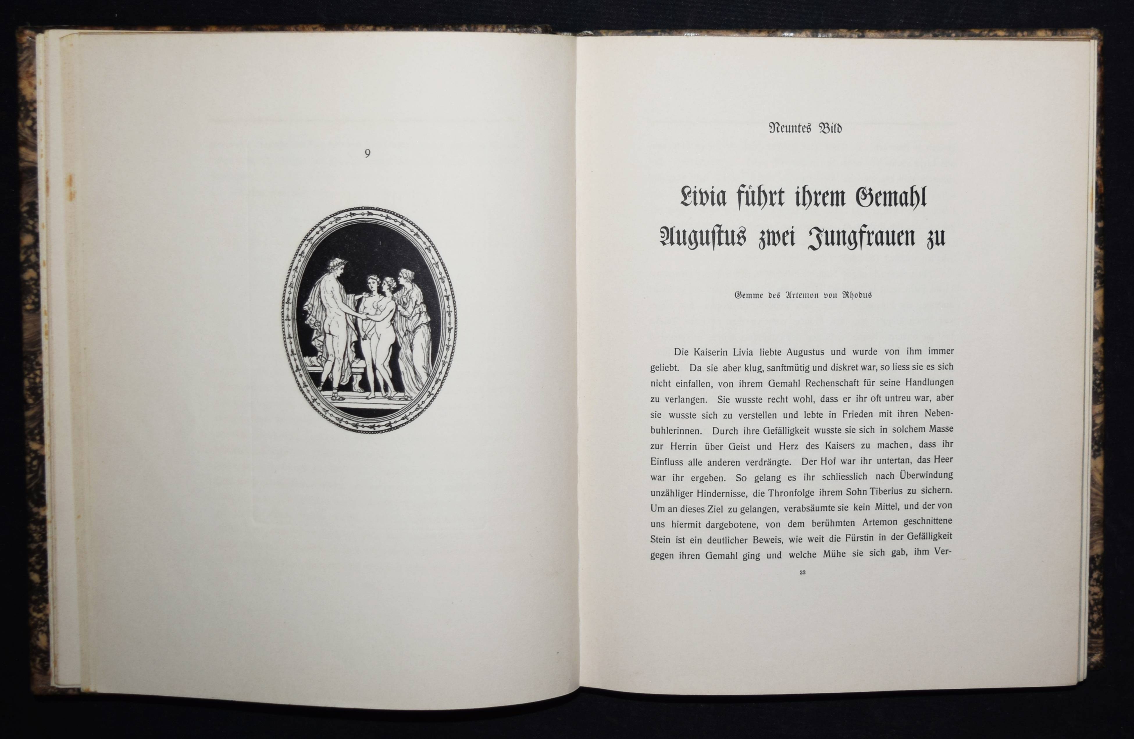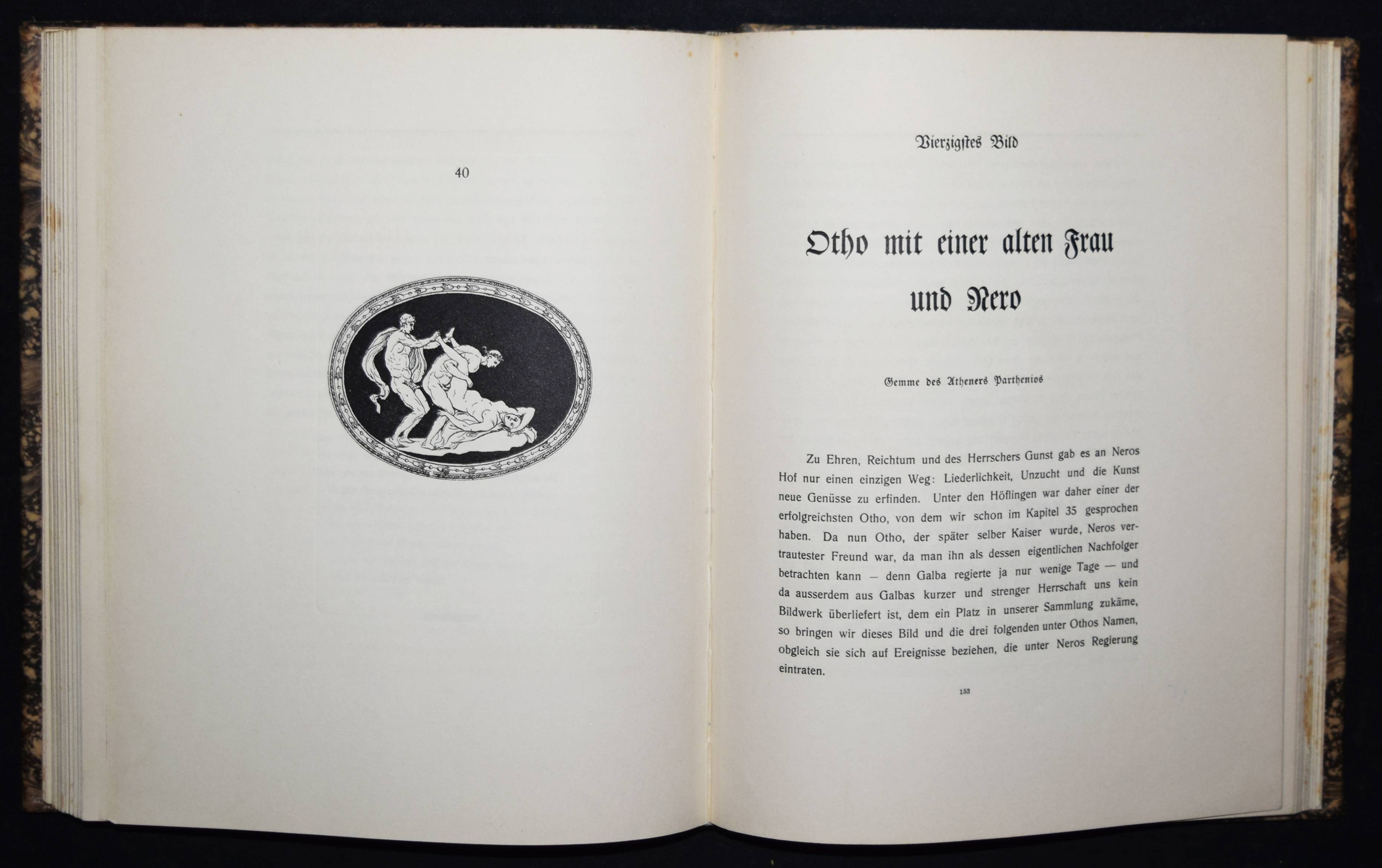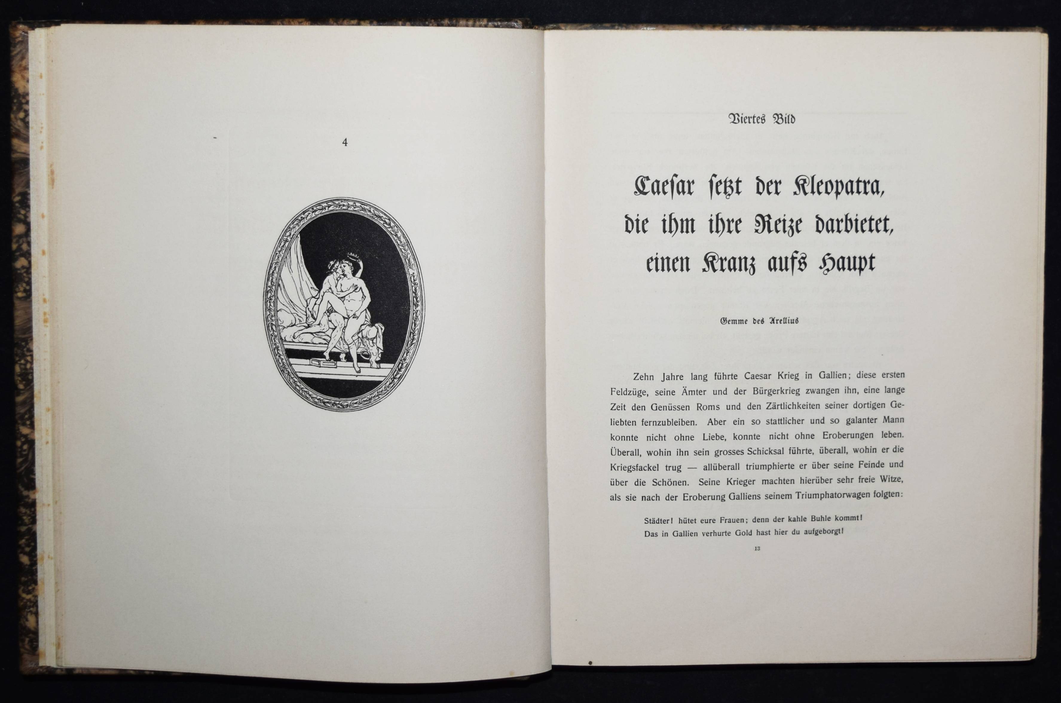 (Hancarville, Pierre-François Hugues Baron de). Bilder aus dem Privatleben der Römischen Caesaren. Auf Capri bei Sabellus 1780. Deutsche Ausgabe. (Siena), Gedruckt für Heinrich Conradt und seine Freunde o. J. (1906). 4° (25,5 x 21 cm.). X, 196 S. mit Frontispiz und 50 Tafeln. Marmorierter Orig.-Kalbslederband mit goldgepr. Rückentitel, Linienvergoldung, Deckel-Filetten und Kopfgoldschnitt. Hayn-Gotendorf III, 59 ff. – Erste deutsche Übersetzung von Heinrich Conradt (1866-1918). Privatdruck mit den antikisierenden erotischen Illustrationen der Originalausgabe, „welche Hancarville als Wiedergaben römischer Gemmen und Caméen ausgab, während sie seiner eigenen Phantasie entsprungen waren. Also eine mehr als kühne Mystification!“ (Hayn-Gotendorf). – Das Werk des französischen Kunsthistorikers und Abenteurers Pierre-François Hugues Baron d’Hancarville (1719-1805) ist zuerst 1780 erschienen. – Rücken etwas aufgehellt, Exlibris, Vorsätze etwas braunfleckig, gutes Exemplar.