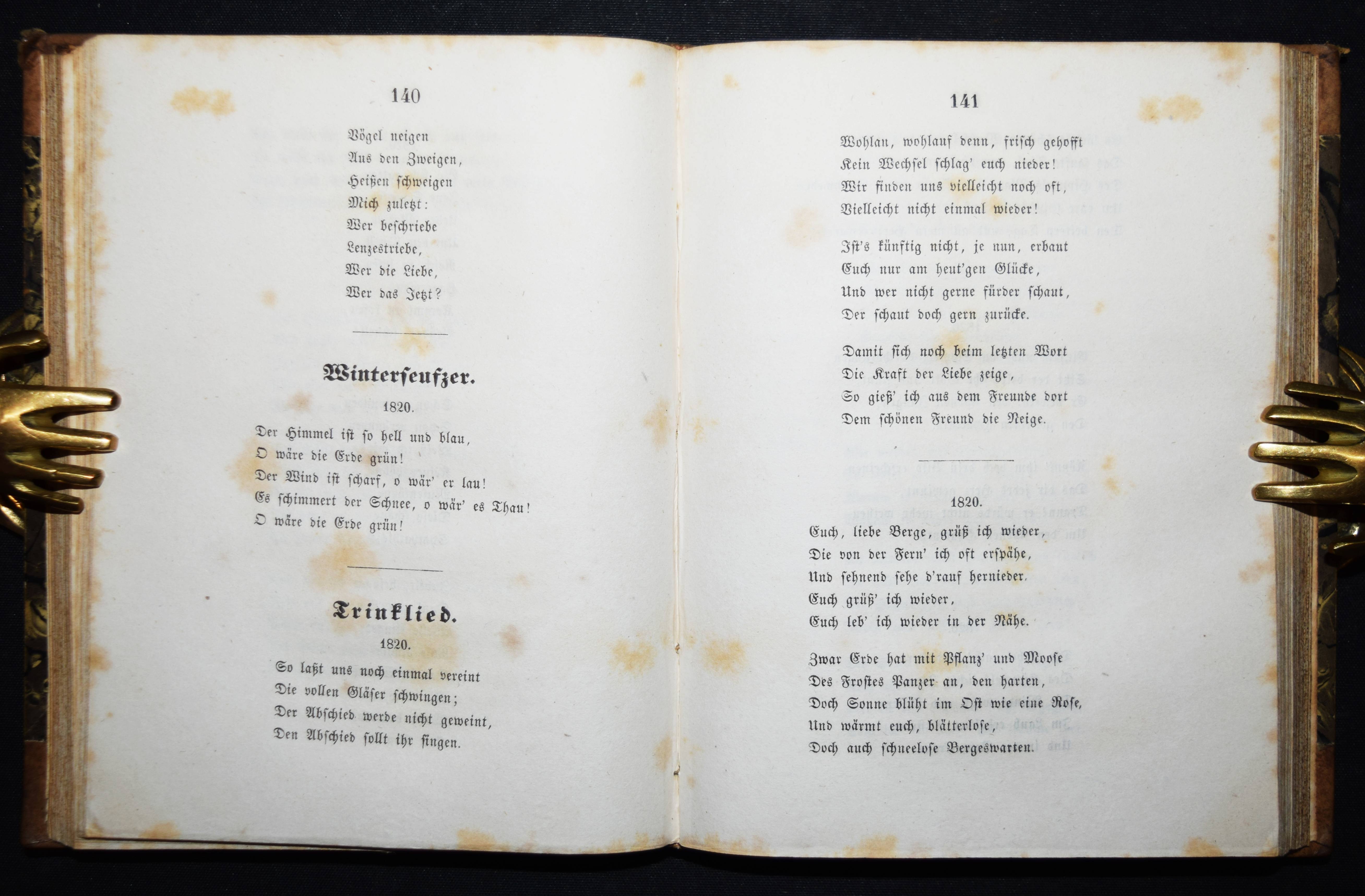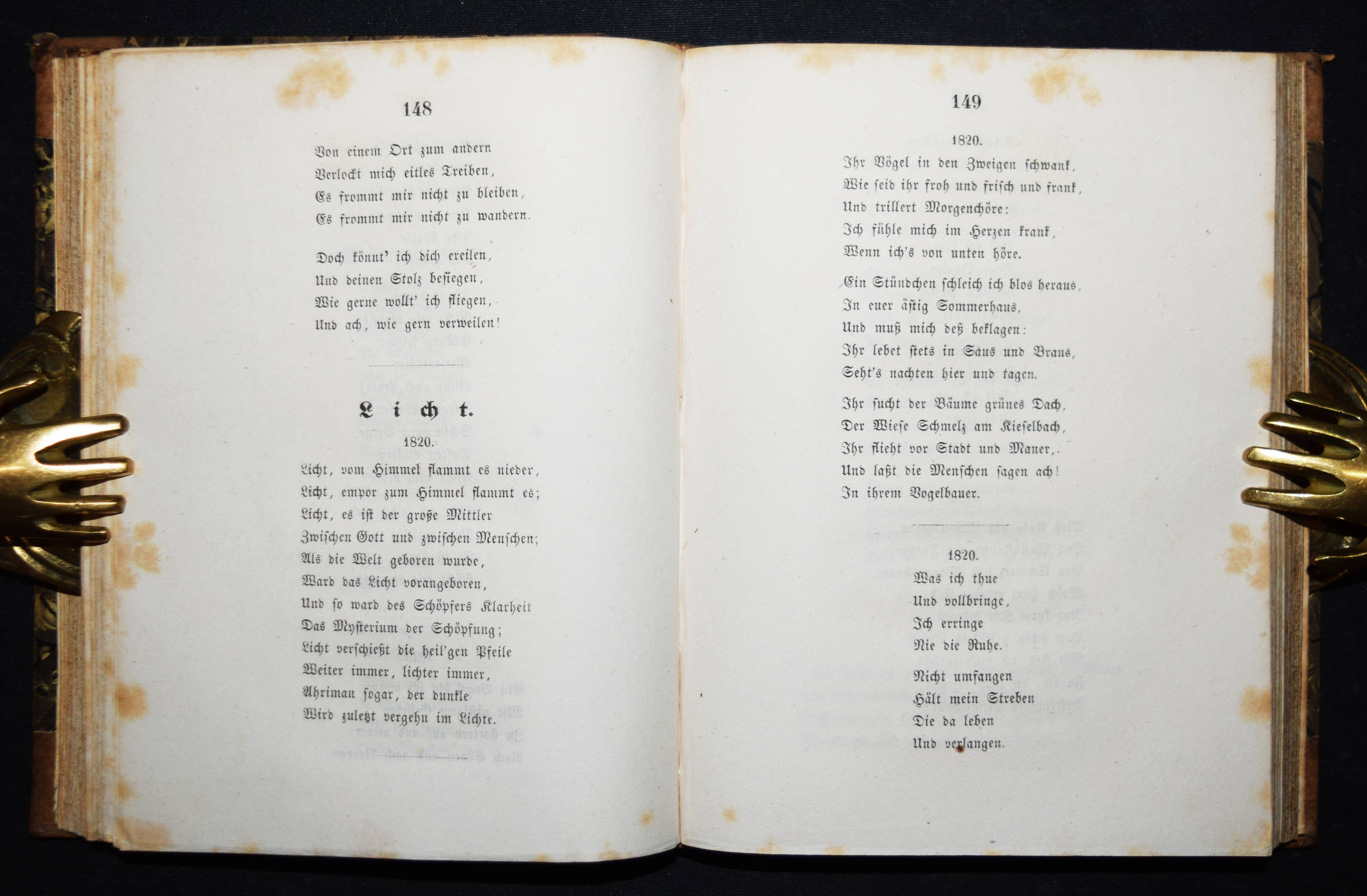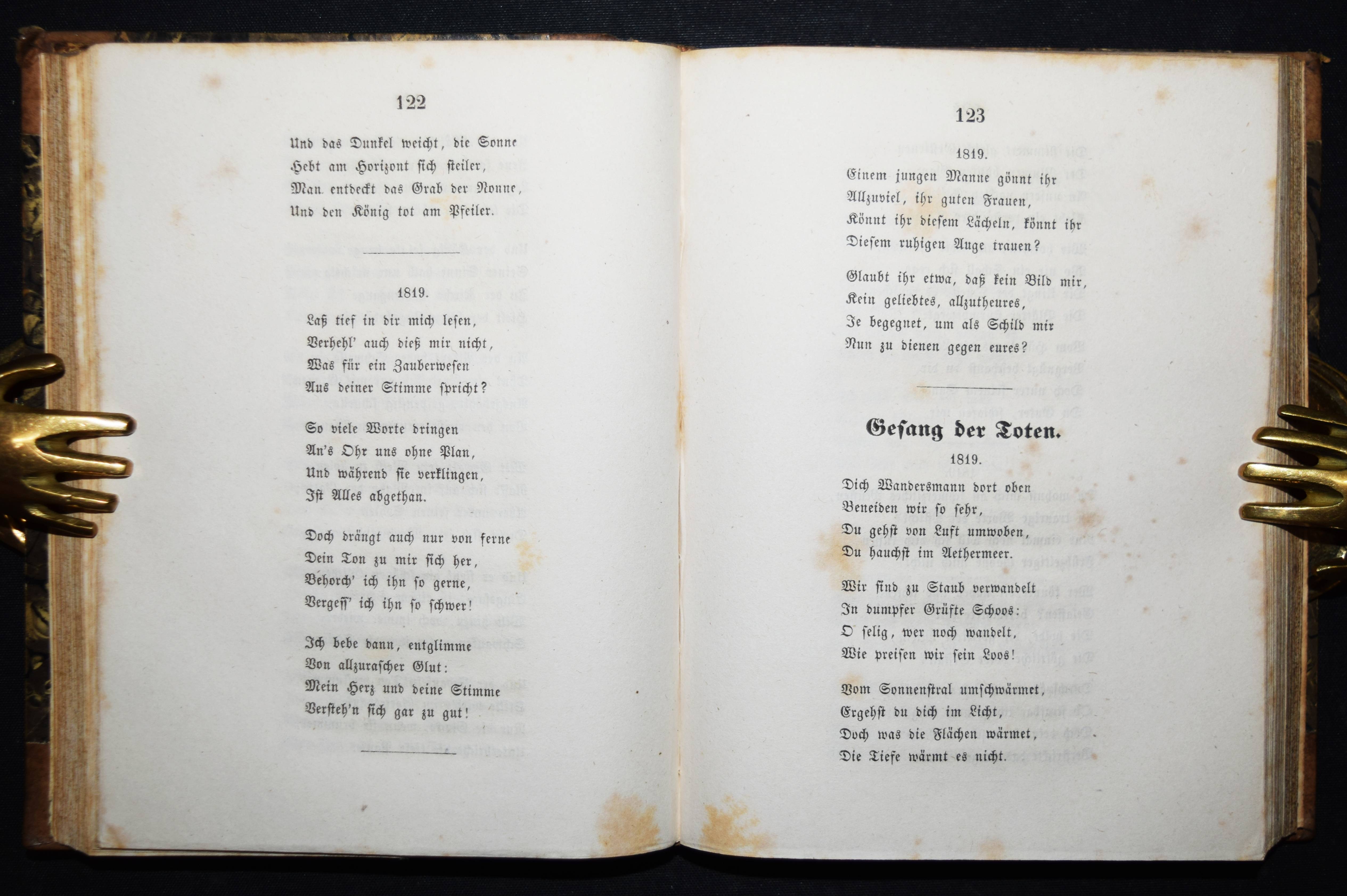 Platen(-Hallermünde), August Graf v. Gesammelte Werke. (Herausgegeben und eingeleitet von Karl Goedeke). 5 Bände. Stuttgart und Tübingen, J. G. Cotta 1843. Kl.-8°. Mit gestoch. Portrait in Band I. Halblederbände der Zeit mit goldgepr. Rückenschildern und dezenter Rückenvergoldung. Goedeke VIII, 696, 51. – Erste vollständige Gesamtausgabe. – „Der literarische Rang P.s basiert auf seiner Lyrik, deren spezifischen Charakter die von J. Link geprägte Formel „Sinngebung durch artistische Form“ genau bezeichnet. Neben Liedern (Tristan) und Balladen (Das Grab im Busento; Der Pilgrim vor St. Just) sind vor allem Ghaselen zu nennen, eine pers. Gedichtform, die P. gemeinsam mit Rückert für die deutsche Literatur gewonnen hat. Die „Sonette aus Venedig“ beeinflußten die Venedig-Dichtung bis hin zu Rilke und Thomas Mann. P.s Versepen und die schon zu Lebzeiten des Autors kaum aufgeführten Dramen sind weitgehend vergessen. Die umfangreichen Tagebücher, die sich über weite Strecken als Journal intime erweisen, können ein starkes kultur- und mentalitätsgeschichtliches Interesse beanspruchen“ (G. Och in NDB XX, 510 f.). – Durchgehend teils stärker braunfleckig, sonst gutes Exemplar.