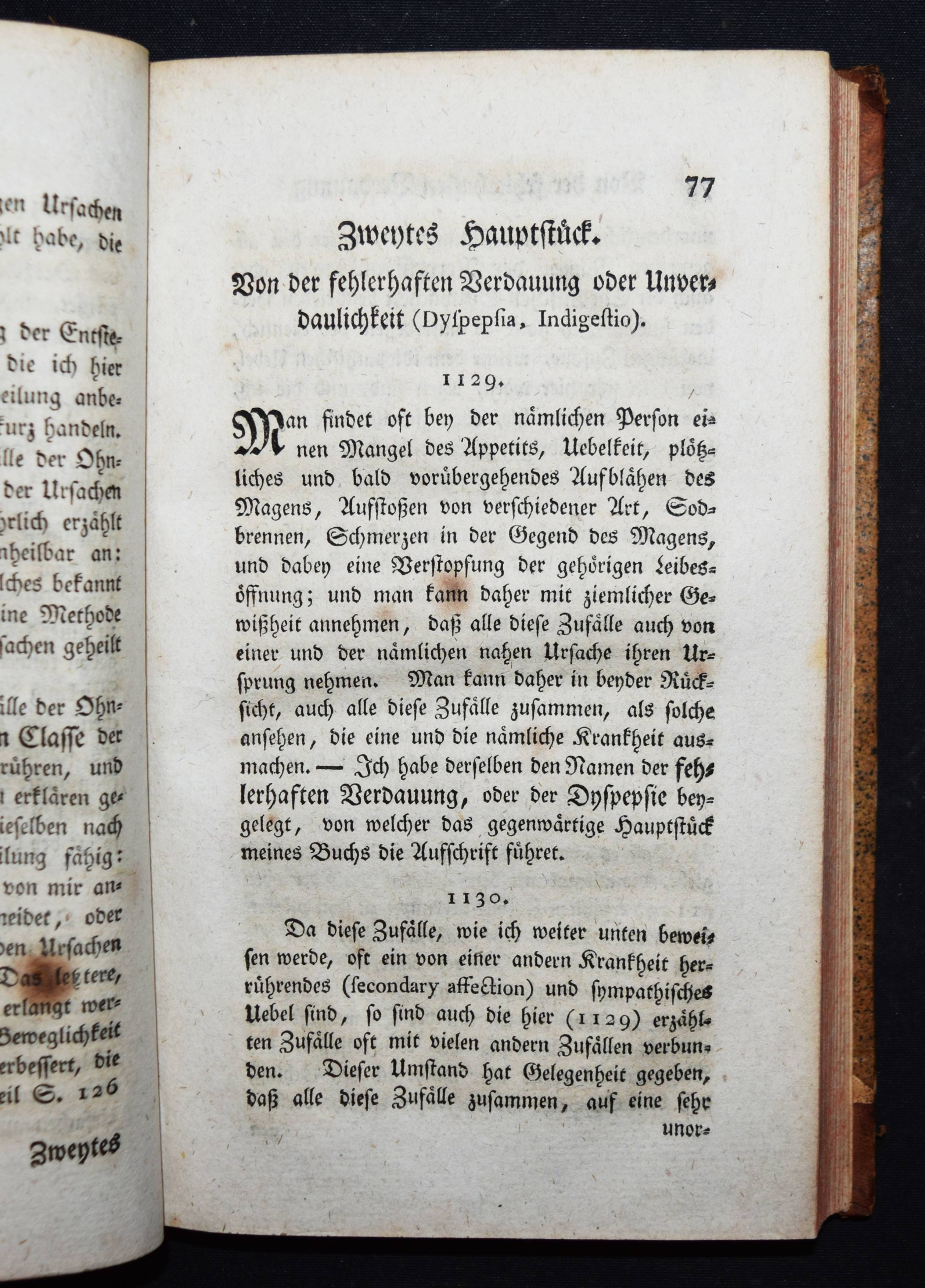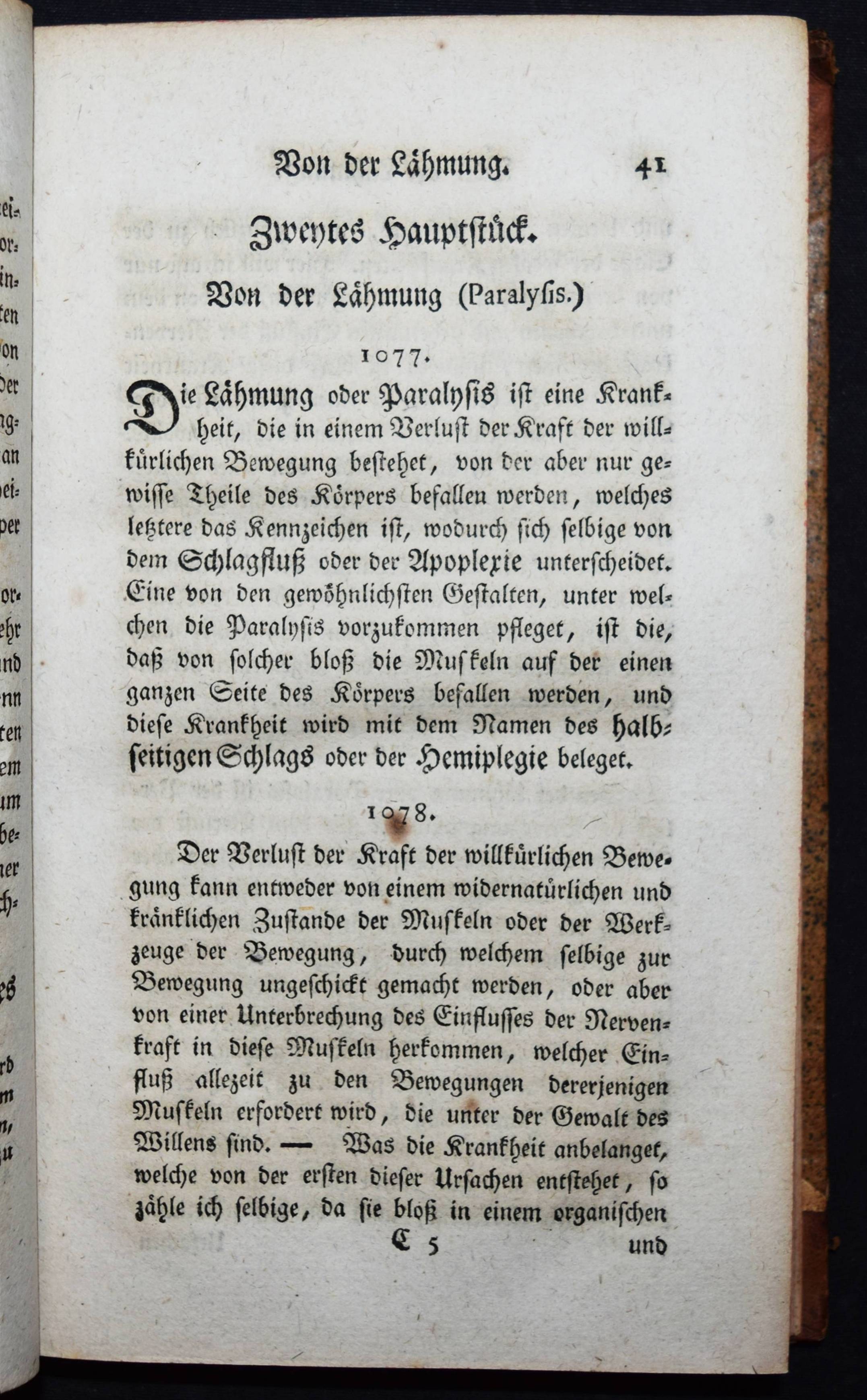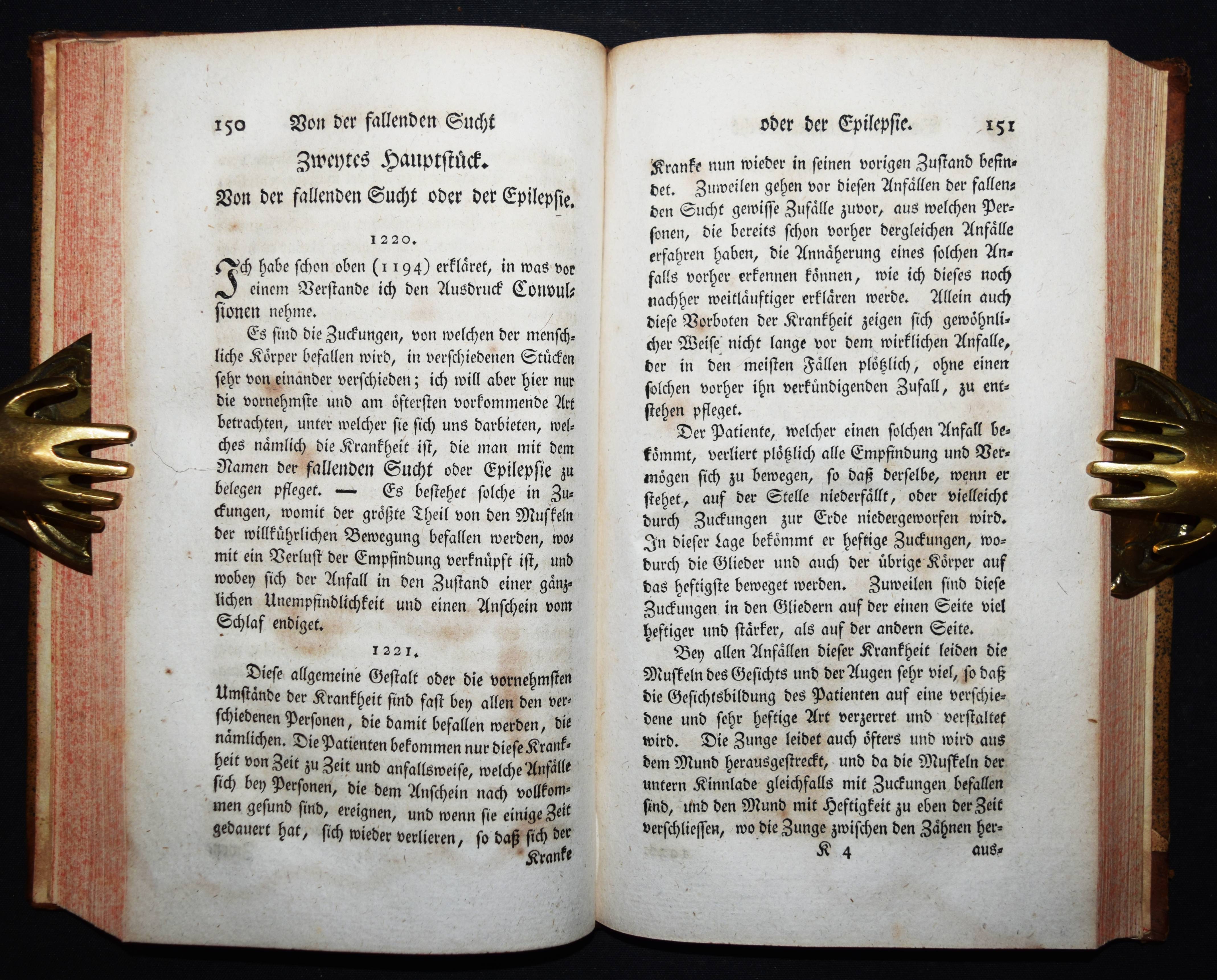 Cullen, William. Anfangsgründe der praktischen Arzneywissenschaft. Dritter Theil, welcher die Nervenkrankheiten enthält. (Nach der vierten englischen Ausgabe übersetzt und mit Anmerkungen und Zusätzen vermehret von Christian Erhard Kapp). Leipzig, Carpar Fritsch 1784. 8°. [3] Bl., 336 S. mit Titelvignette in Holzschnitt. Halblederband der Zeit mit Rückenschild. Hirsch/Hüb. II, 153. VD18 90384172. Vgl. Waller 2234 u. Garrison-Morton 4920.1. – Erste deutsche Ausgabe des in sich abgeschlossenen dritten Teils von Cullens Hauptwerk. – Mit einem Anhang „Von den Mitteln, ertrunkene und dem Anschein nach todte Personen wiederherzustellen“. – Zeitgenöss. Besitzvermerk, Deckel unten mit Fehlstellen am Bezugspapier, durchgehend etwas braunfleckig, gutes Exemplar.