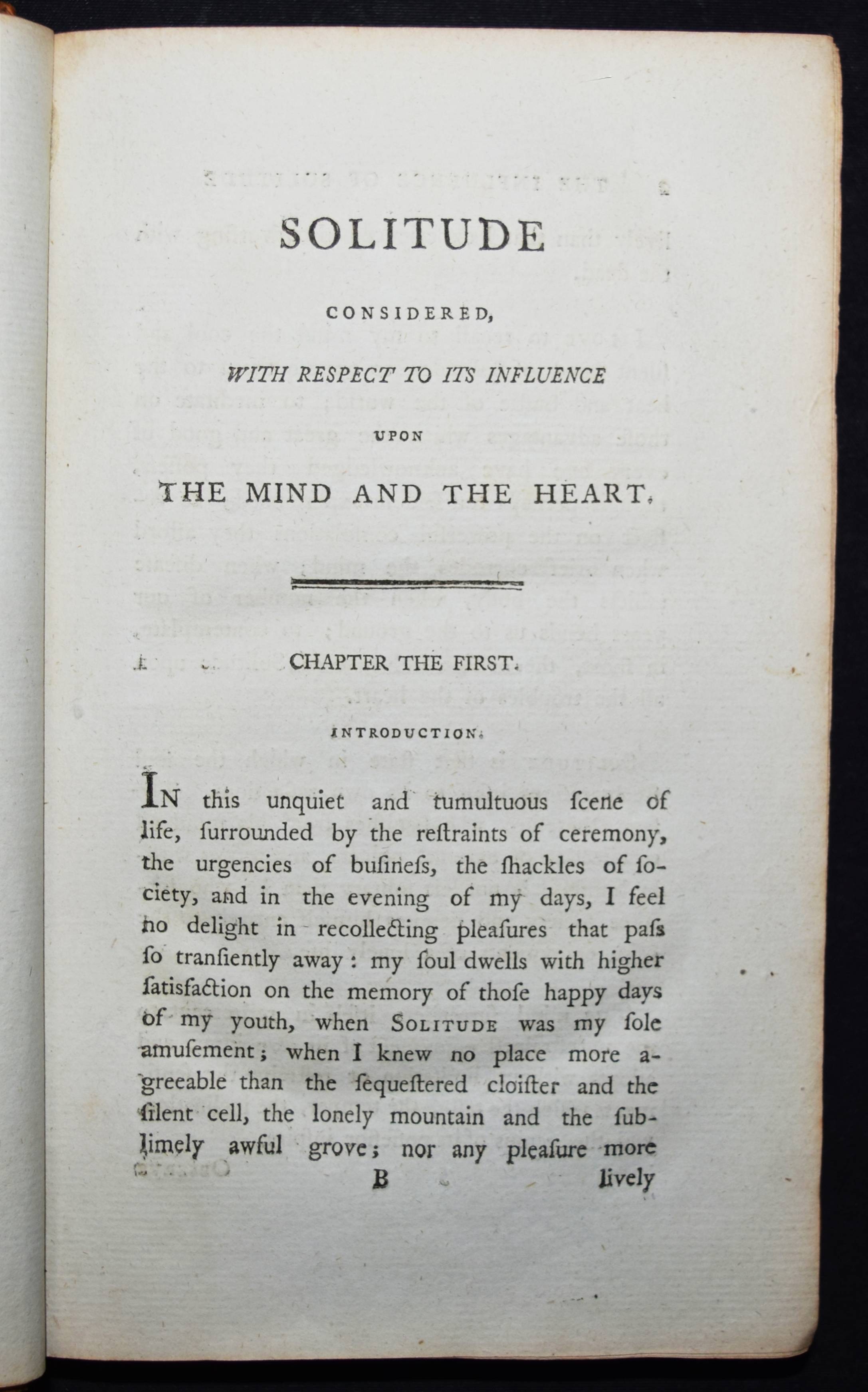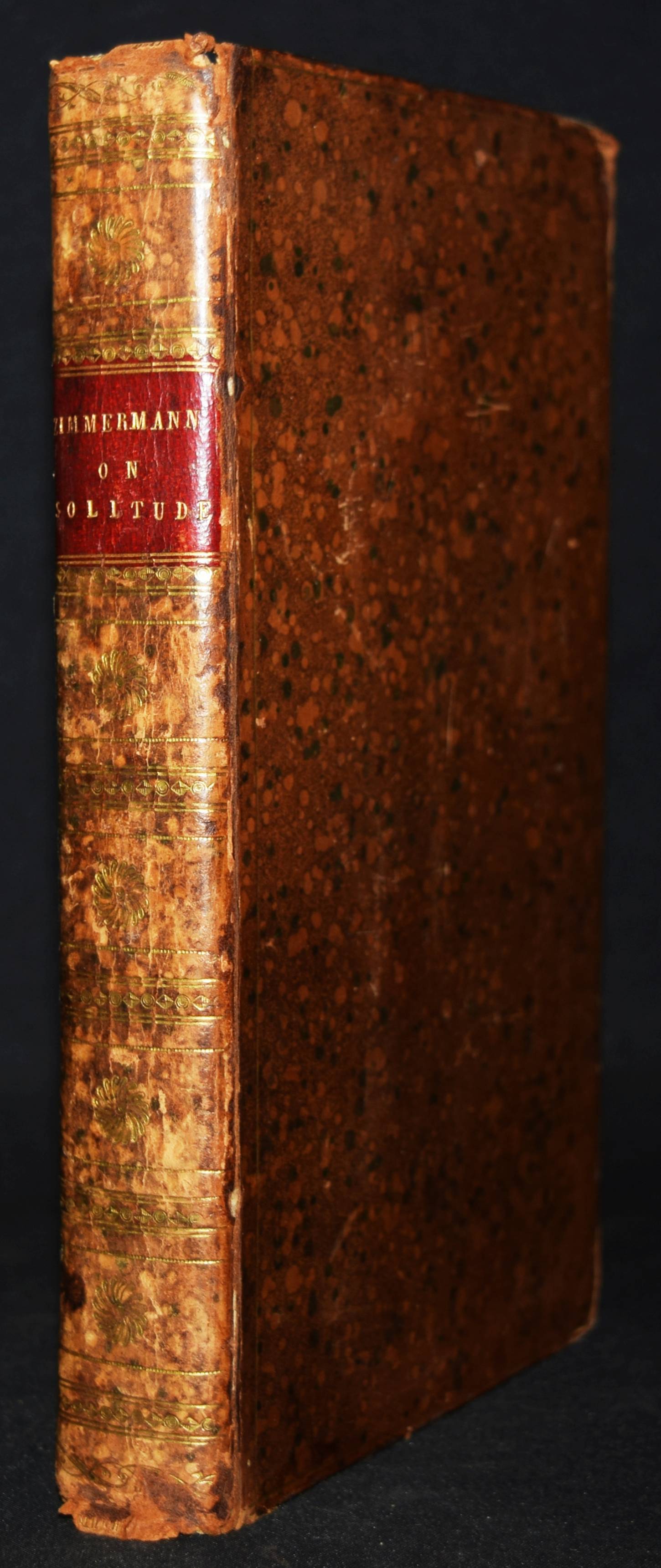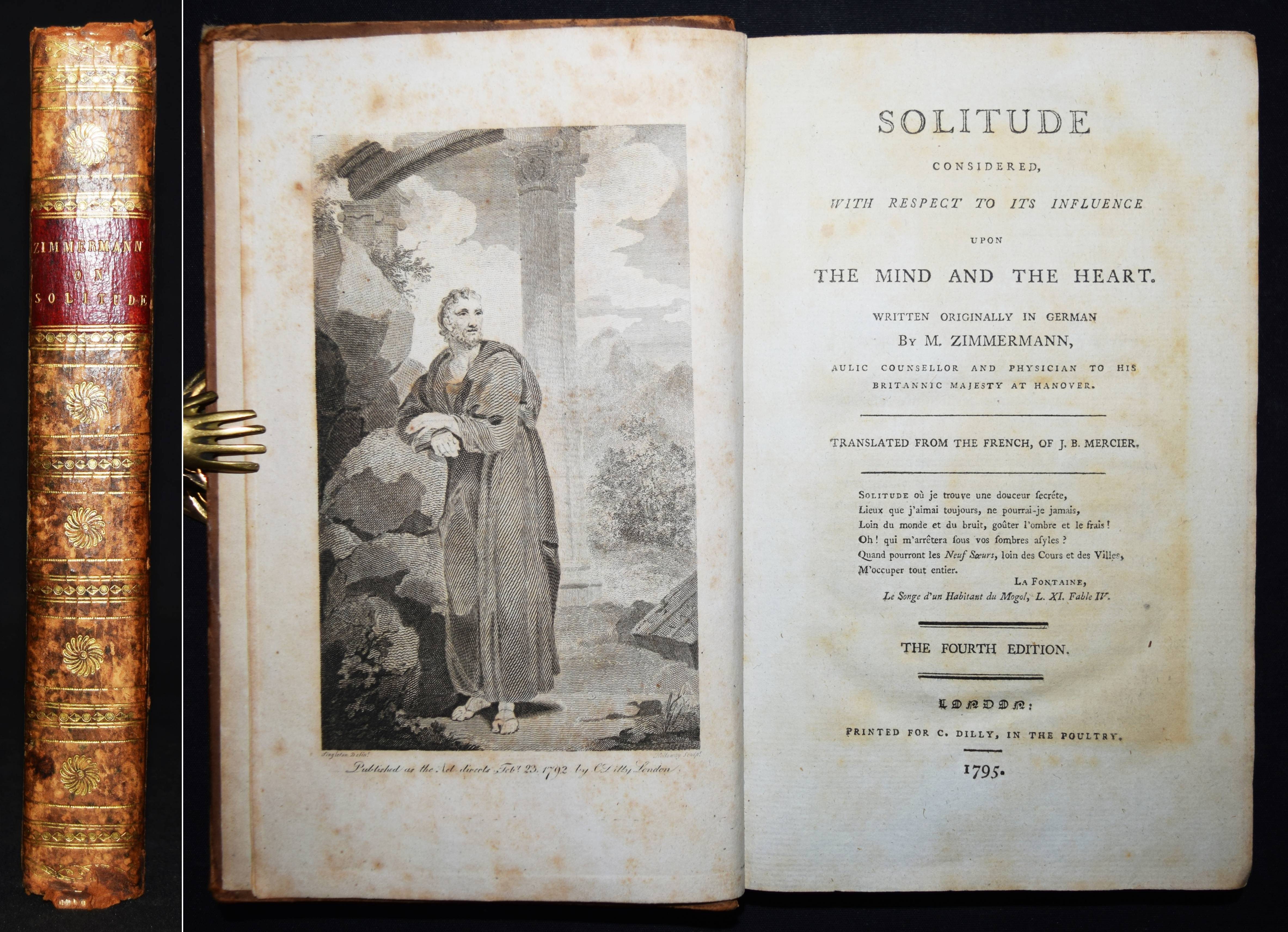 Zimmermann, (Johann Georg Ritter v.). Solitude considered. With respect to its influence upon the mind and the heart. Written originally in German by M. Zimmermann, aulic counsellor and physician to his Britannic Majesty at Hanover. Translated from the French, of J. B. Mercier. The fourth edition. London, printed for C. Dilly 1795. 8°. X, [2], 420 S. mit gestoch. Frontispiz von Holloway nach Singleton. Kalbslederband der Zeit mit goldgepr. Rückenschild, Rückenvergoldung und Deckel-Filetten. Spätere englische Übersetzung von Zimmermanns berühmten philosophischen Betrachtungen. Das Werk erschien zuerst 1756 in Deutsch und wurde 1779 zuerst in Englische übersetzt. – „Die Einsamkeit will er schildern, nicht nur als gänzliche Abgeschlossenheit, sondern auch als ein Alleinsein mitten unter den Menschen… Zuerst wendet er sich dem Triebe zur Geselligkeit zu und findet diesen begründet in der natürlichen Anlage des Menschen, die ihn Gesellschaft suchen heisst. Verwerflich scheint ihm dagegen jeder Hang zur Geselligkeit, welcher nur aus einem armen Geiste, aus Zerstreuungssucht und in letzter Linie aus Langeweile entspringt“ (Ischer, J.G.Zimmermann. Leben und Werk (1893), S. 324 ff.). – Rücken und Kanten etwas berieben, Frontispiz und Titelblatt etwas braunfleckig, gutes dekorativ gebundenes Exemplar.