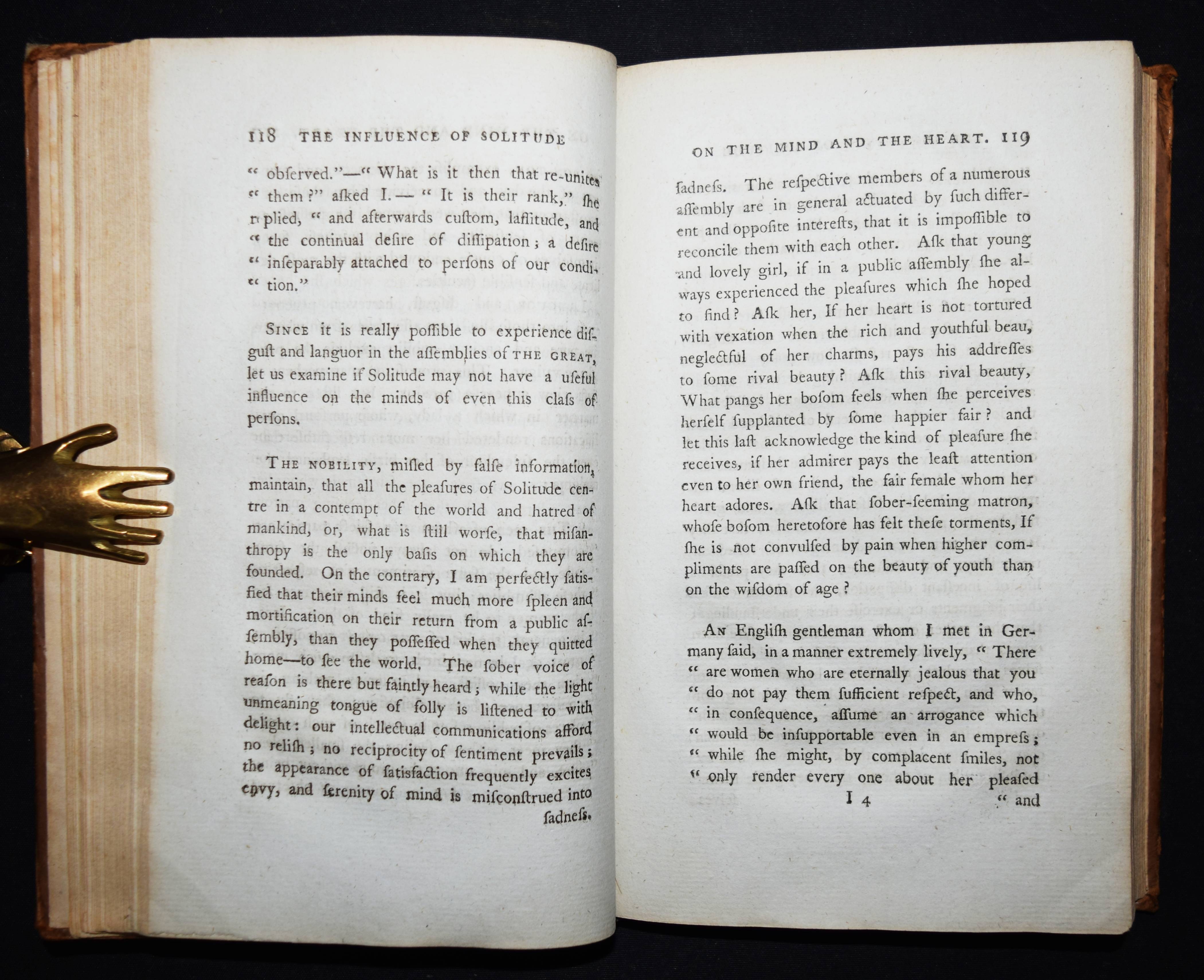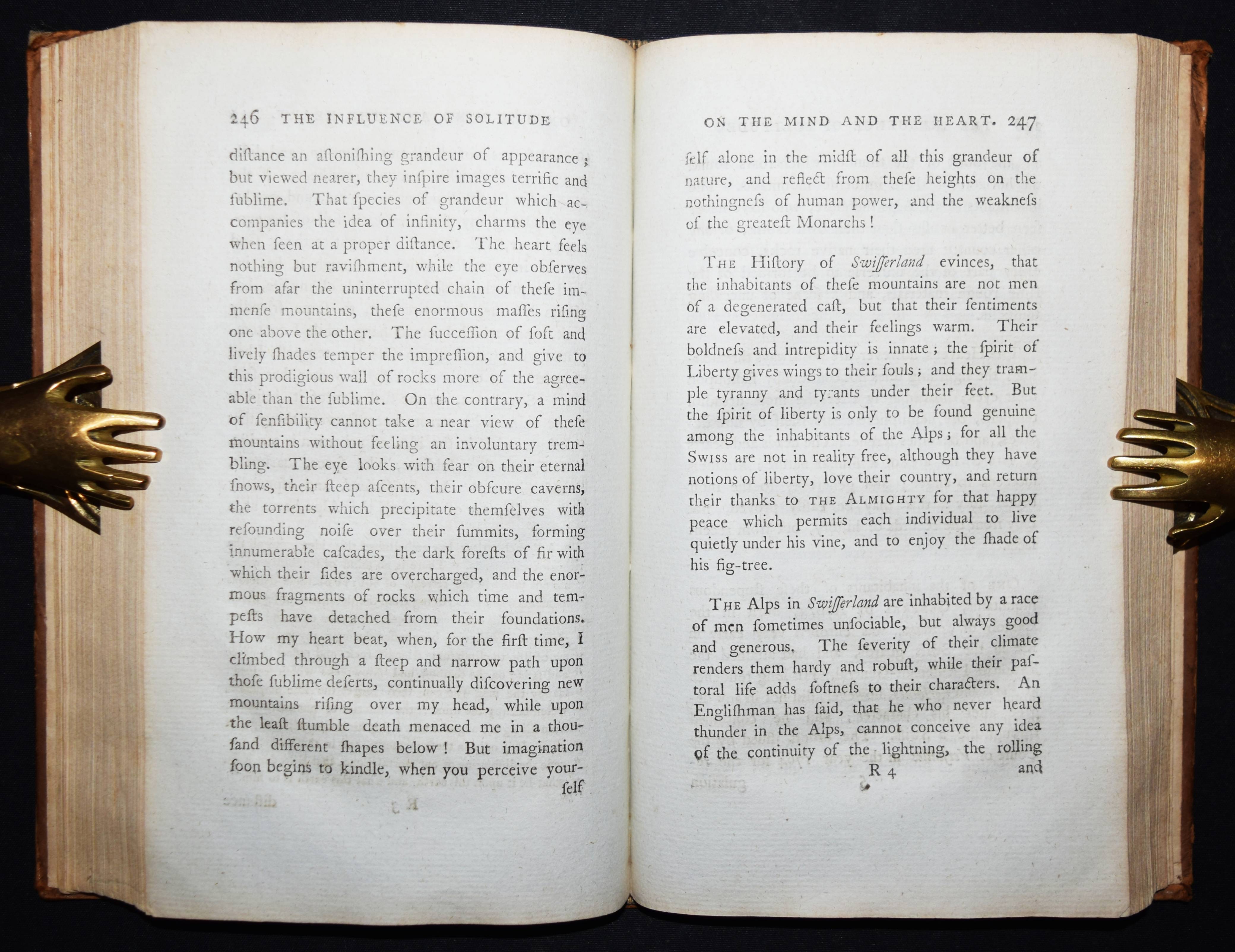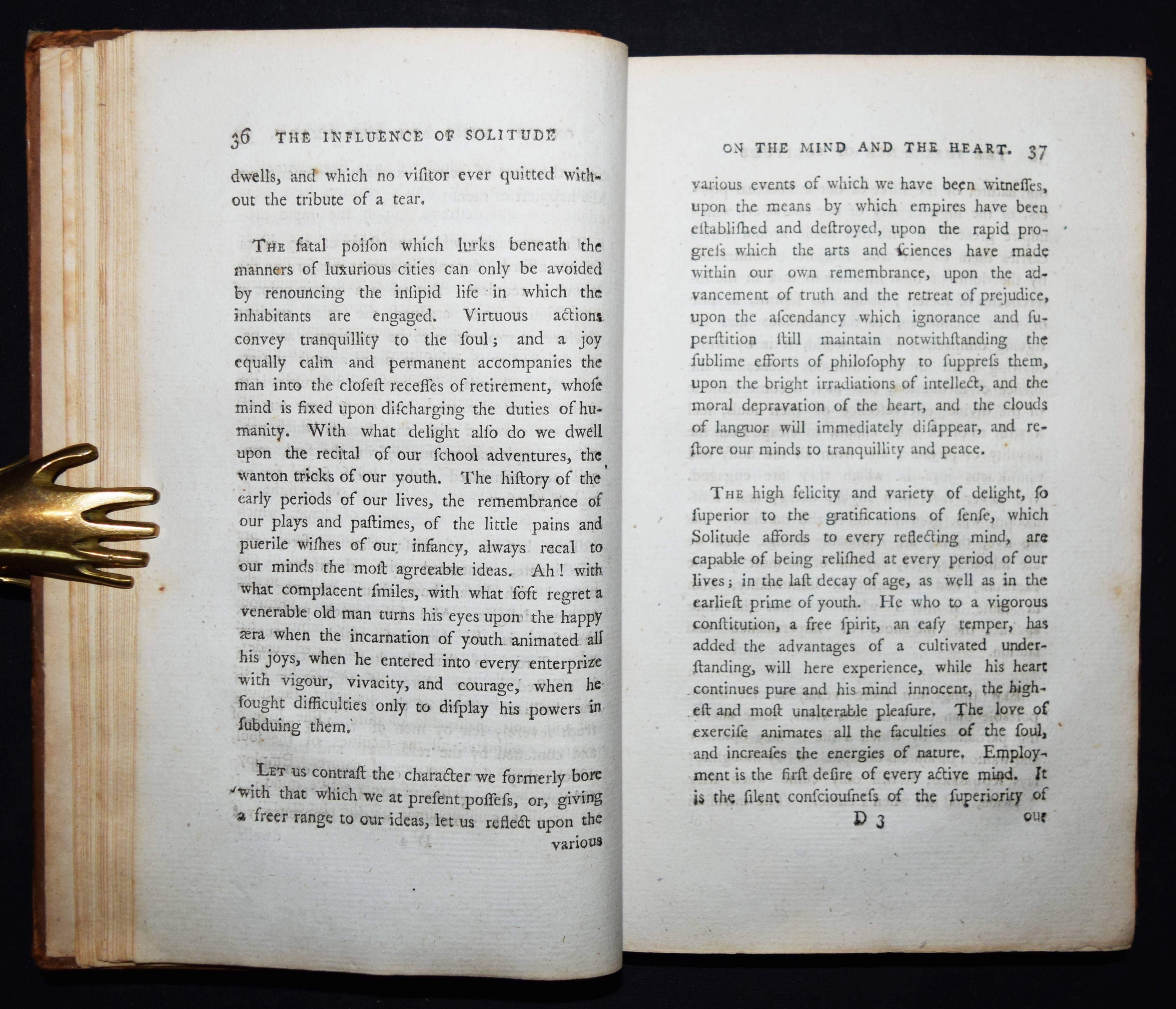 Zimmermann, (Johann Georg Ritter v.). Solitude considered. With respect to its influence upon the mind and the heart. Written originally in German by M. Zimmermann, aulic counsellor and physician to his Britannic Majesty at Hanover. Translated from the French, of J. B. Mercier. The fourth edition. London, printed for C. Dilly 1795. 8°. X, [2], 420 S. mit gestoch. Frontispiz von Holloway nach Singleton. Kalbslederband der Zeit mit goldgepr. Rückenschild, Rückenvergoldung und Deckel-Filetten. Spätere englische Übersetzung von Zimmermanns berühmten philosophischen Betrachtungen. Das Werk erschien zuerst 1756 in Deutsch und wurde 1779 zuerst in Englische übersetzt. – „Die Einsamkeit will er schildern, nicht nur als gänzliche Abgeschlossenheit, sondern auch als ein Alleinsein mitten unter den Menschen… Zuerst wendet er sich dem Triebe zur Geselligkeit zu und findet diesen begründet in der natürlichen Anlage des Menschen, die ihn Gesellschaft suchen heisst. Verwerflich scheint ihm dagegen jeder Hang zur Geselligkeit, welcher nur aus einem armen Geiste, aus Zerstreuungssucht und in letzter Linie aus Langeweile entspringt“ (Ischer, J.G.Zimmermann. Leben und Werk (1893), S. 324 ff.). – Rücken und Kanten etwas berieben, Frontispiz und Titelblatt etwas braunfleckig, gutes dekorativ gebundenes Exemplar.