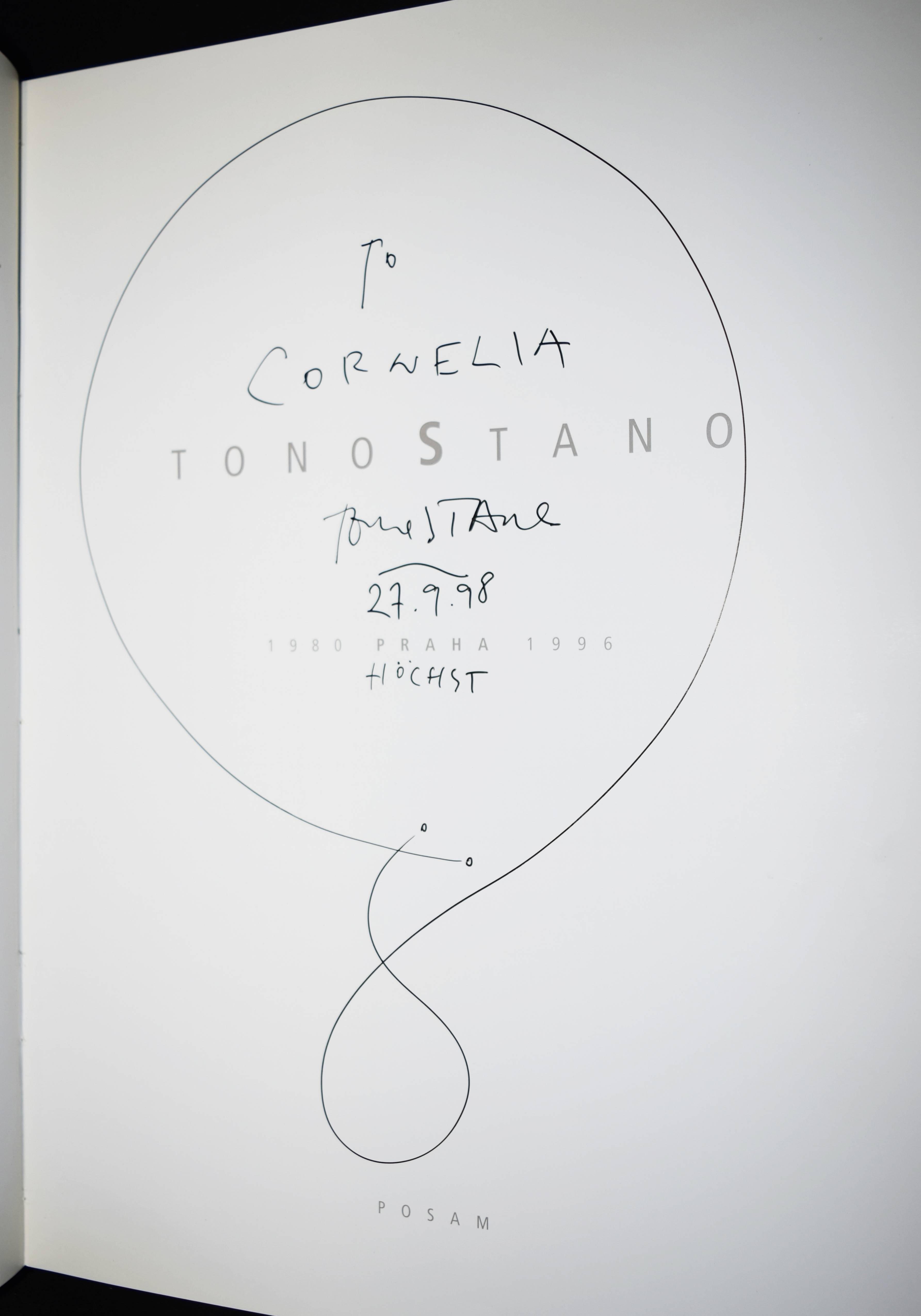 Stano, Tono. (Fotografie – Photographs). 1980-1996. Praha (Prag), PosAm (1998). Folio (43 x 32 cm.). 113, (1) S. mit 102 Duotone-Tafeln. Orig.-Leinenband mit illustr. Schutzumschlag. Mit eigenhändiger Widmung von T. Stano auf dem Titelblatt „To Cornelia, Tono Stano, 27.9.98 Höchst“. – „Der tschechische Künstler Tono Stano zählt weltweit zu den bedeutendsten Photographen der Gegenwart“ (Galerie Pintner, Frankfurt am Main zur Ausstellung 29. 9. – 28. 11. 1998). – „Geboren am 24. März 1960 in Zlate Moravce (Tschechoslowakei). Studierte von 1975 bis 1979 an der Höheren Kunstgewerbeschule in Bratislava und anschließend Photographie an der Prager Filmfakultät. An dieser Hochschule kam es zur Bildung einer Schule junger Photographen, die eine neue Art inszenierter Photographie entwickelten. Charakteristisch für ihr Schaffen sind Phantastische Szenerien mit Modellen im Atelier. Sie sind gekennzeichnet von Humor, Ironie und hintergründigen Metaphern, beziehen sich aber auch oft auf mythologische Traditionen. Häufig thematisieren diese Arbeiten das Problem menschlicher Beziehungen und Sexualität. Tono Stano ist innerhalb dieser Gruppe derjenige, der in seinen Bildern am stärksten reduziert. Er verzichtet auf erzählerische Momente und konzentriert sich auf eine zurückhaltende Bildsprache und einfache Symbole“ (Reinhold Mißelbeck, Photographie des 20. Jahrhunderts, Museum Ludwig Köln). – Sehr gutes Exemplar.