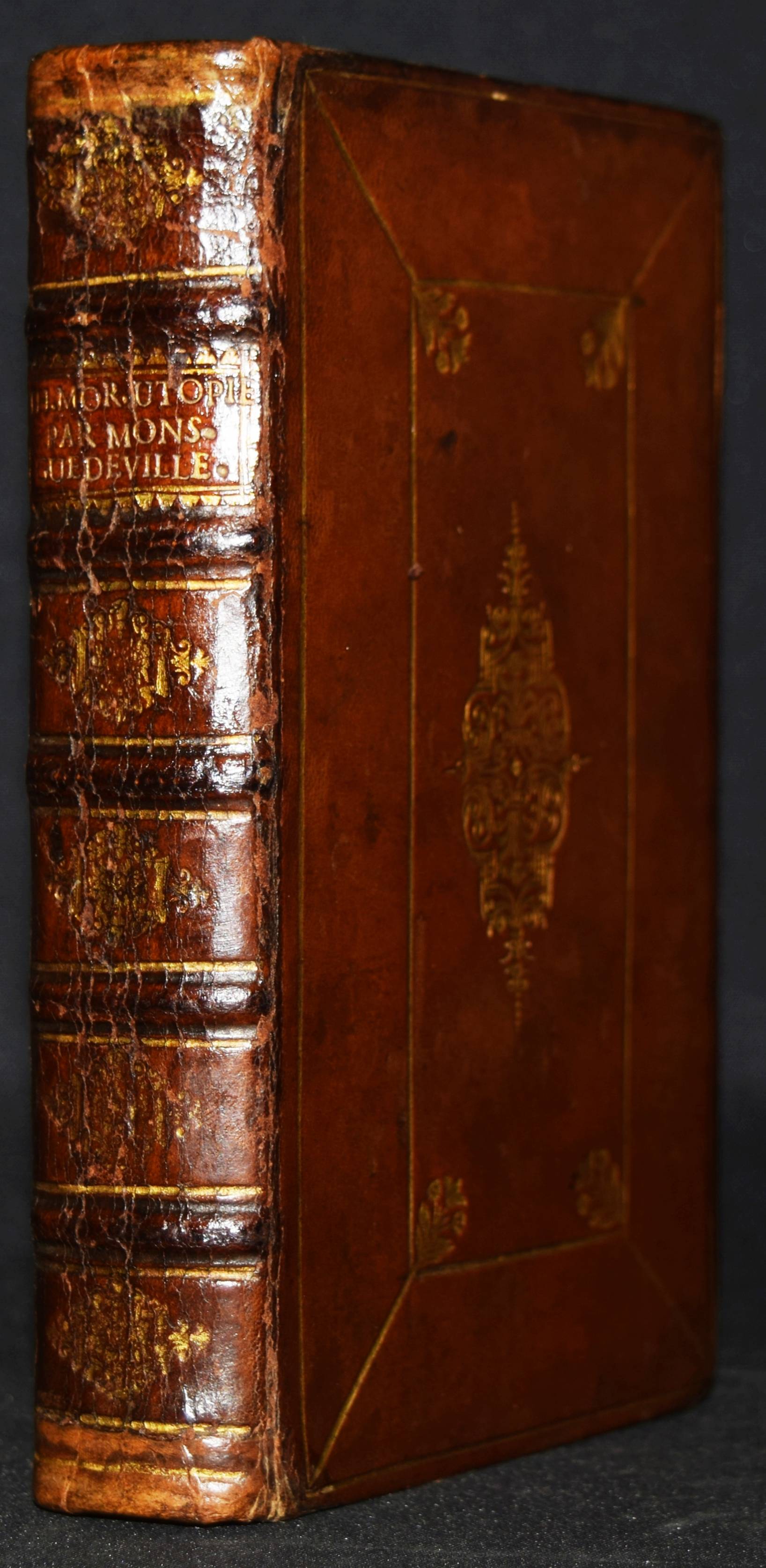More, Thomas. Idée d’une republique heureuse: ou l’utopie de Thomas Morus, Chancelier d’Angleterre. Contenant le plan d’une république dont les loix, les usages & les coûtumes tendent uniquement à rendre heureuses les societez qui les suivront. Traduite en Francois par (Nicolas) Gueudeville et enrichie de figures en taille-douche. Amsterdam, Francois l’Honoré 1730. 8°. [4] Bl., CIV, 364 S. mit Titel in Rot und Schwarz, gestoch. Frontispiz, gestoch. Titelvignette, gestoch. Wappen und 16 Kupfertafeln von (Frans van Bleyswyck). Rotbrauner Kalbslederband der Zeit mit goldgepr. Rückenschild und dekorativer Rücken- und Deckelvergoldung. Brunet III, 1894. Cioranescu 32957. Cohen/Ricci 740. Gibson 24. Hevesi 862. Vgl. Sander 1411. – Dritte Ausgabe von Gueudevilles Übersetzung (vorher: 1715 u. 1717). – Mit schönen Illustrationen des niederl. Kupferstechers Frans van Bleyswyck (1671-1746). – Raphael Hythlodayus, der gerade von Reisen mit Amerigo Vespucci zurückgekehrt ist, erzählt von einer fernen Insel mit dem Namen Utopia. Einer Welt, wo der gesamte Besitz in gemeinschaftlichem Besitz ist, wo lediglich sechs Stunden am Tag der Arbeit gewidmet sind, wo Gold und Silber für den alltäglichen Haushalts-Gebrauch verwendet werden, und wo Sklaven (Kriminelle und Kriegsgefangene) fair behandelt werden, einer Welt, die durch das Recht geschützt ist, in Frieden zusammenzuleben. – Der berühmte von Thomas Morus (1478–1535) zuerst 1516 in Löwen veröffentlichte Roman, die Schilderung einer fernen idealen Gesellschaft, begründet das Genre der Sozialutopie. – Stellenweise gebräunt und etwas braunfleckig, schönes dekorativ gebundenes Exemplar.