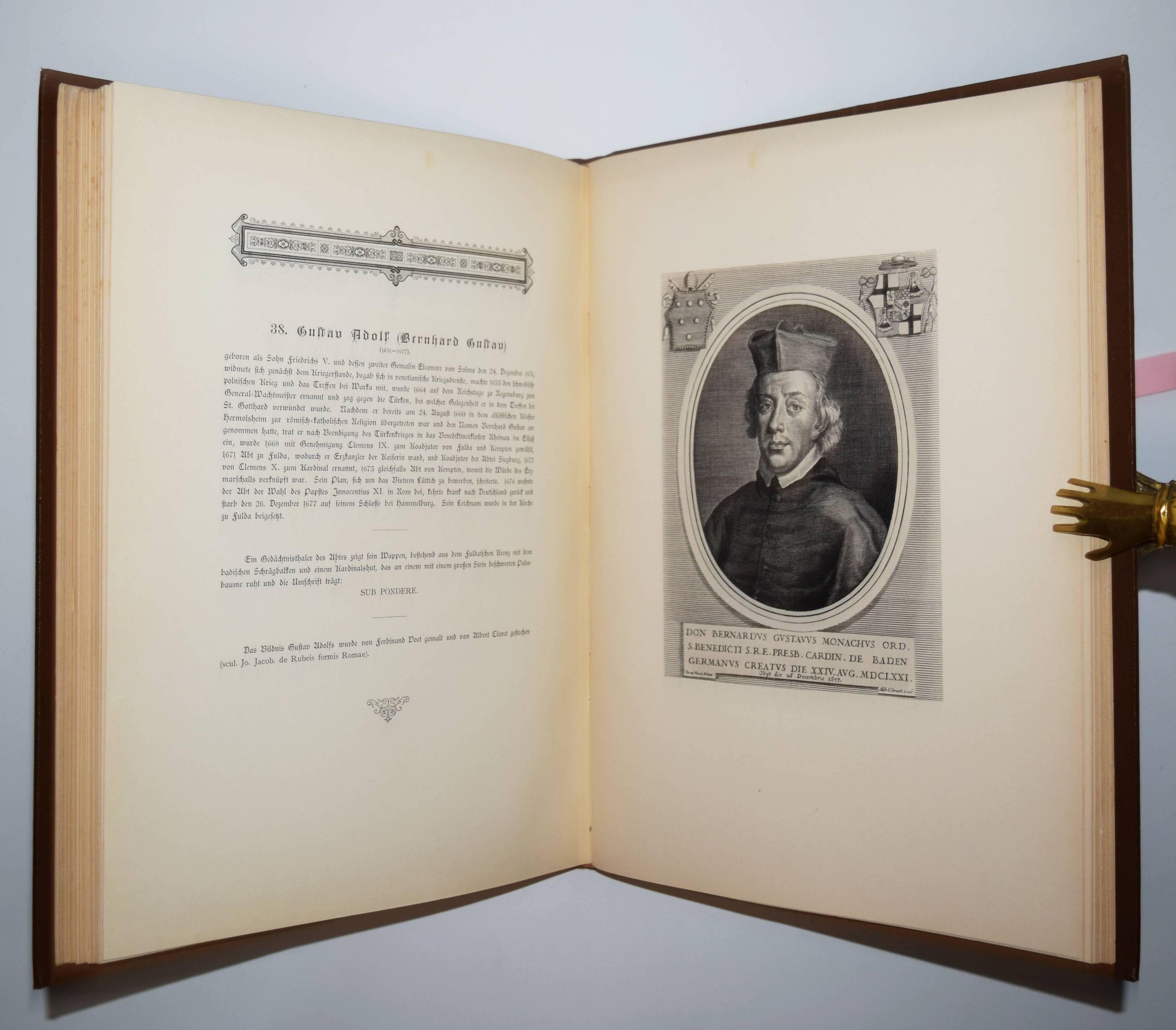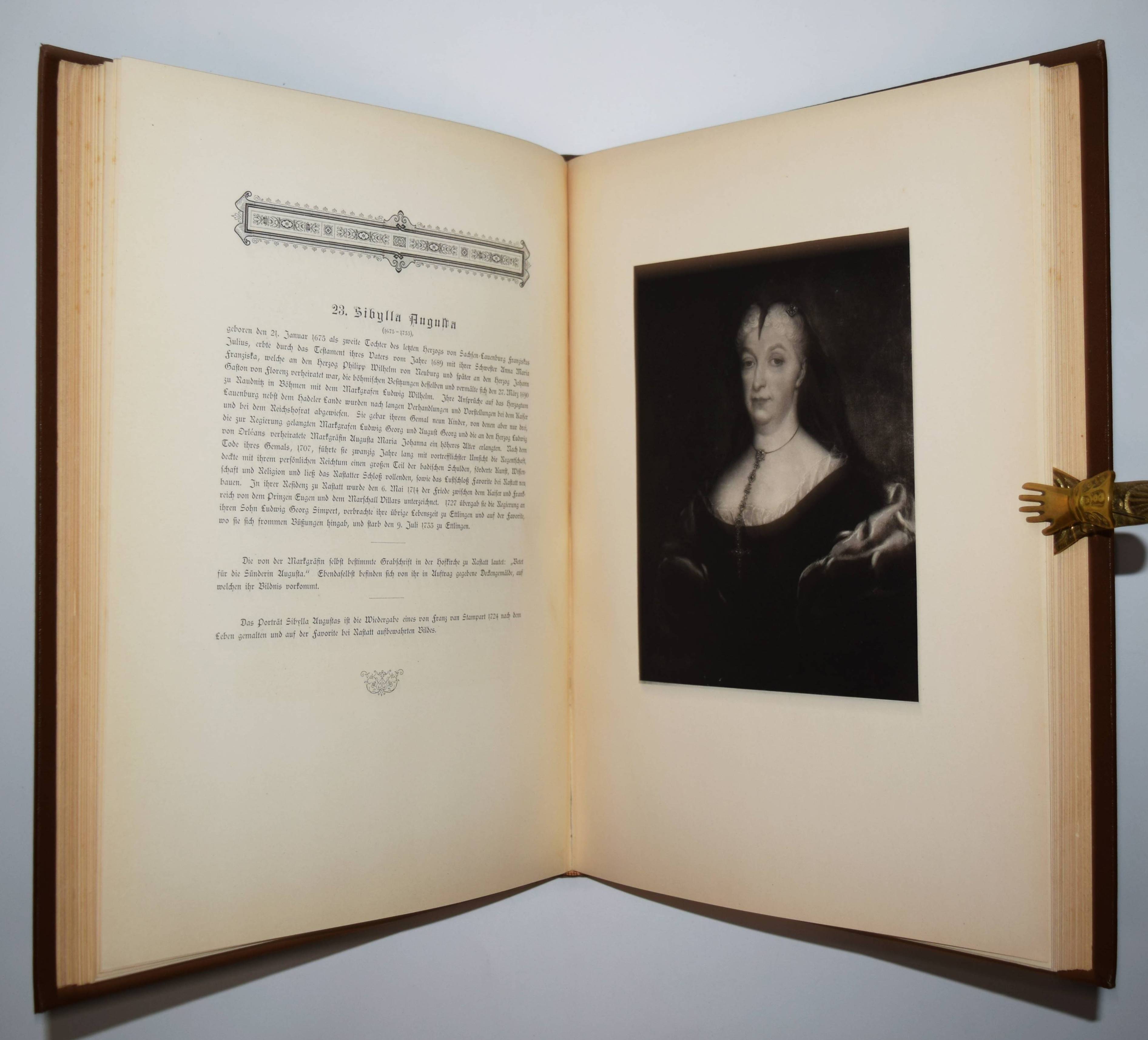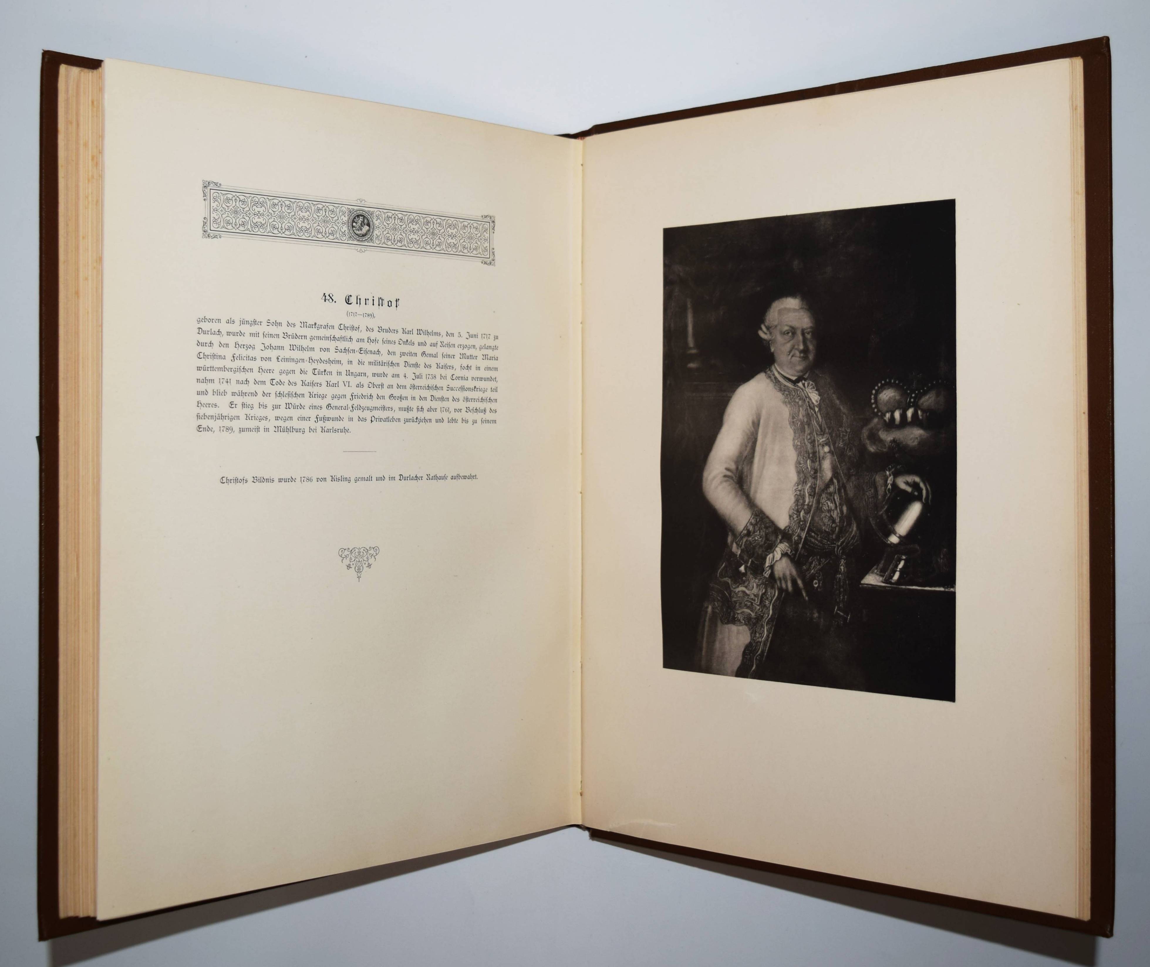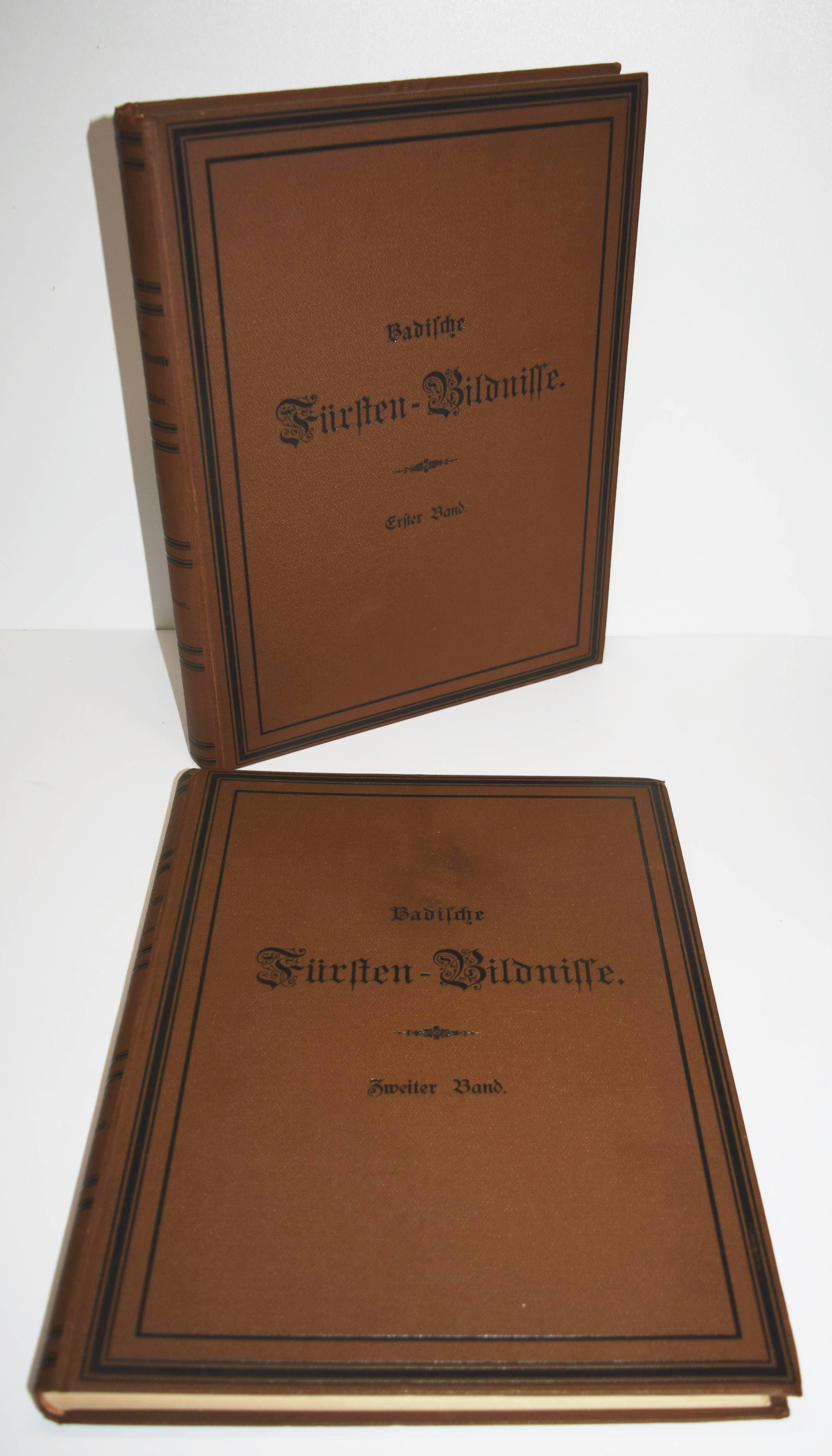 Müller, Hans (Emil Felix). Badische Fürsten-Bildnisse. I. Von Karl I. (gest. 1475) bis Karl Friedrich (1728-1811). – II. Von Markgraf Friedrich (1756-1817) bis zur Gegenwart. 2 Bände. Karlsruhe, Christian Theodor Groos 1888-1893. Folio (37 x 28 cm.). 28 S., [54] Bl.; 46 S., [32] Bl., XXI S. mit zus. 86 Lichdruck-Tafeln. Orig.-Leinenbände. Einzige Ausgabe des schön ausgestatteten Werks. – Der Musikwissenschaftler und Schriftsteller H. E. F. Müller (1854-1897), Sohn des Dichters und Arztes Wolfgang Müller von Königswinter, war seit 1885 Bibliothekar an der Badischen Landesbibliothek in Karlsruhe und wechselte noch im selben Jahre an die Musikabteilung der Königlichen Bibliothek in Berlin. Am 1. Oktober 1893 wurde er als Nachfolger von Robert Dohme Erster ständiger Sekretär der Berliner Akademie der Künste. – Sehr gutes Exemplar.