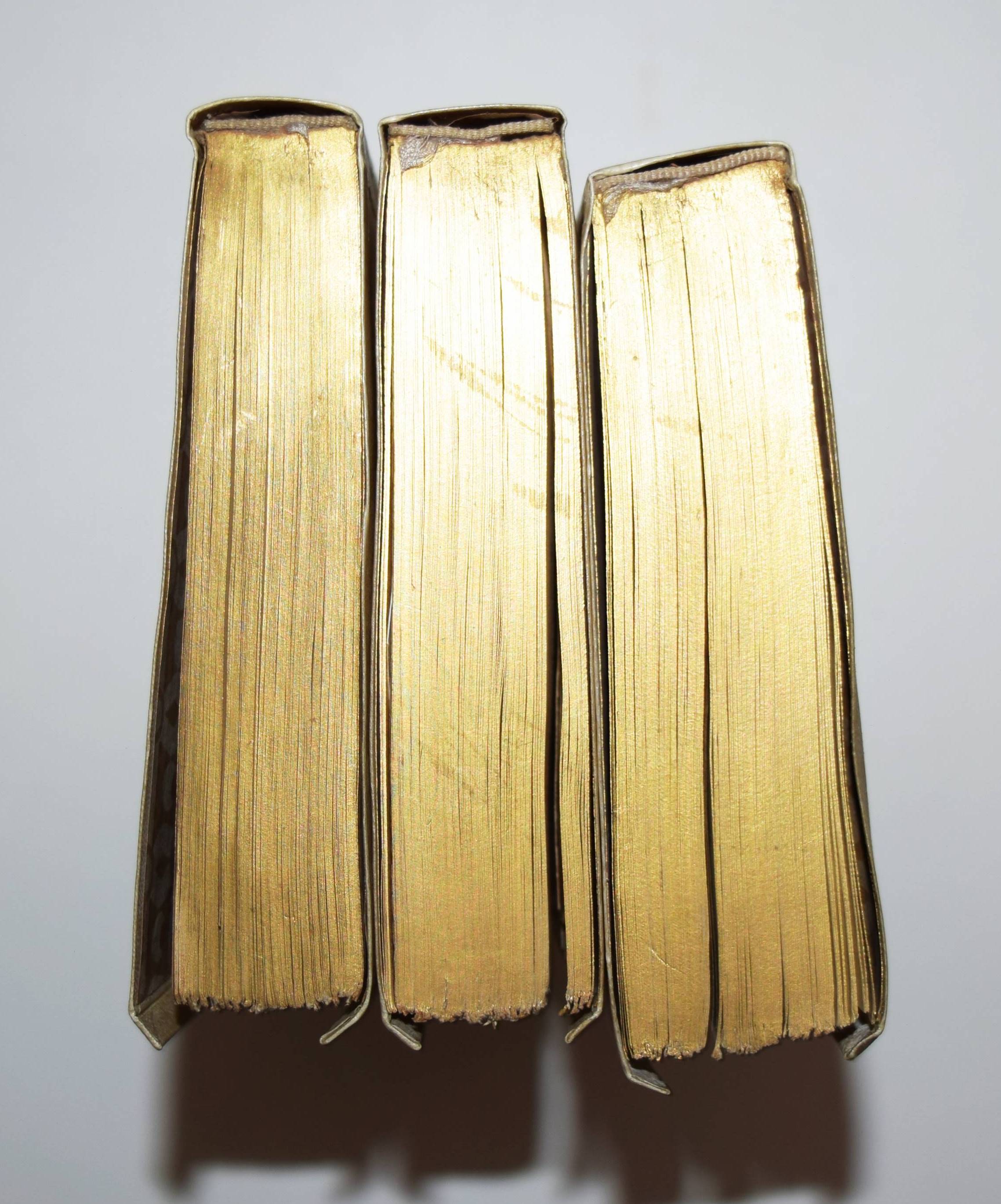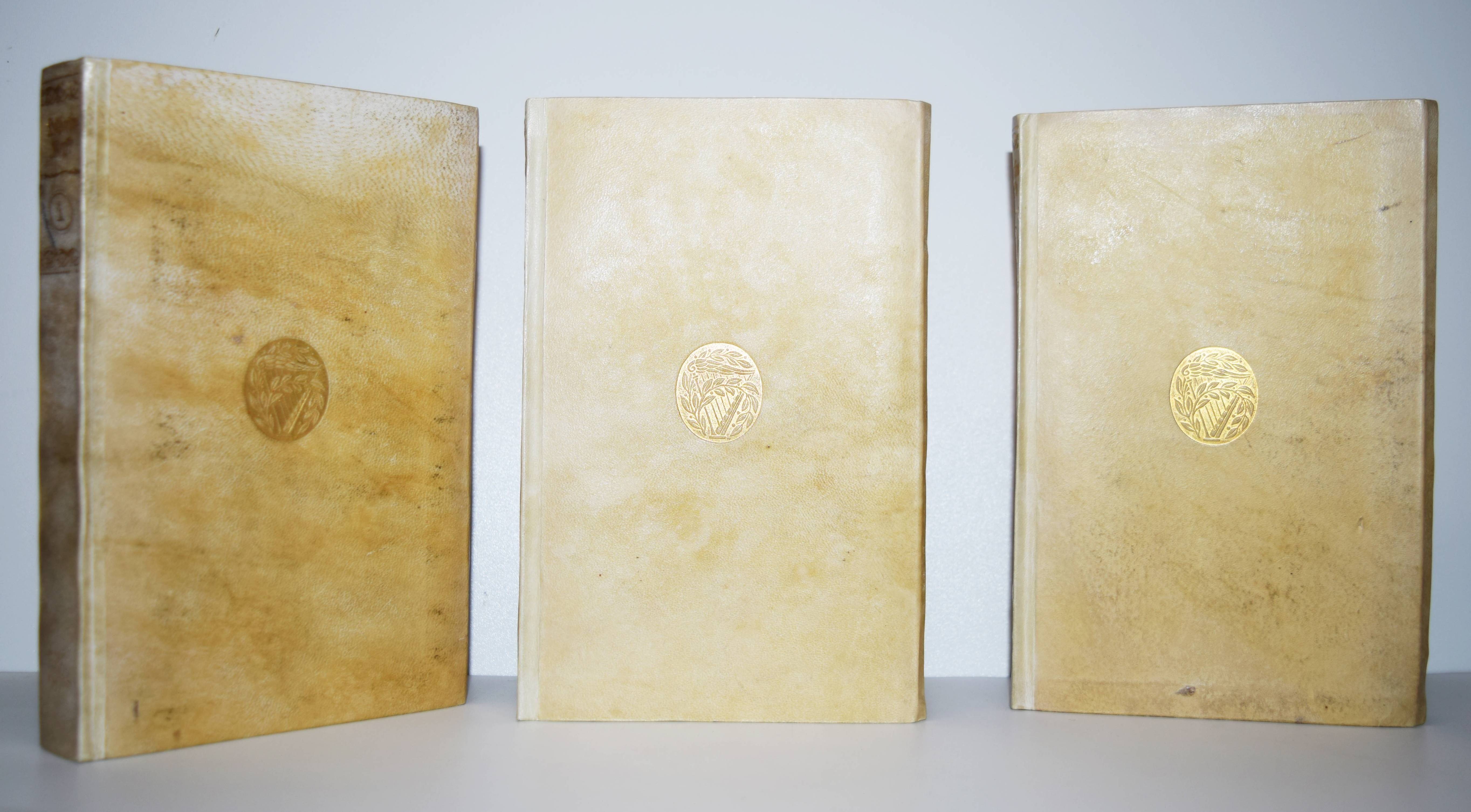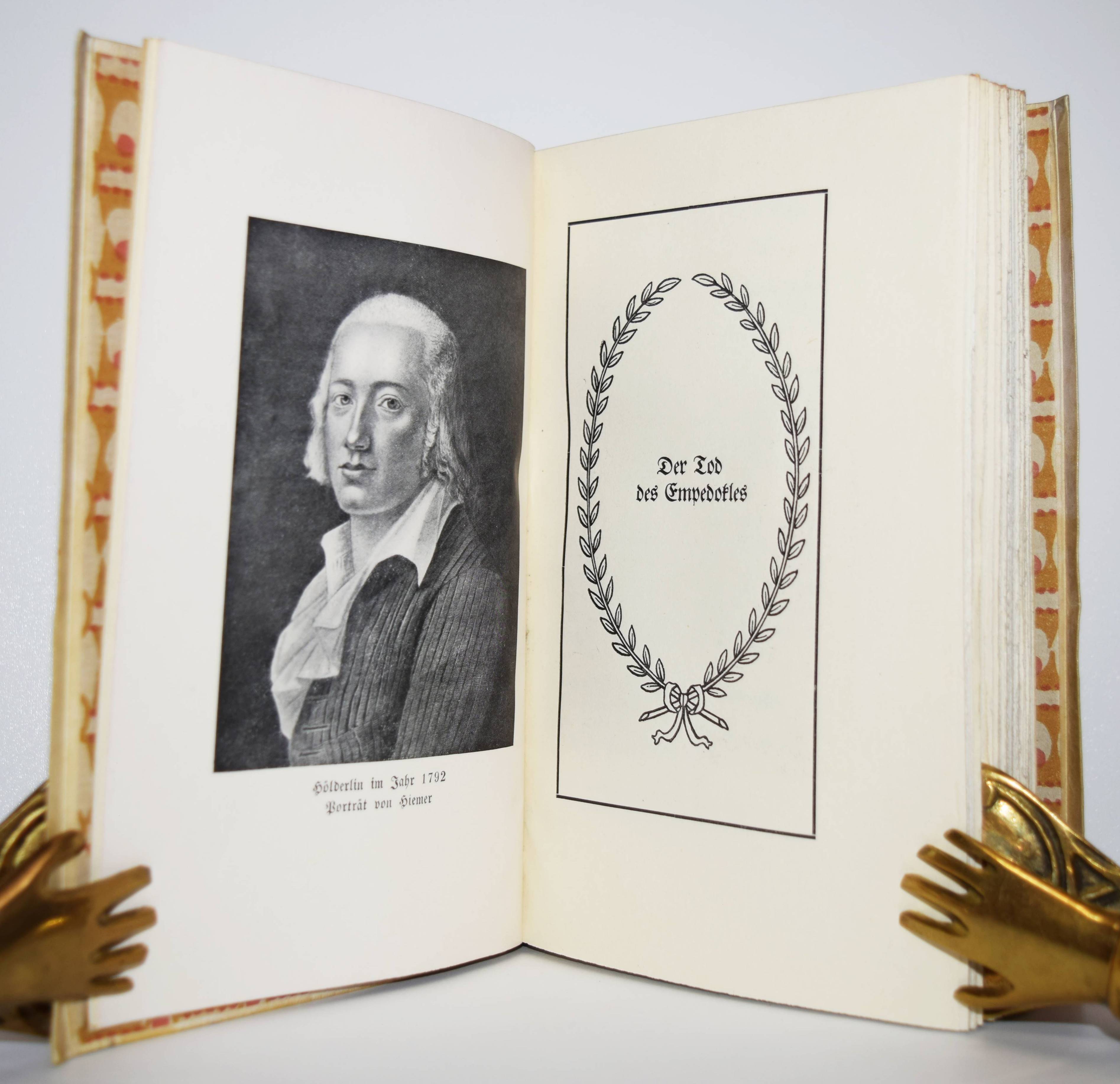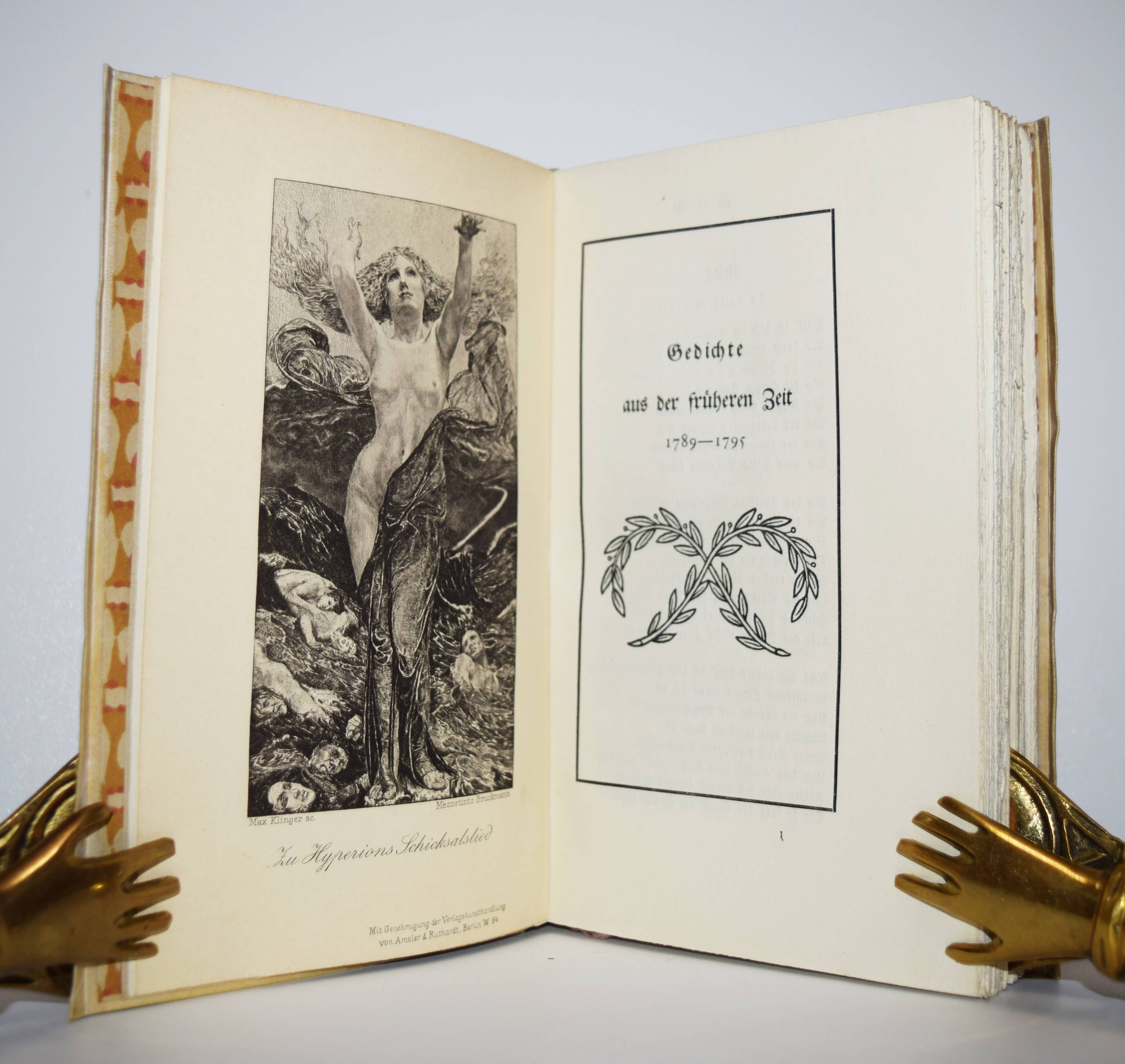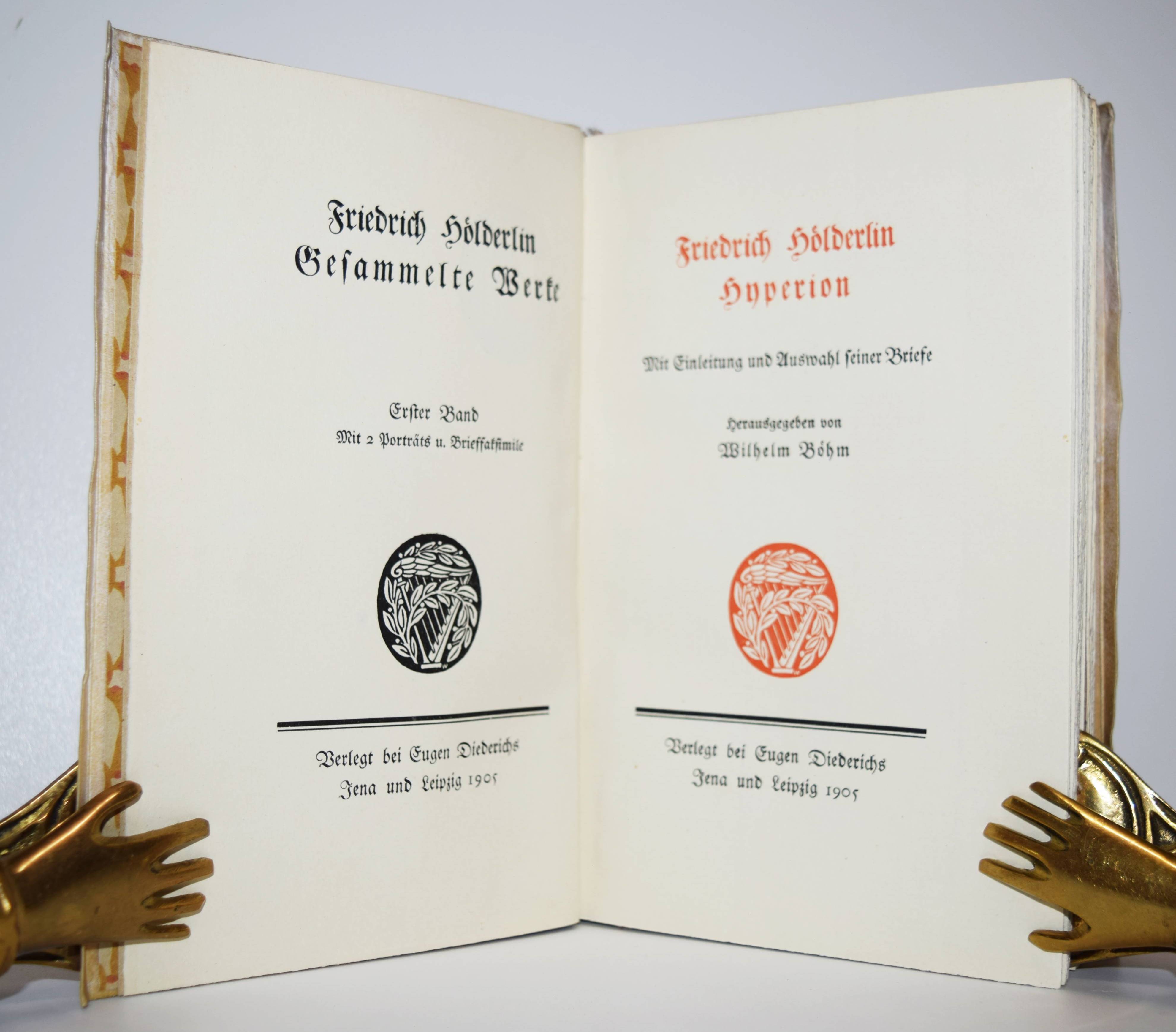 Hölderlin, Friedrich. Gesammelte Werke. Mit Einleitung und Auswahl seiner Briefe herausgegeben von Wilhelm Böhm und Paul Ernst. 3 Bände. Jena, Diederichs 1905. 8°. LXXI, (1), 292, (1) S.; [2] Bl., 318 S.; [2] Bl., 297, (1) S. mit 3 Porträts und 1 Heliogravure-Tafel von Max Klinger. Orig.-Pergamentbände mit goldgepr. Rückentiteln, Rückenvergoldung, goldgepr. Deckelvignetten und Kopfgoldschnitt. Buchausstattung von E(mil) R(udolf) Weiß. – Sehr gutes Exemplar der aufwendig ausgestatteten Jugendstil-Ausgabe.