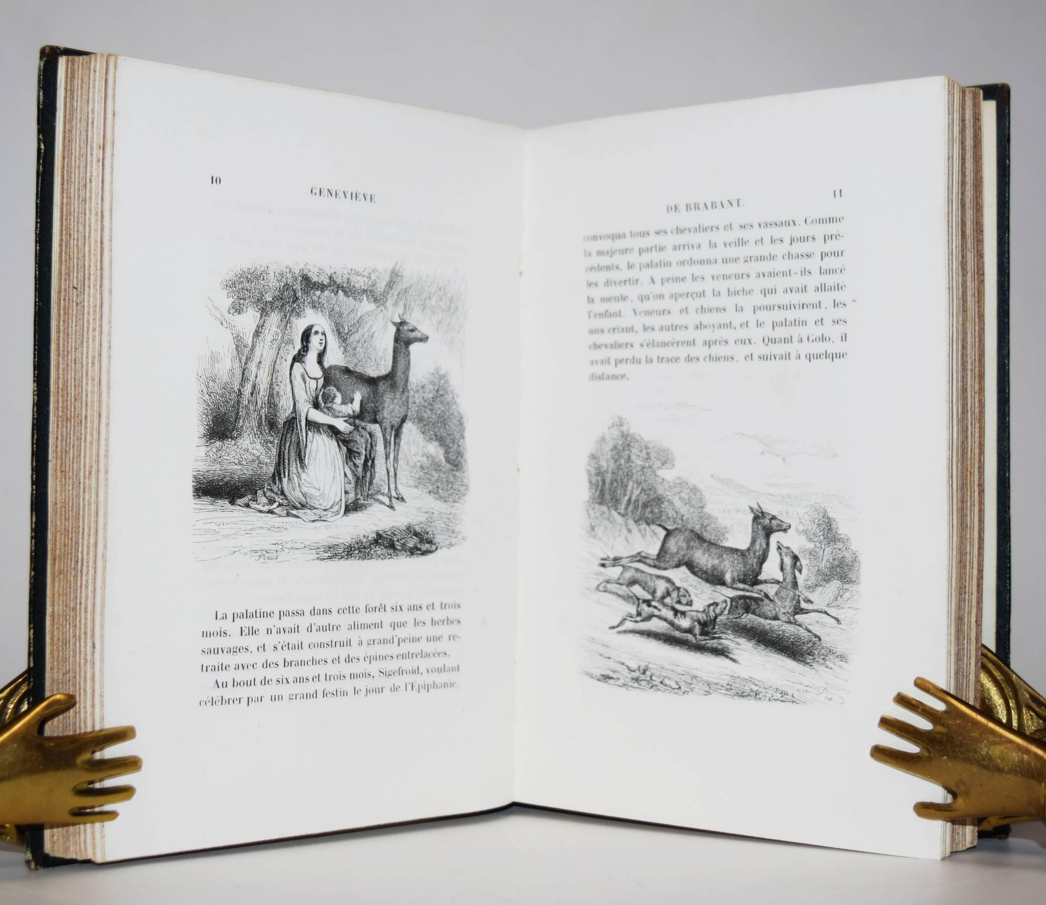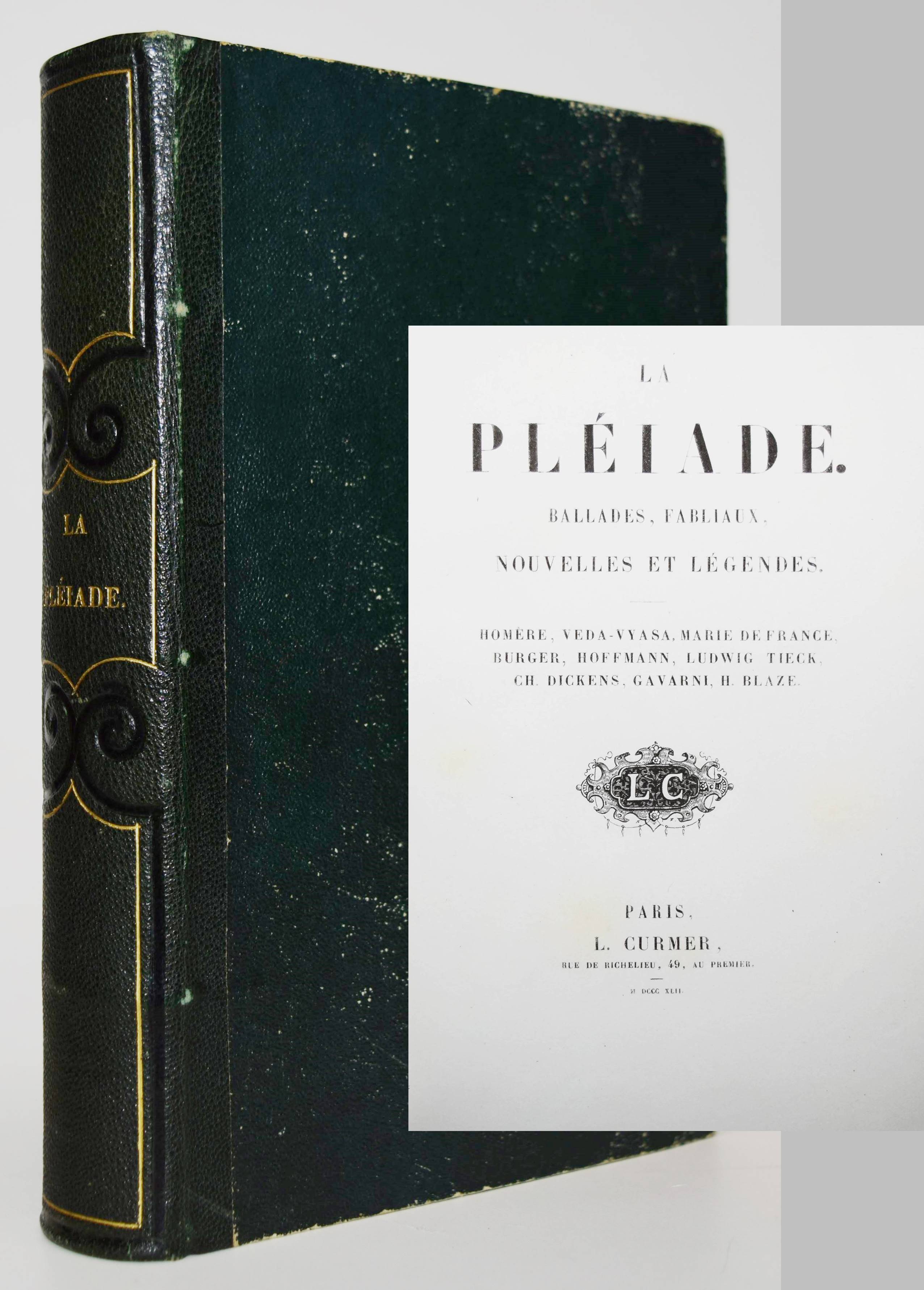 La Pléiade. Ballades, Fabliaux, Nouvelles et Légendes. Homère, Veda-Vyasa, Marie de France, Burger, Hoffmann, Ludwig Tieck, Ch. Dickens, Gavarni, H. Blaze. (Traduction de E. de la Bédollière). 10 Teile in 1 Band. Paris, L. Curmer 1842. 8°. Mit 11 Holzstich-Frontsp. (darunter ein allgemeines Frontsp.), 10 Radierungen im Text auf China und 56 Holzschnitt-Vignetten von Daumier, Garvani, Johannot, Lami u.v.a. nach Penguilly, Jacque, Jeanron, Trimolet, Féart, Daubigny u. Pauquet. Halblederband der Zeit mit goldgepr. Rückentitel und dezenter Rückenverg. Brivois 335 (″très recherché aujourd’hui et rare en bonne condition“). Carteret III, 499 ff. Sander 579. Vicaire VI, 704. – Erste Ausgabe der, wegen der schönen Ausstattung gesuchten Anthologie der Romantik in Frankreich. – „Cette publication est la plus importante des éditions Curmer, une pléiade littérateurs a collaboré, dont Balzac, Janin, Karr ainsi que les dessinateurs les plus estimés de l’époque: Gavarni, Daumier, Lami, Johannot“ (Carteret). – Das Werk erschien 1841 bis 1842 in Lieferungen. – Sehr gutes sauberes Exemplar.