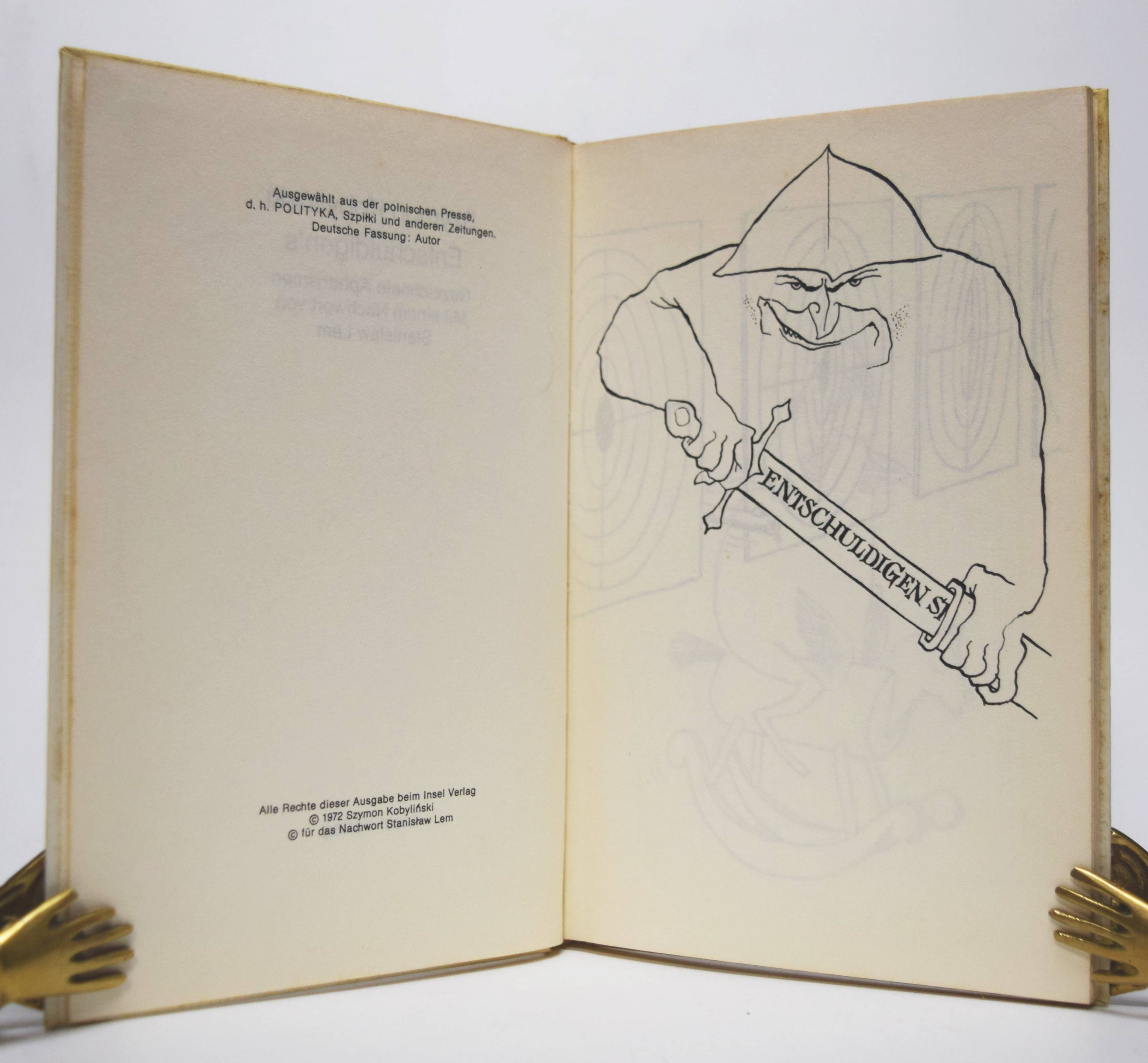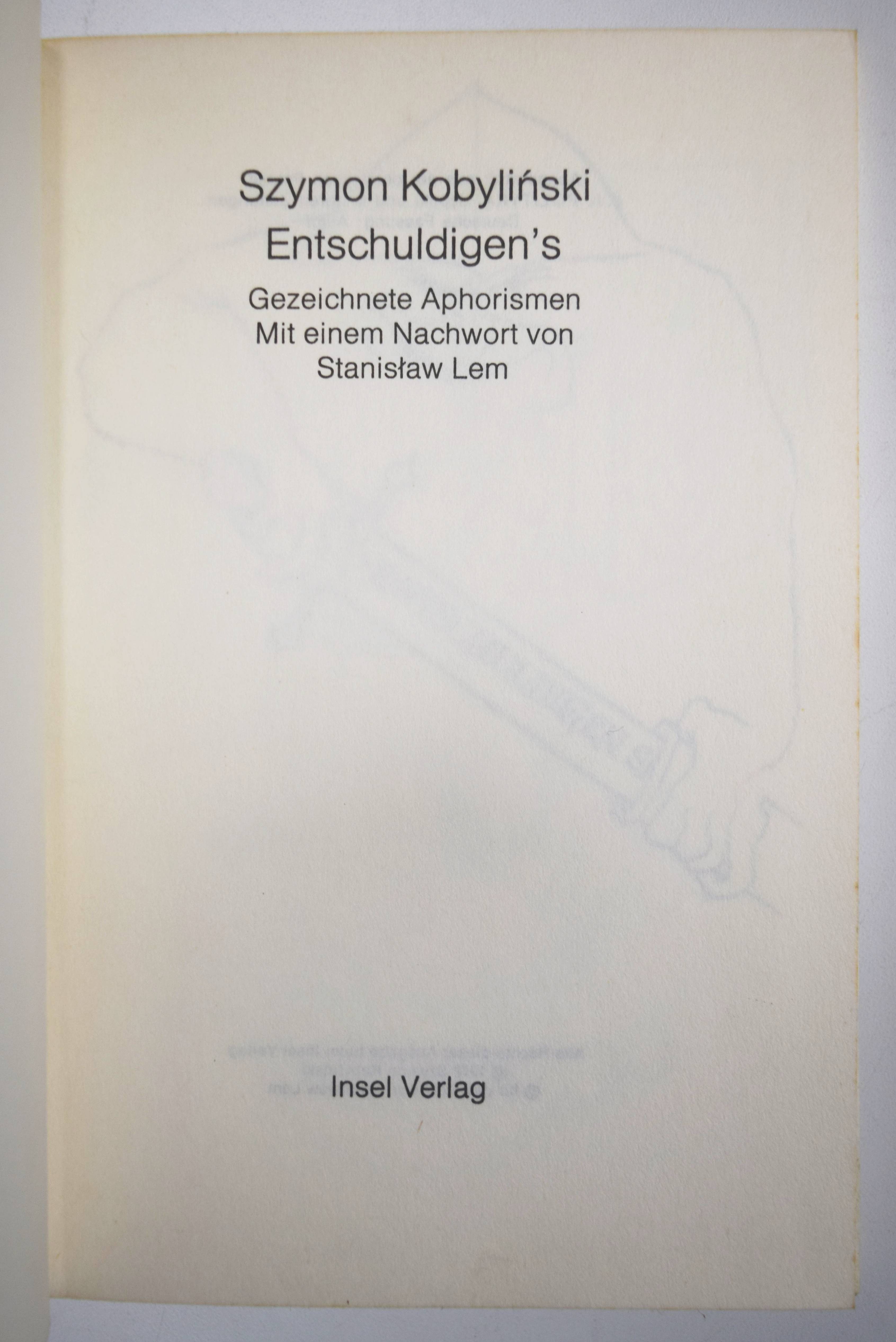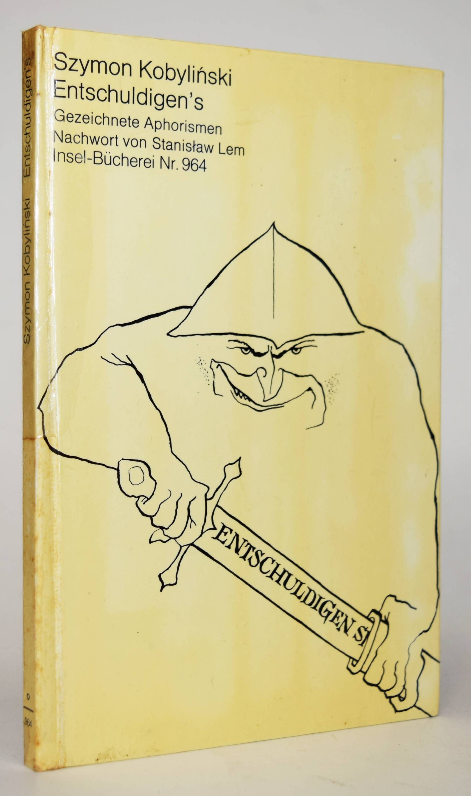 Kobylinski, Szymon. Entschuldigen’s. Gezeichnete Aphorismen. Mit einem Nachwort von Stanislaw Lem. Frankfurt am Main, Insel-Verlag 1972. 8°. [29] Bl. mit ganzs. Illustrationen. Illustr. Orig.-Pappband. (Insel-Bücherei, Band 964). Erste deutsche Ausgabe, selten. – Einband und Schnitt stellenweise etwas braunfleckig, sonst gut erhalten.
